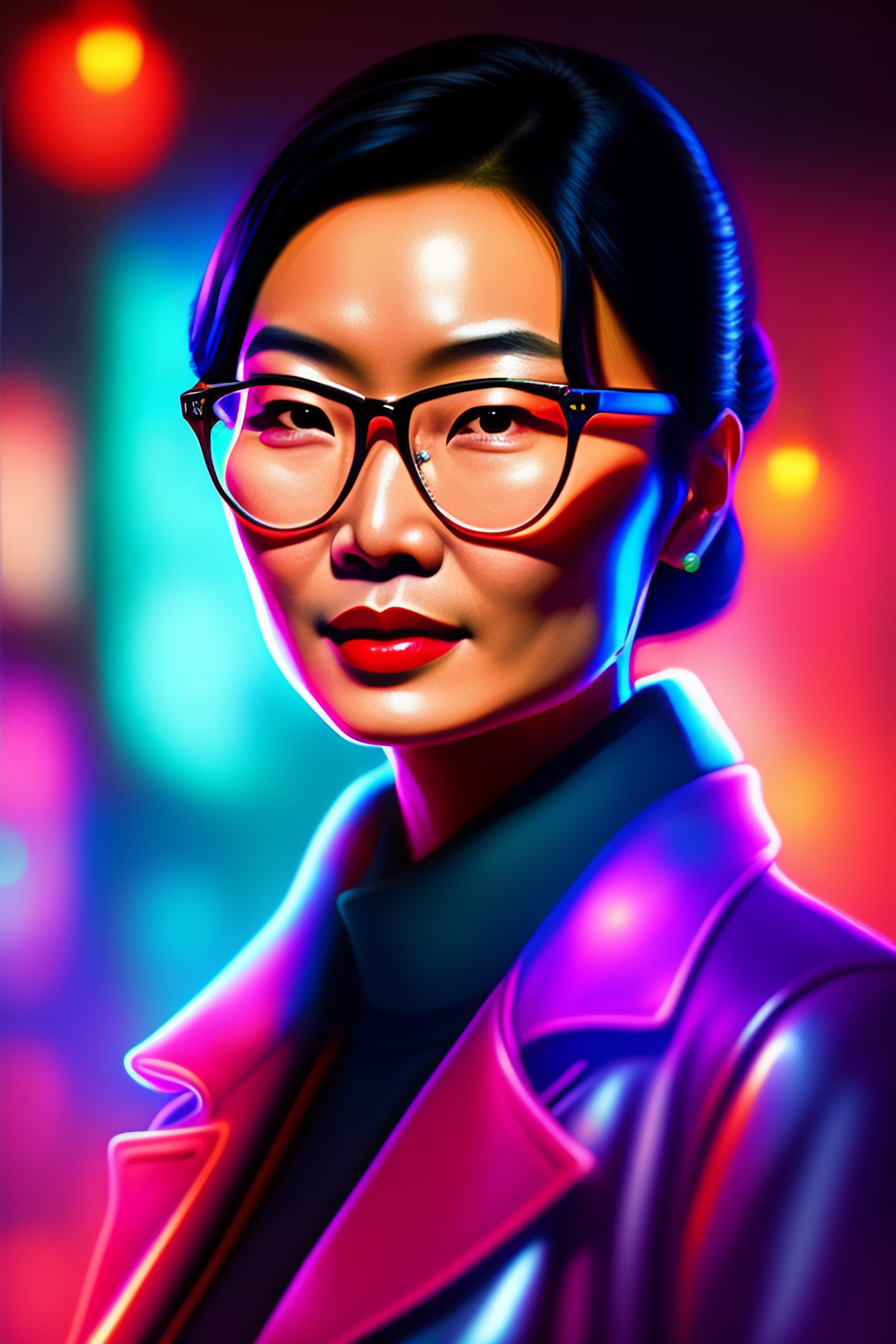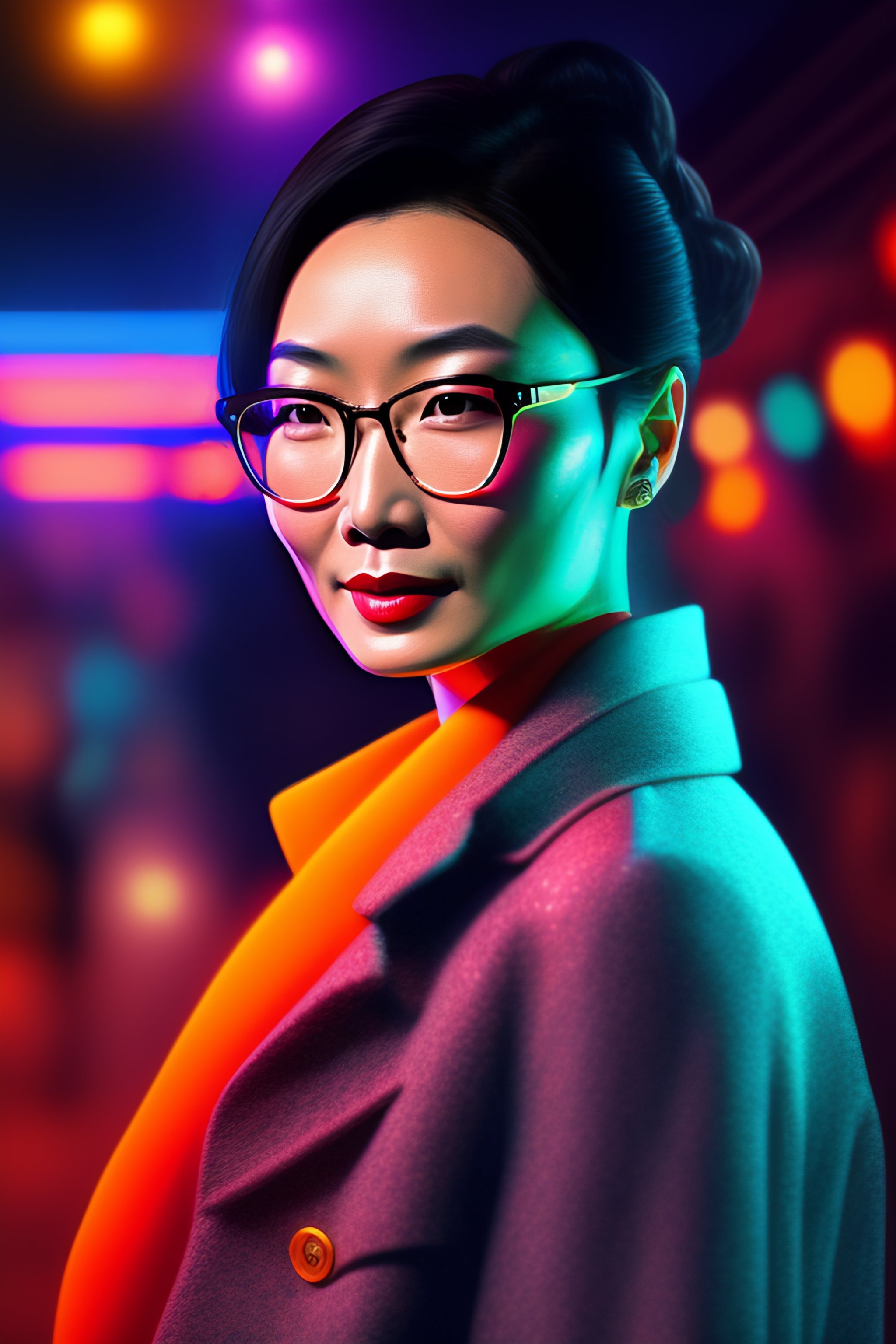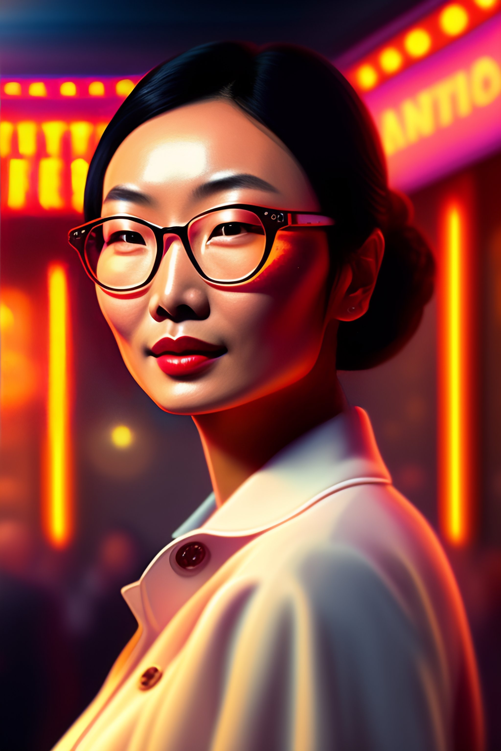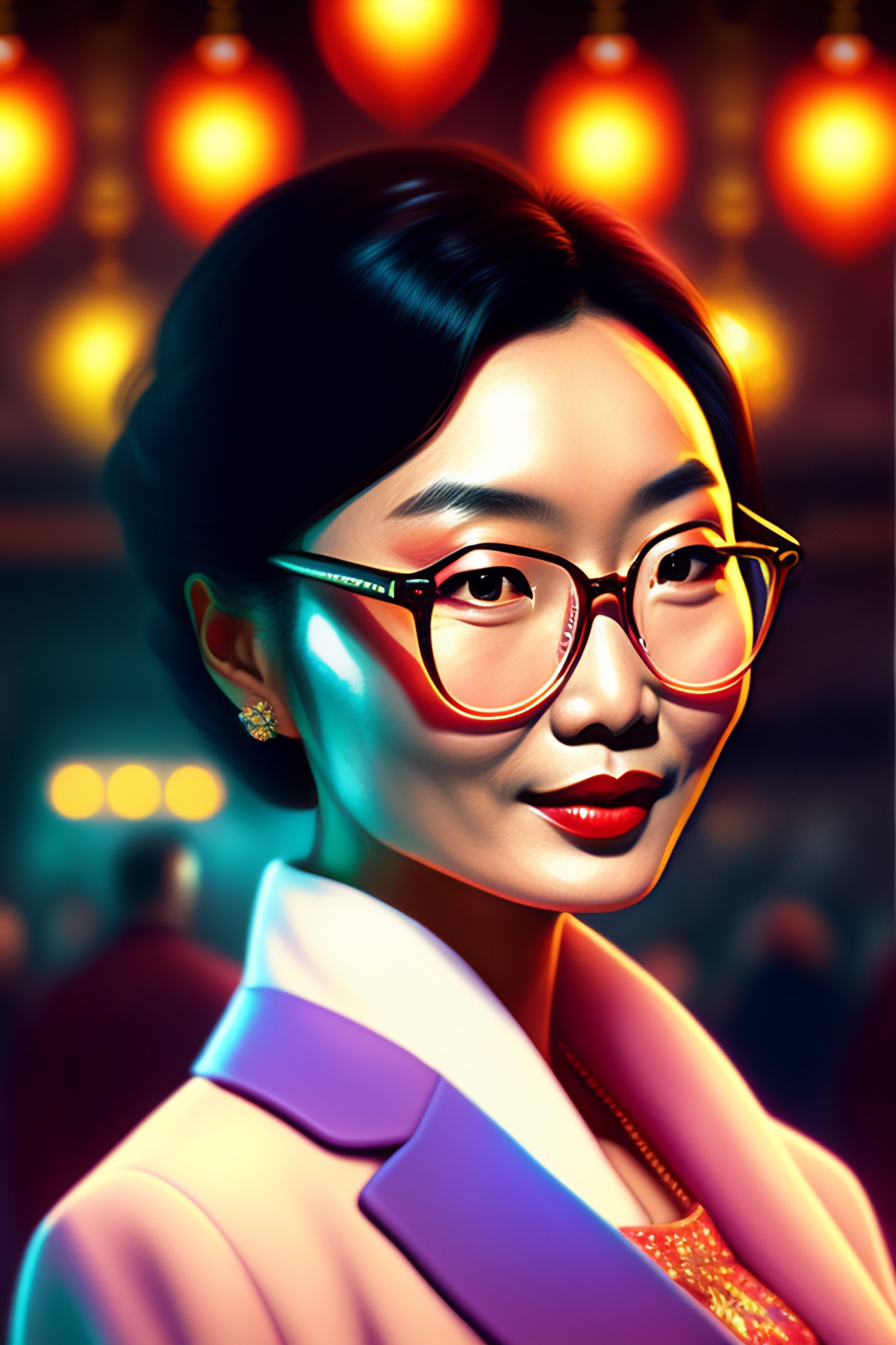Digital drawing of young maggie cheung, wearing glasses, old fashioned, in a dancing club, 4k, fine details, intricate, cluttered with colorful lights