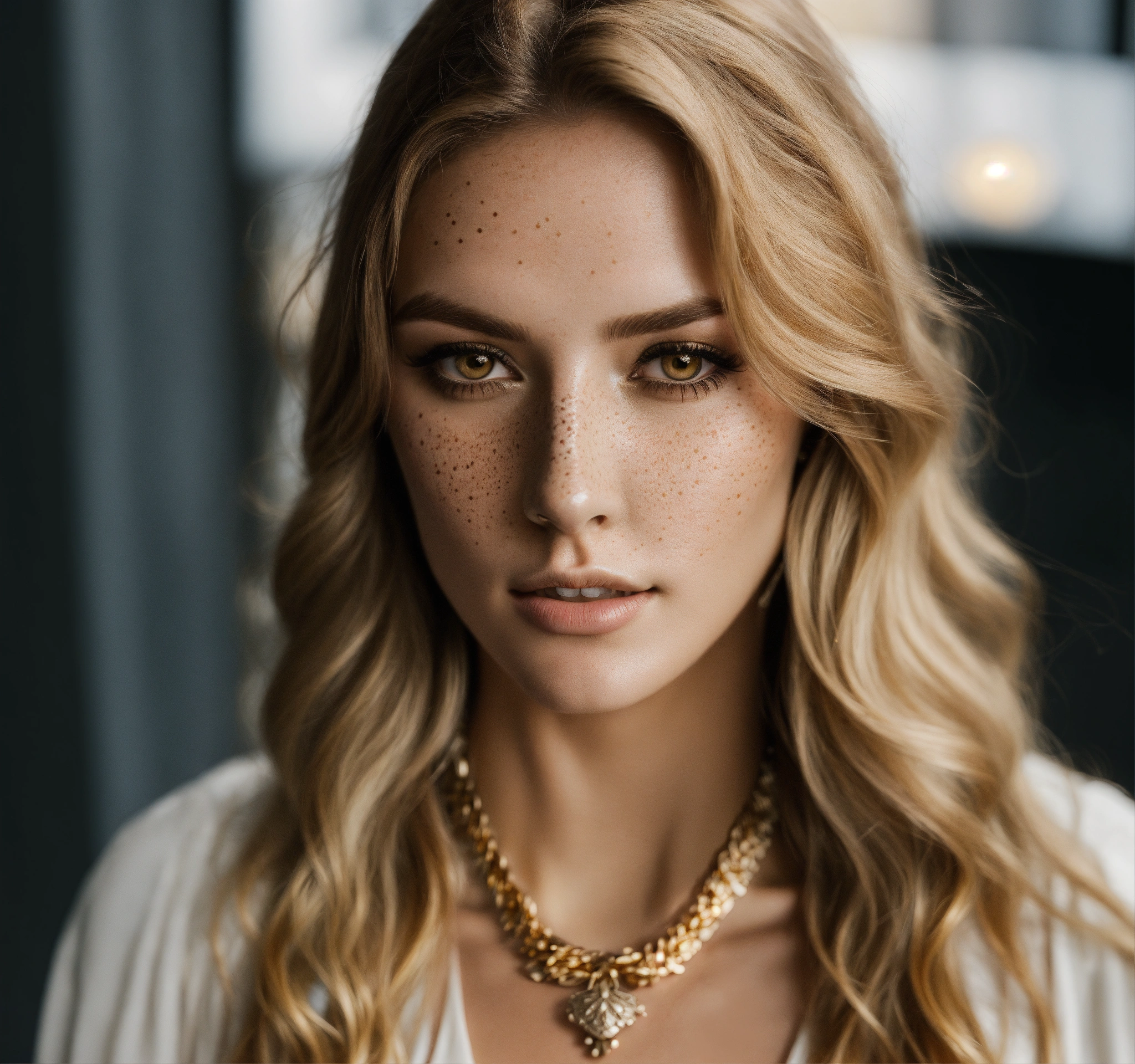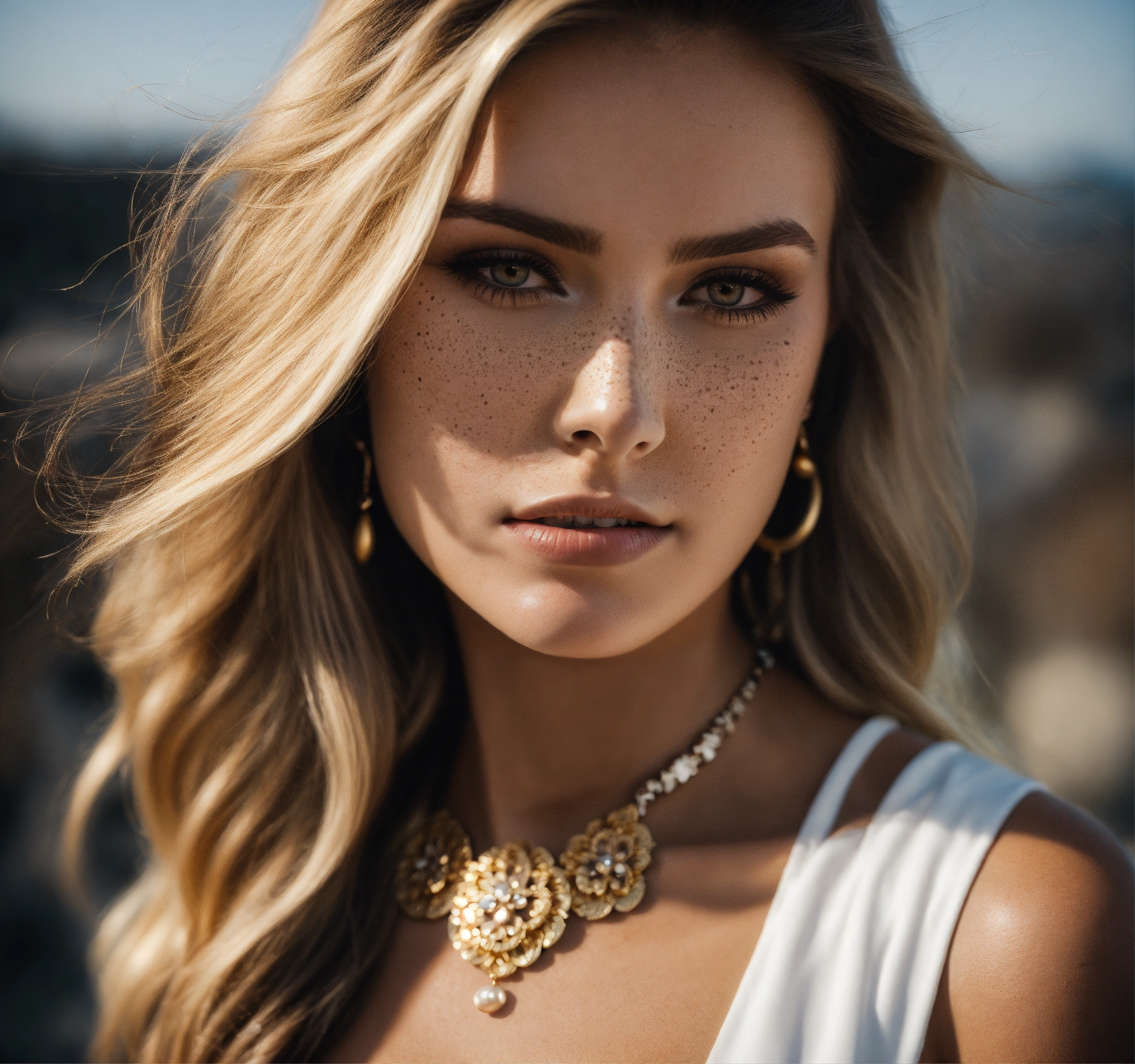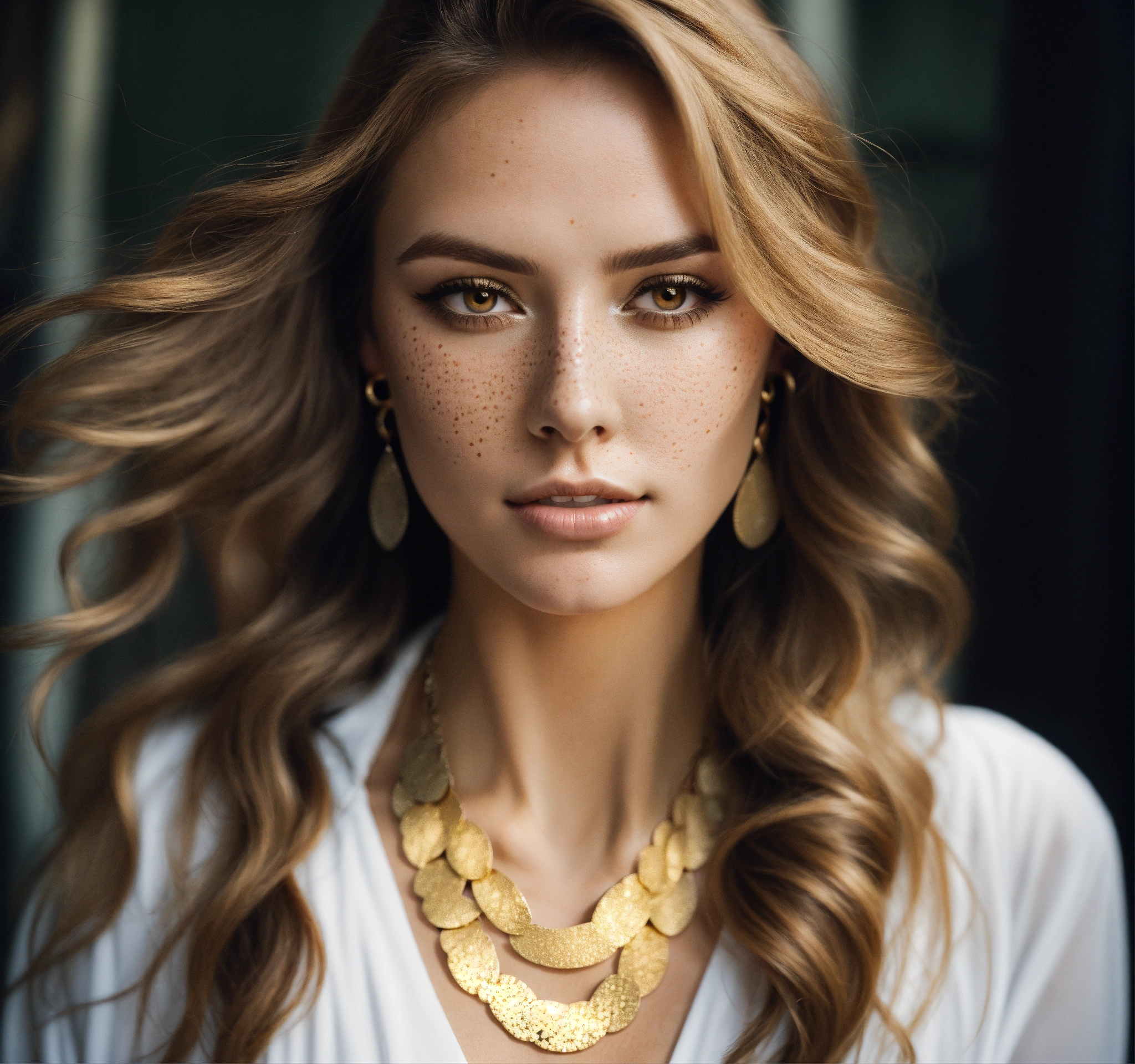 Beautiful caucasian woman with long blonde-brown hair, light brown eyes, heavy black eyeshadow, freckles, wearing a white dress, gold necklace, gold earrings