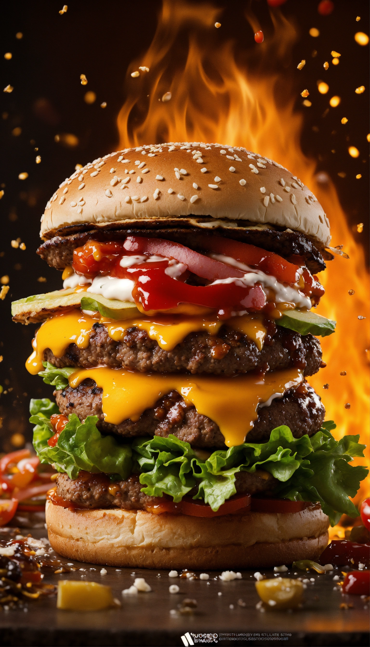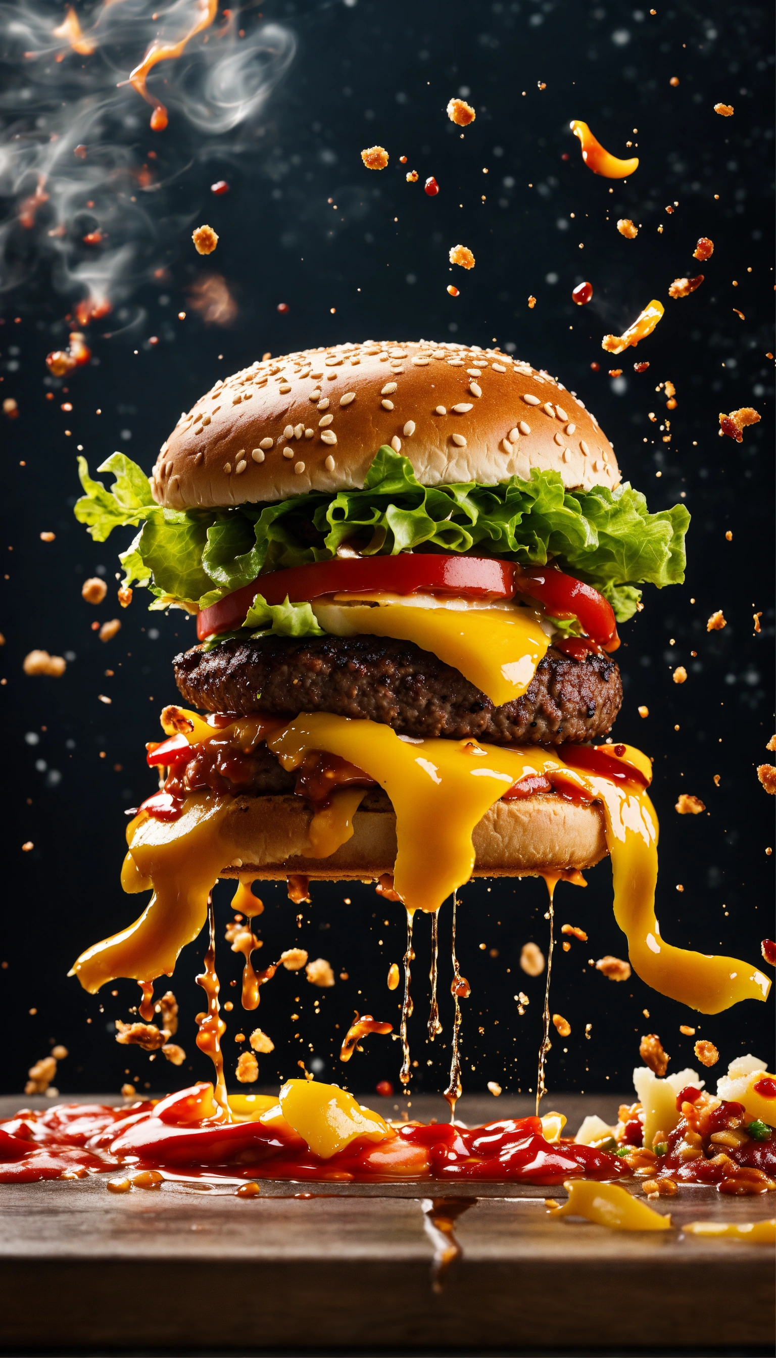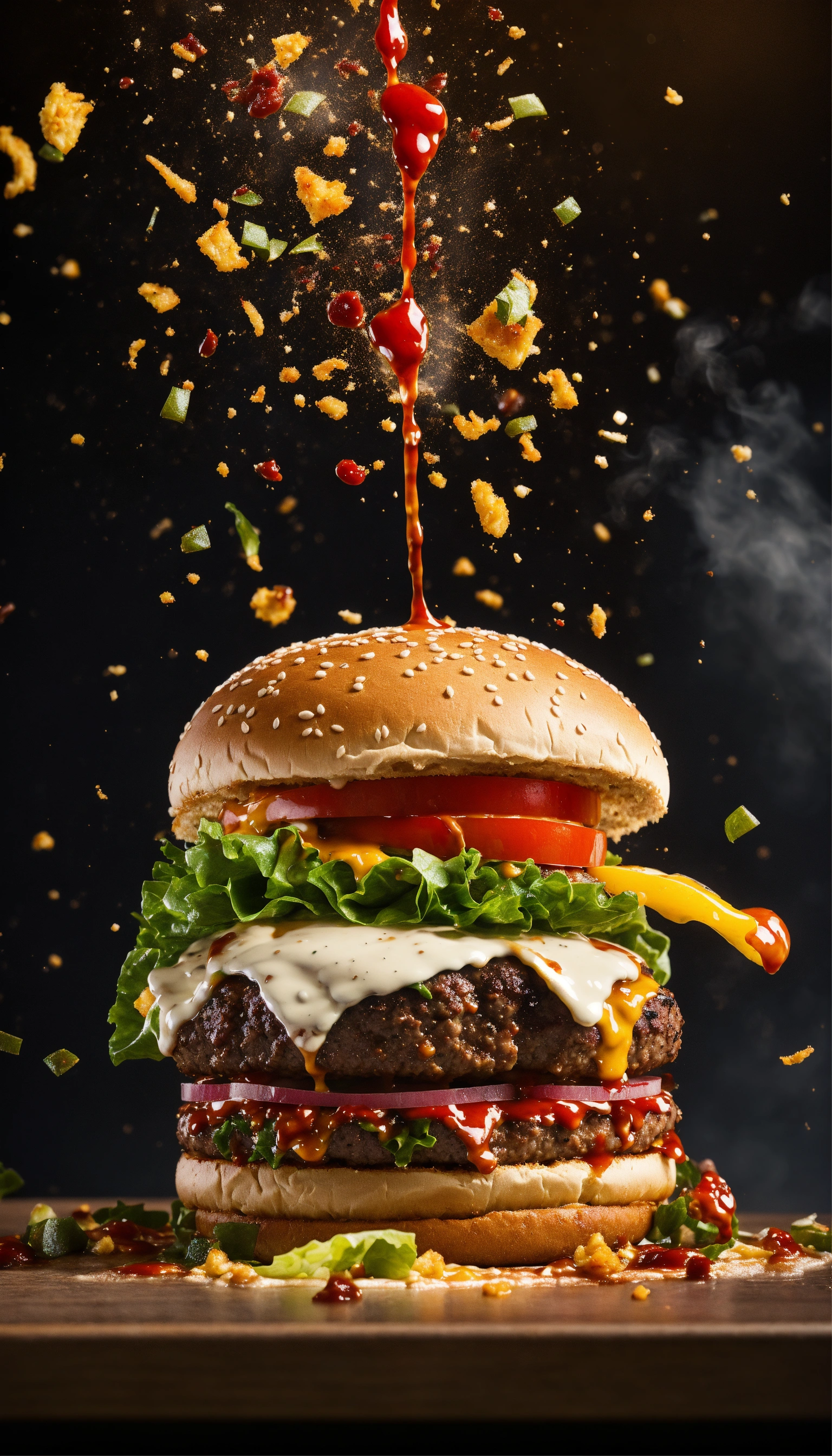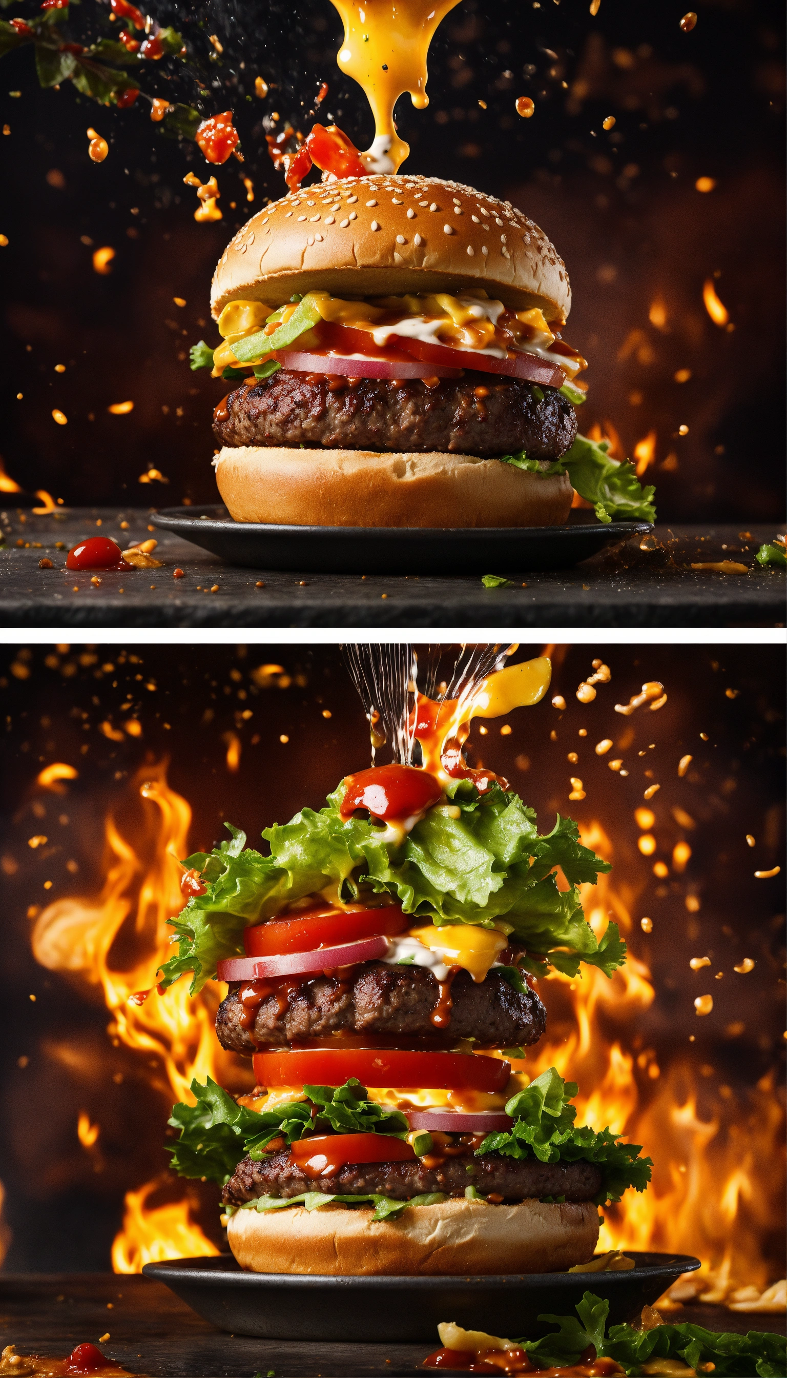 “capture dynamic splashes of food in flying food photography” with a burger as the main subject, featuring splashes of toppings and seasonings, including splashes of ketchup. use high-speed photography for a photorealistic surreal style, with a black background and a clean, minimalist backdrop. include the table, the steam, the fire behind the steak. create 3 advertising posters with professional-quality color grading, studio lighting, border lights, layered compositions and shoot them with an eos-1d x mark iii camera. post on 500px, behance and think about concept art."