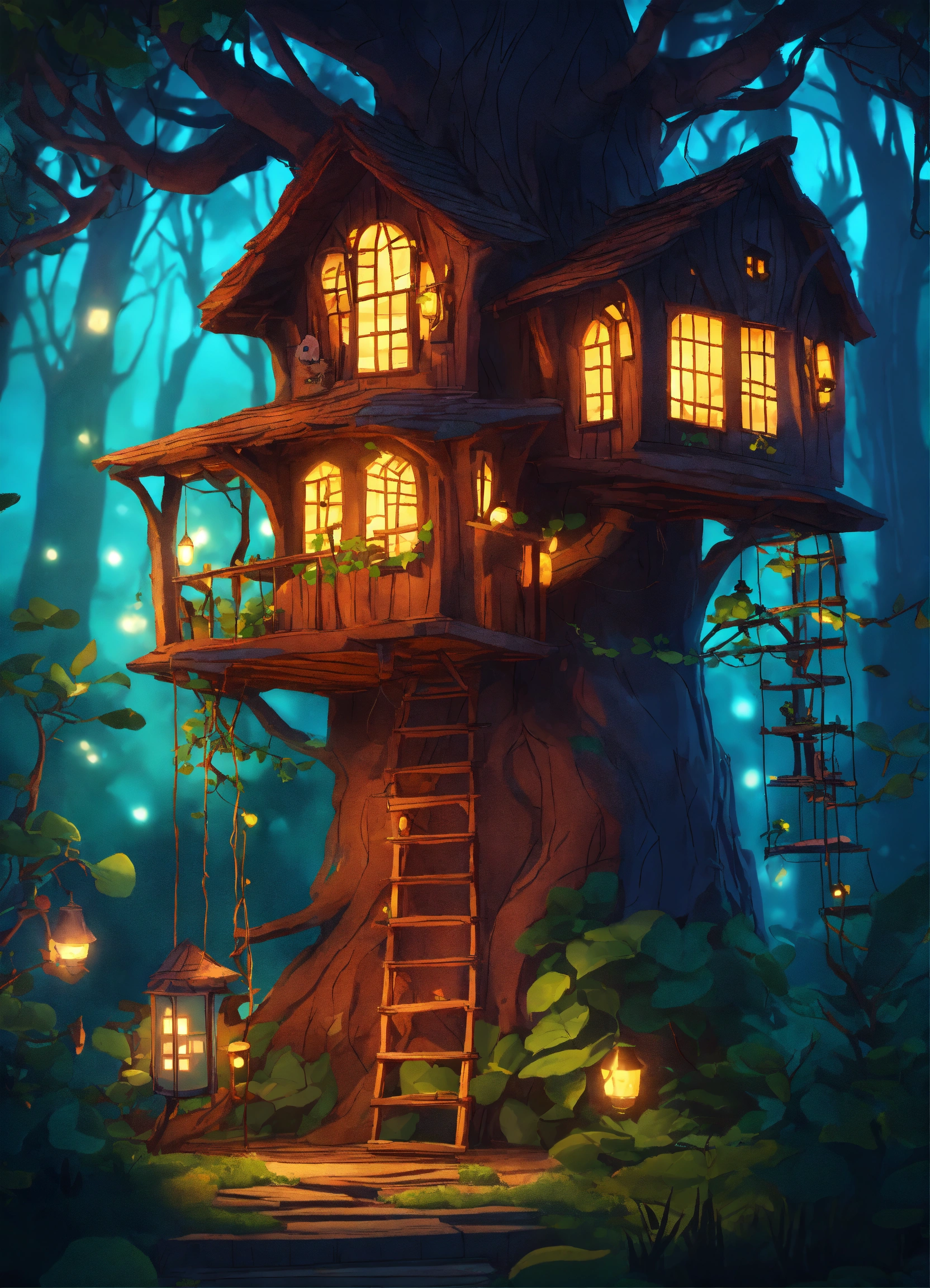 Cartoon-styled dark mystical magical forest with glowing lights a magical tree house with branches growing out the windows and tall wooden ladders to climb high up in the trees 8k high quality