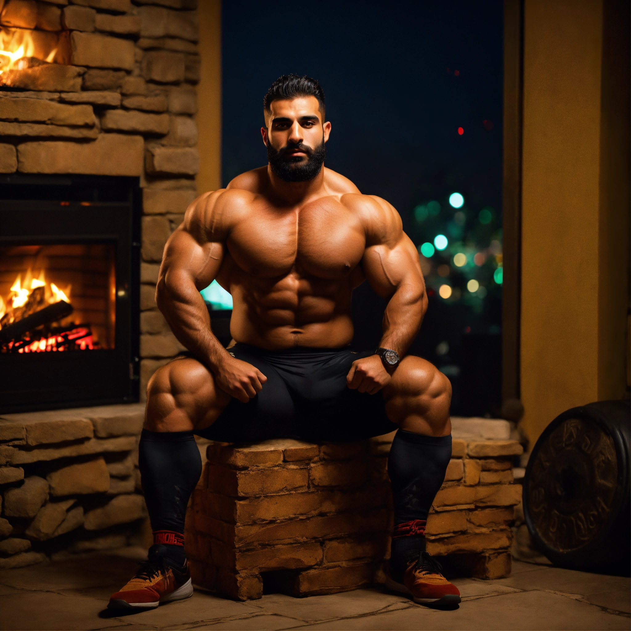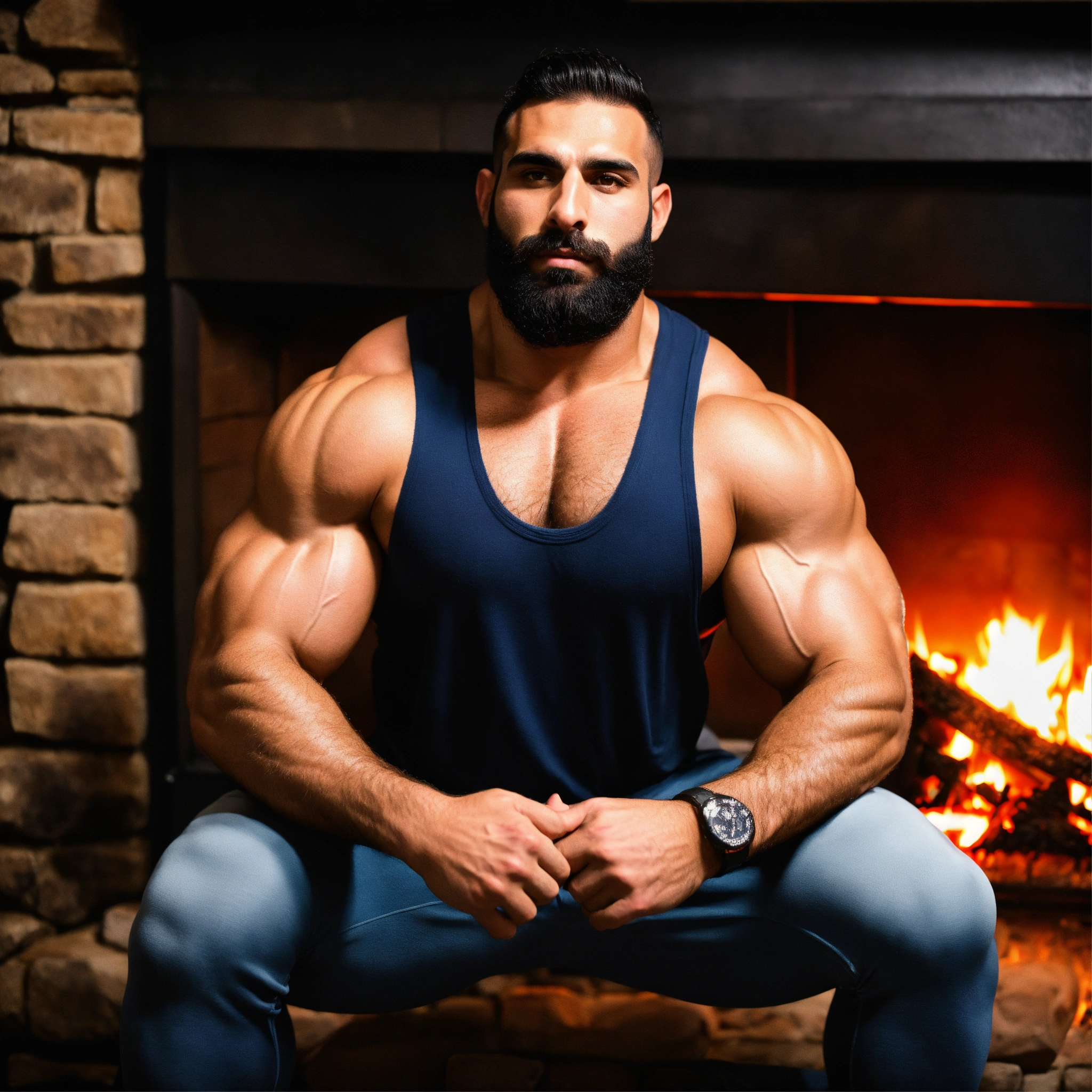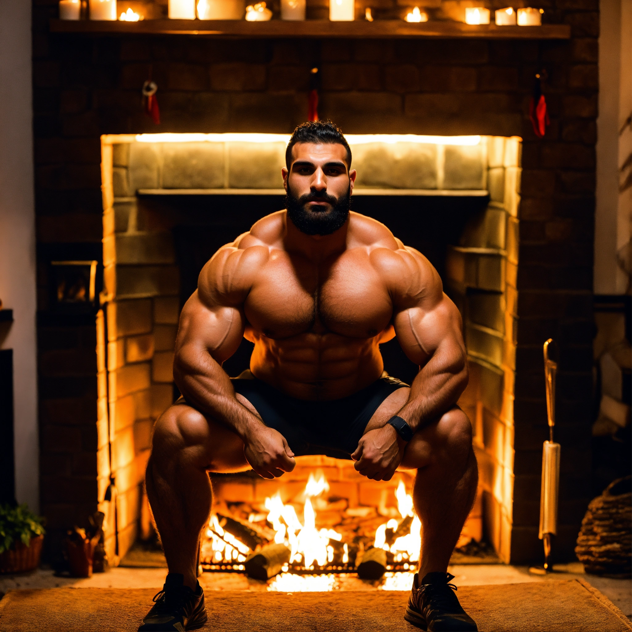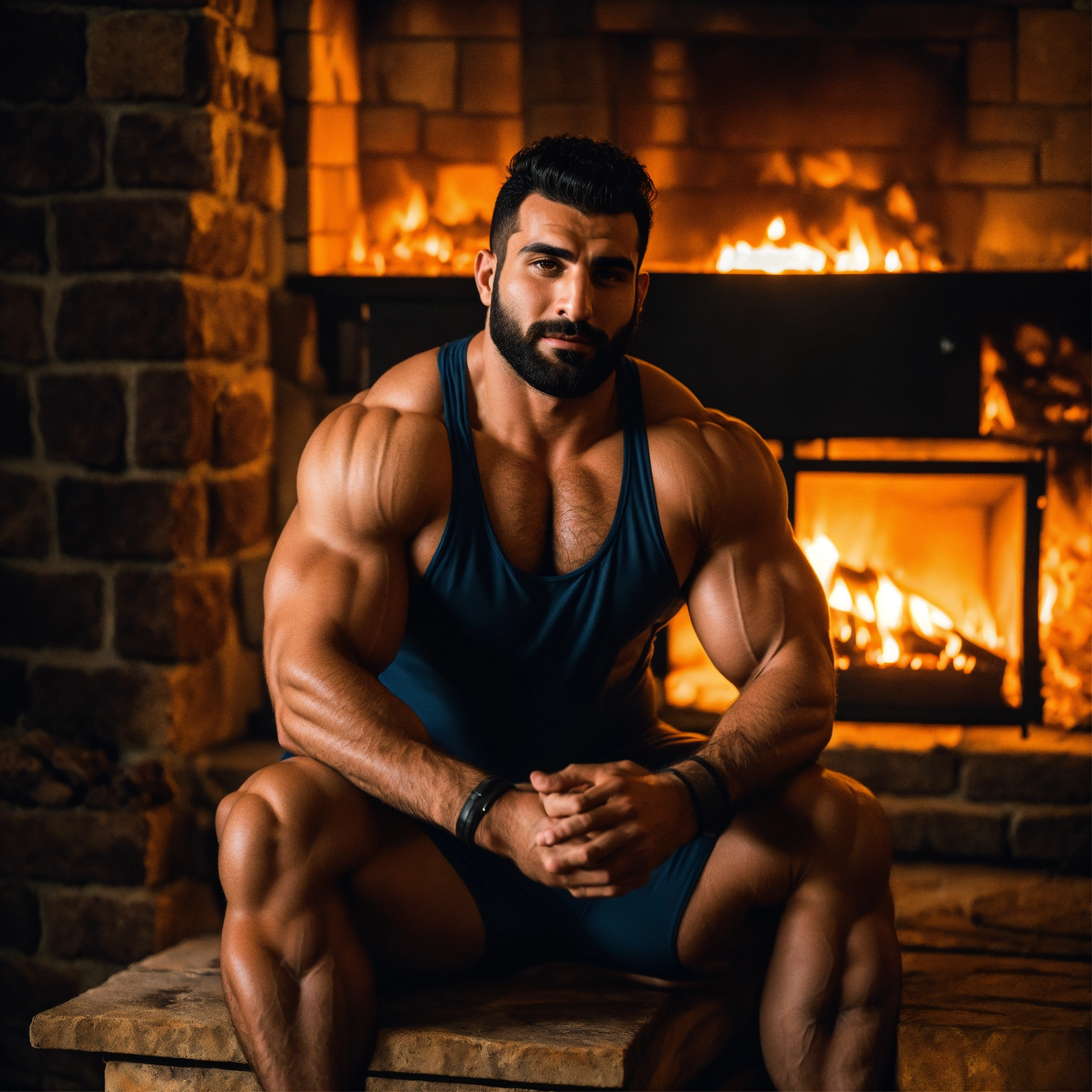 30-year-old hairy lebanese man with big muscles, big bodybuilder, body like a wrestler, sitting in front of a fireplace at midnight