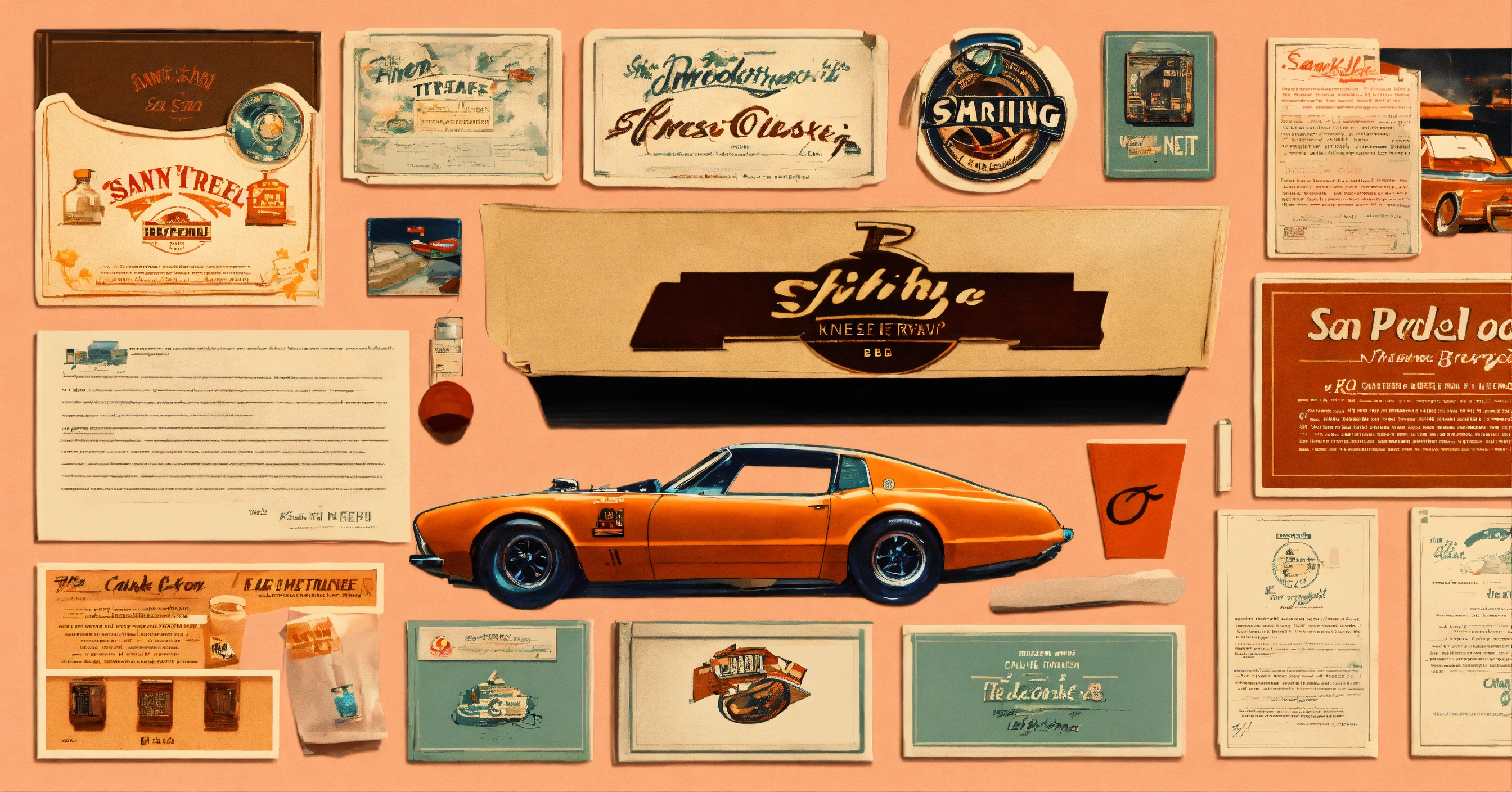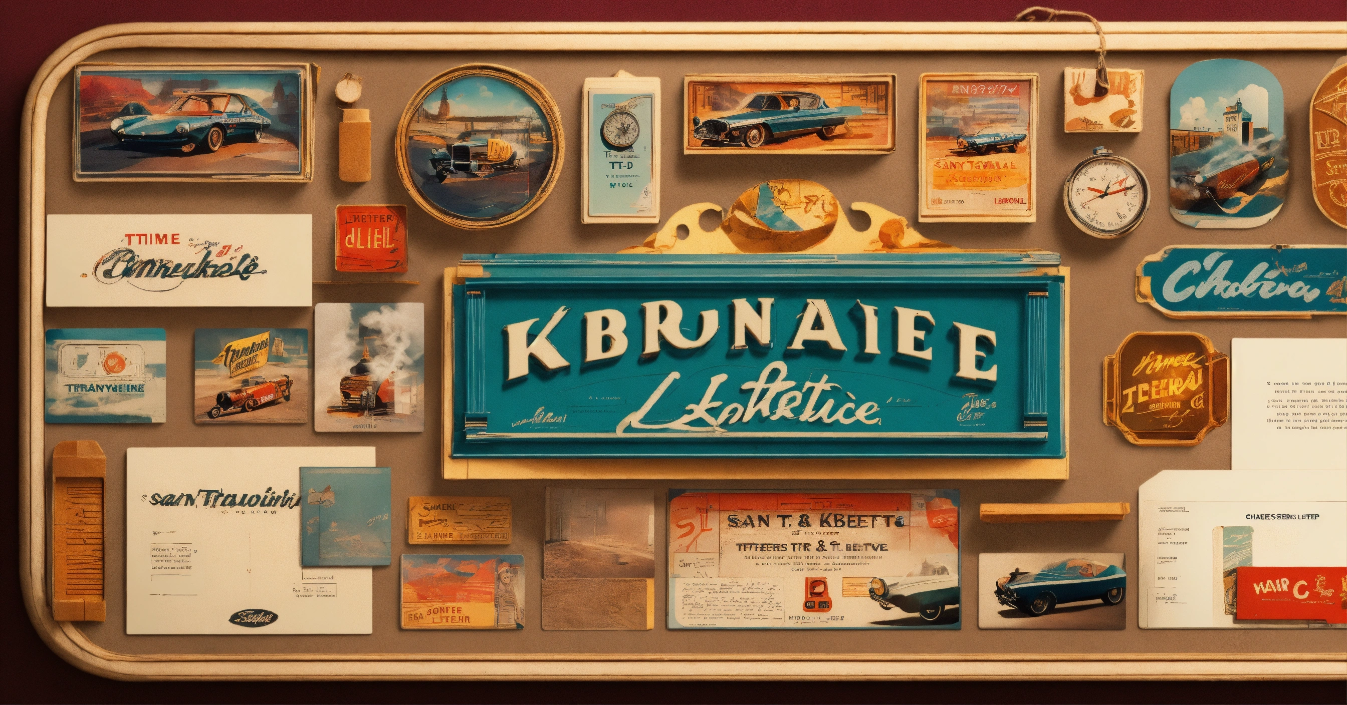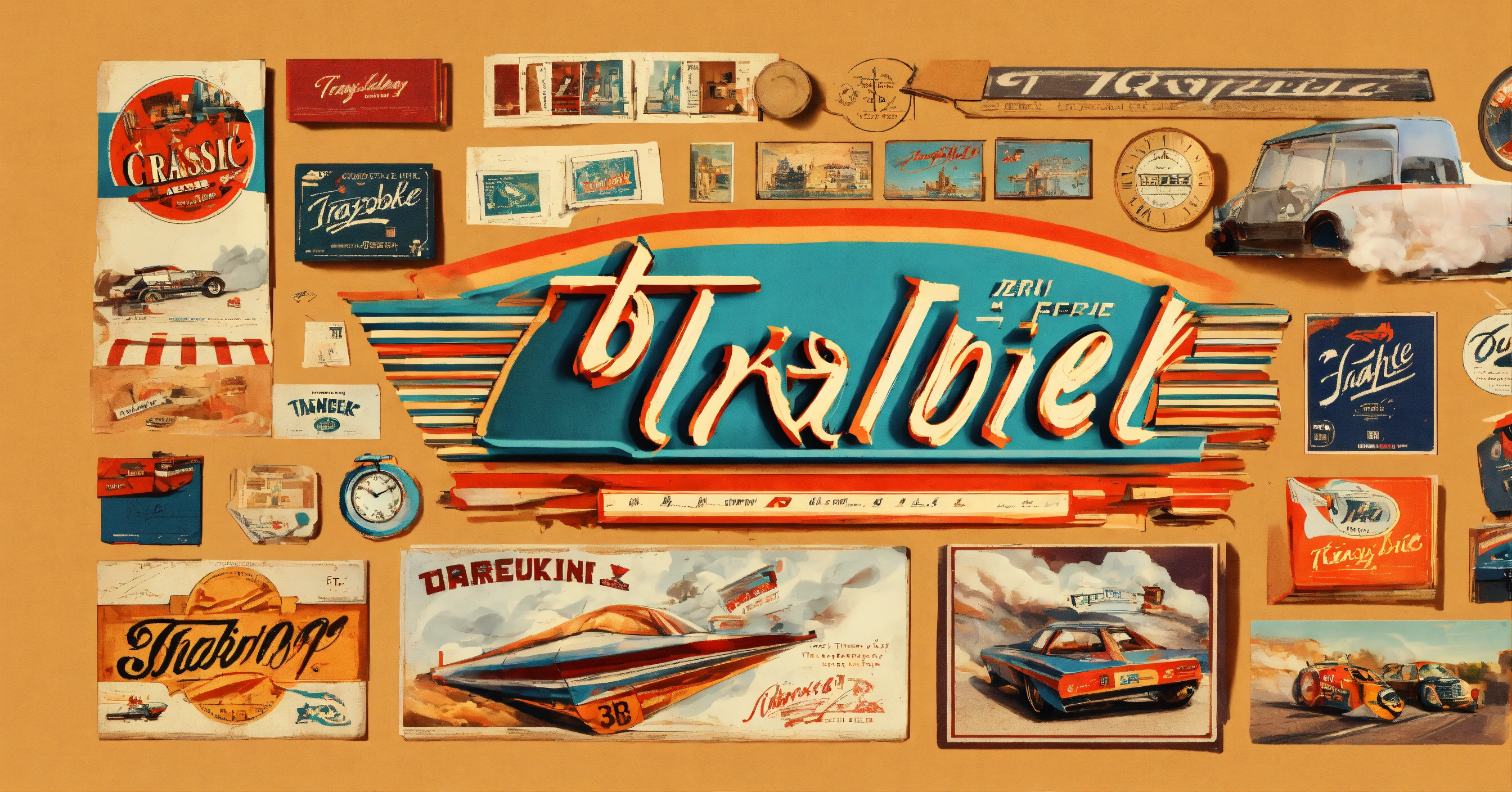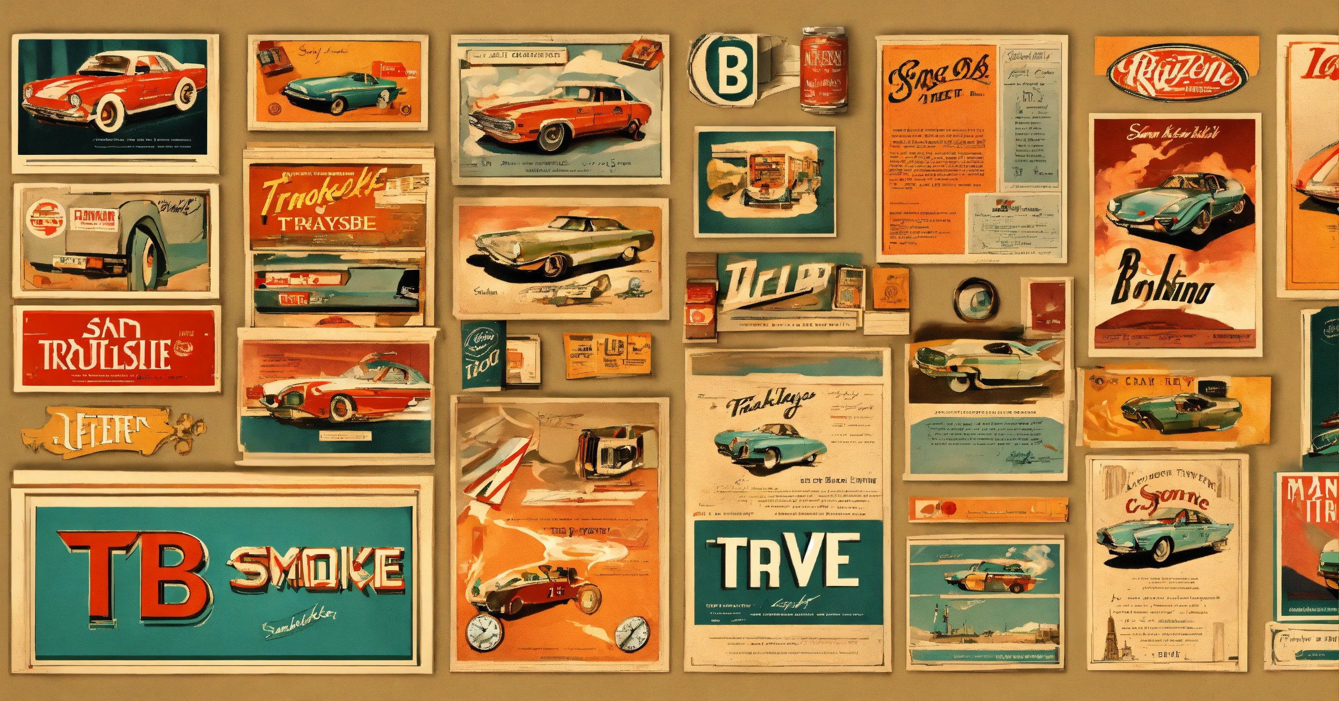 ((collage of letters)), nostalgic branding, [cartoon]_smoke, knolling layout, logo concept sheet, time travel, multiple looks, letter t and b, “traybien” lettering, script, san serif, retro sticker, vintage racing aesthetic, breeze, three dimensional expression of 2d classic layouts
