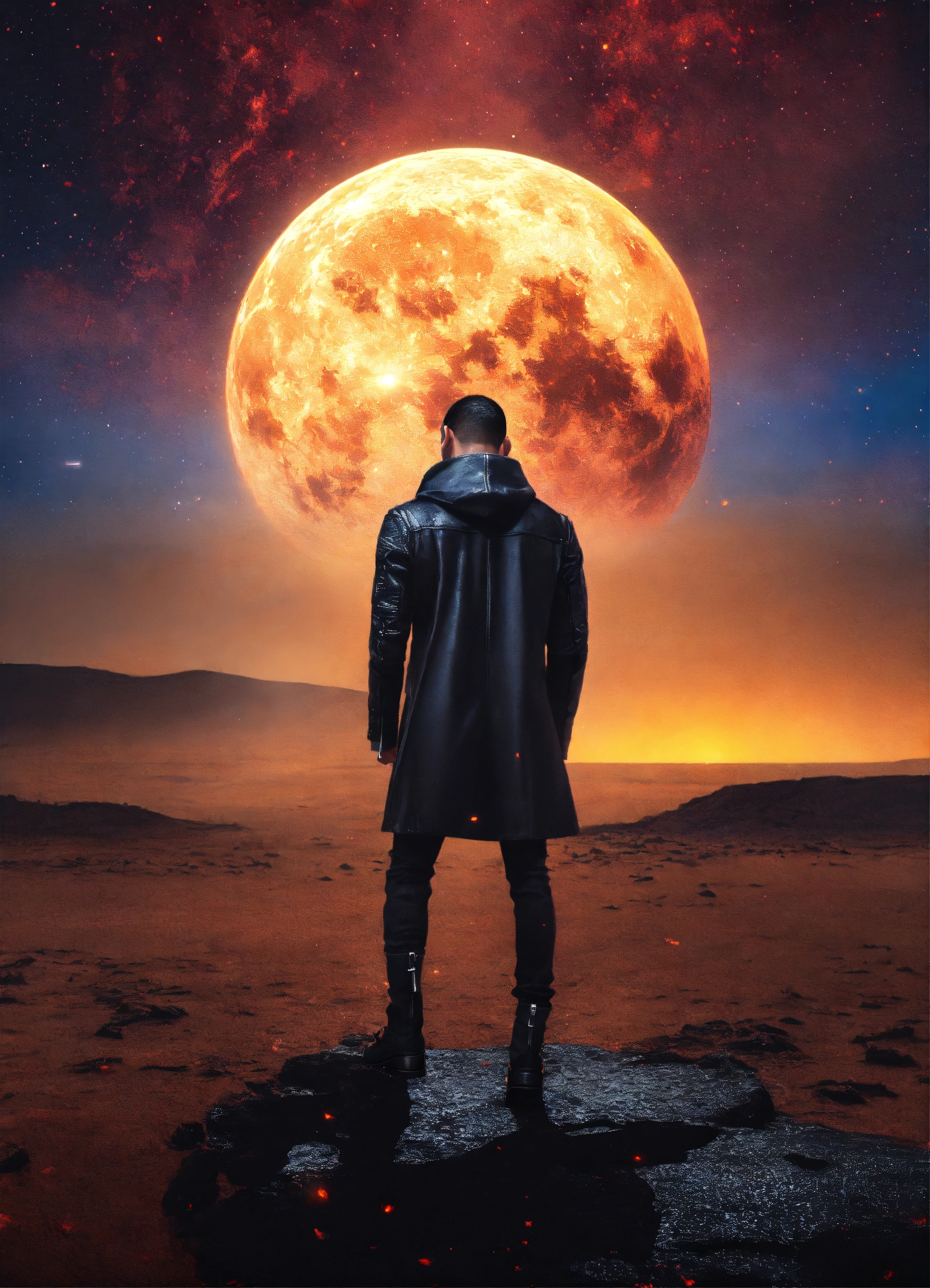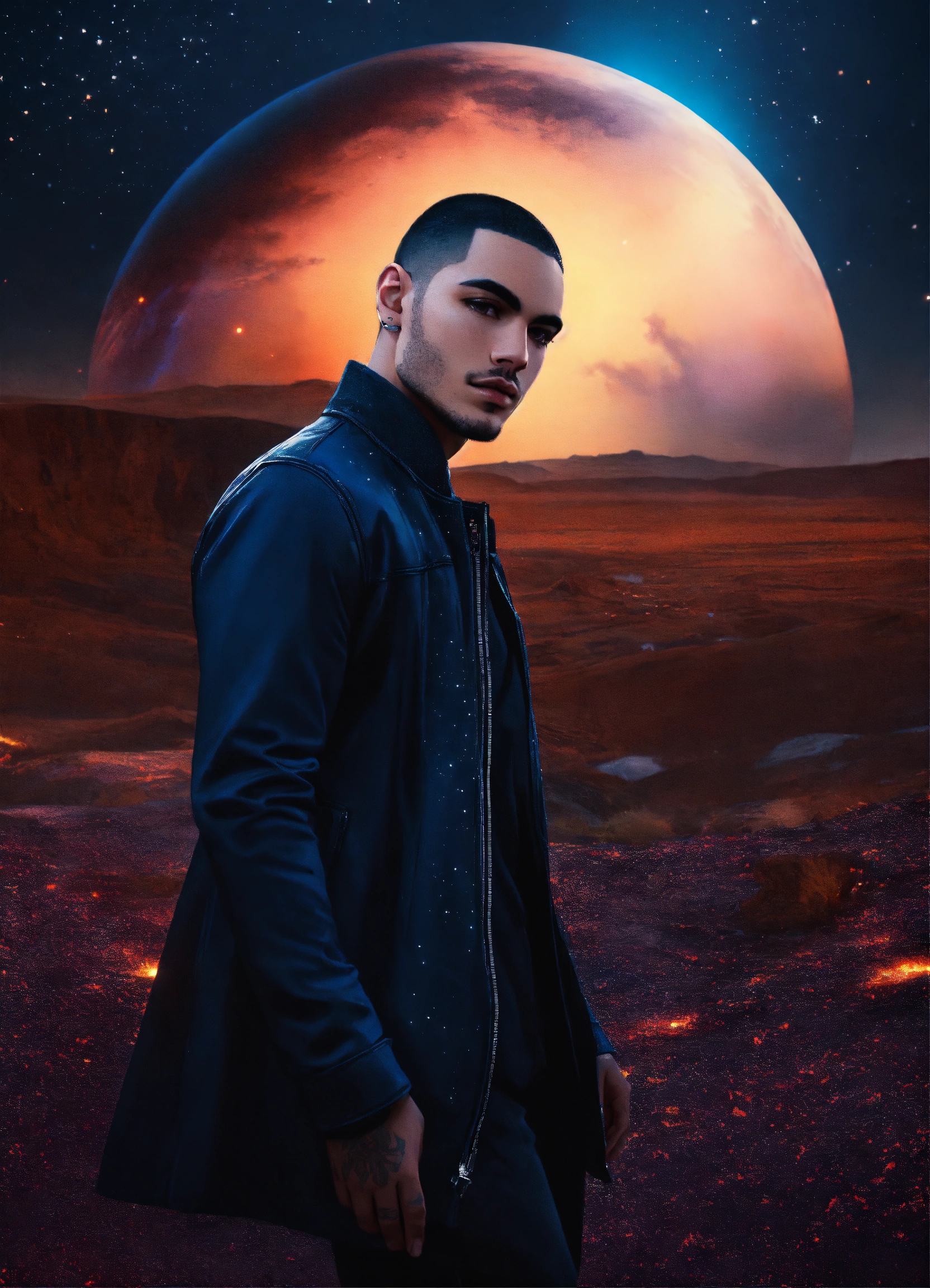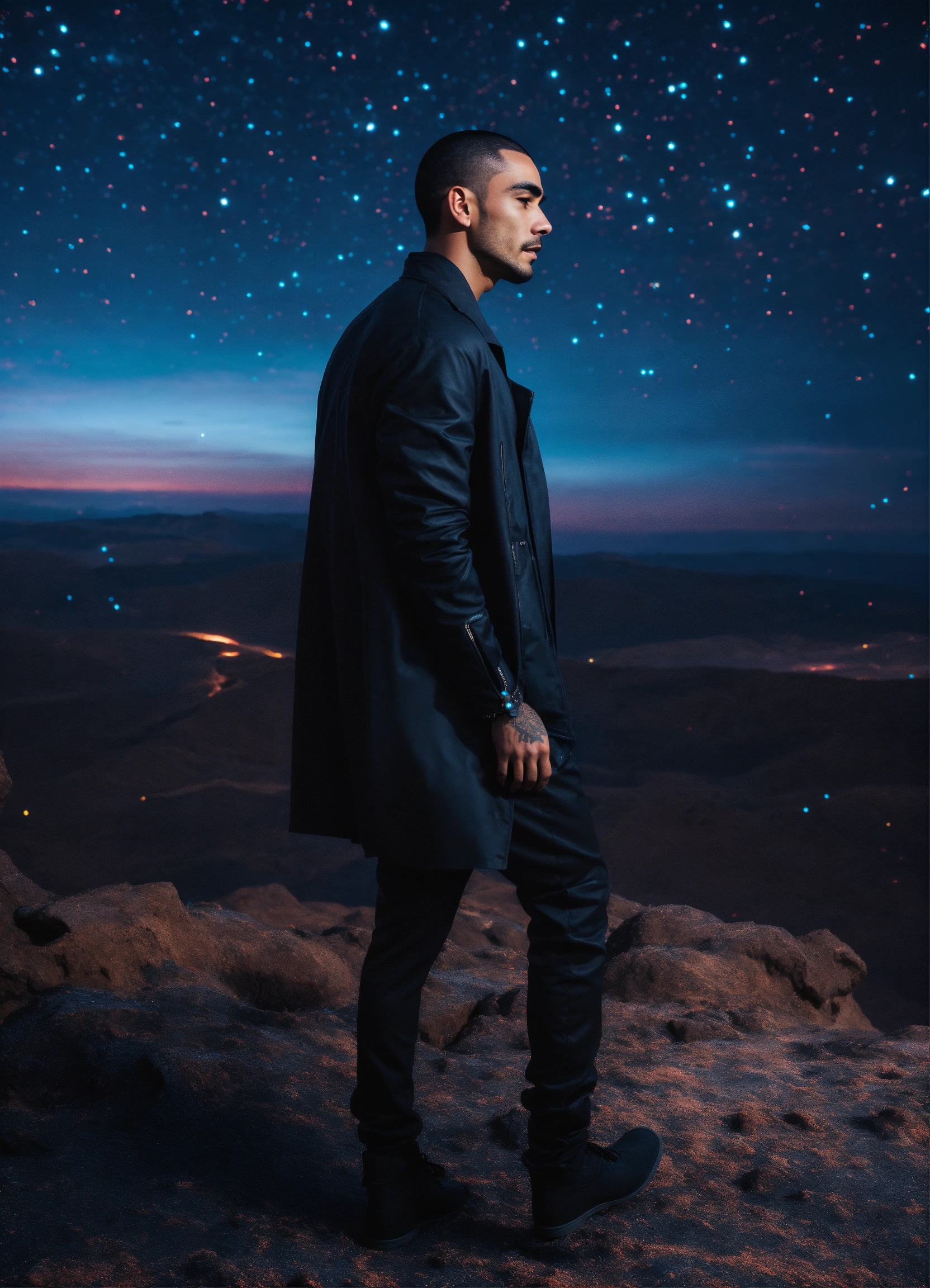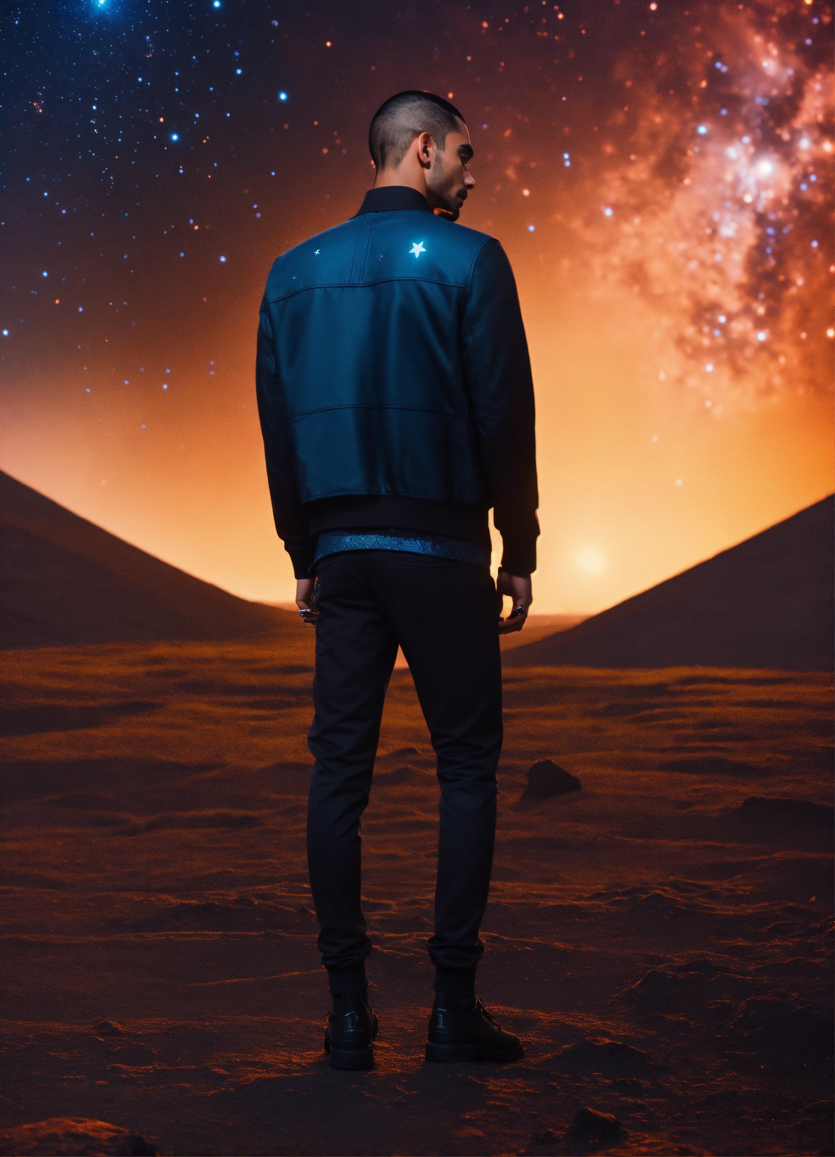 Manny montana, dark hues, back half turned, in a futuristic landscape, full body, stars falling, sunrise, realistic, photoshoot