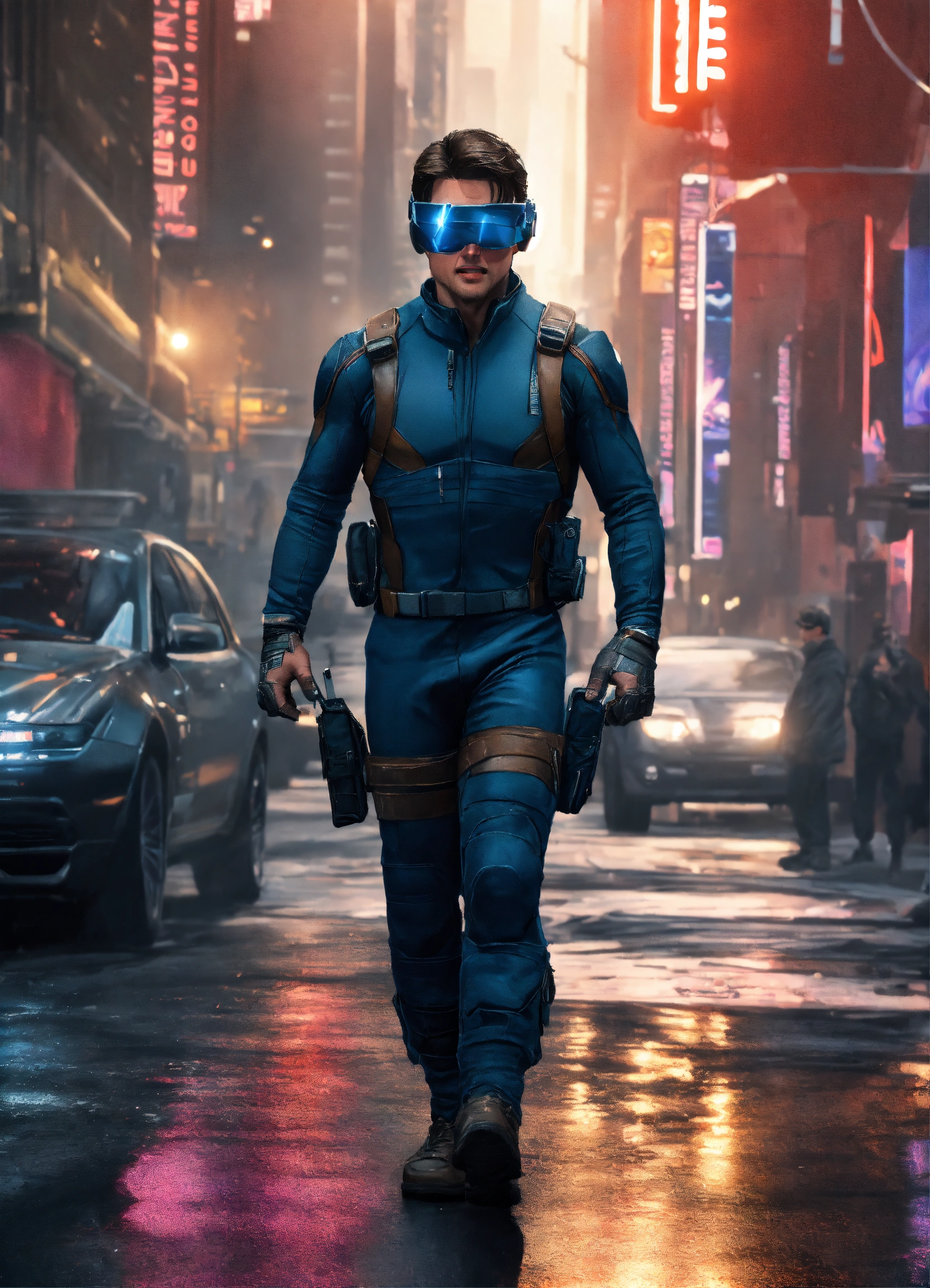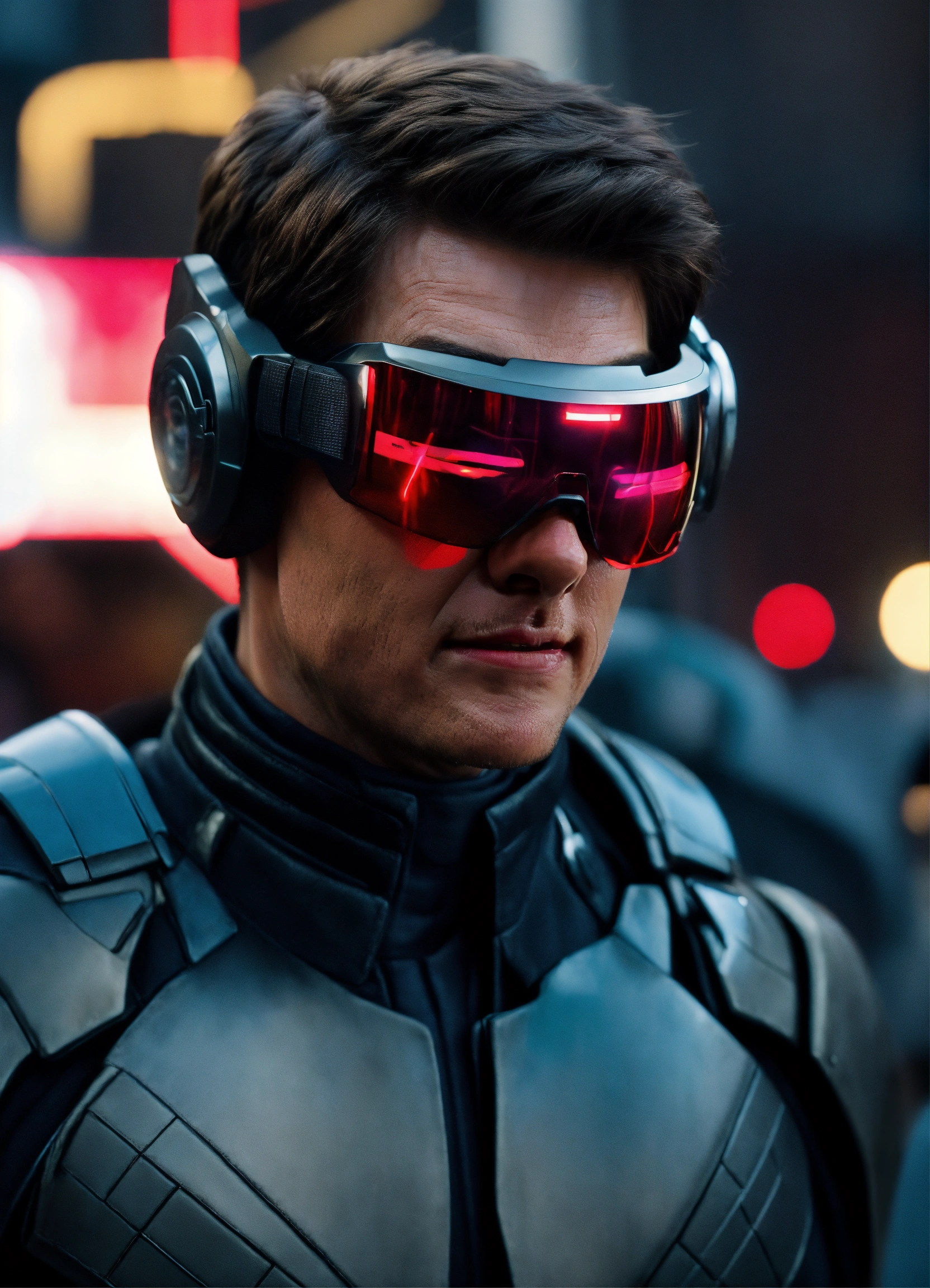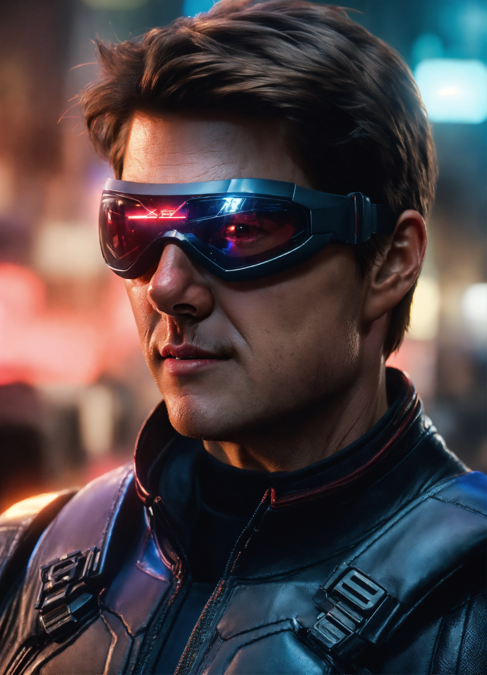 Tom cruise, 40 years old, with cyclops visor of bryan singer x-men movie, is cyclops of x-men in a cyberpunk metropolis, photorealistic, 8k resolution, hyper detailed
