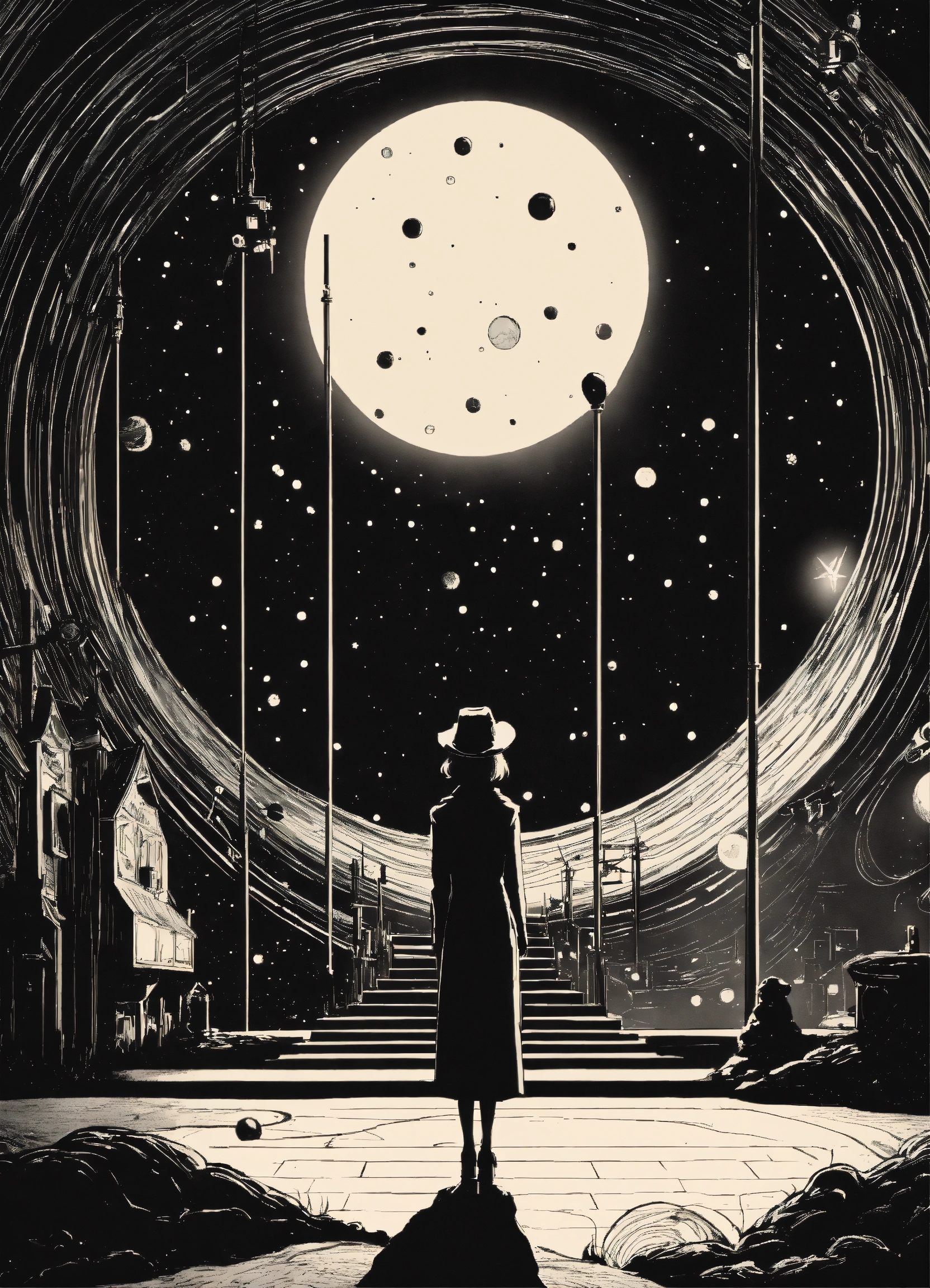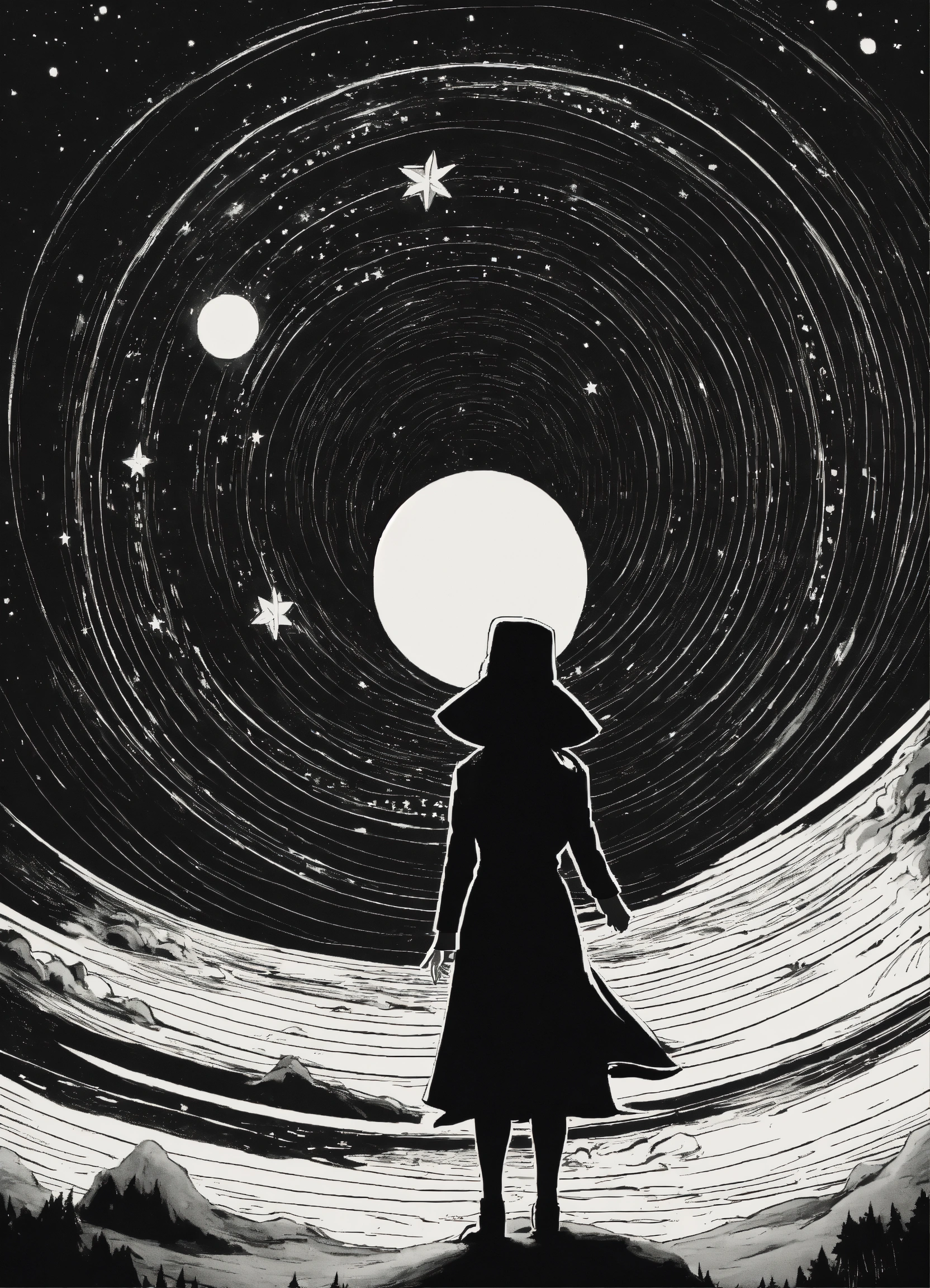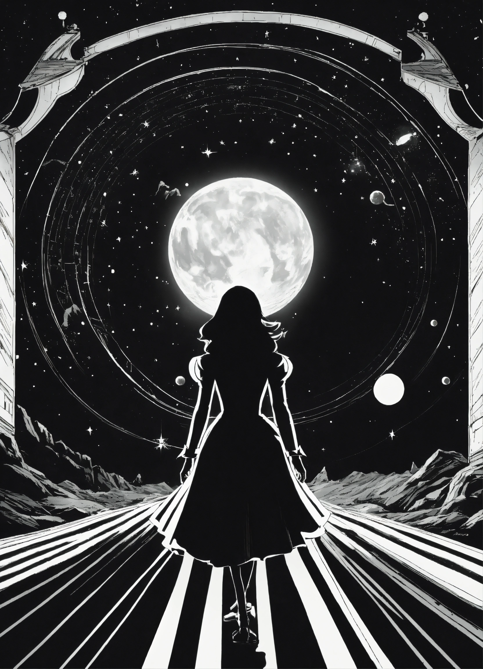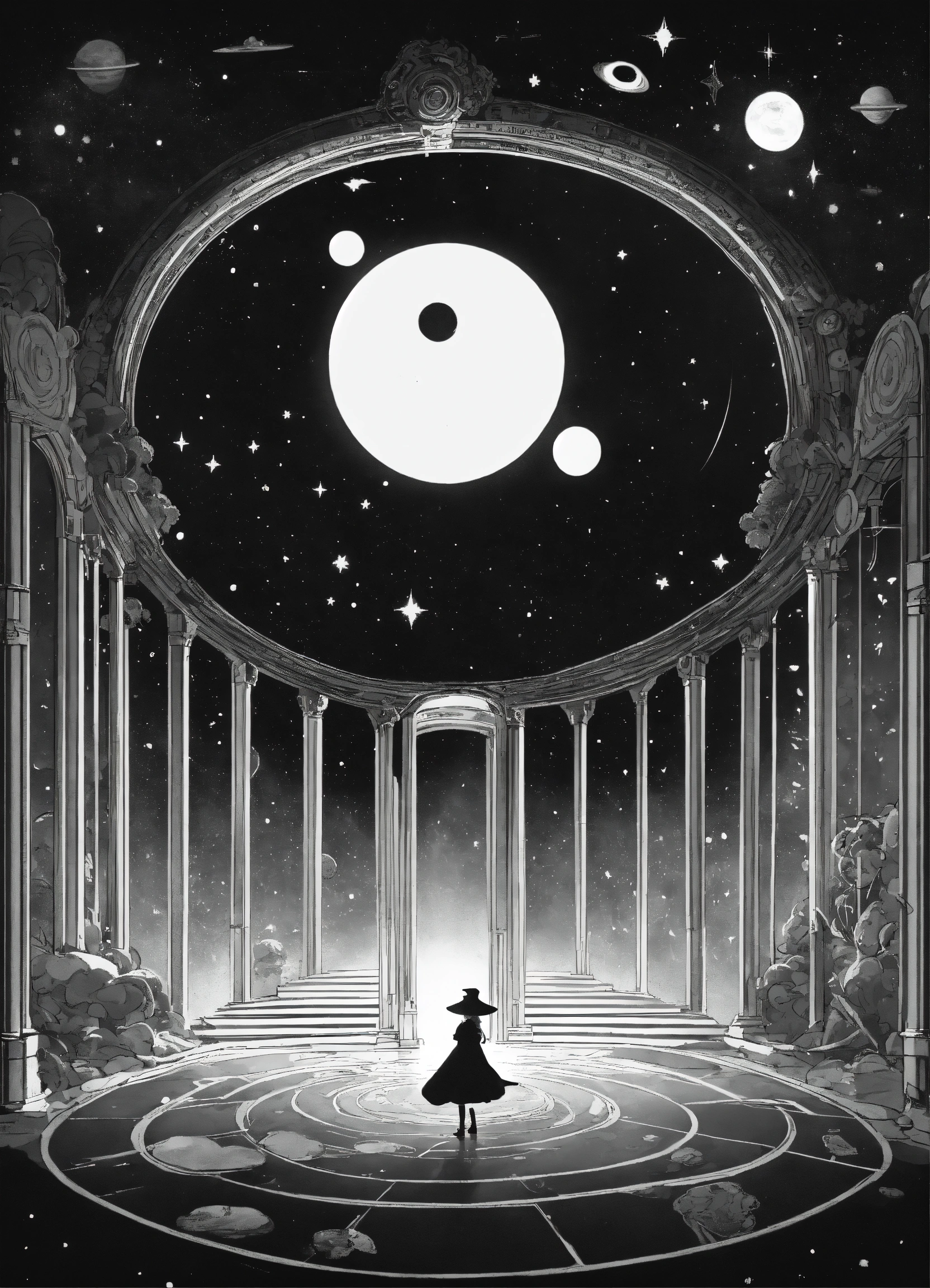 Generate a black and white cartoon-style poster that harkens back to the silent film age, with a deep space filled with hand-drawn, animated stars and nebulae reminiscent of early cinema. in this timeless void, a lone, little witch with exaggerated features indicative of vintage cartoons ponders her surroundings with a look of comic astonishment. encircling her are portals styled like old zoetrope stripes, spiraling in captivating black and white, each a silent movie screen to a different, enchanting cartoon universe
