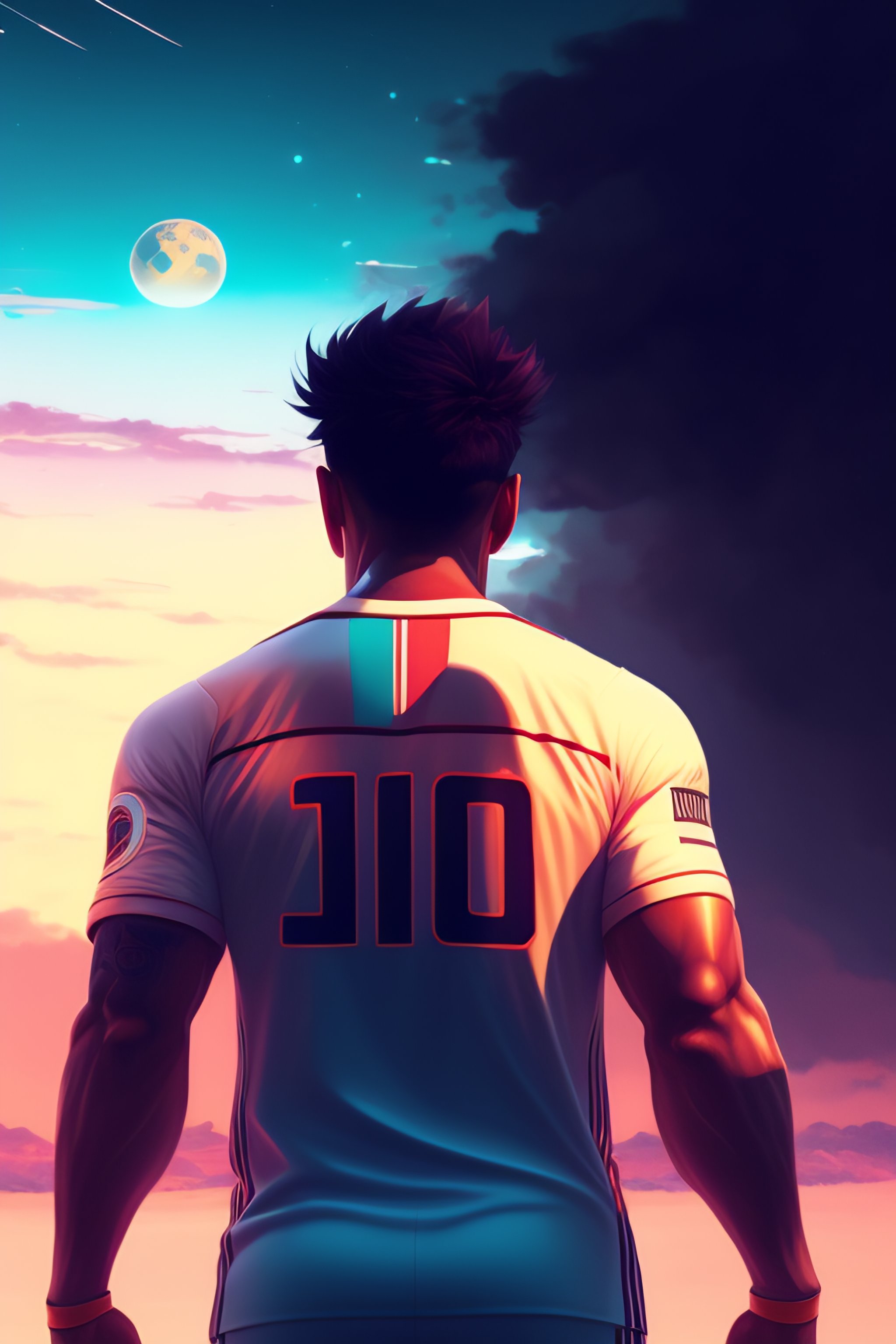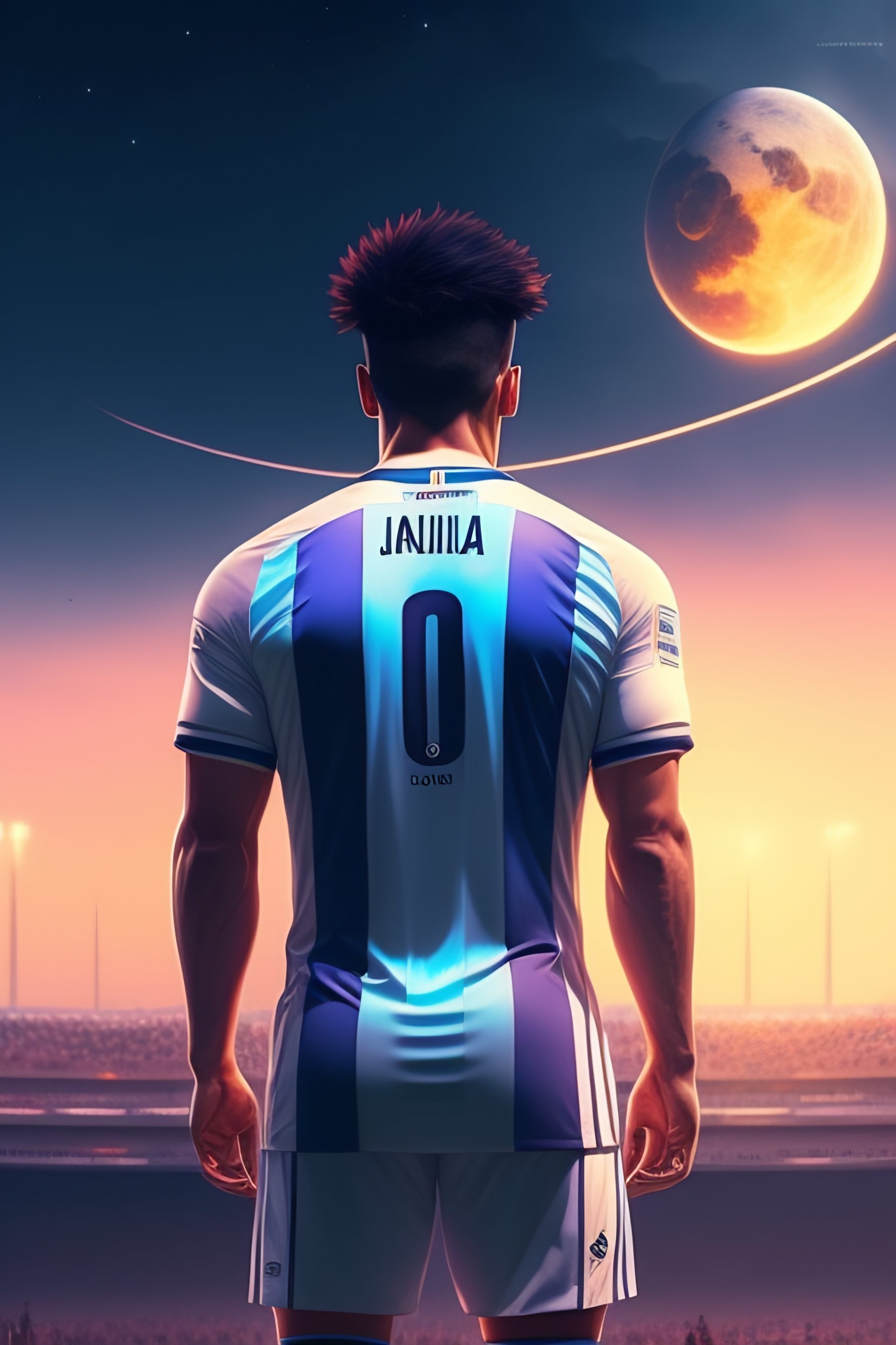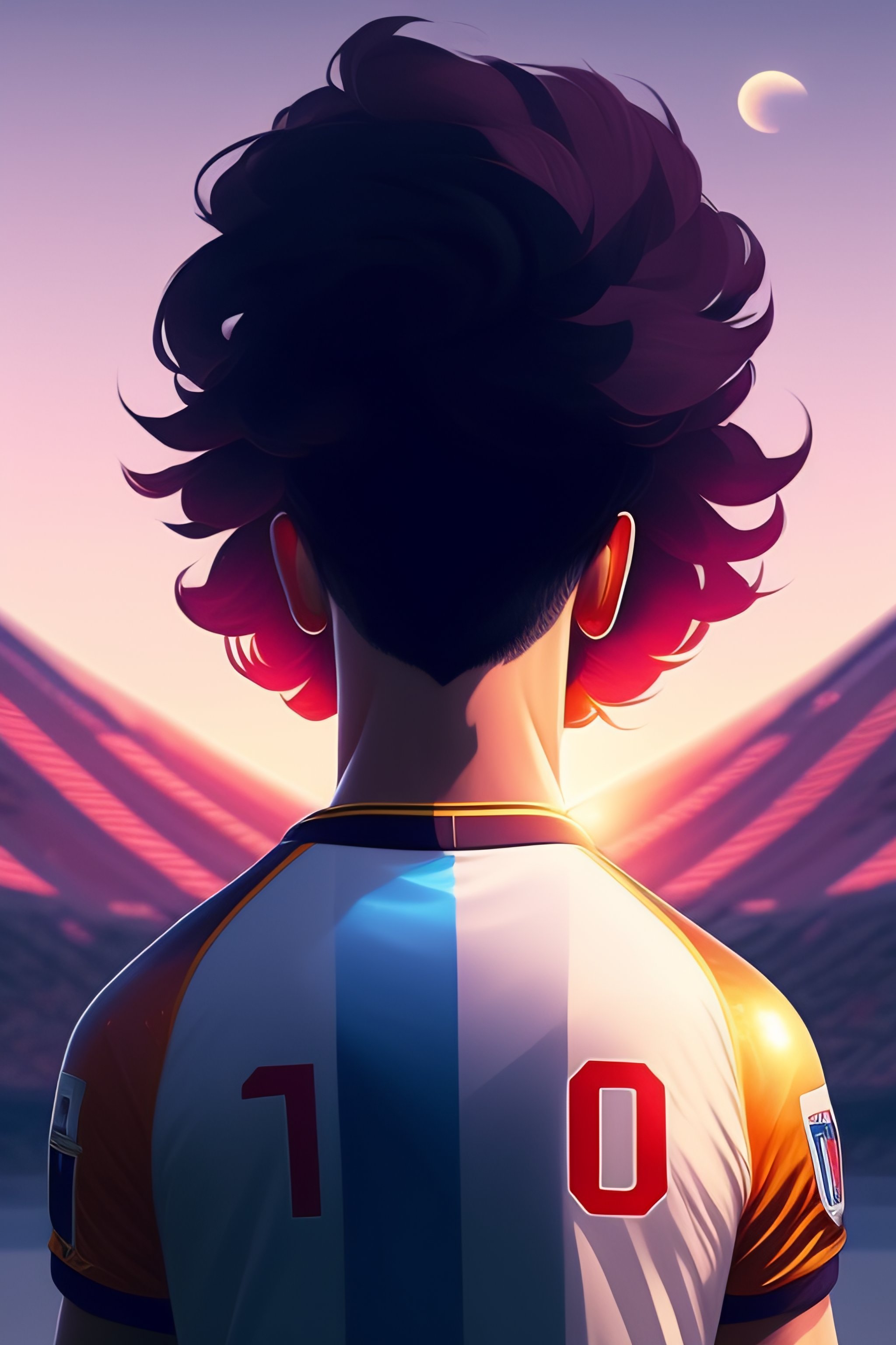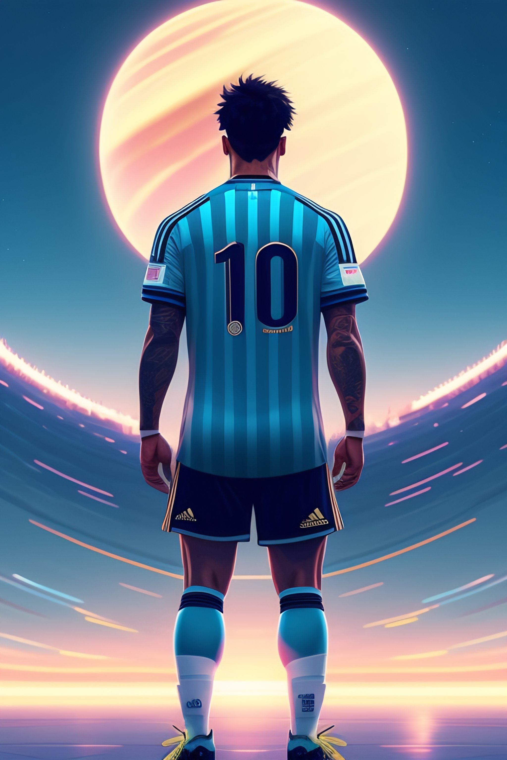 Back of a argentine footballer looks like maradona wearing 10 argentine team jersey playing football, backdrop of dawn, saturn in the background, illustration, concept art, anime, key visual, trending pixiv fanbox by wlop and greg rutkowski and makoto shinkai and mamoru hosada and studio ghibli