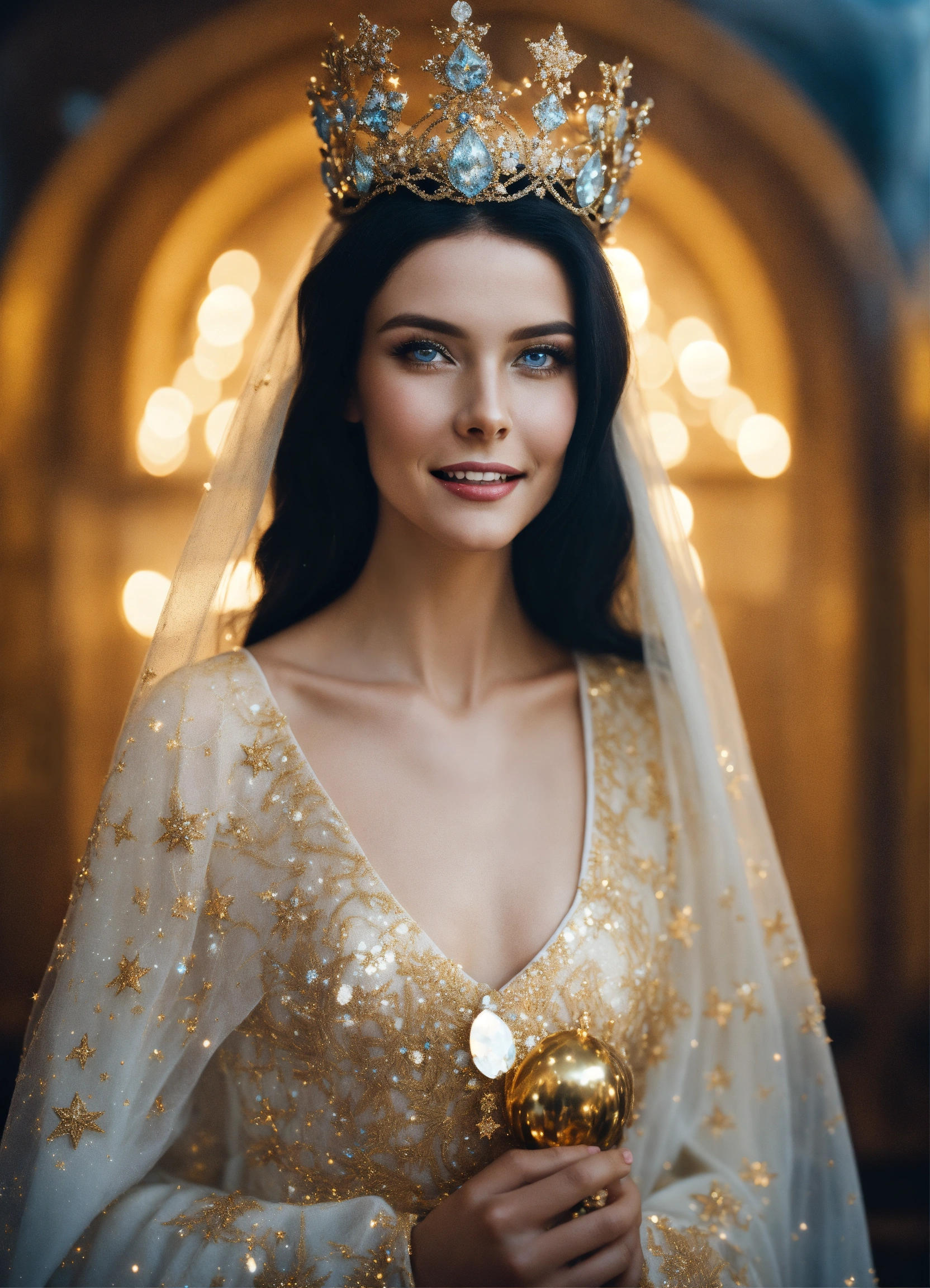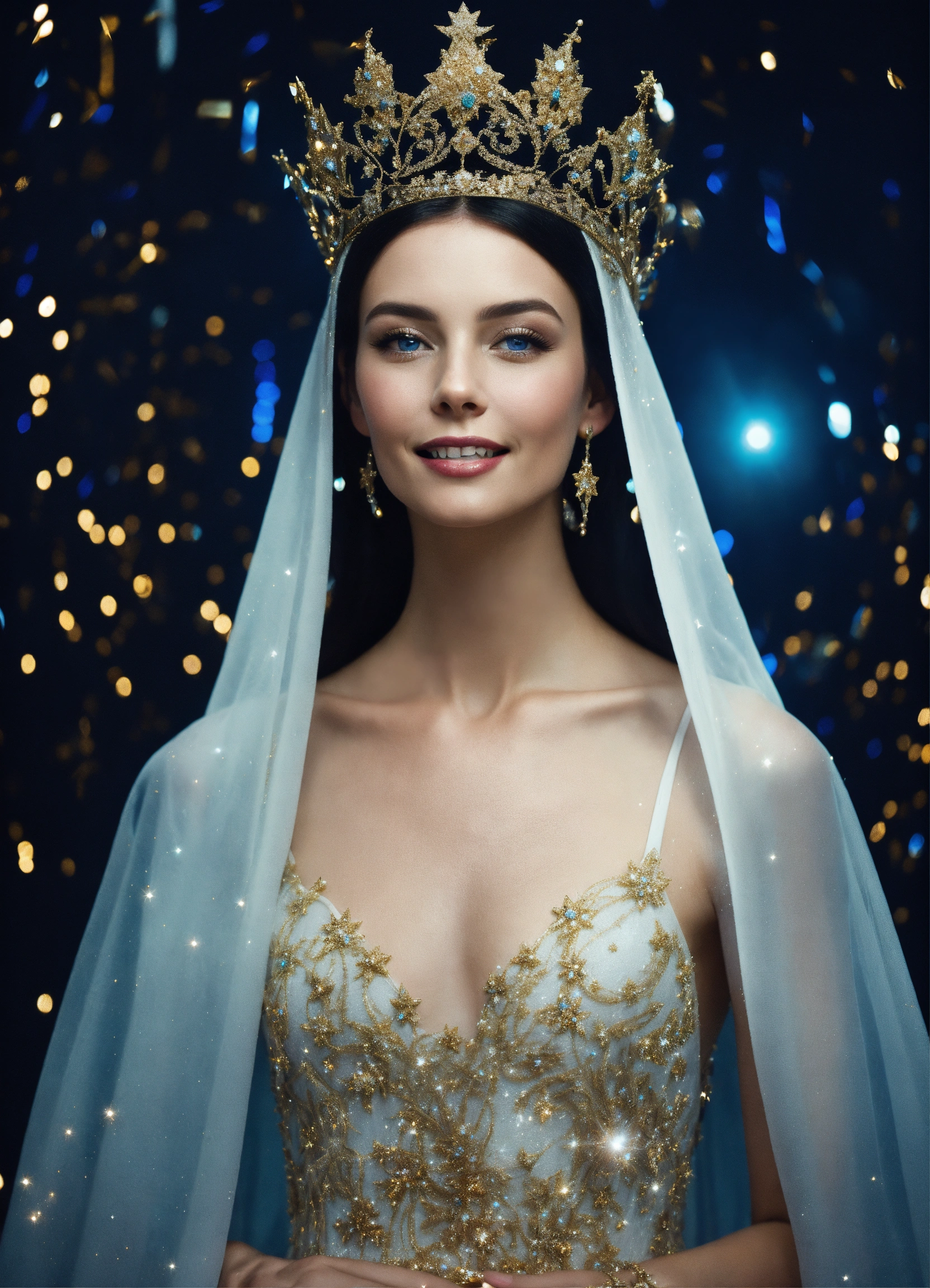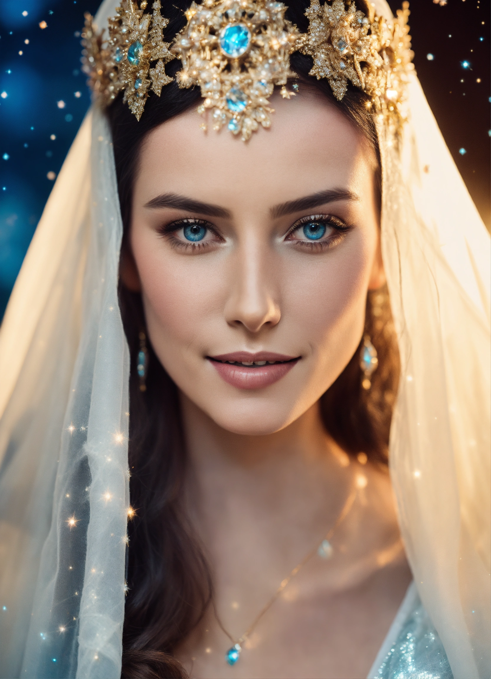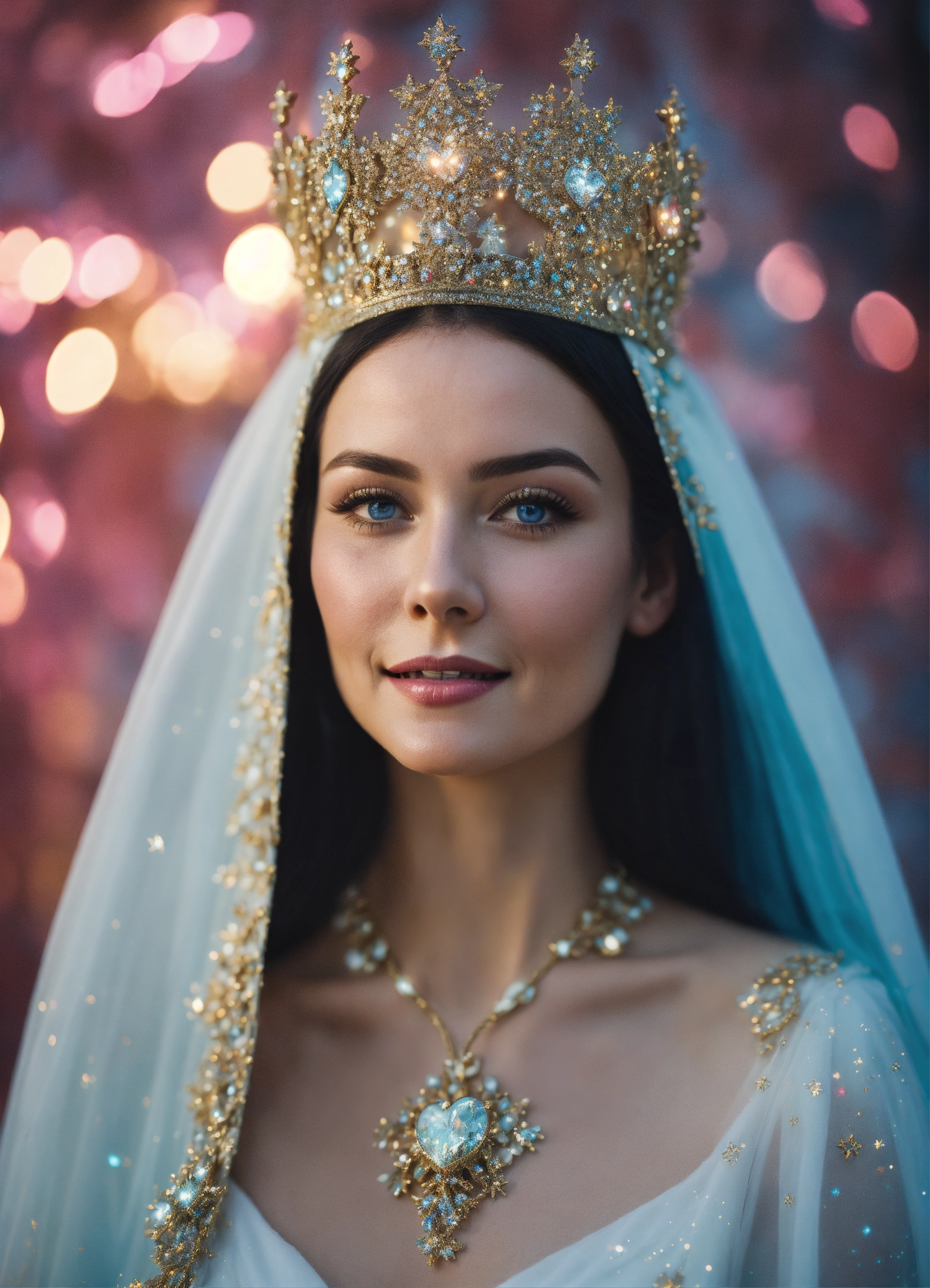 Iconoclastic surreal close-up photo portrait of hauntingly beautiful very slim elegant virgin mary supermodel white blissfully joyous, kind huge smile and staring lovingly straight ahead directly into camera, elegant, high cheekbones, full lips, wearing sparkling golden crown of stars, black hair, brilliant icy blue eyes centred directly on me, wearing long full sparkling white veil covering her hair, and queenly galaxy pink sparkly robes with high neckline, symmetrical, iconic, striking, award winning photo, powerful, emotional, editorial photoshoot by alessio albi, background is sparkling hearts in bright sunshine.