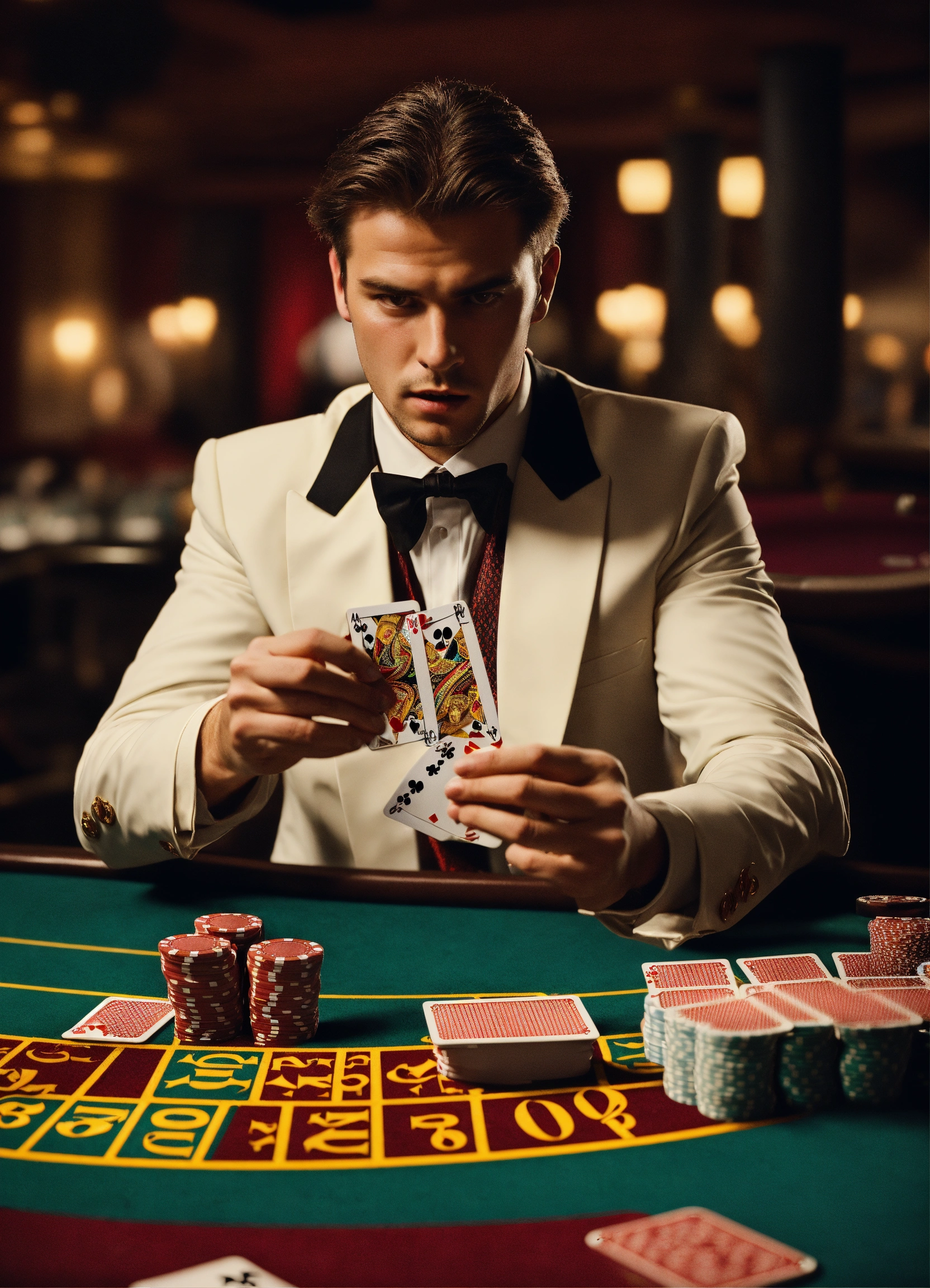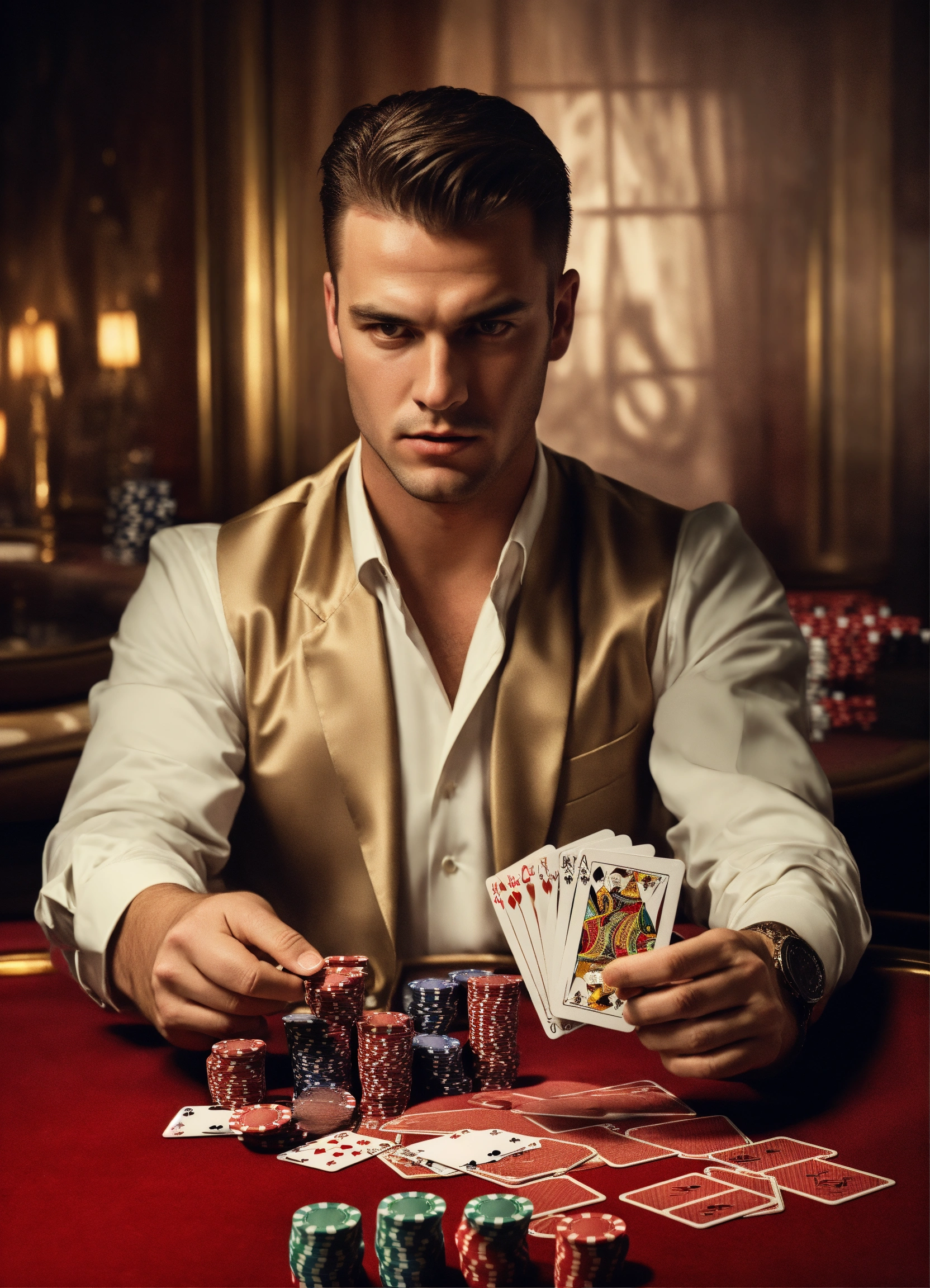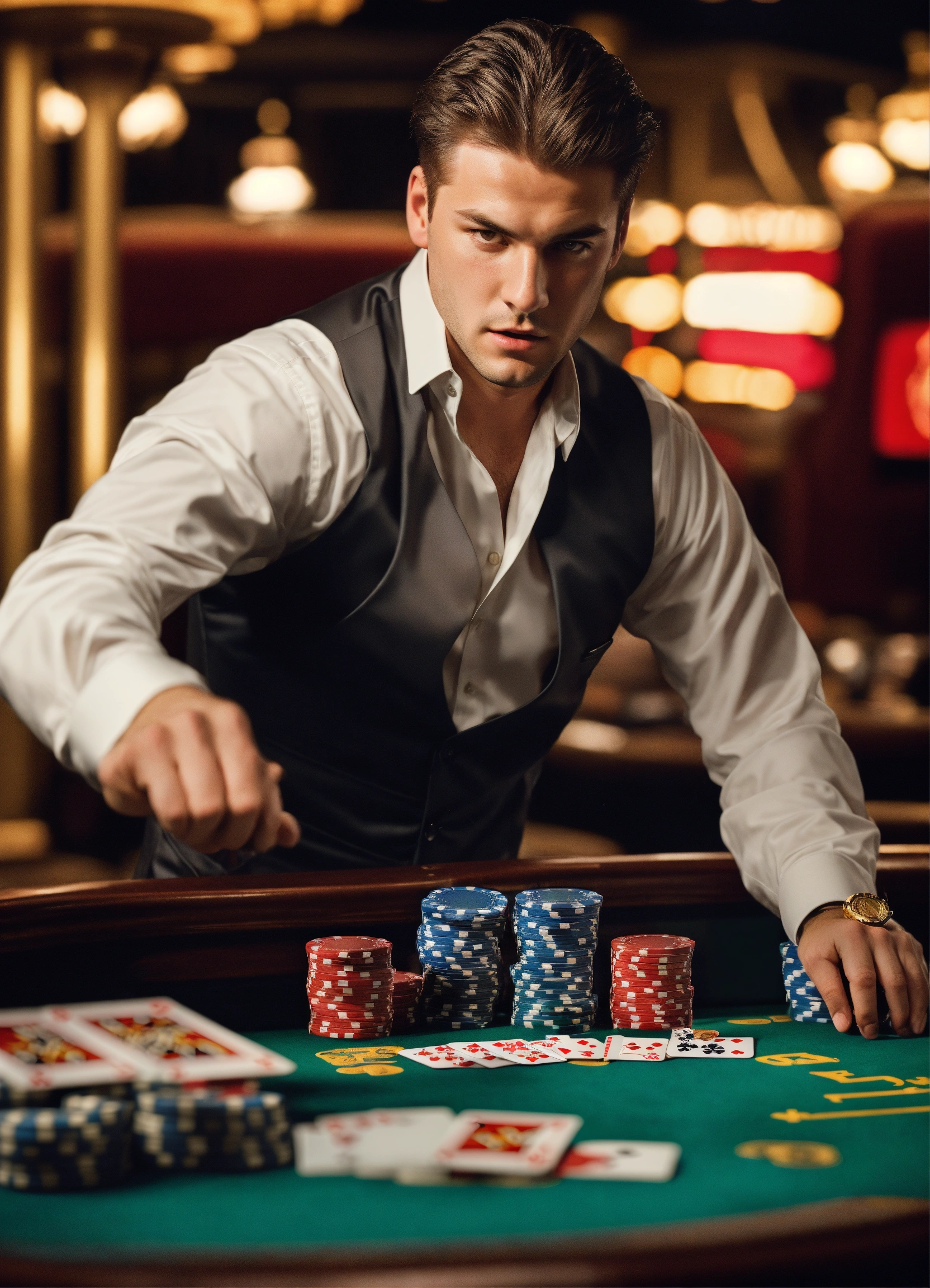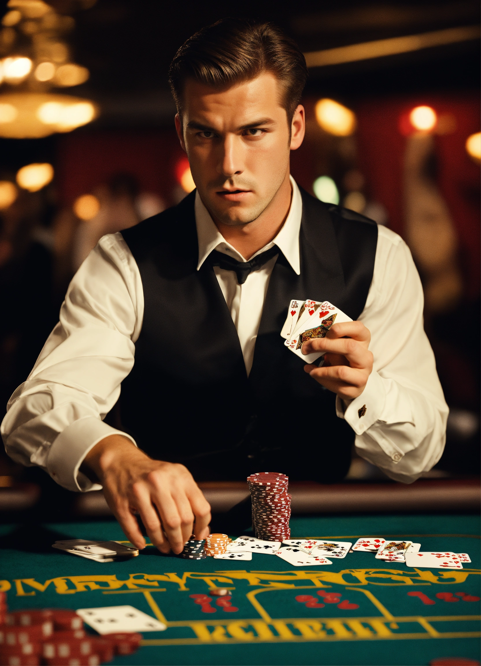 White young casino dealer throws cards, in action, acting, self-confident, pride, arrogant, aggressive, offensive, b-movie style, 1990 style, gangster style, 8k, highly detailed photo