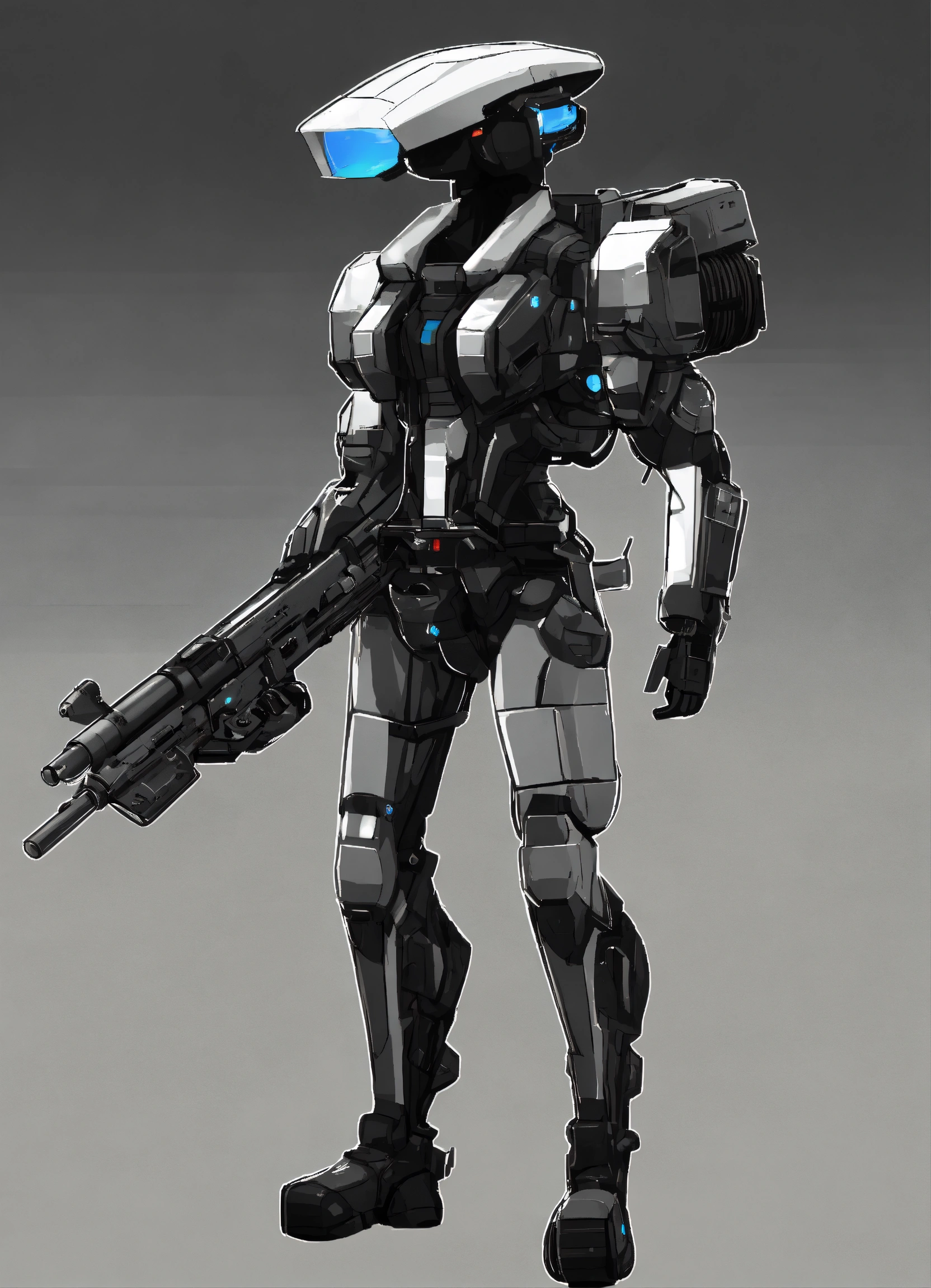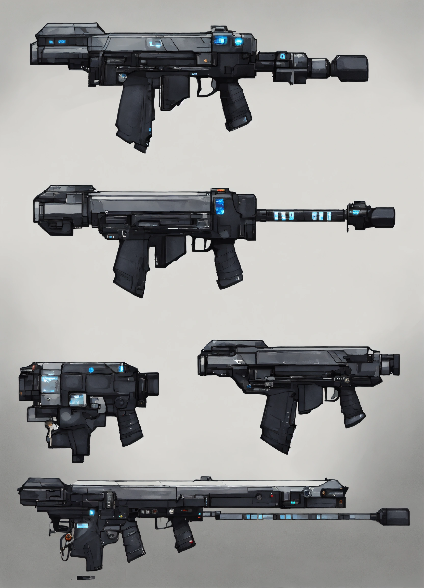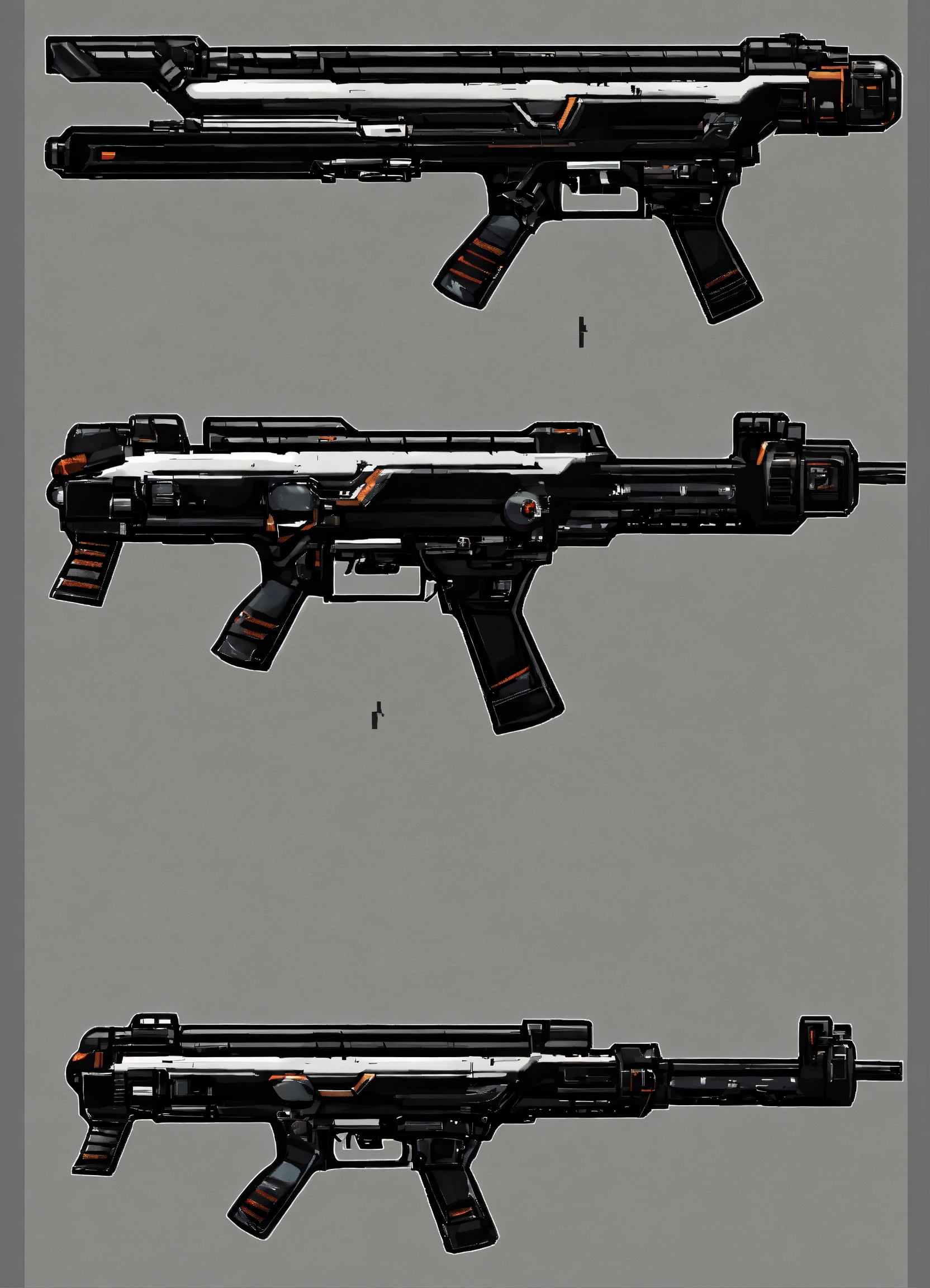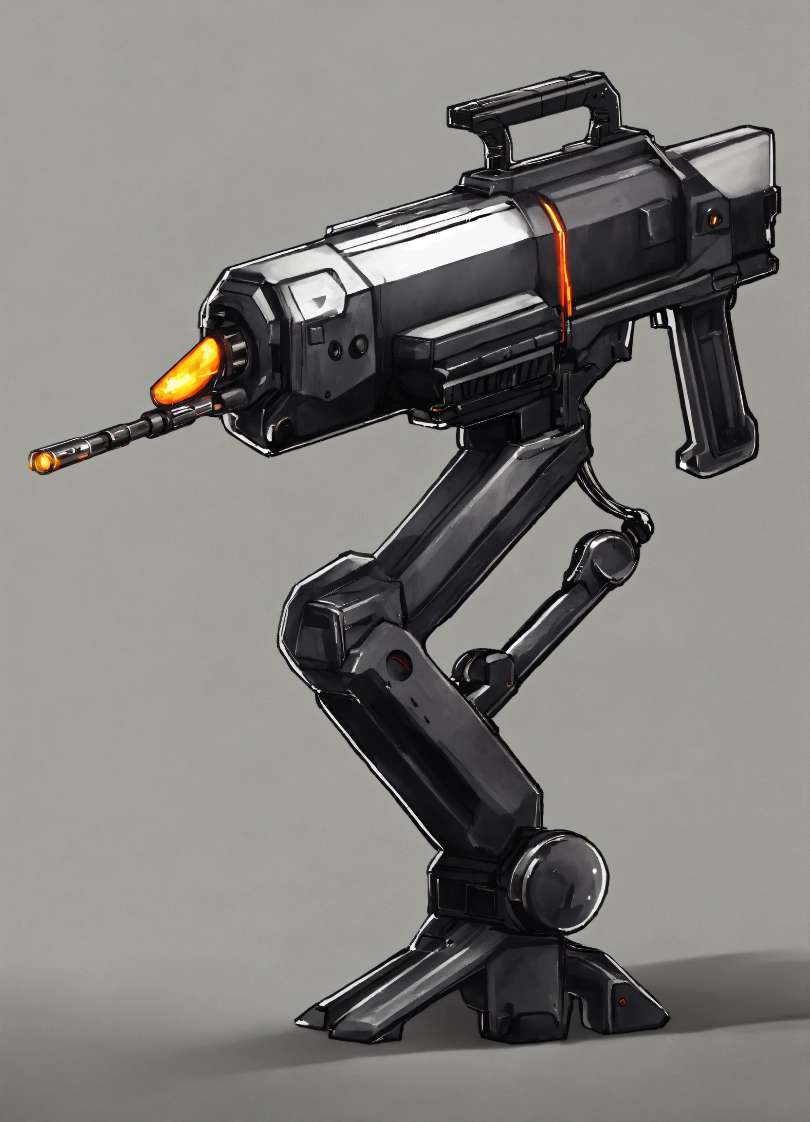 A 2d gun for a sci-fi platformer game, black and white, transparent background, stickman theme. right side view