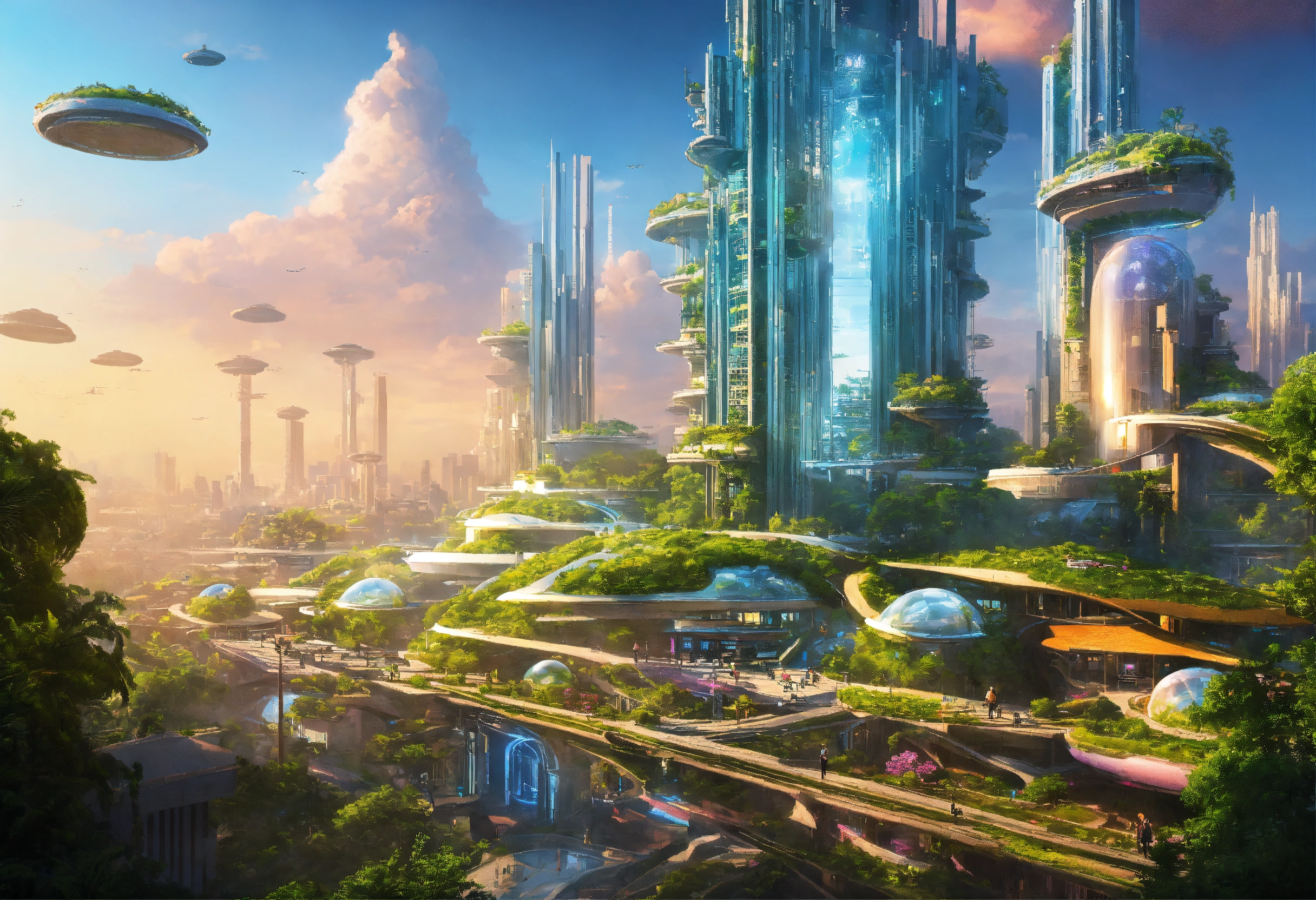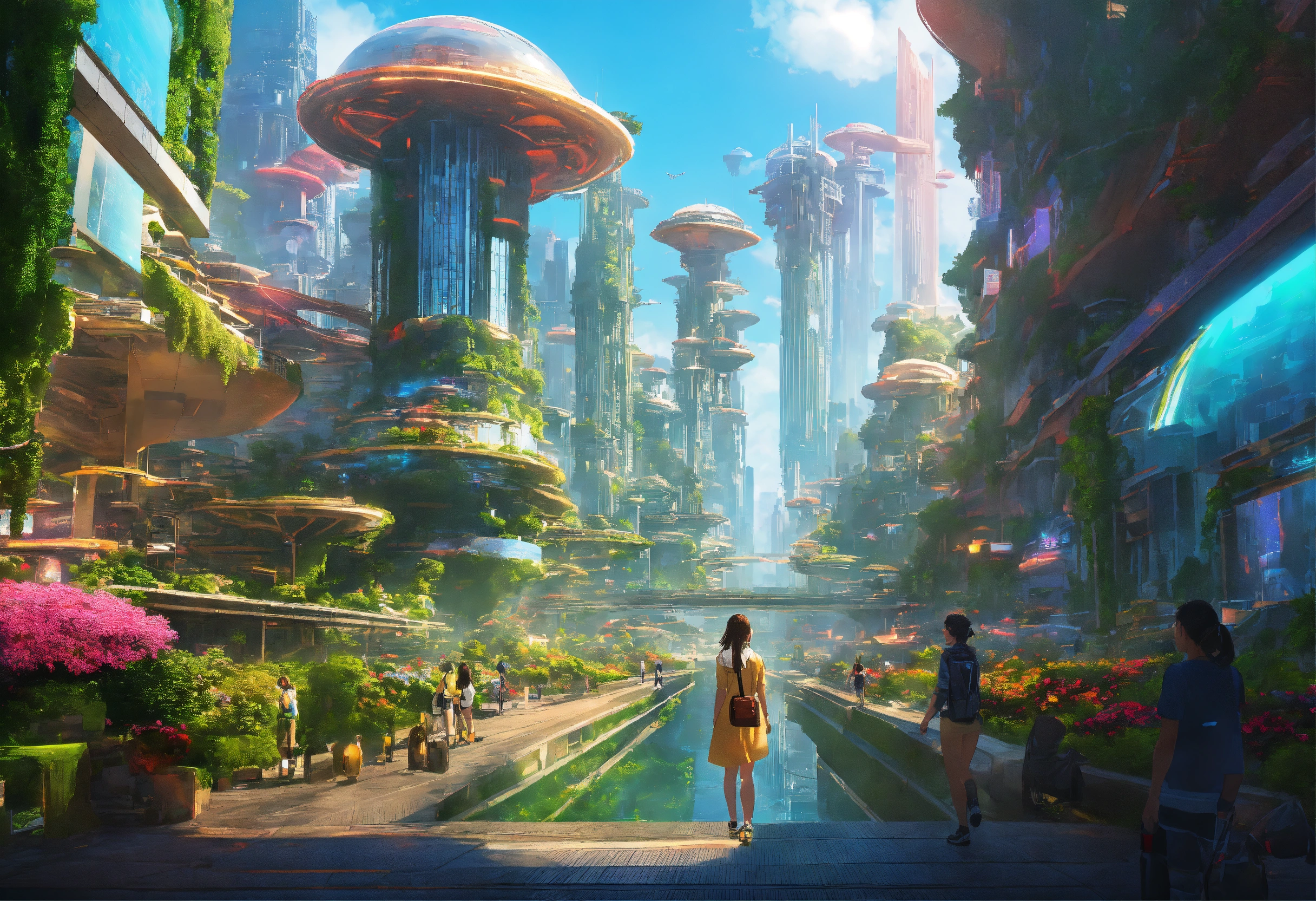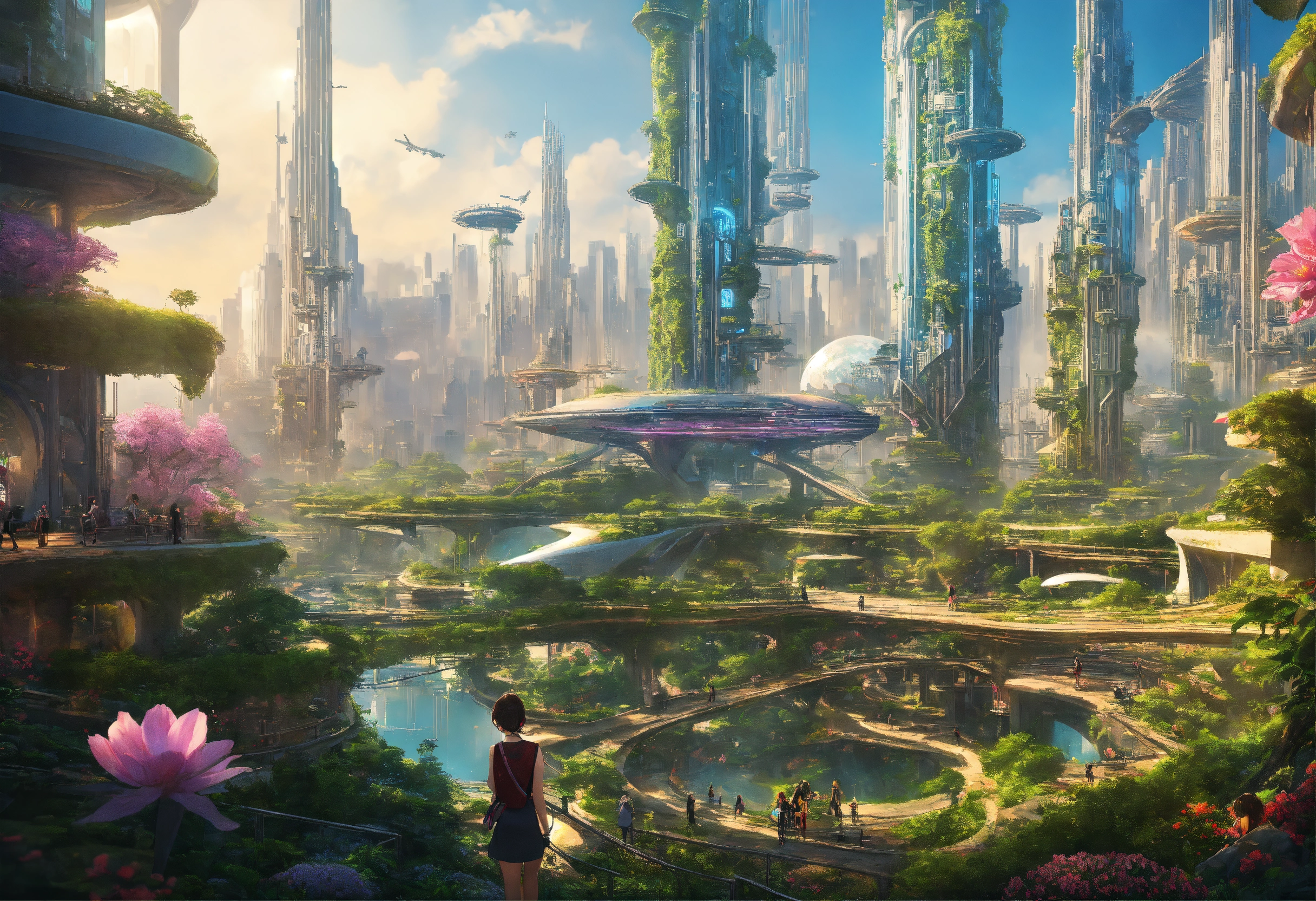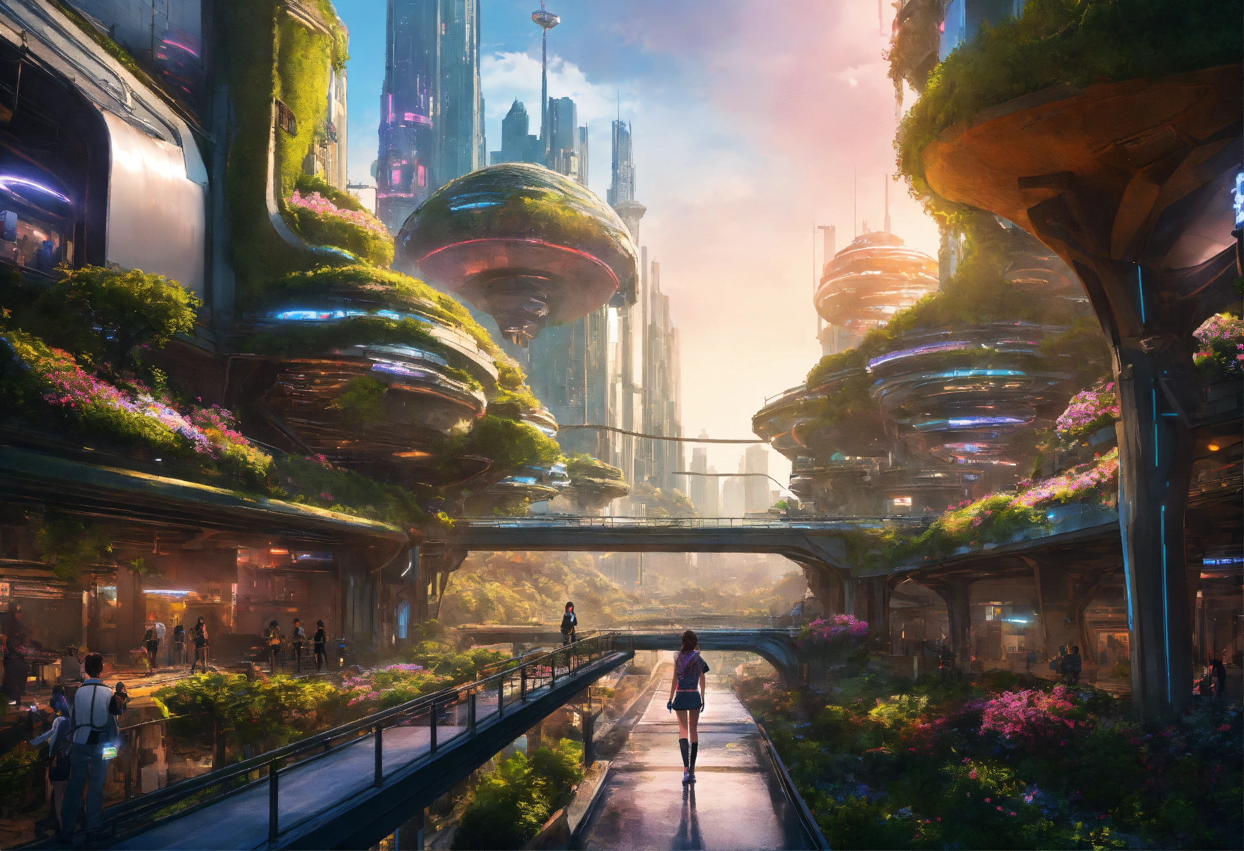 Zoom on a smiling girl. imagine a futuristic city covered in lush greenery, its buildings connected by a network of sleek, high-tech infrastructure. the atmosphere is filled with a sci-fi ambiance, with vibrant and vivid hues creating an otherworldly feeling. picture yourself walking through this city, surrounded by towering structures adorned with cascading plants and vibrant flowers. the air is filled with a sense of possibility and innovation. this is a city where nature and technology coexist harmoniously, creating a utopia for both humans and the environment. welcome to tech haven, where the future meets nature in a truly mesmerizing way.