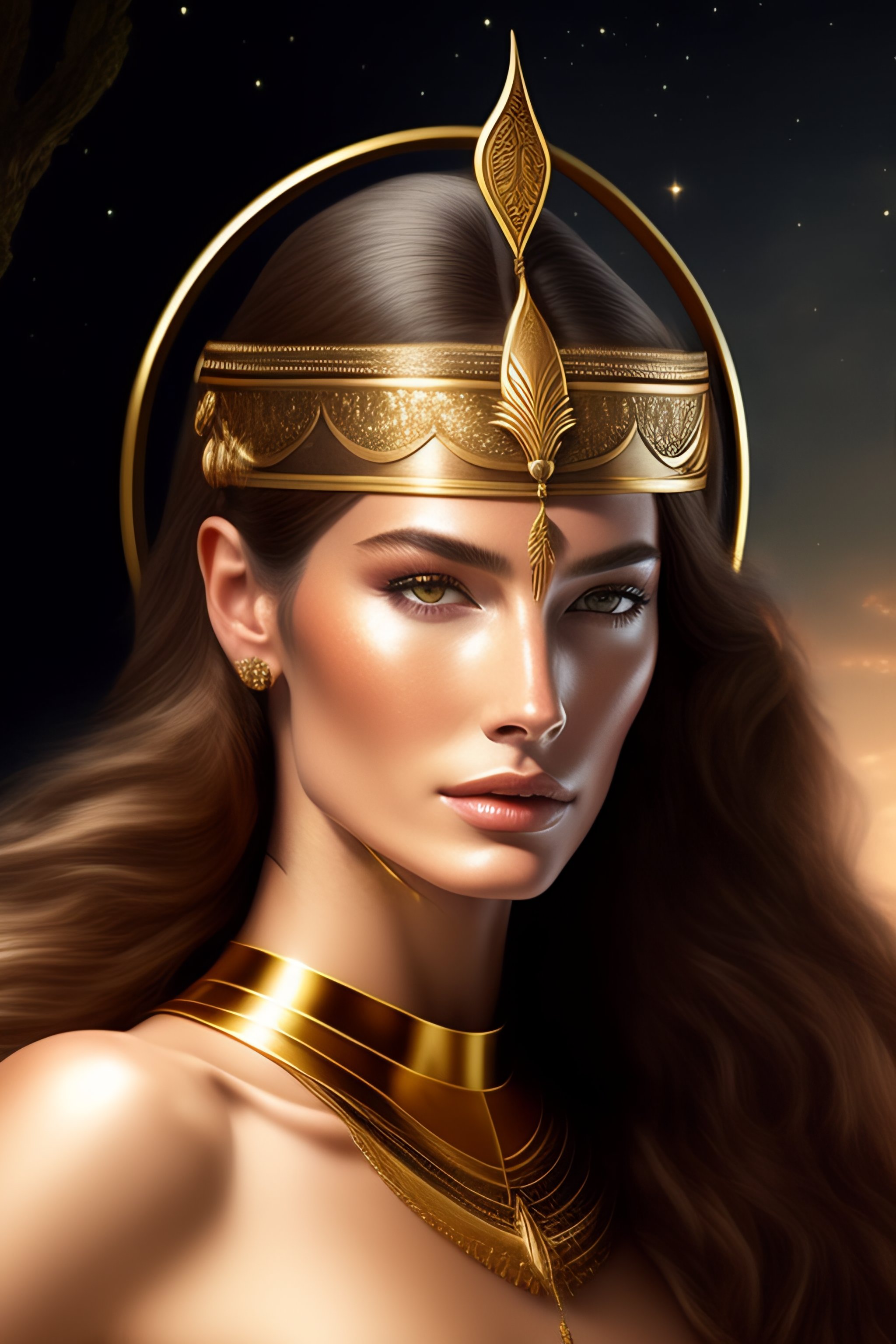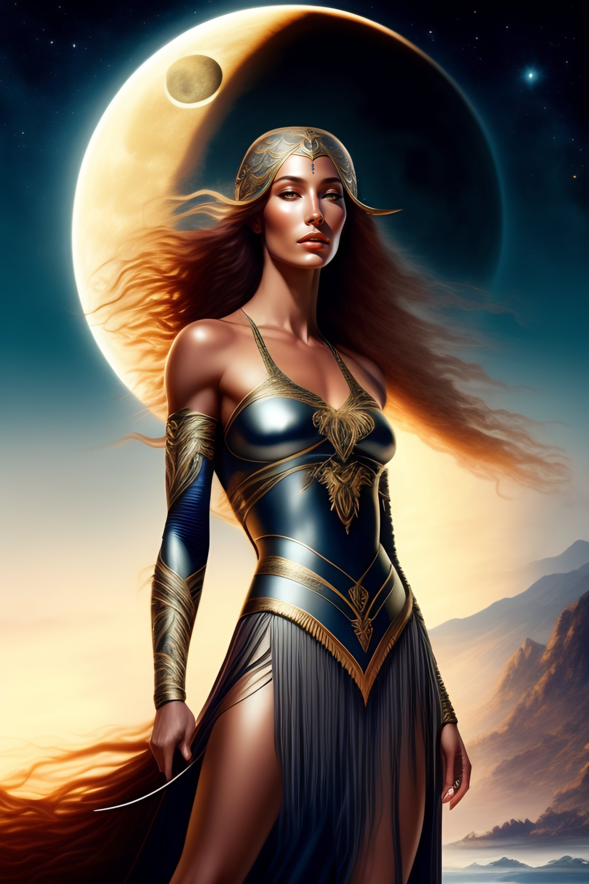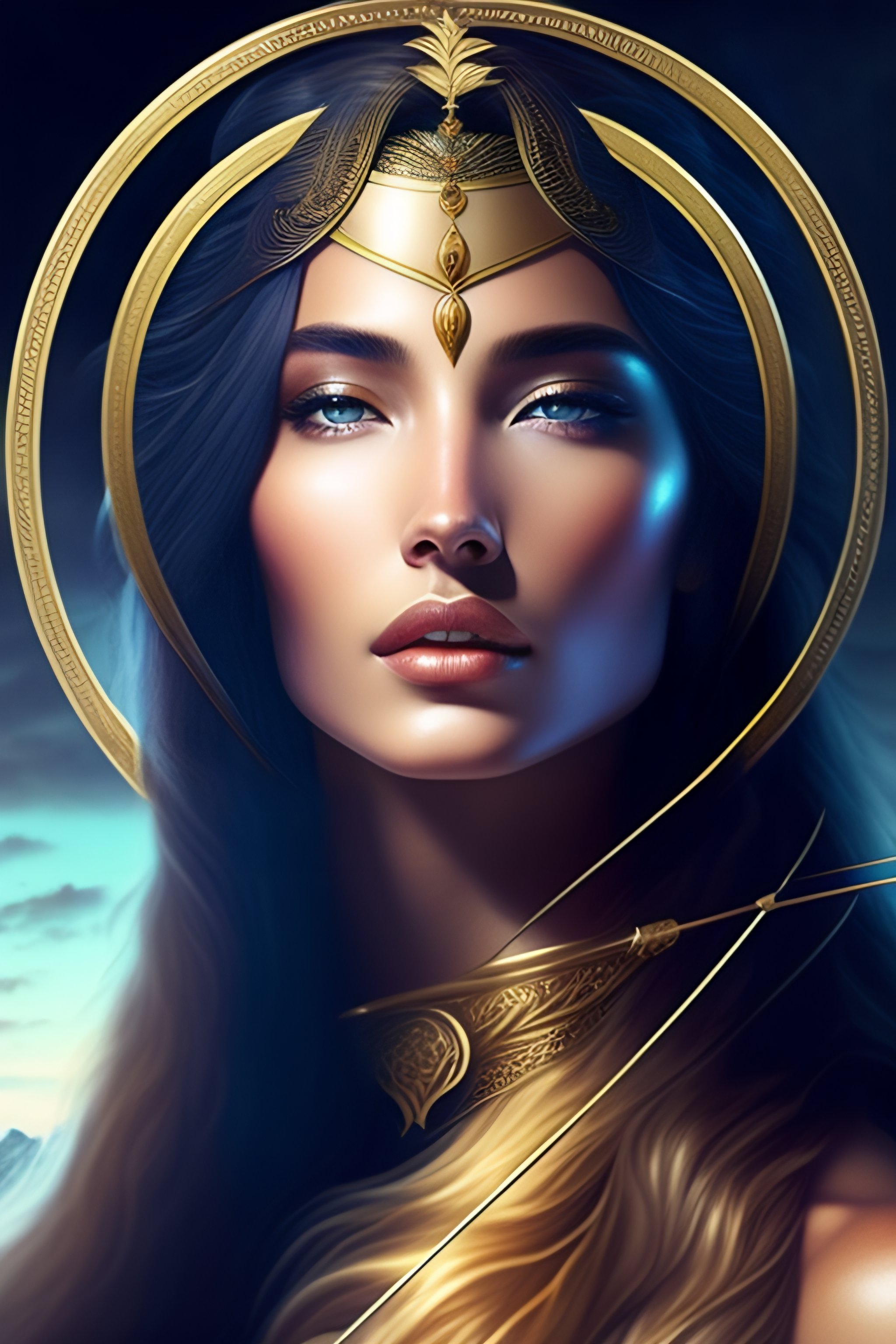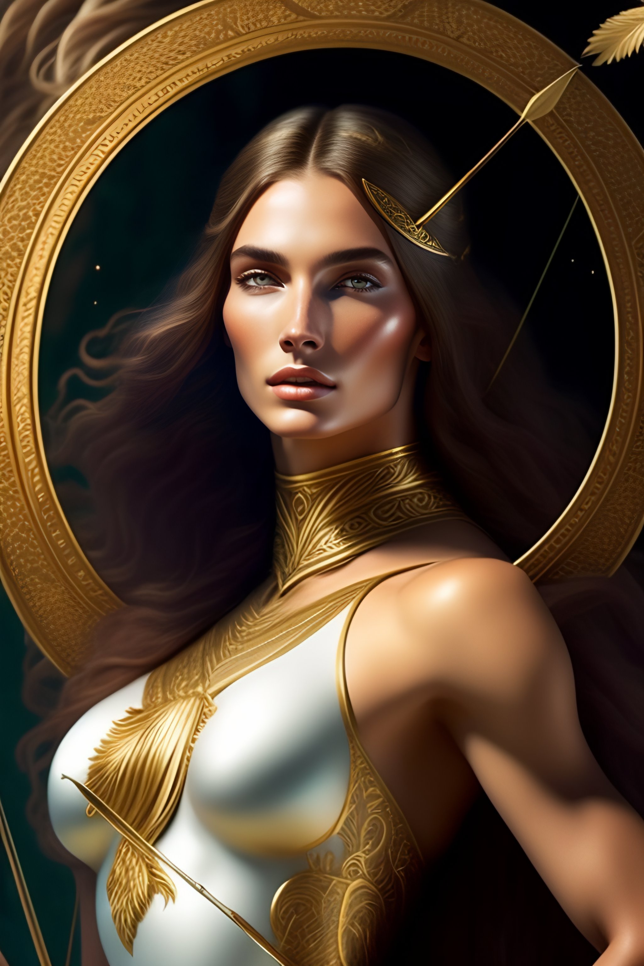 Thin muscular artemis goddess of the hunt, the moon, and the wilderness being tall, slender, and beautiful, with long, flowing hair and a youthful appearance, associated with a bow and arrow, huntress, crescent moon above her head, symbolizing her association with the moon.