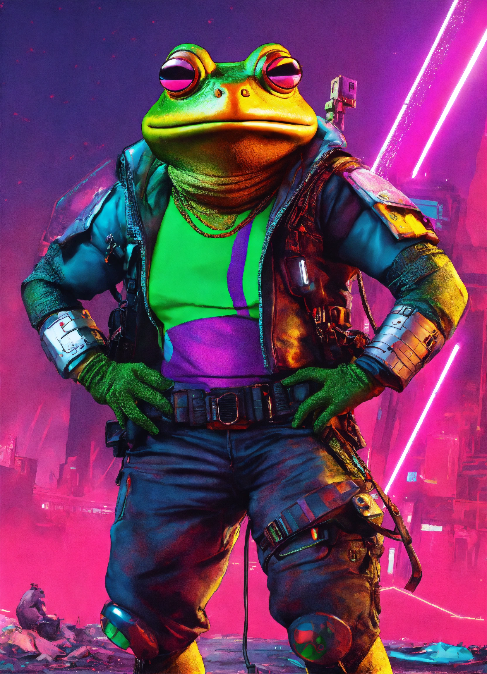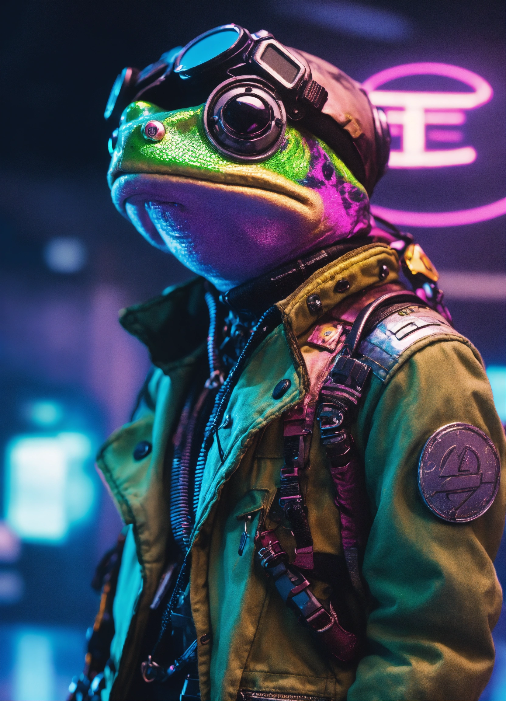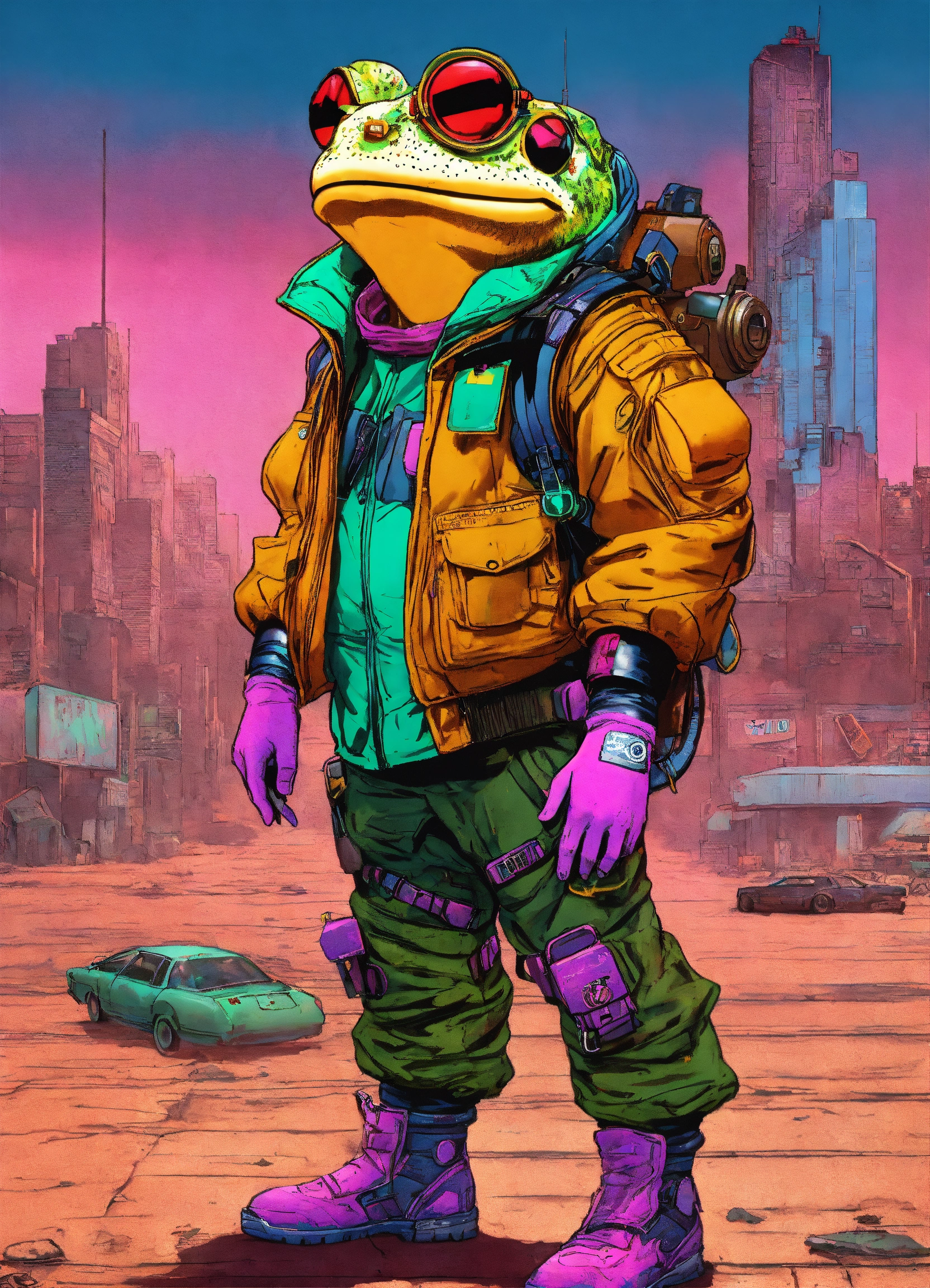 Photorealistic fashion shoot of toad as a cyber punk toad outfit post apocalypse with eth cryptocurrency in a 1980 vapor wave in a akira comic book