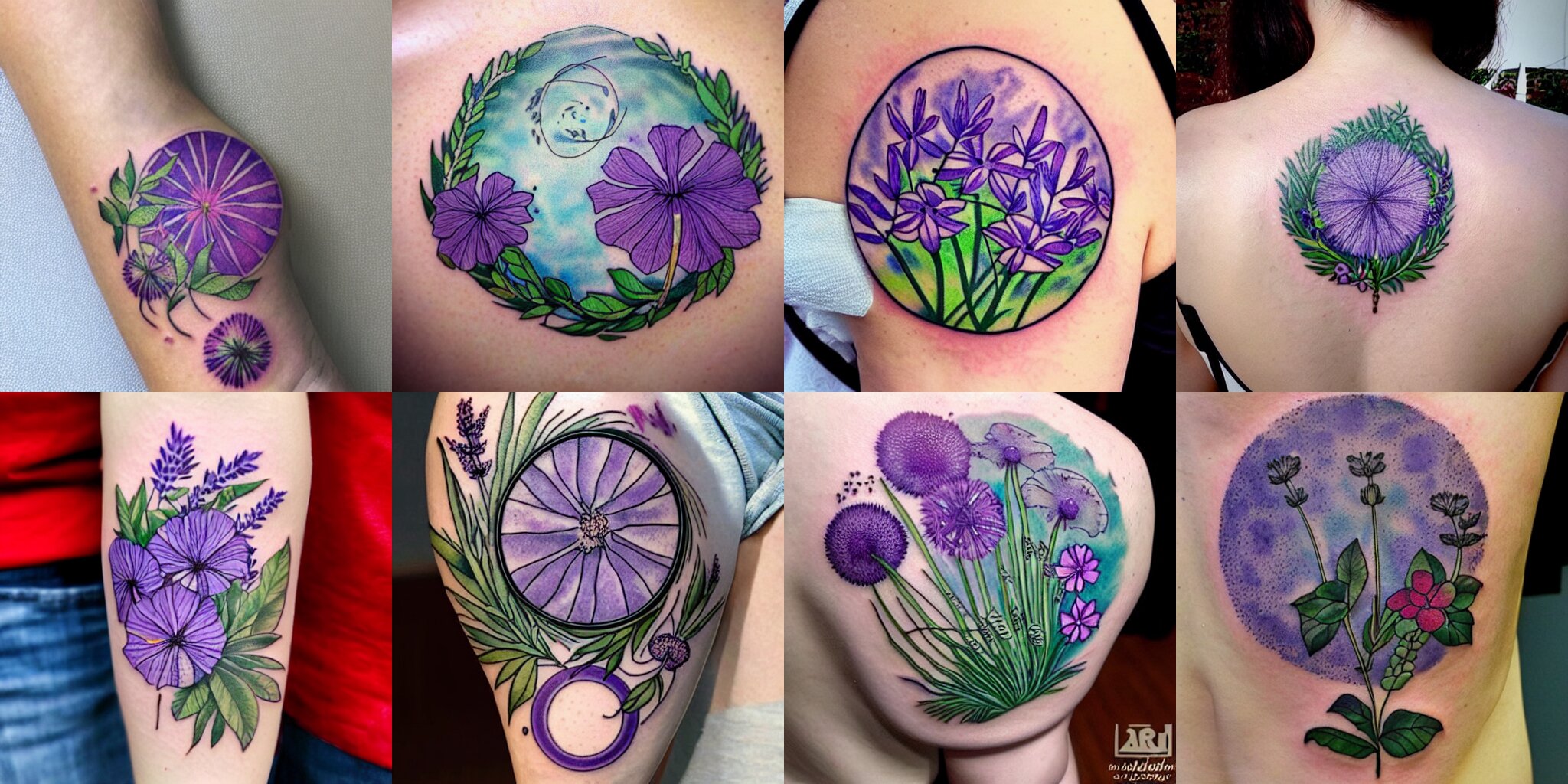 Botanical tattoo, lavender, verbena, hibiscus, dandelion, circle design, tattoo design, inking on skin, art by ghibli studios