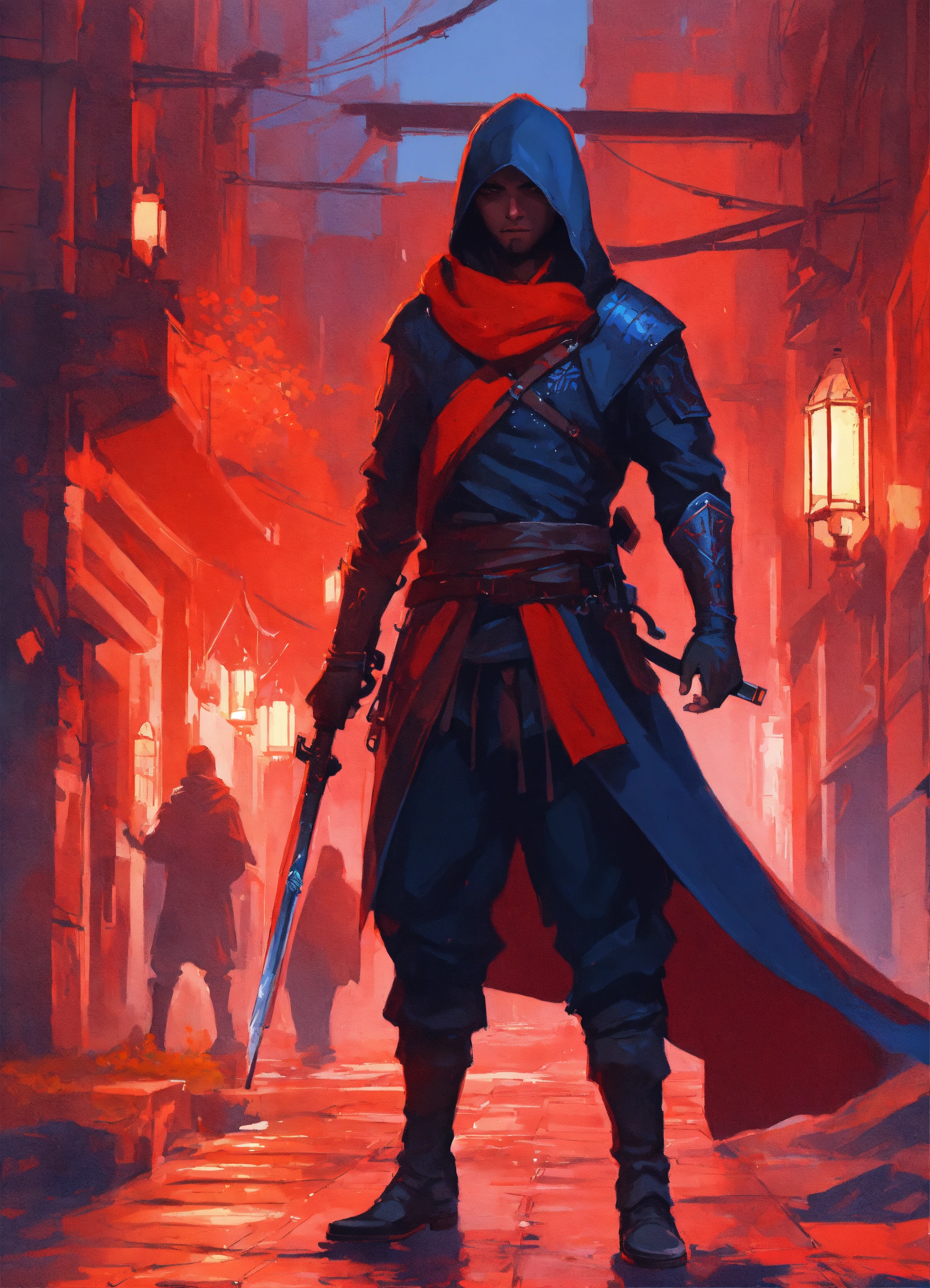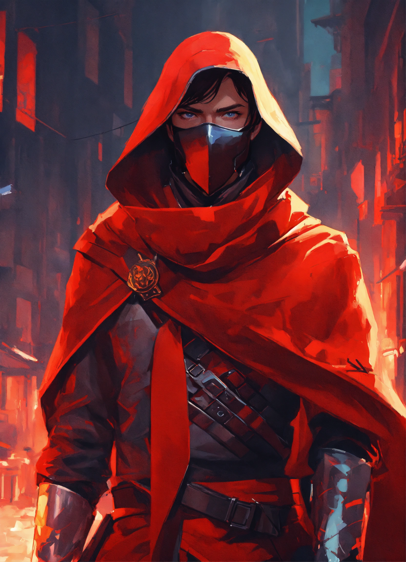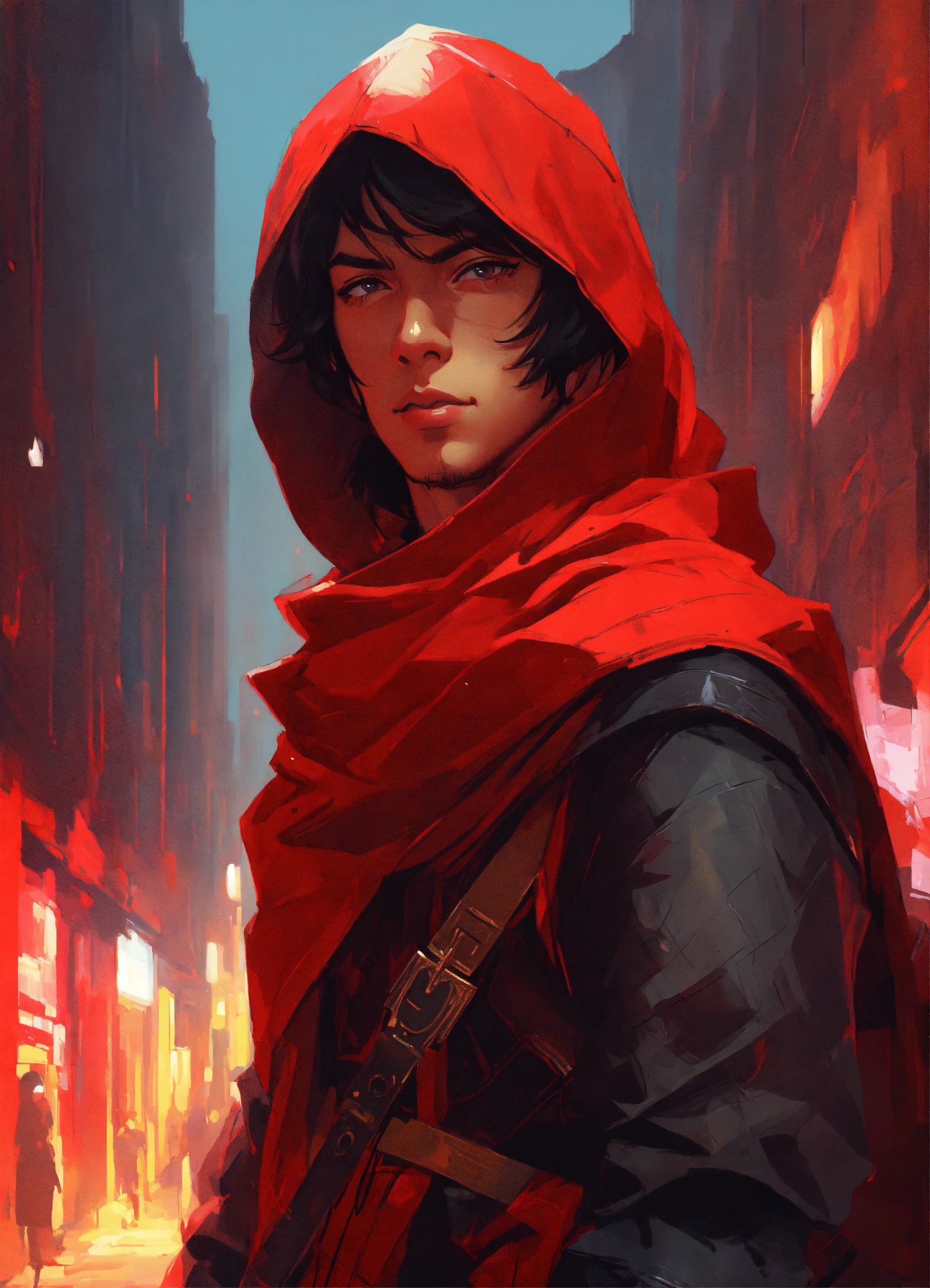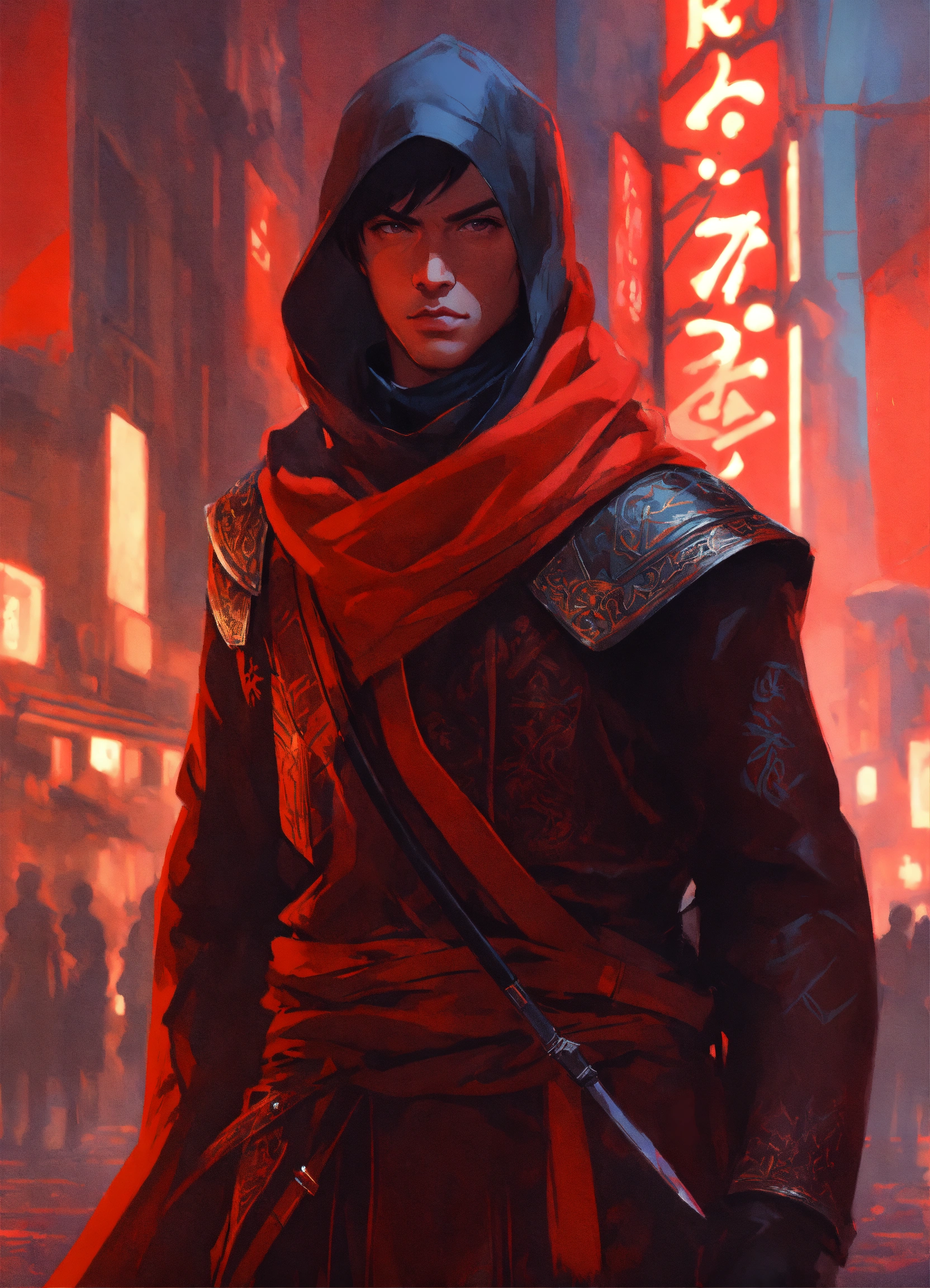 Male medieval fantasy assassin from the empire of fire, red scarf fantasy painting, geometric graffiti and street art, neutral colors, abstract, exquisite detail, digital illustration, ilya kuvshinov, katsuhiro otomo, wlop, cinematic lighting, award-winning, trending on artstation