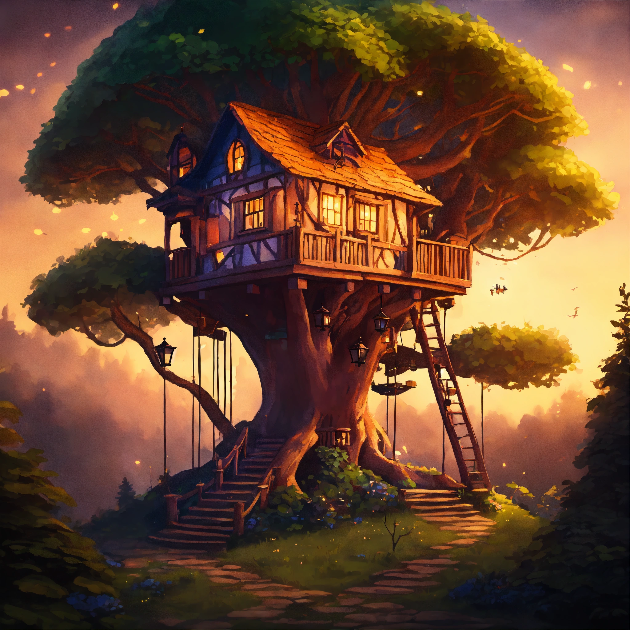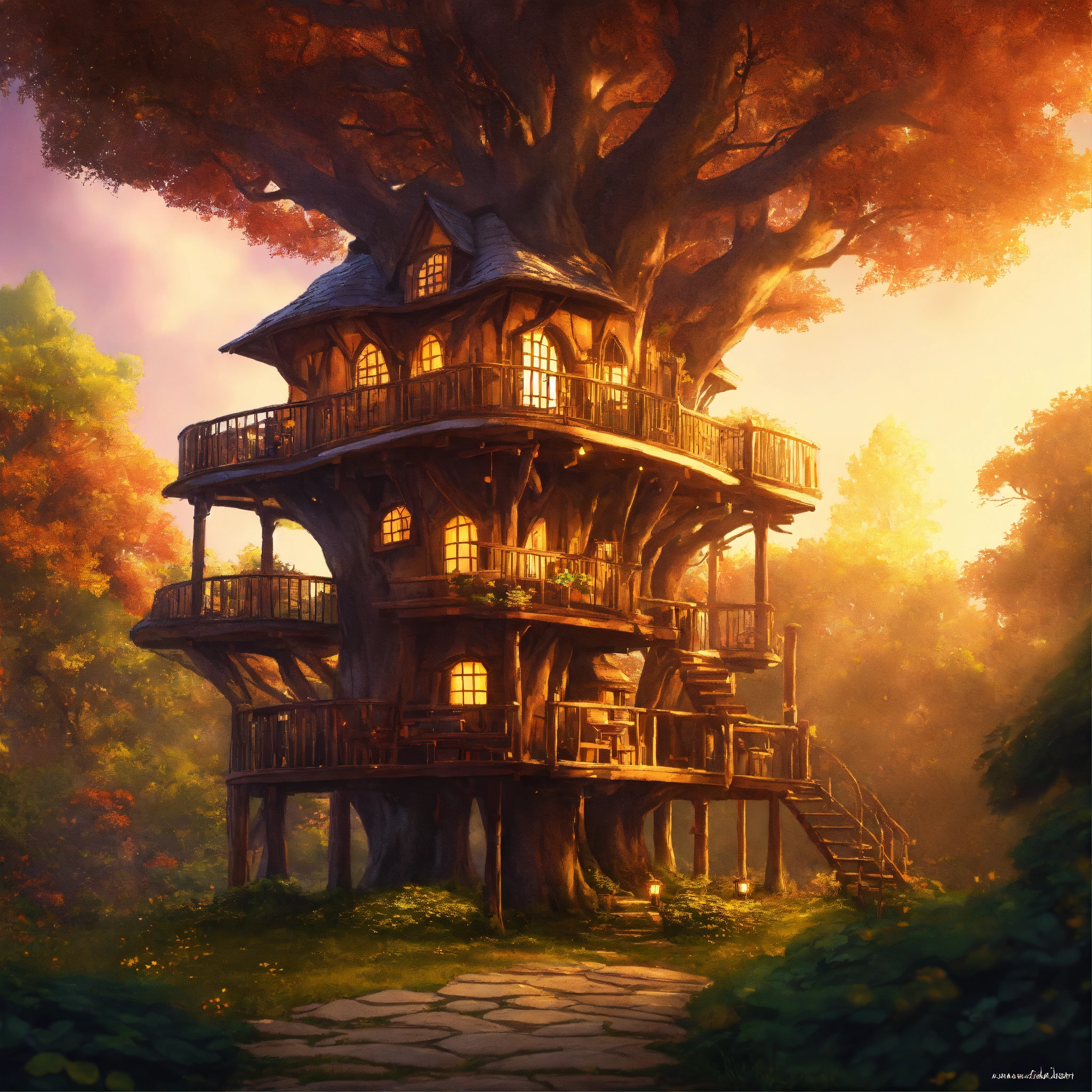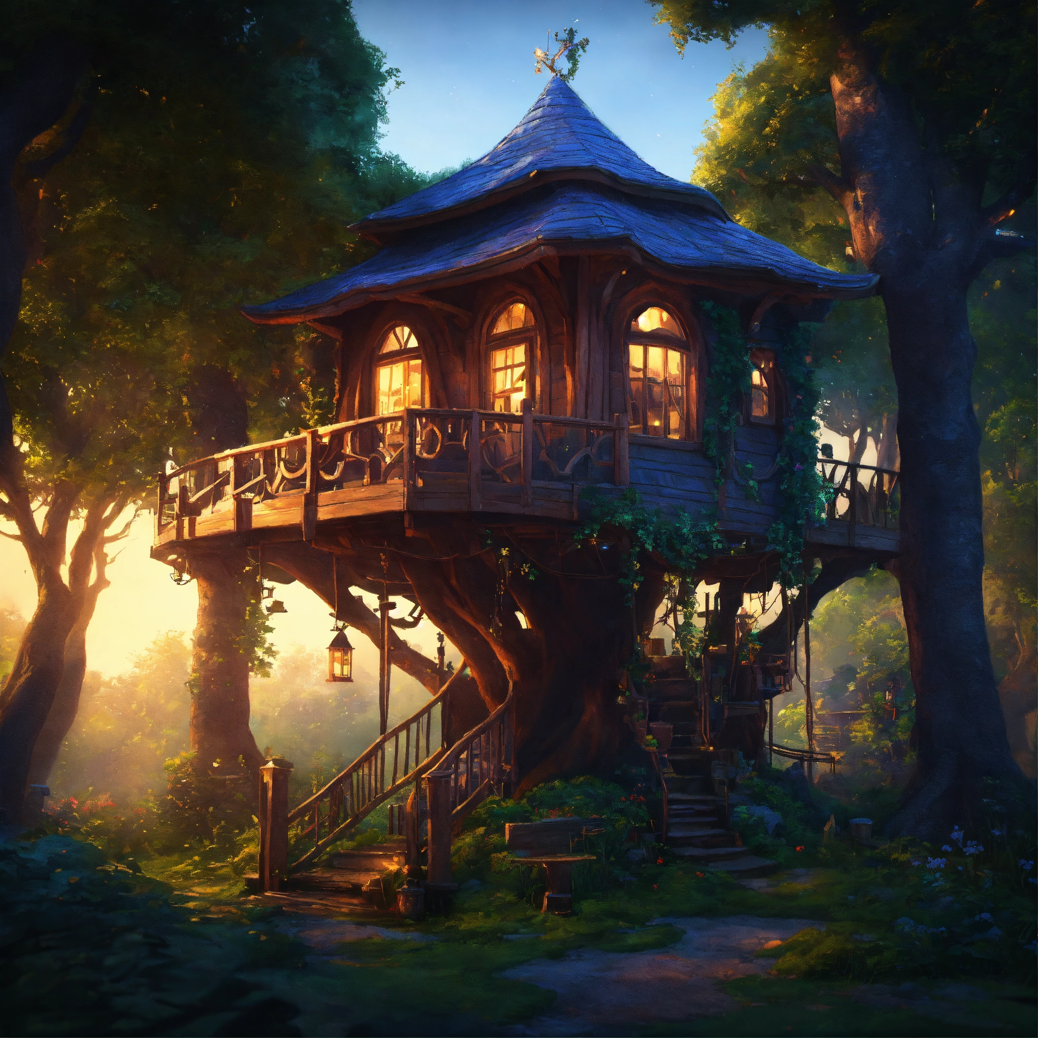 Epic shot of ultra detailed magical tree house in a forest park, ultra detailed, wonderful cozy atmosphere, ultra inviting, luminous, evening atmosphere, little photorealistic, digital painting, sharp focus, ultra cozy and inviting, wish to be there. very detailed, arty, should rank high on youtube for a dream trip.