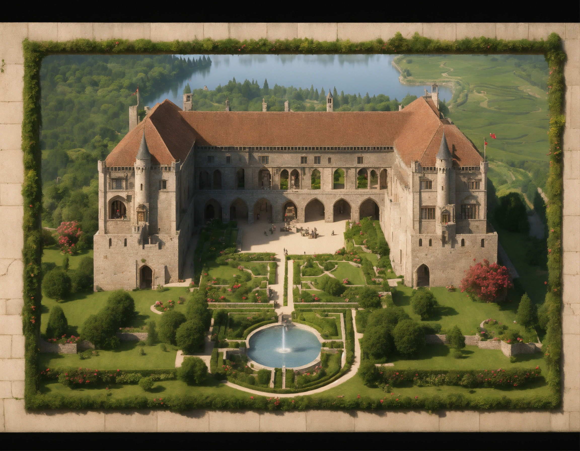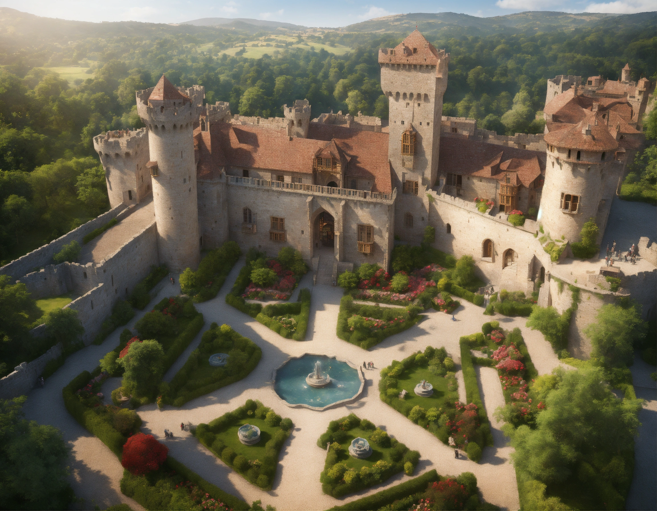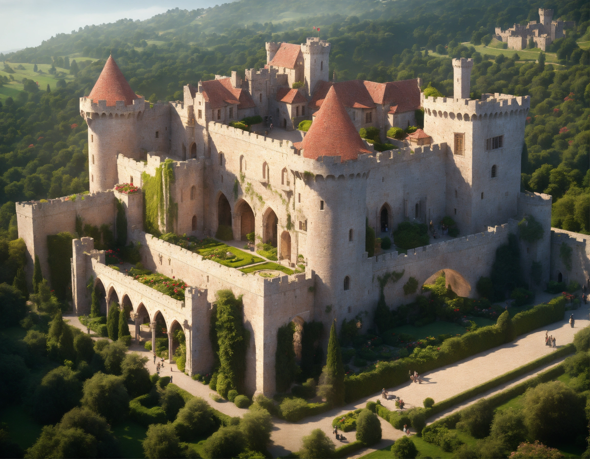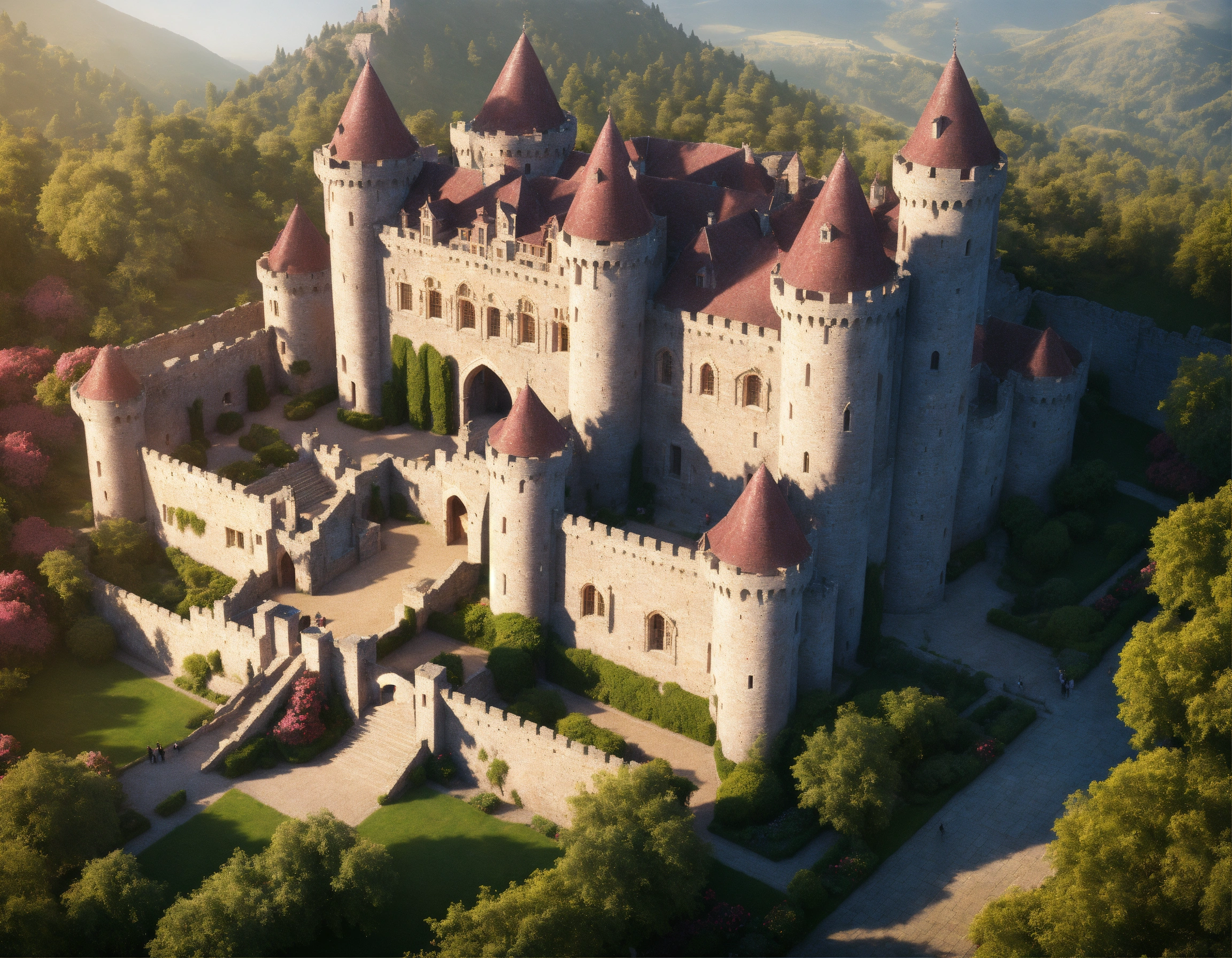 Ultra realistic, photorealistic, bird's eye view of a medieval castle, palace of roses, rose bowers, magnificent rose garden and arcades, magnificent fountain, marble figures, massive crenellated stone wall with wall gate and watchtowers, with a large inner courtyard and several servants' quarters, extensive rose fields on hilly landscapes in the area, very detailled, focus on castle, sharp focus, sharp, ambient lighting
