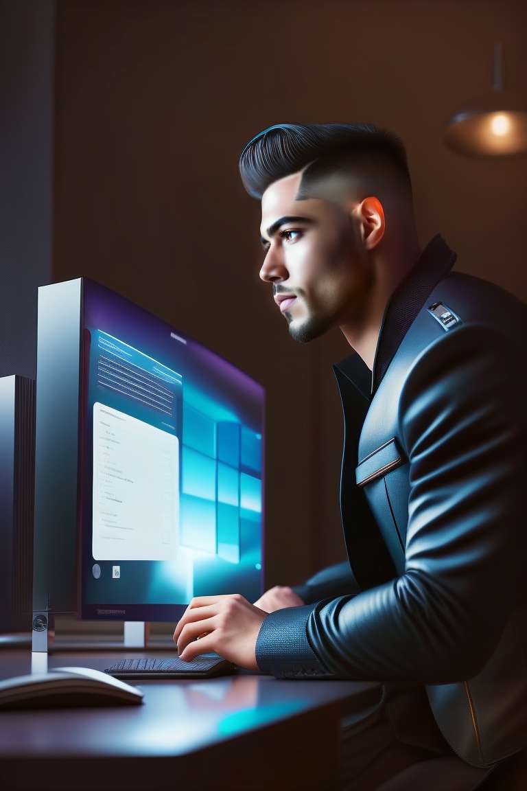 A man in his mid 20s wearing y2k with black outfit testing a software infront of computer looking serious, with dark background and dark ambience