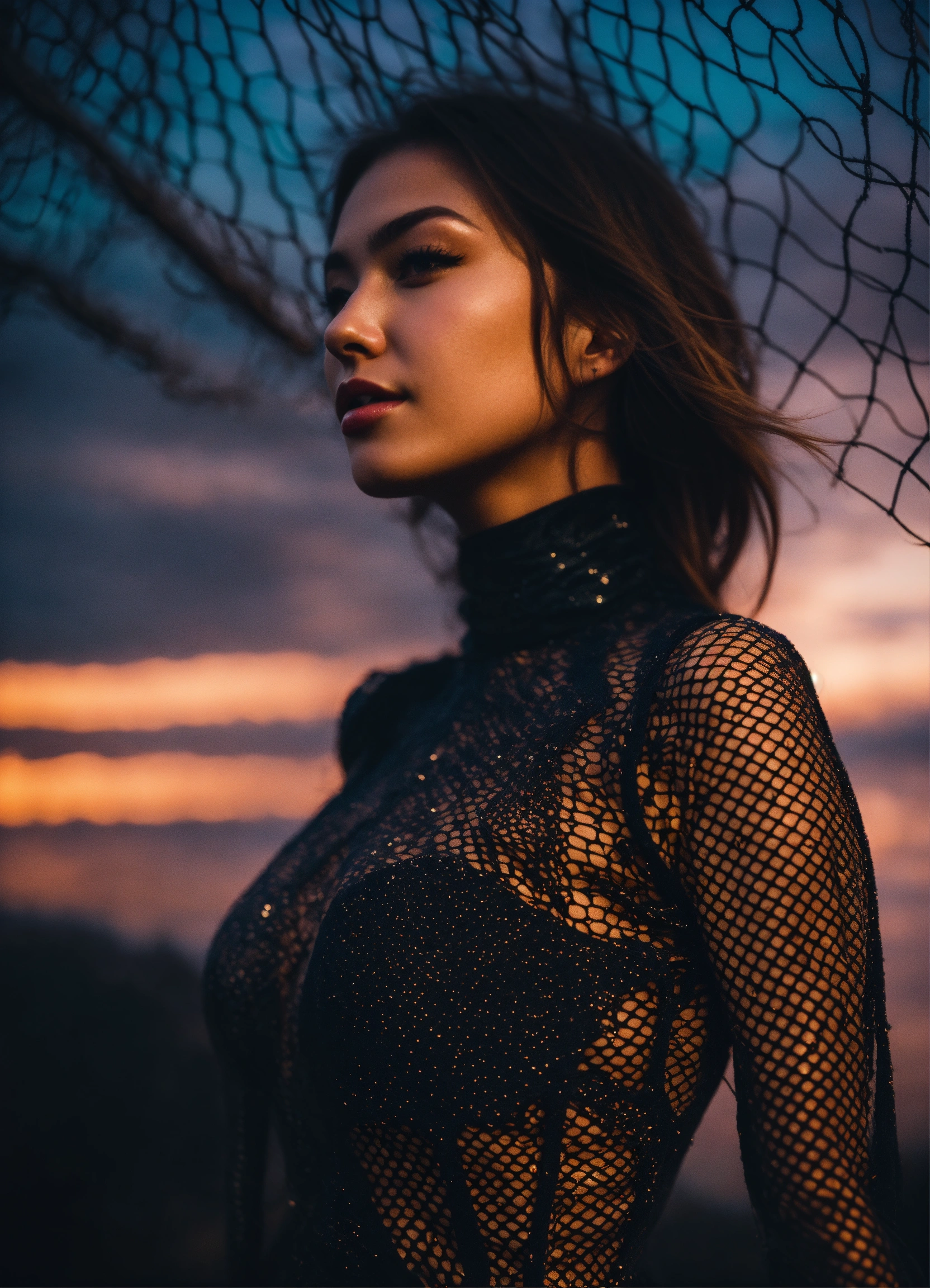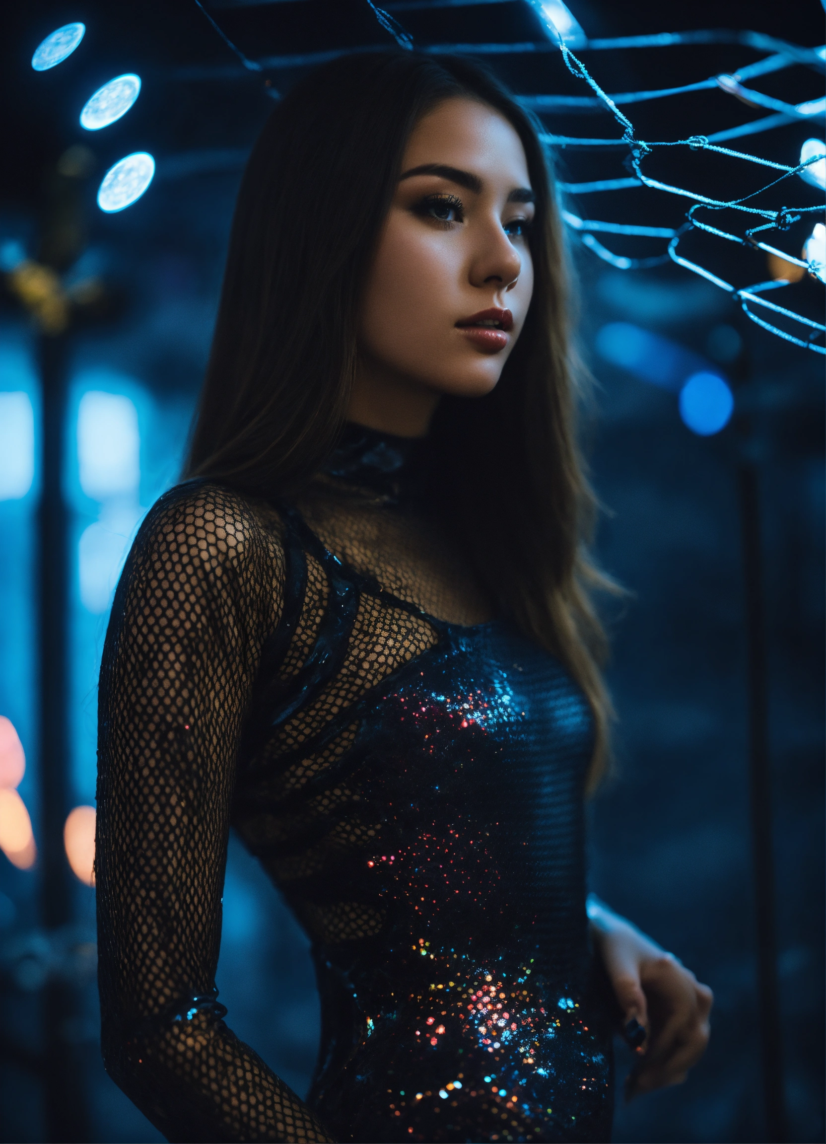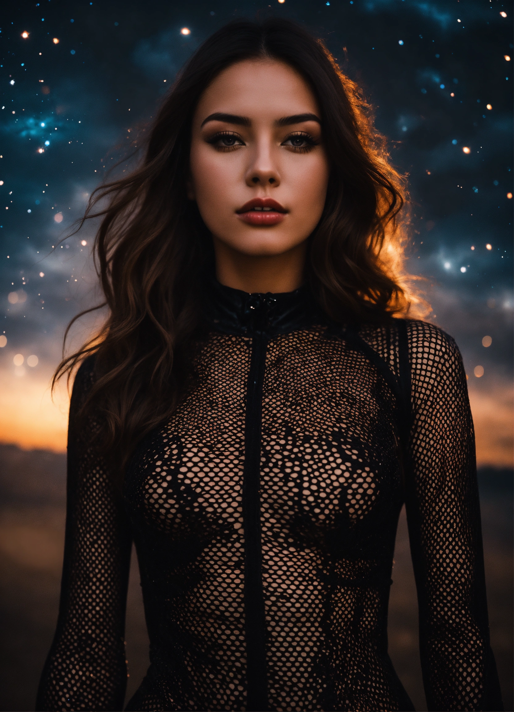 A real photo of a 23 year old girl, she is wearing a dark-metal fishnet catsuit, in the sky we see the galaxy