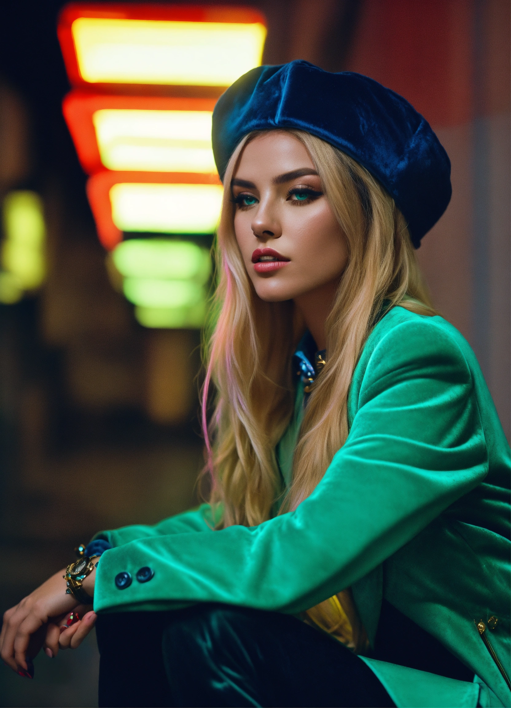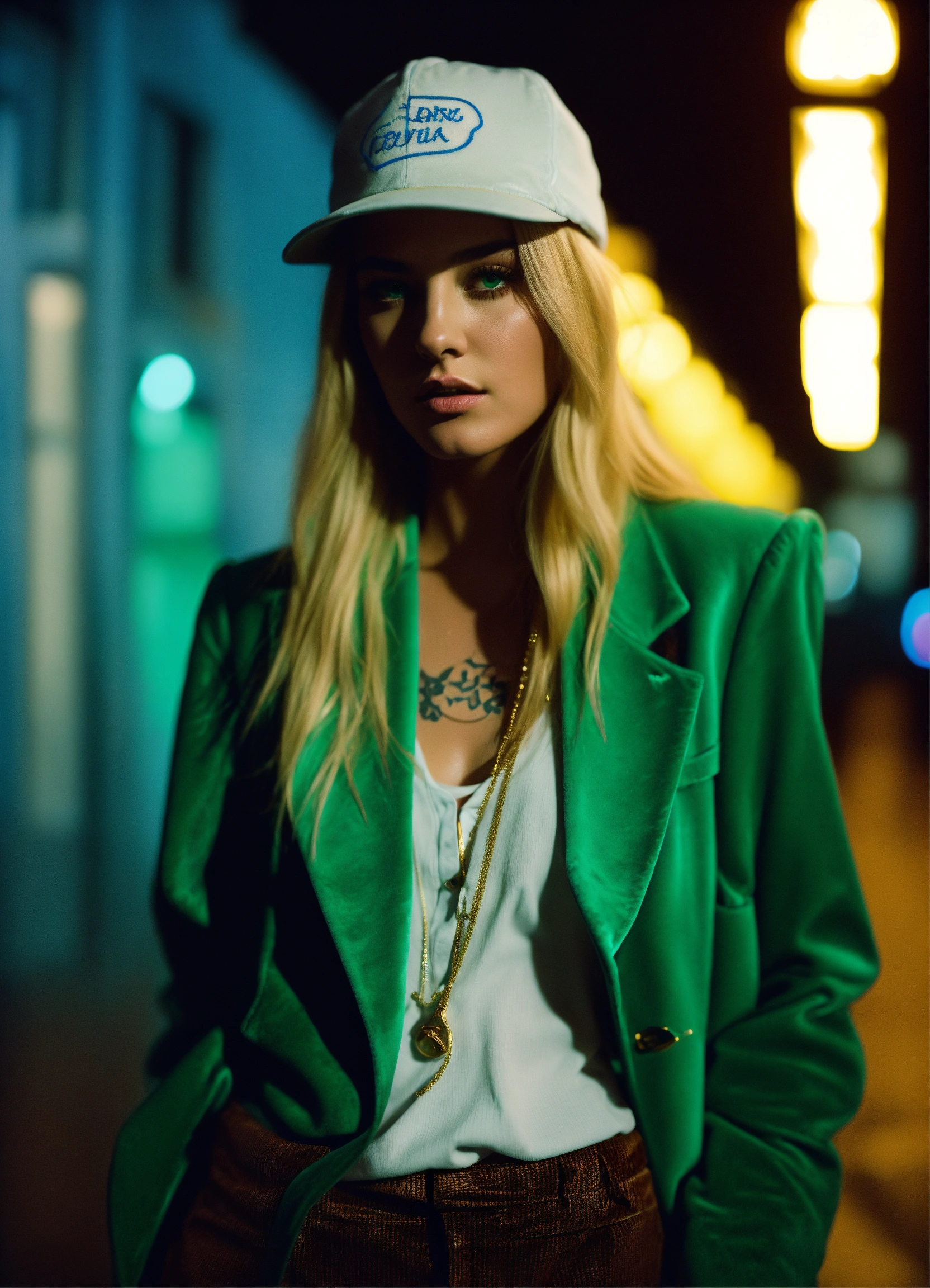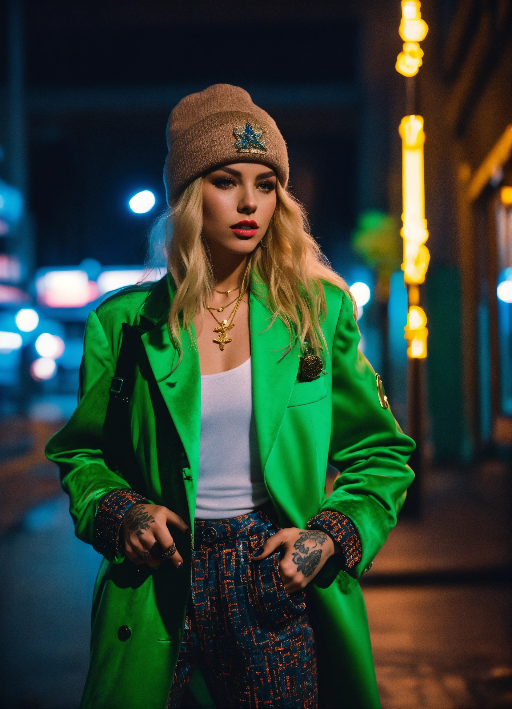 Meaningful surreal amateur fashion at night photoshoot of a beautiful blonde girl gangster influencer with really long hair, and eyes that emit a faint neon light, crouching, wearing a blue cap, green long velvet blazer, a white buttoned shirt, brown checkered pants, wearing white and gold louboutin snakers with spikes, photo shoot, cinematic still shot, magazine photography, 35mm, film look, a tattoo on her hand, neon nights in a futuristic paris