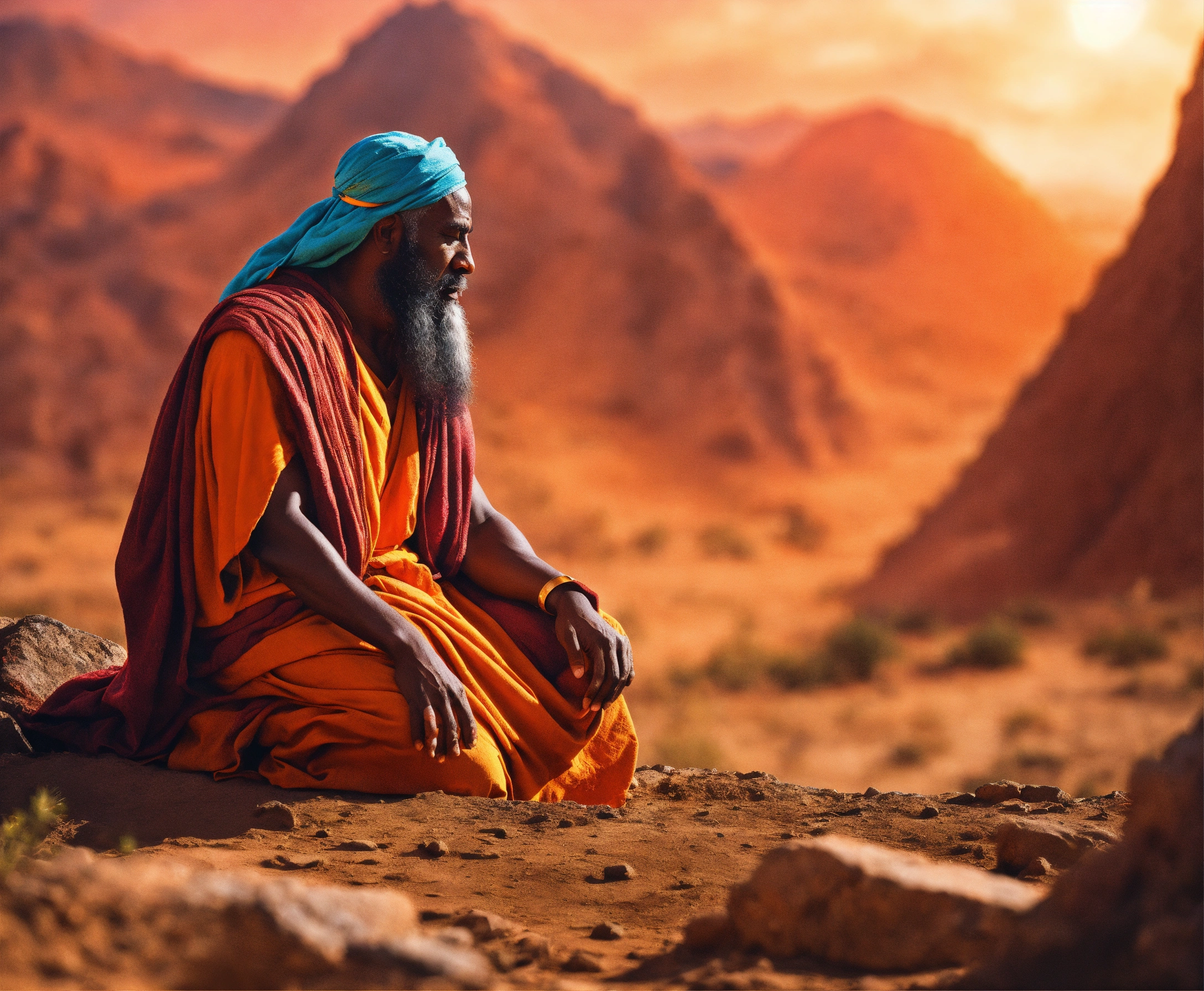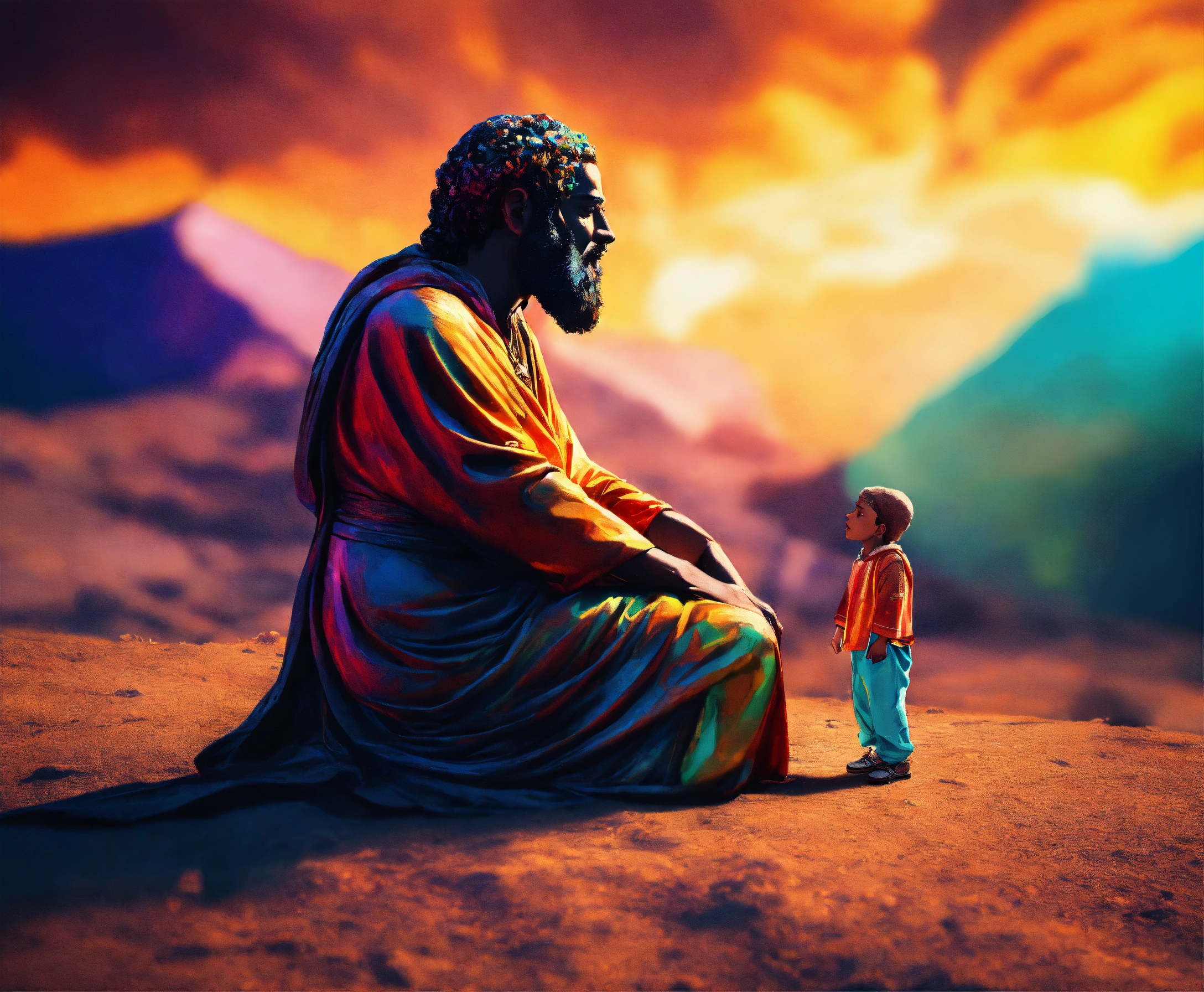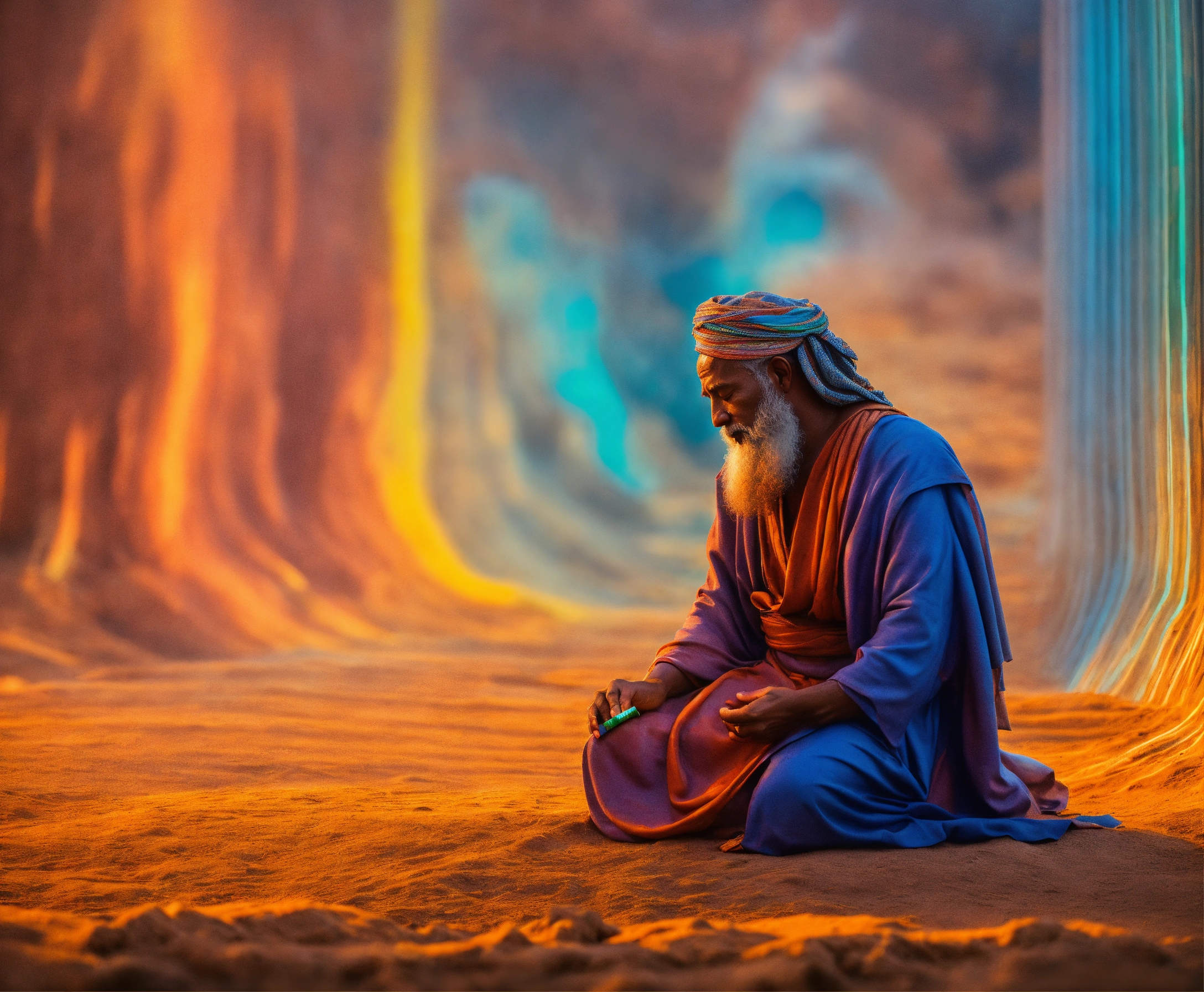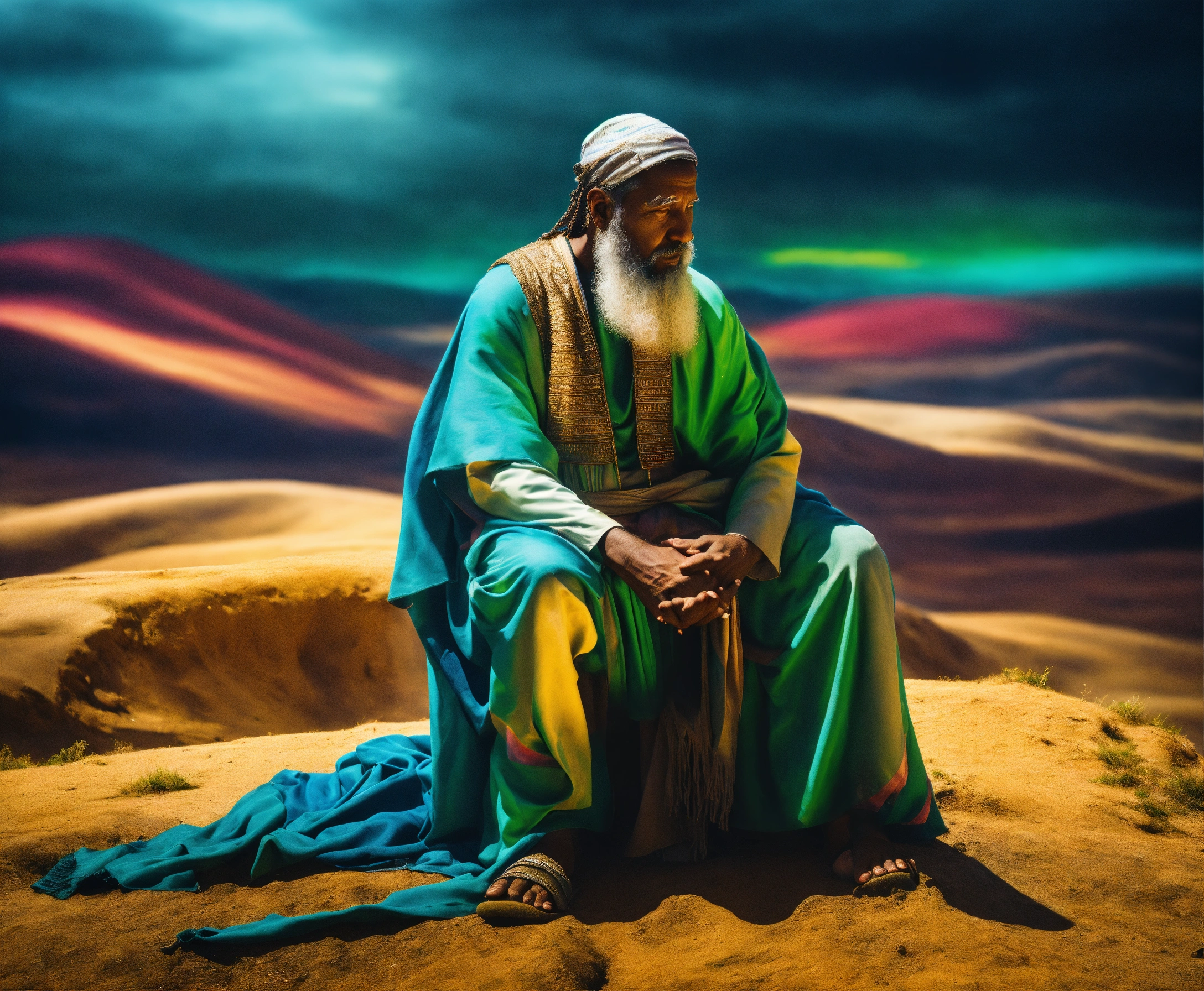 God speaking to moses on his knees, near the sarza, hipe style photography, colorful, futuristic, with blurred contours.
