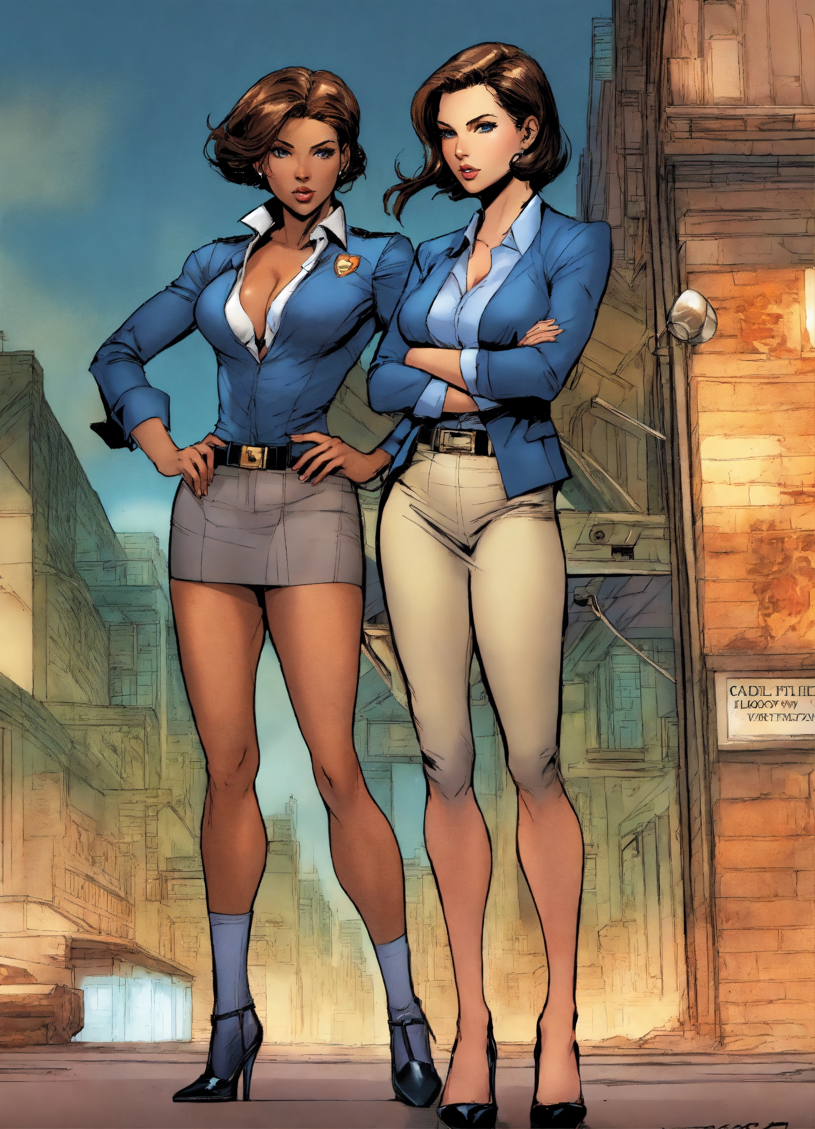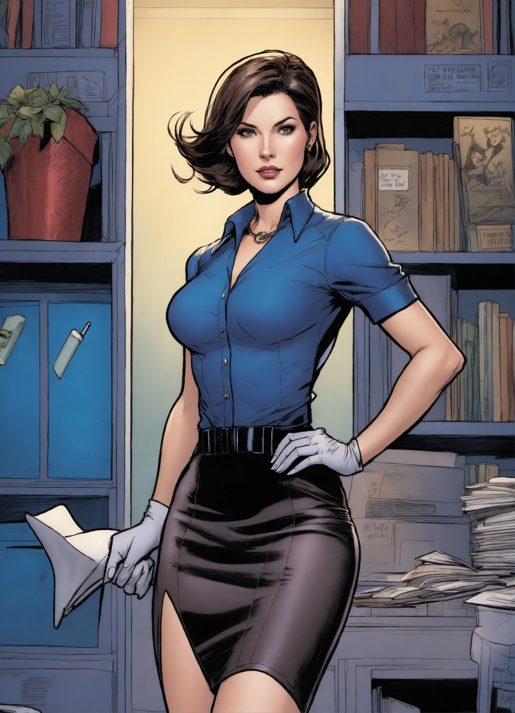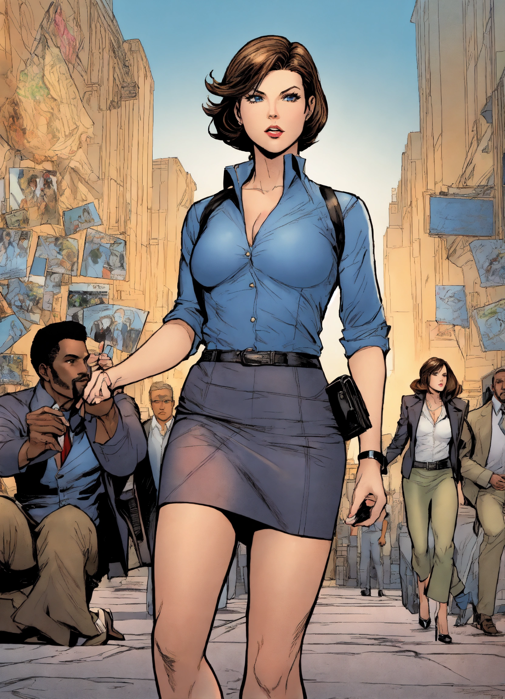 Older jill valentine as lois lane as a reporter, wearing a pencil skirt and stiletto high heels, art by jim lee, art by j. scott campbell, short brunette bob hair, carried away by a black man