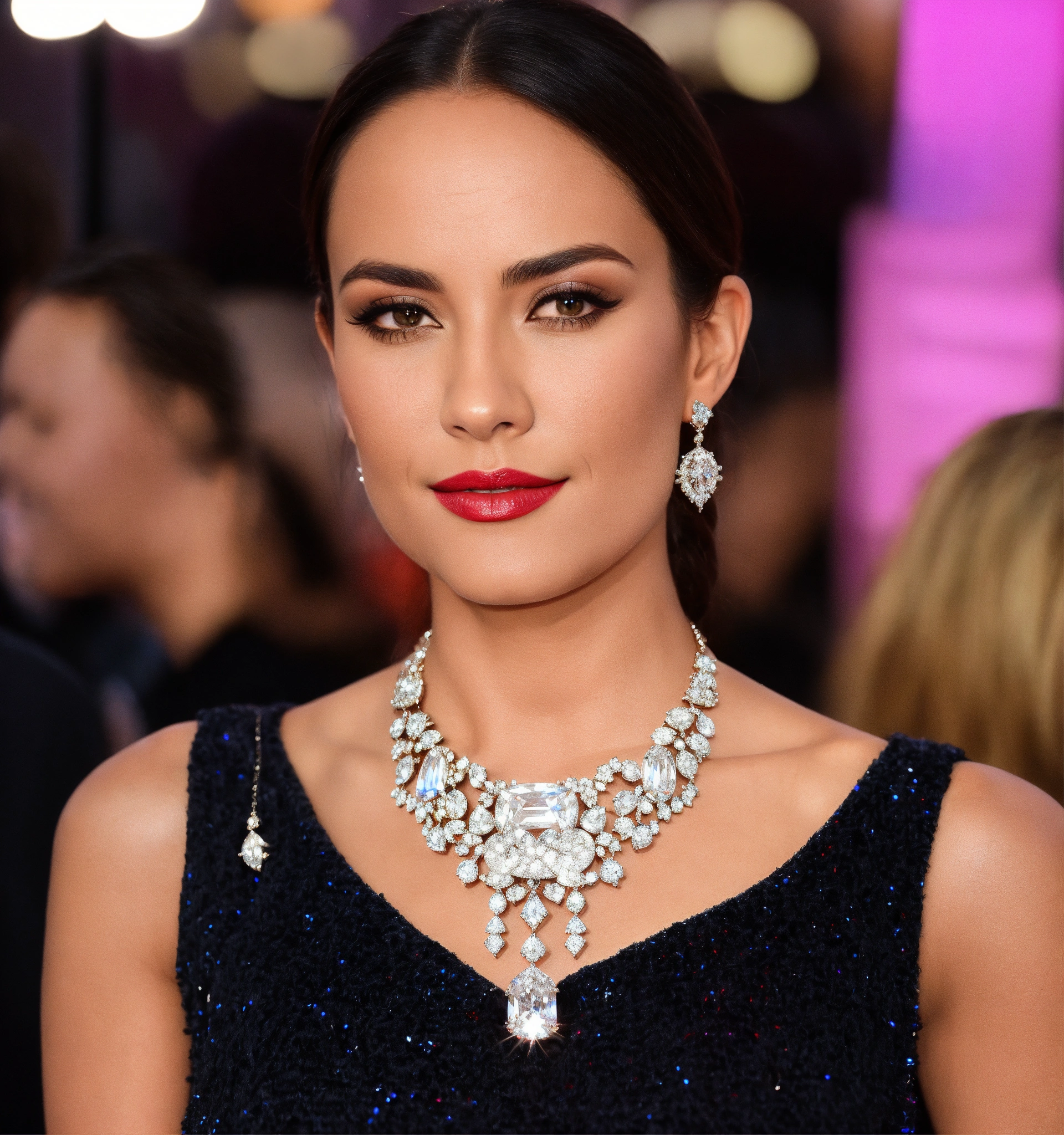 A celebrity wearing a statement necklace and cocktail diamond solitaire jewelry at a red carpet event