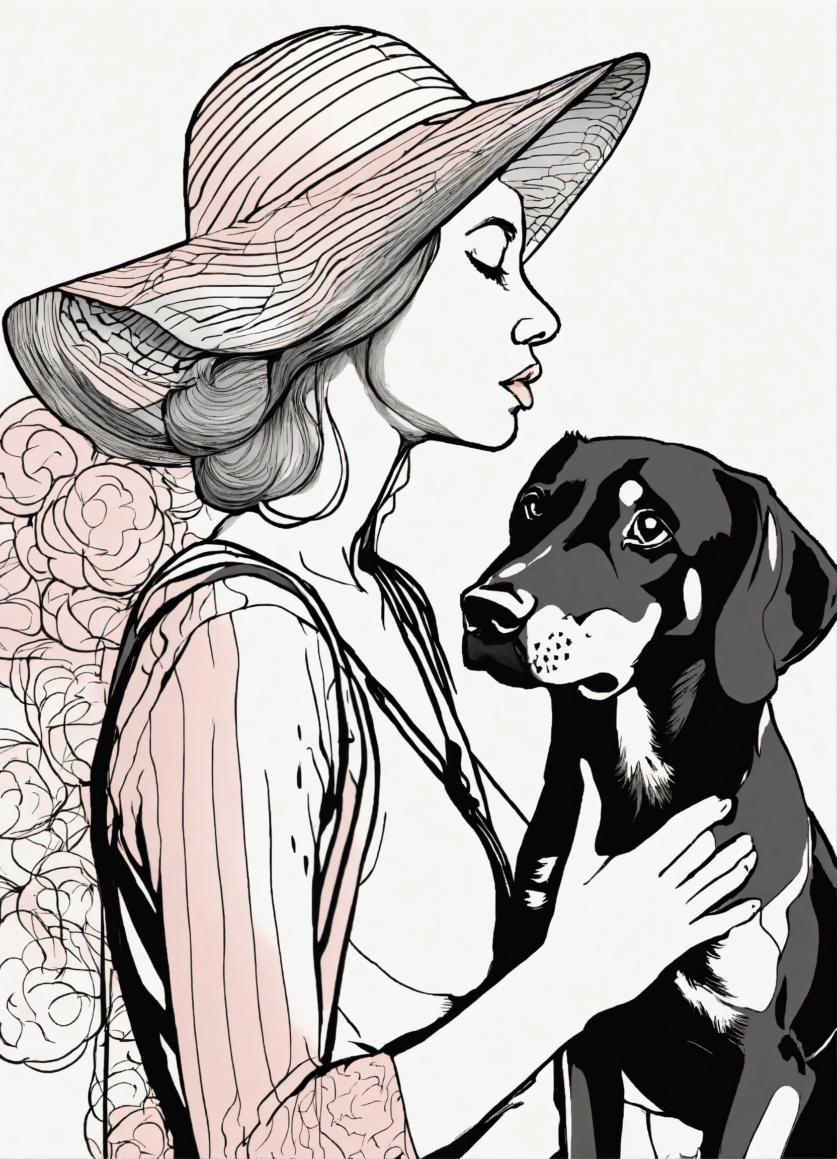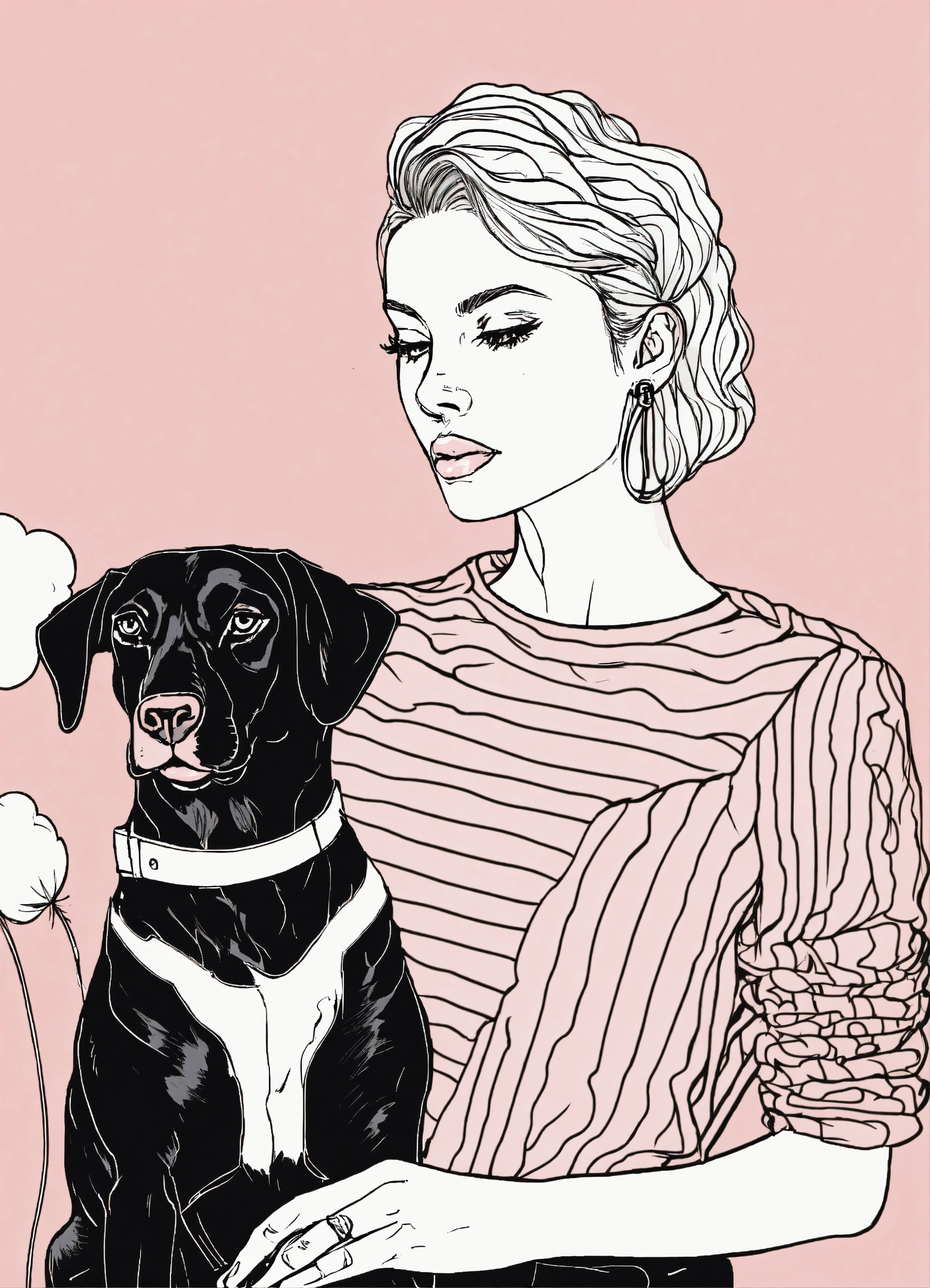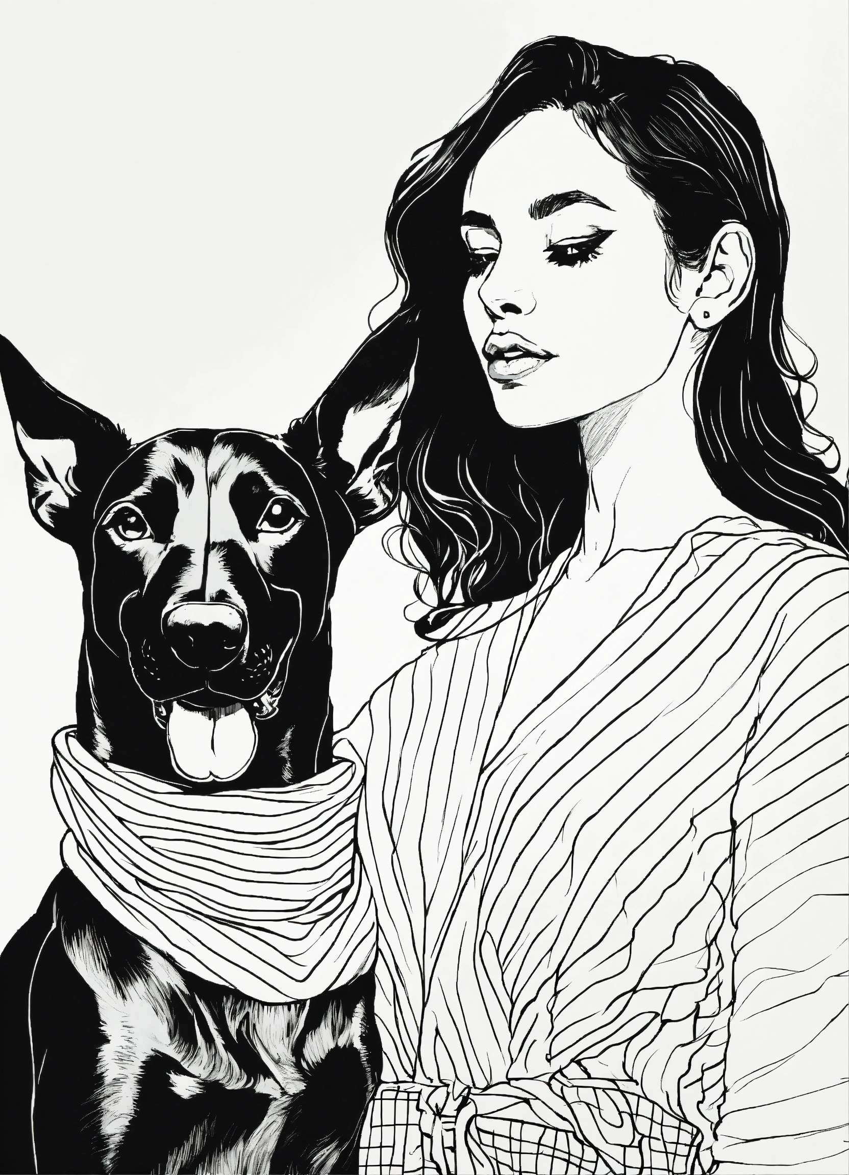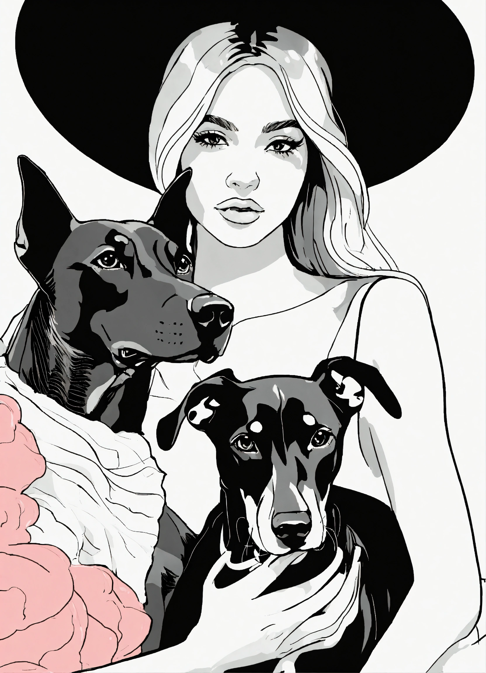 Black and white bold line drawing, woman holding cotton candy with black doberman, lines, white background, shoulders, upper body