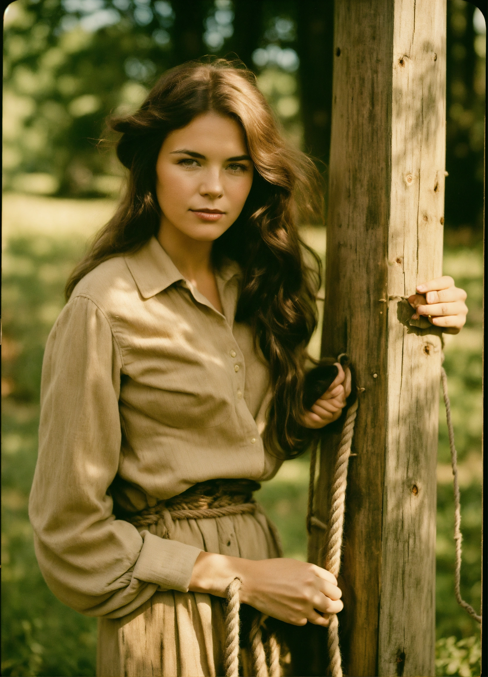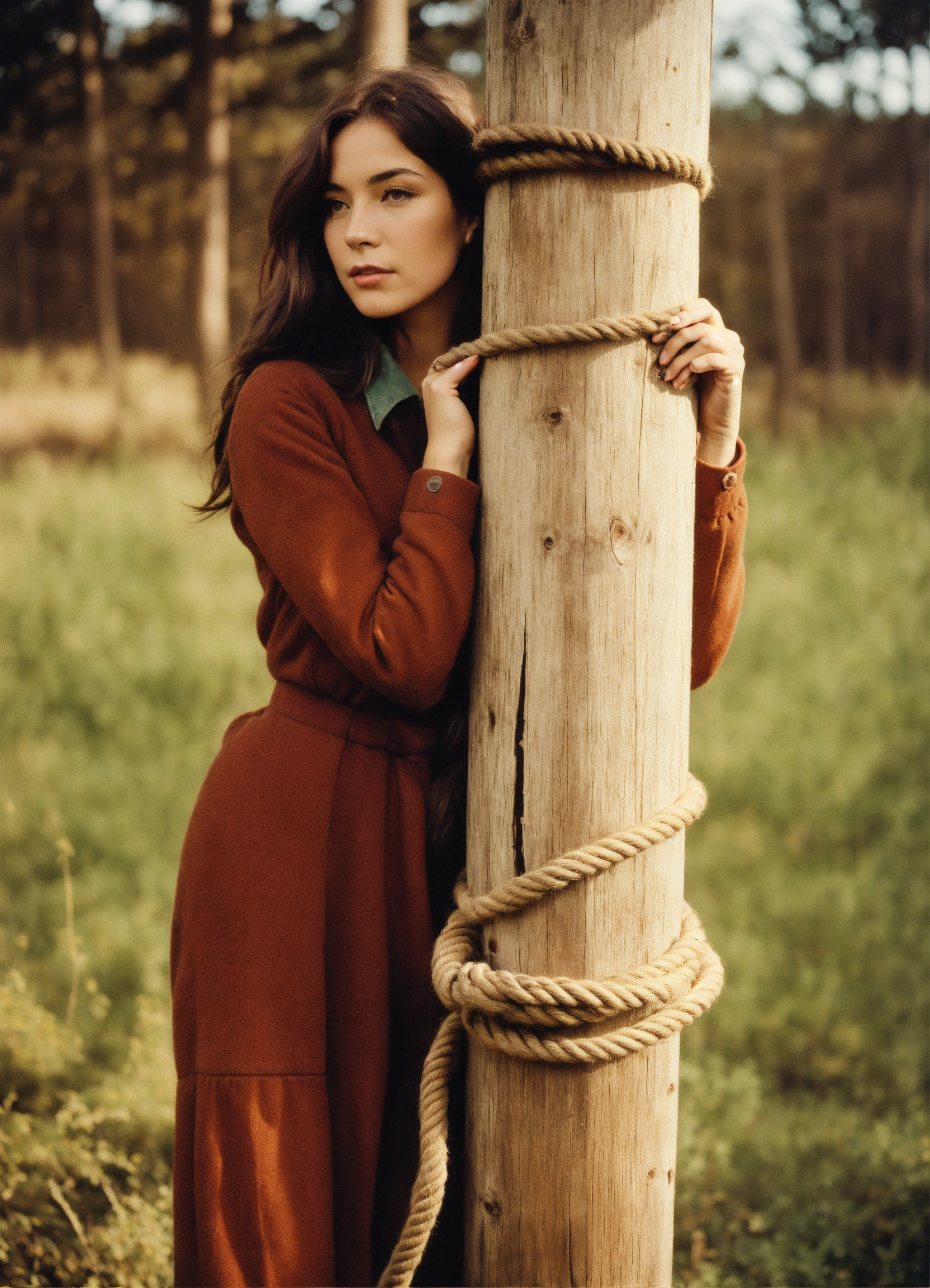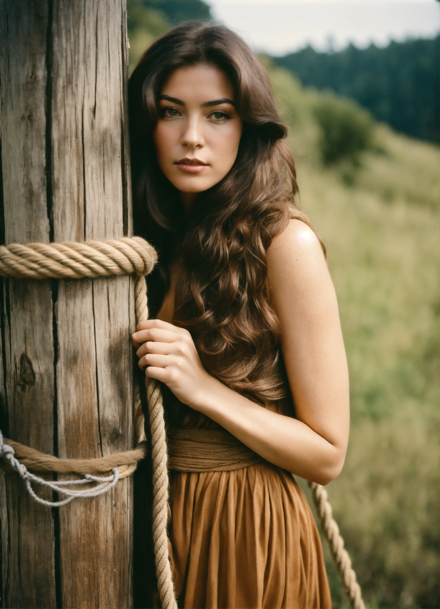 A photograph of a woman with long brown hair leaning against a wooden post with rope