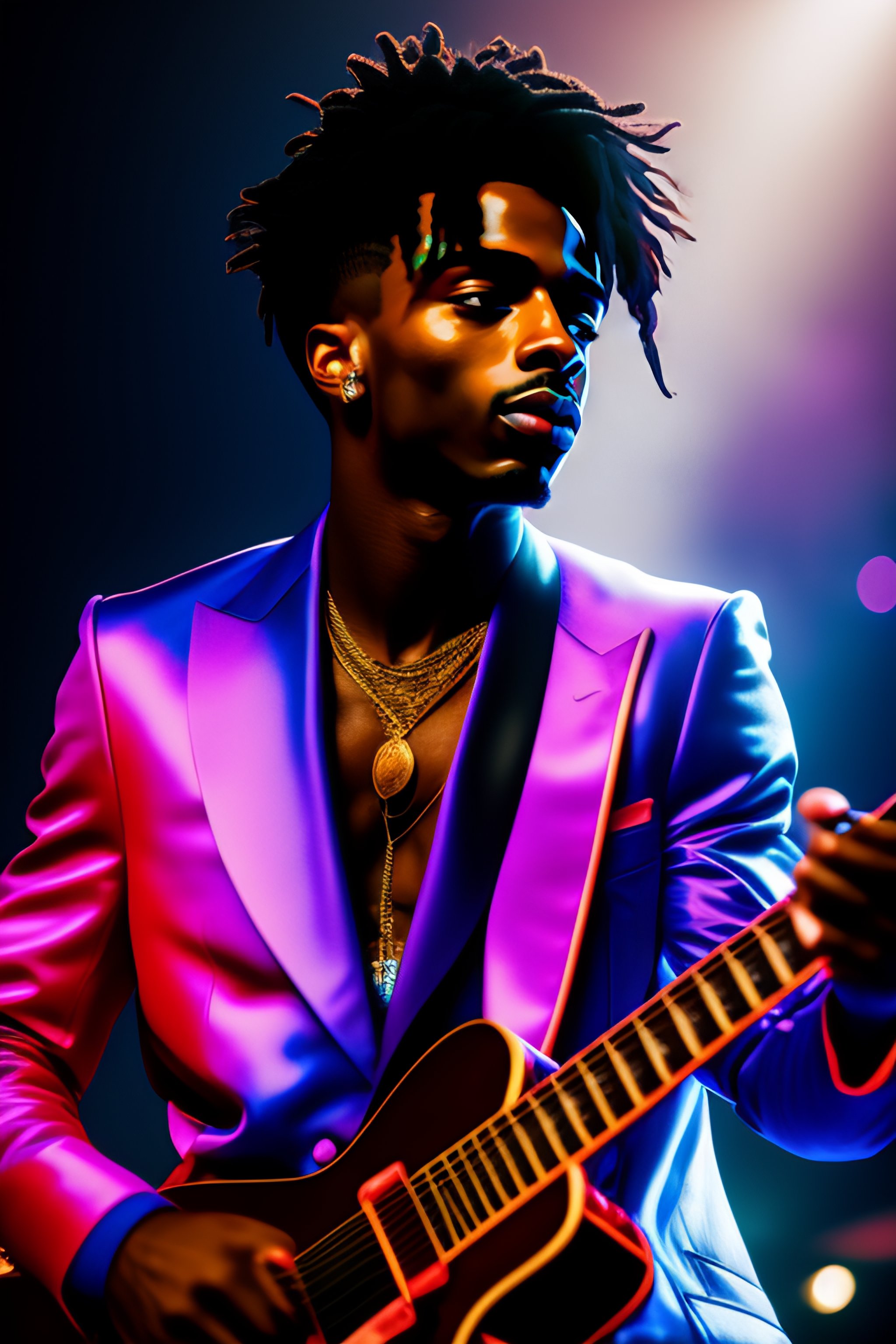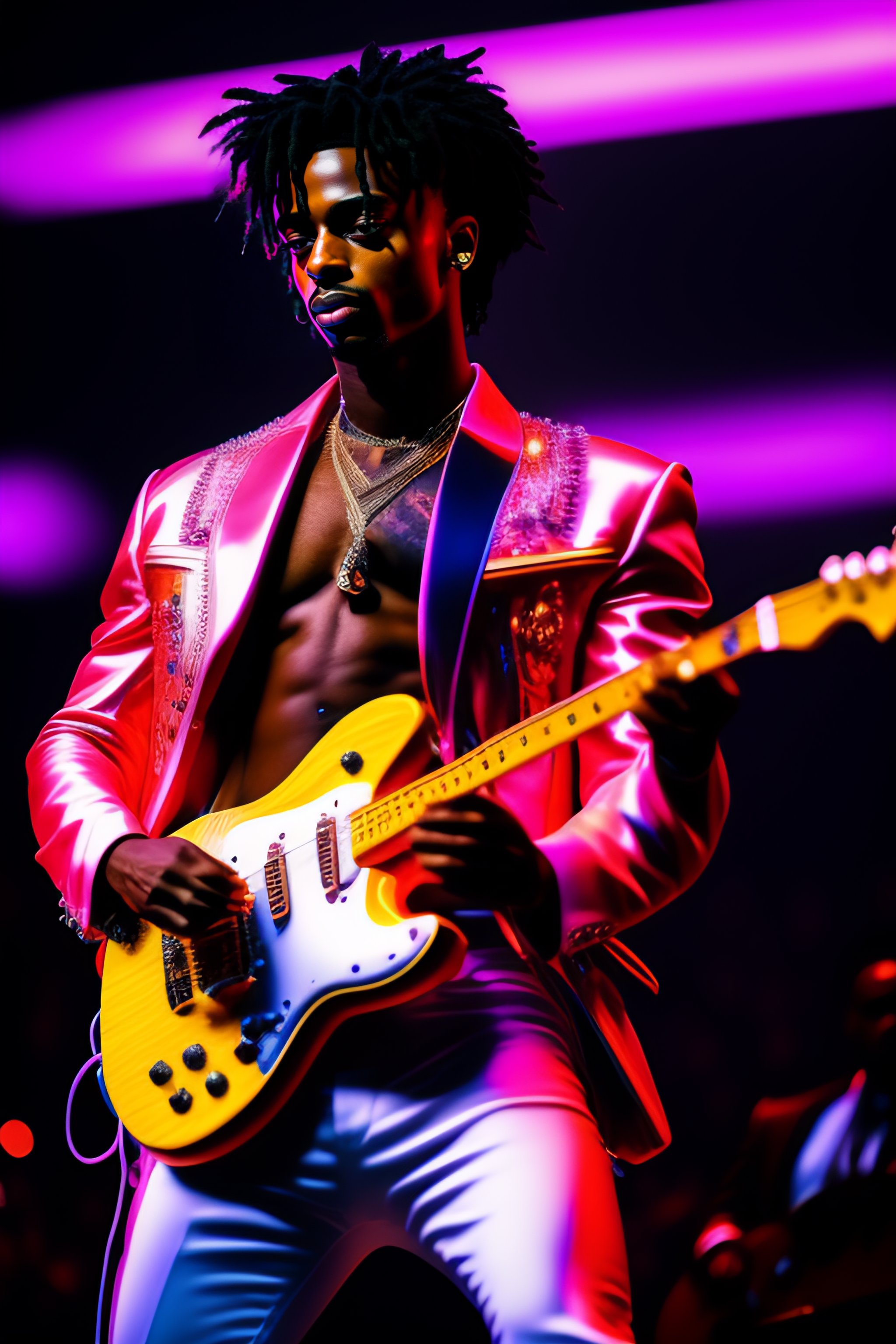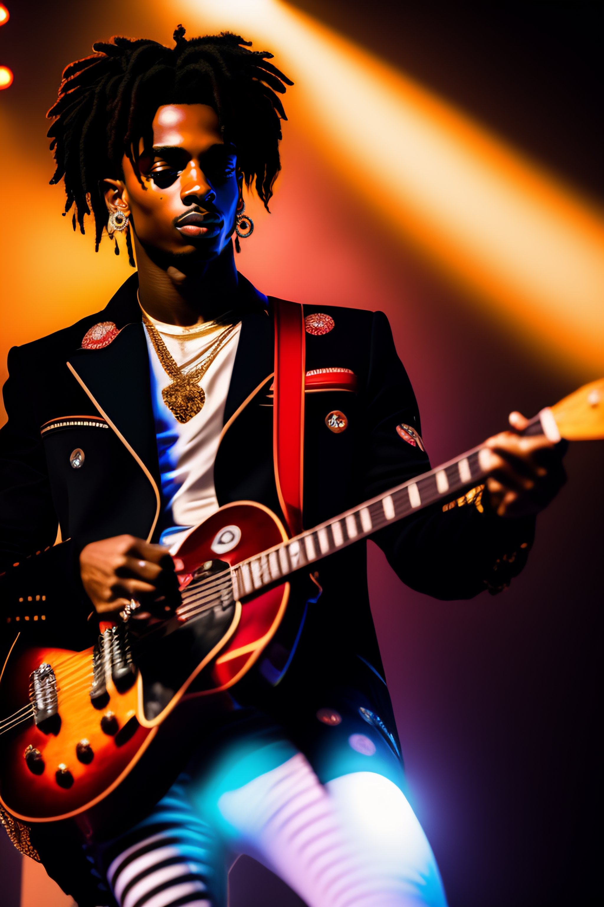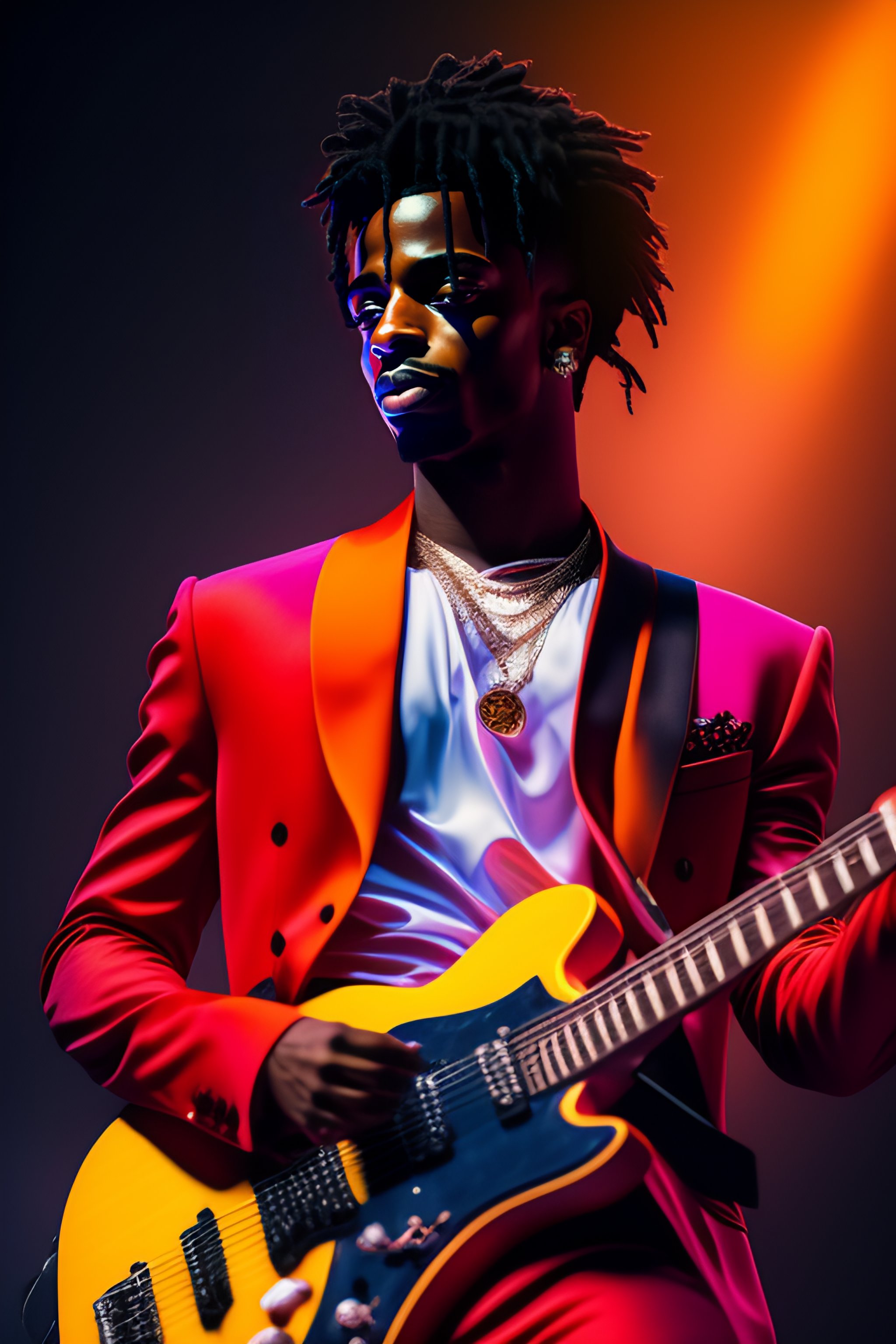 Cinematic portrait of playboi carti on stage with a guitar in front of millions of people, oil on canvas, masterpiece, trending on artstation, featured on pixiv, cinematic composition, dramatic pose, beautiful lighting, sharp, details, hyper-detailed, hd, hdr, 4k, 8k, wide camera angle