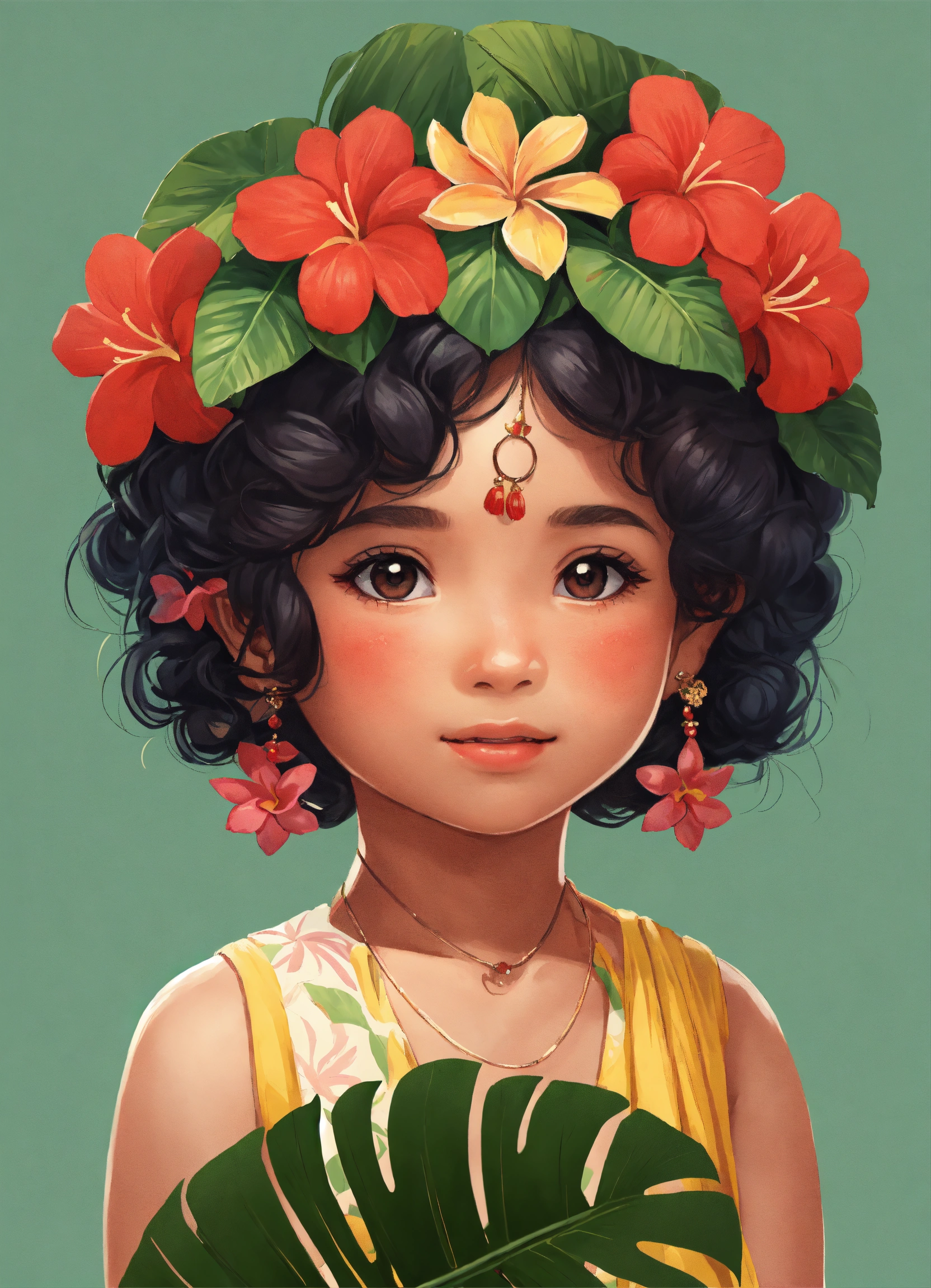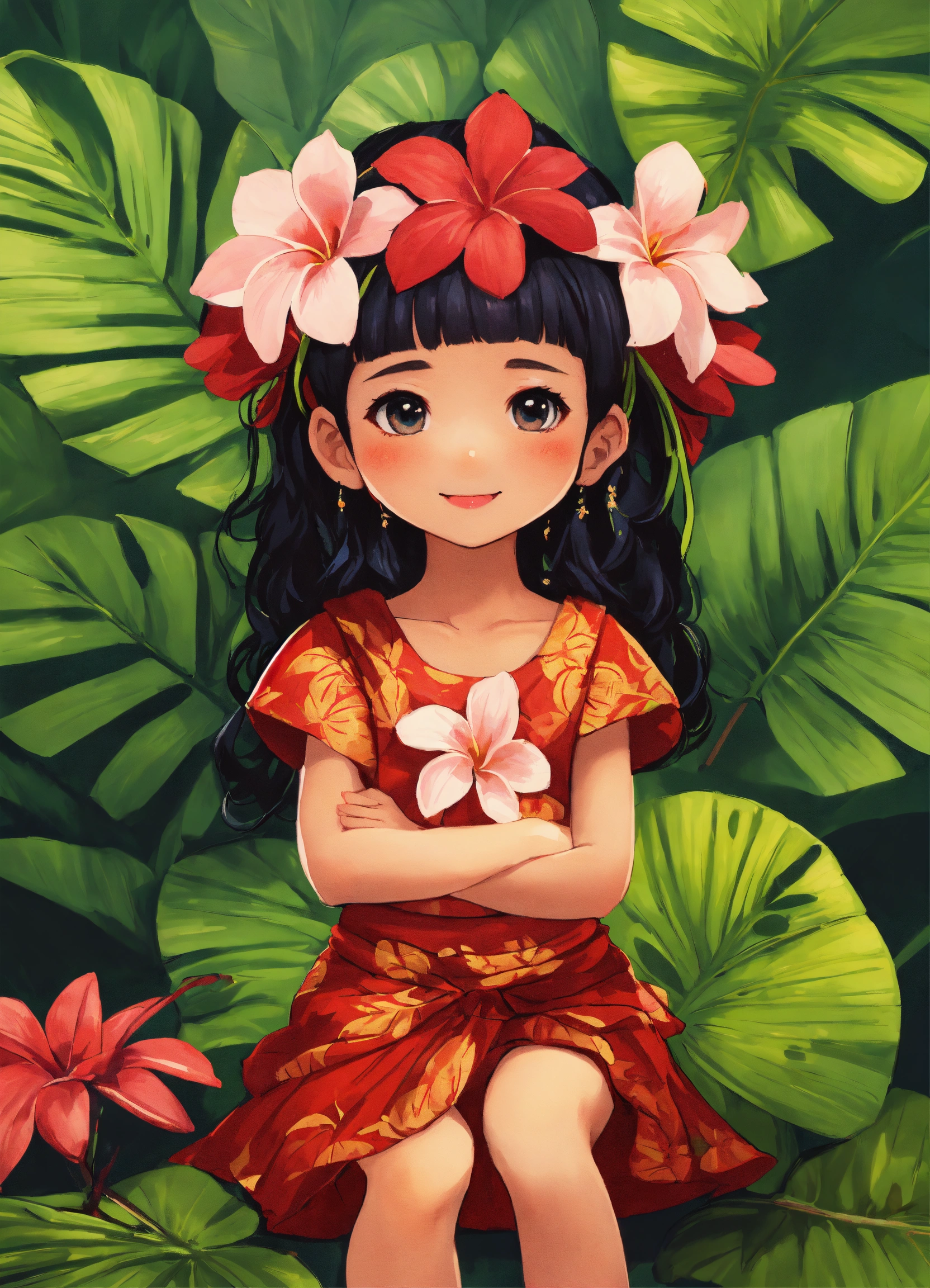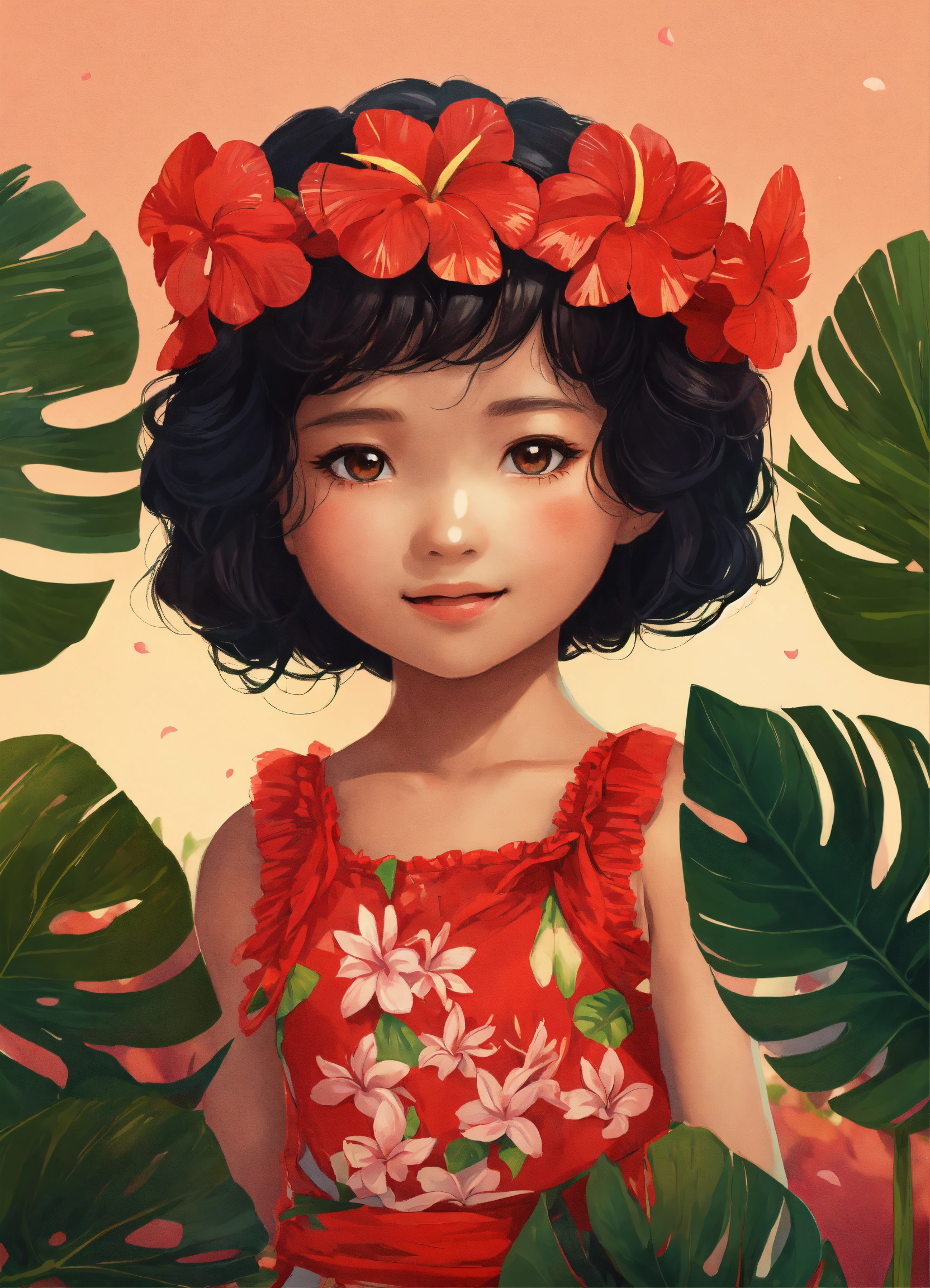 Cute cute for three little kids illustration, girl with a plumeria headdress on her head, she has a red frilly cloth wrapped around her chest, she wears a skirt made of leaf, shy smile, the background is a monstera, black hair, drooping eyes, 4k, 8k, asian beauty, moani