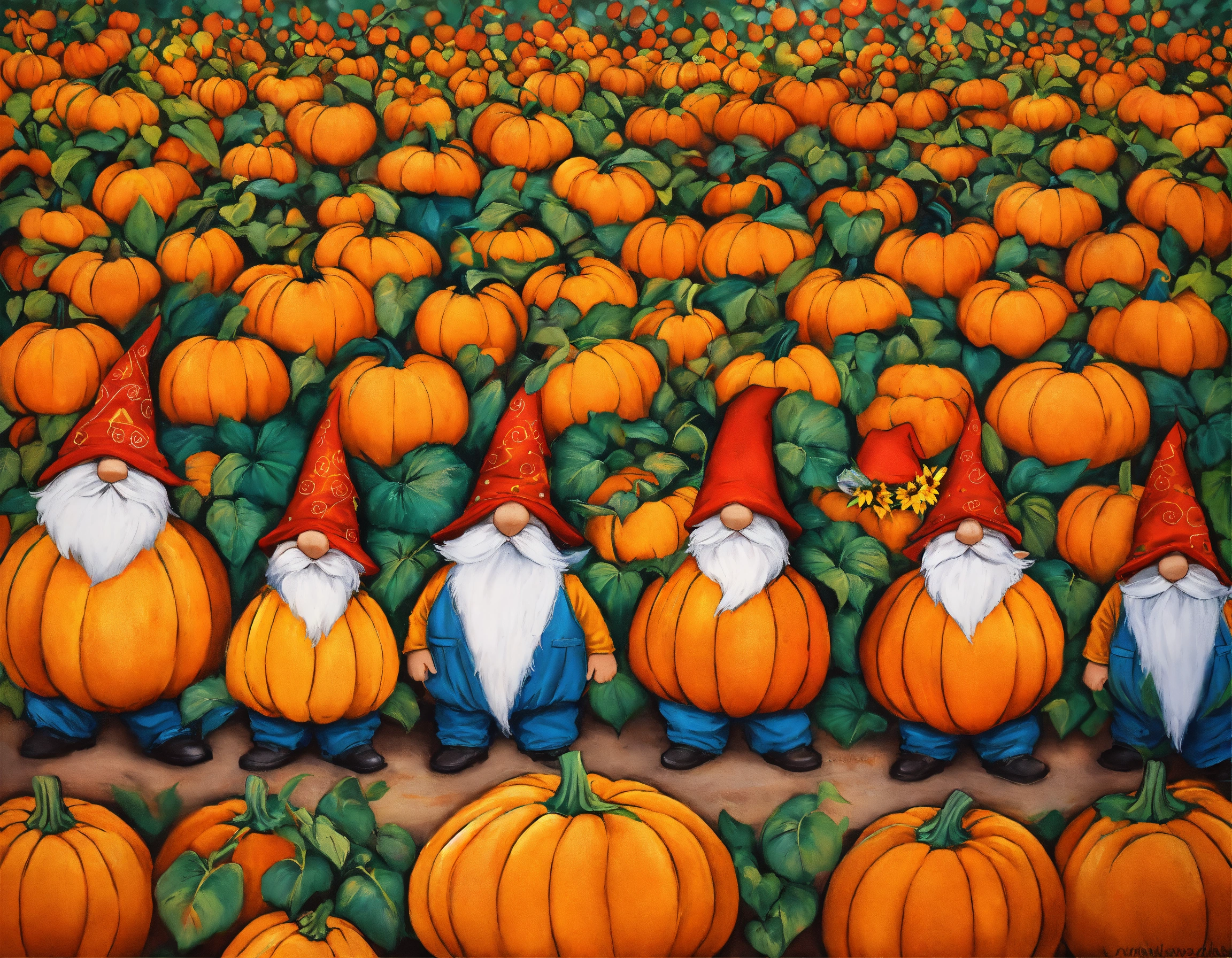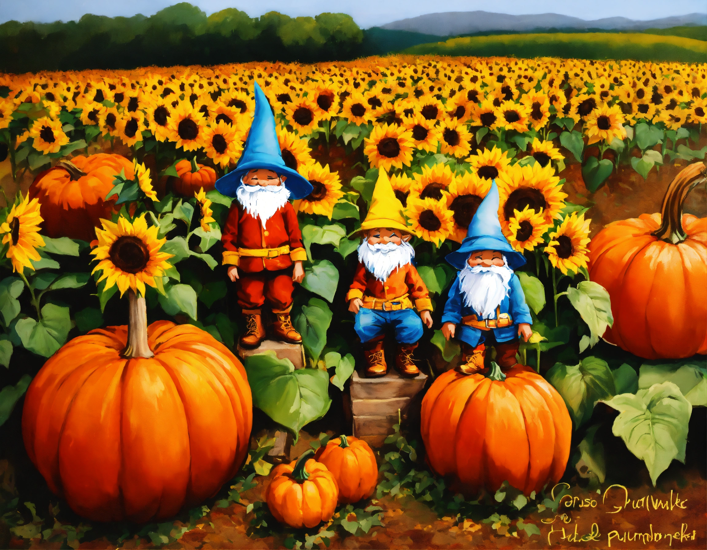 Jessica davis gnomes with hats covering their eyes and pumpkin patch w sunflowers