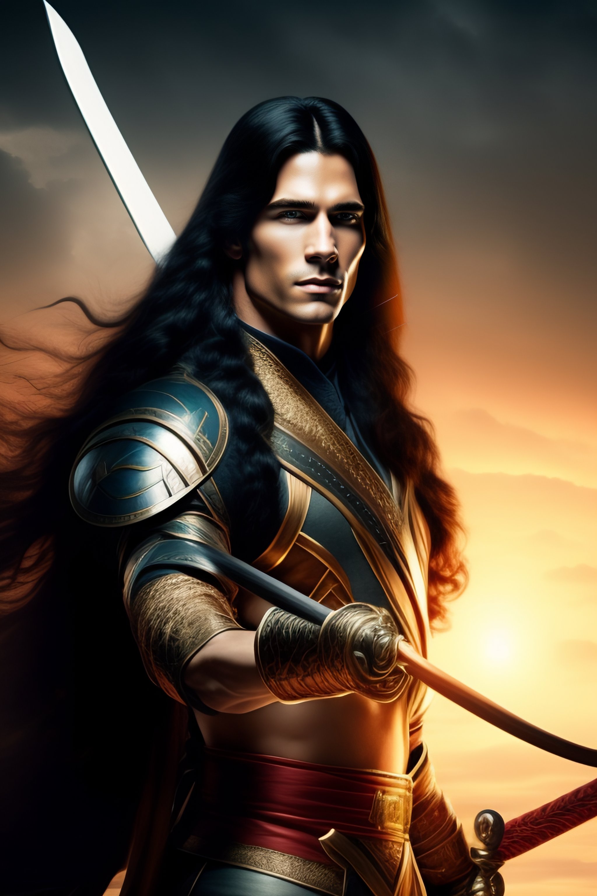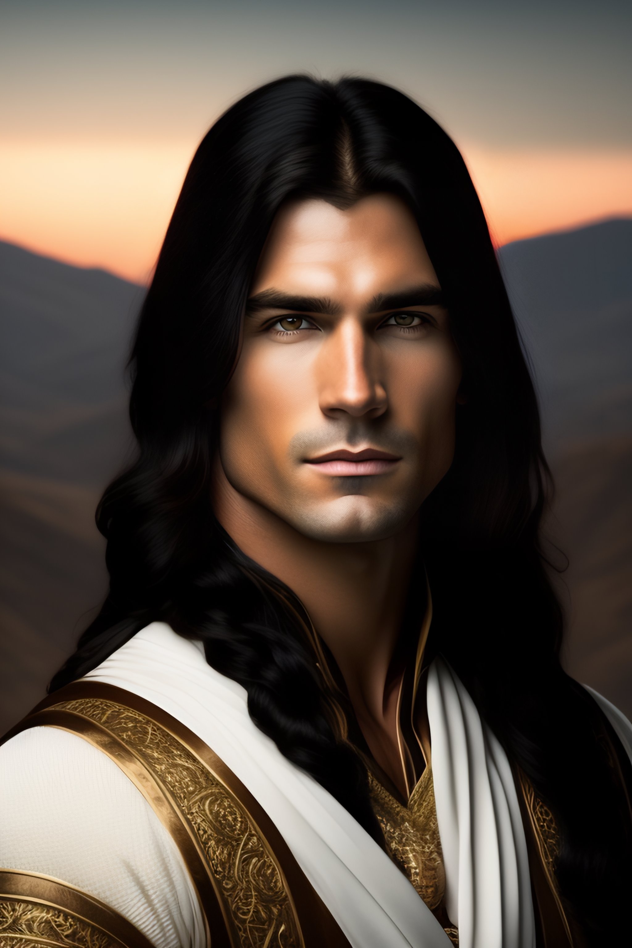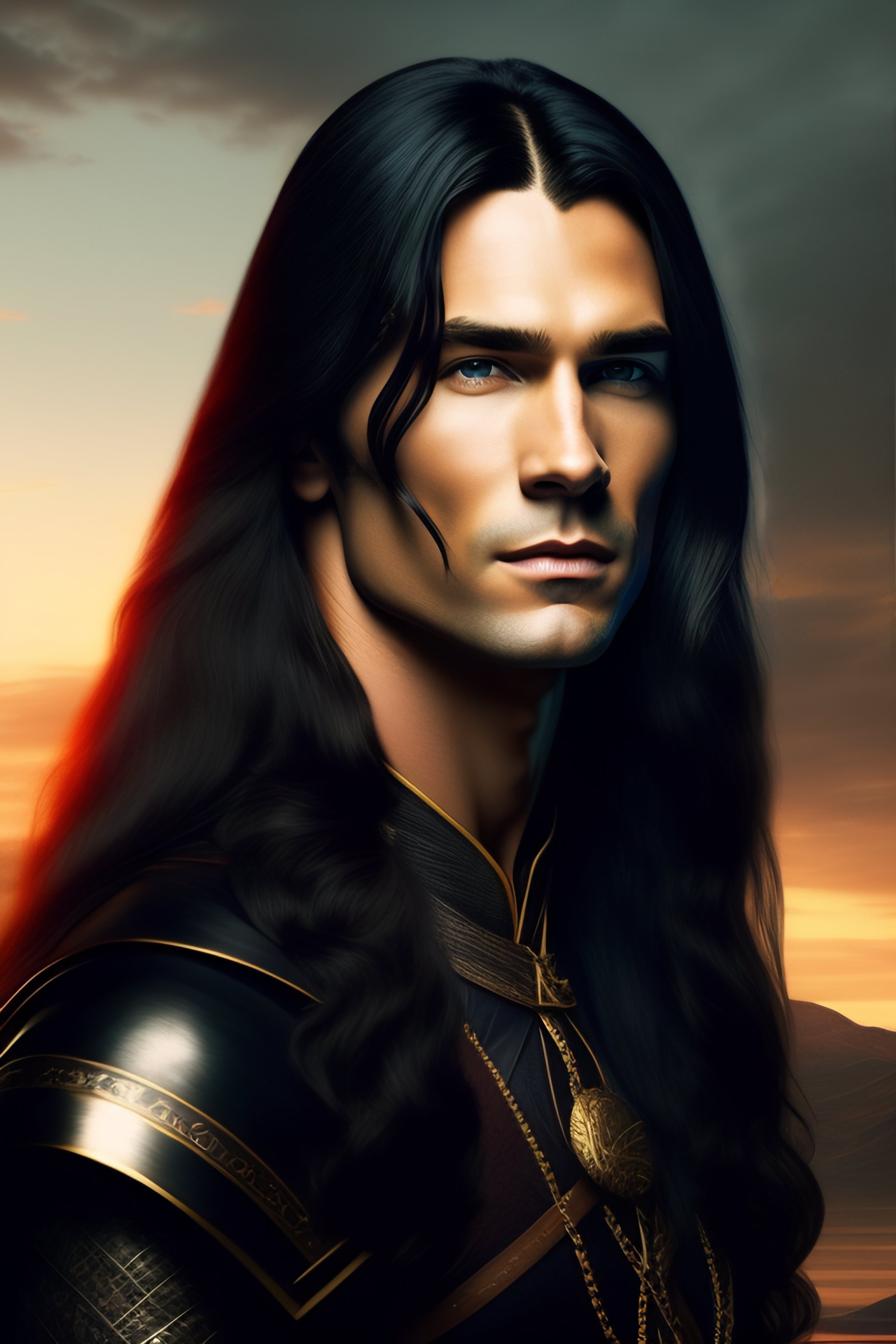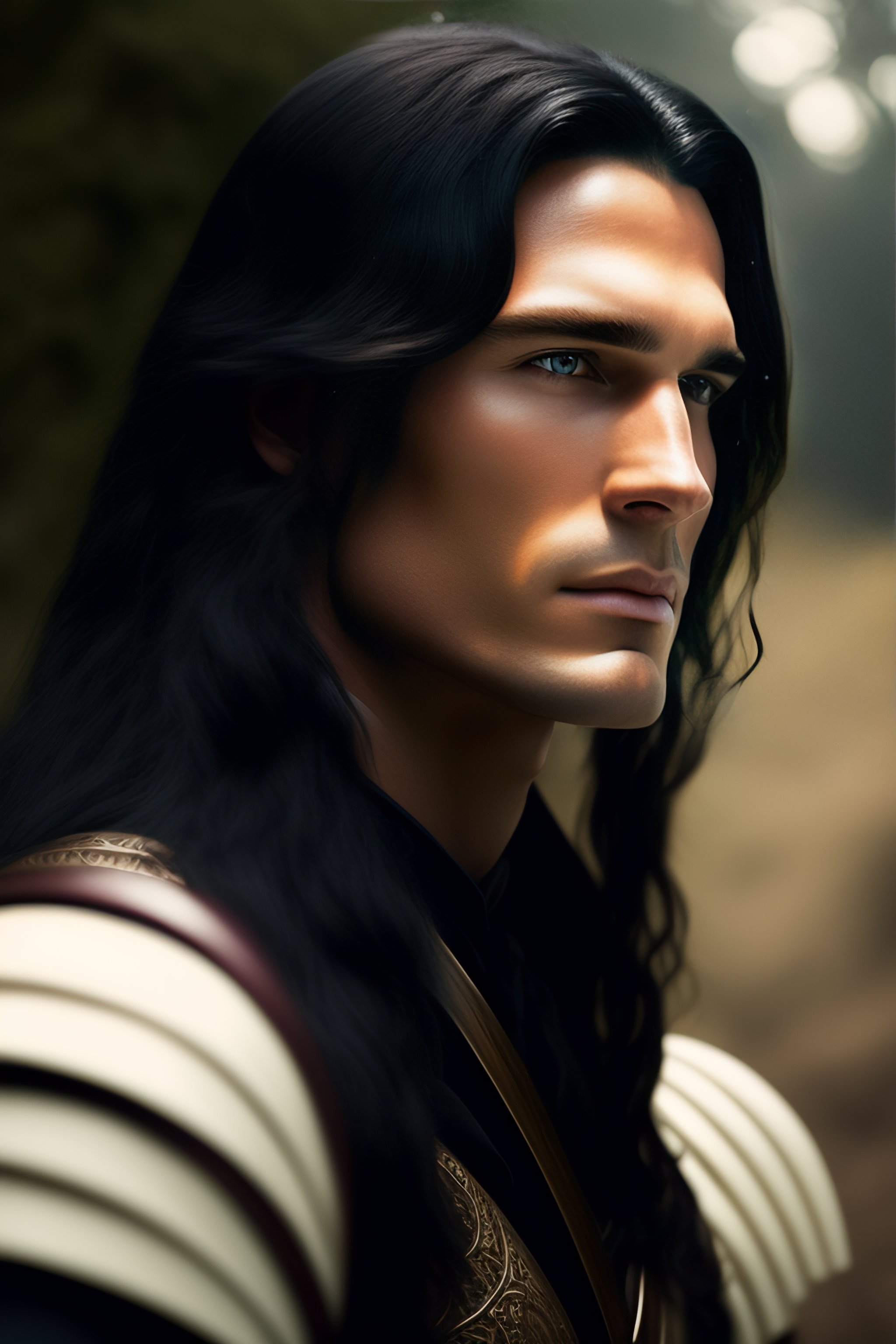 White male archer with long black hair with a dark background