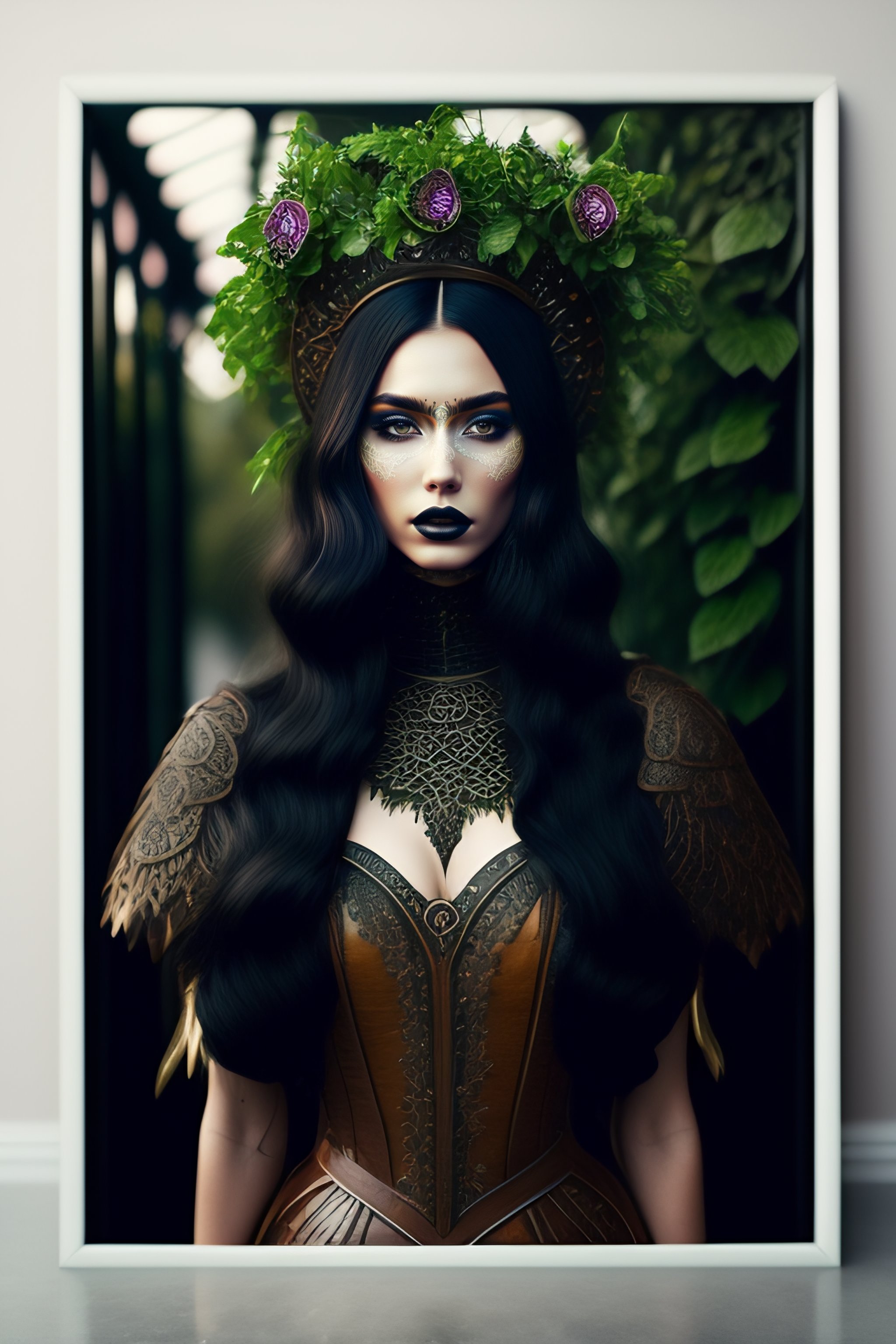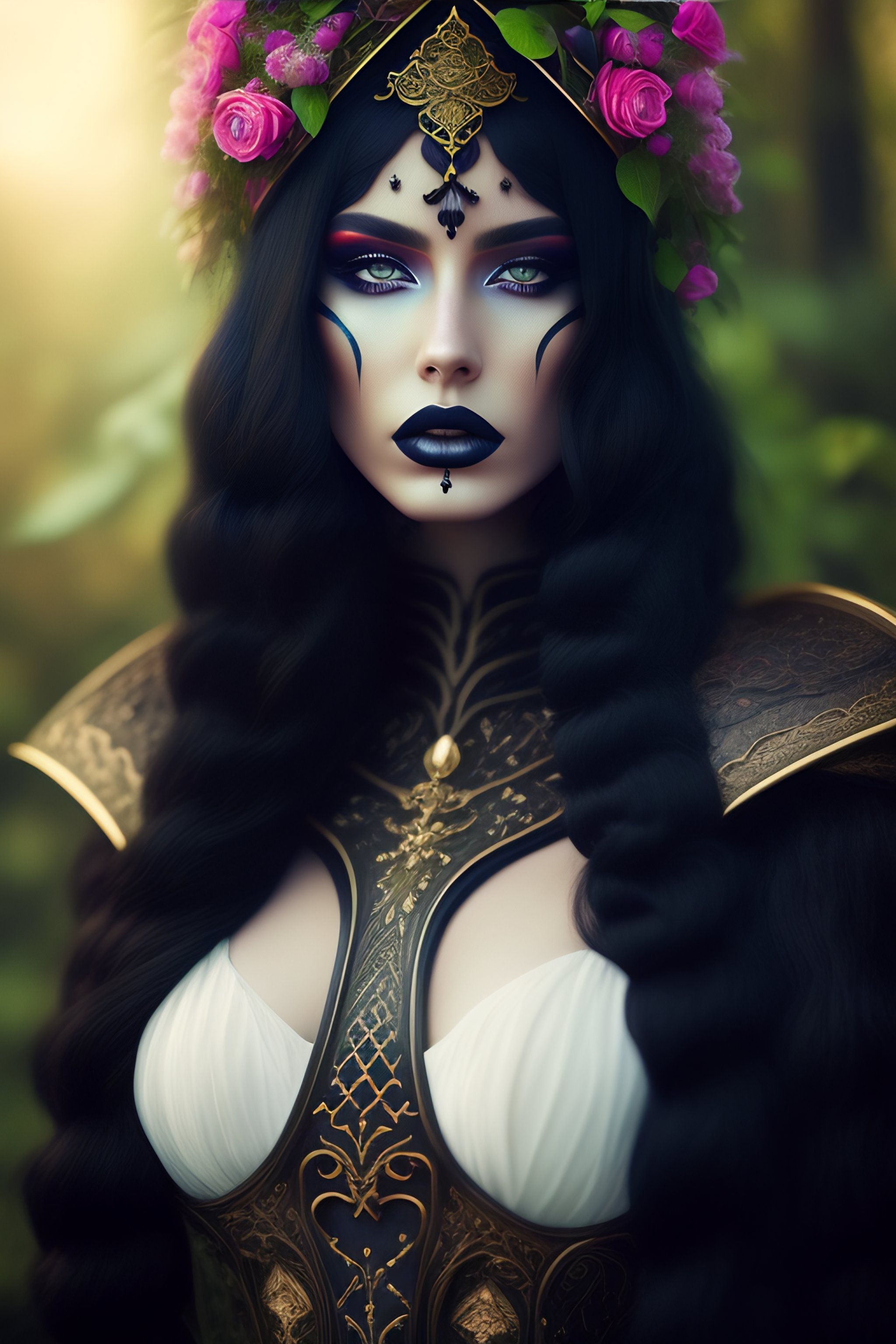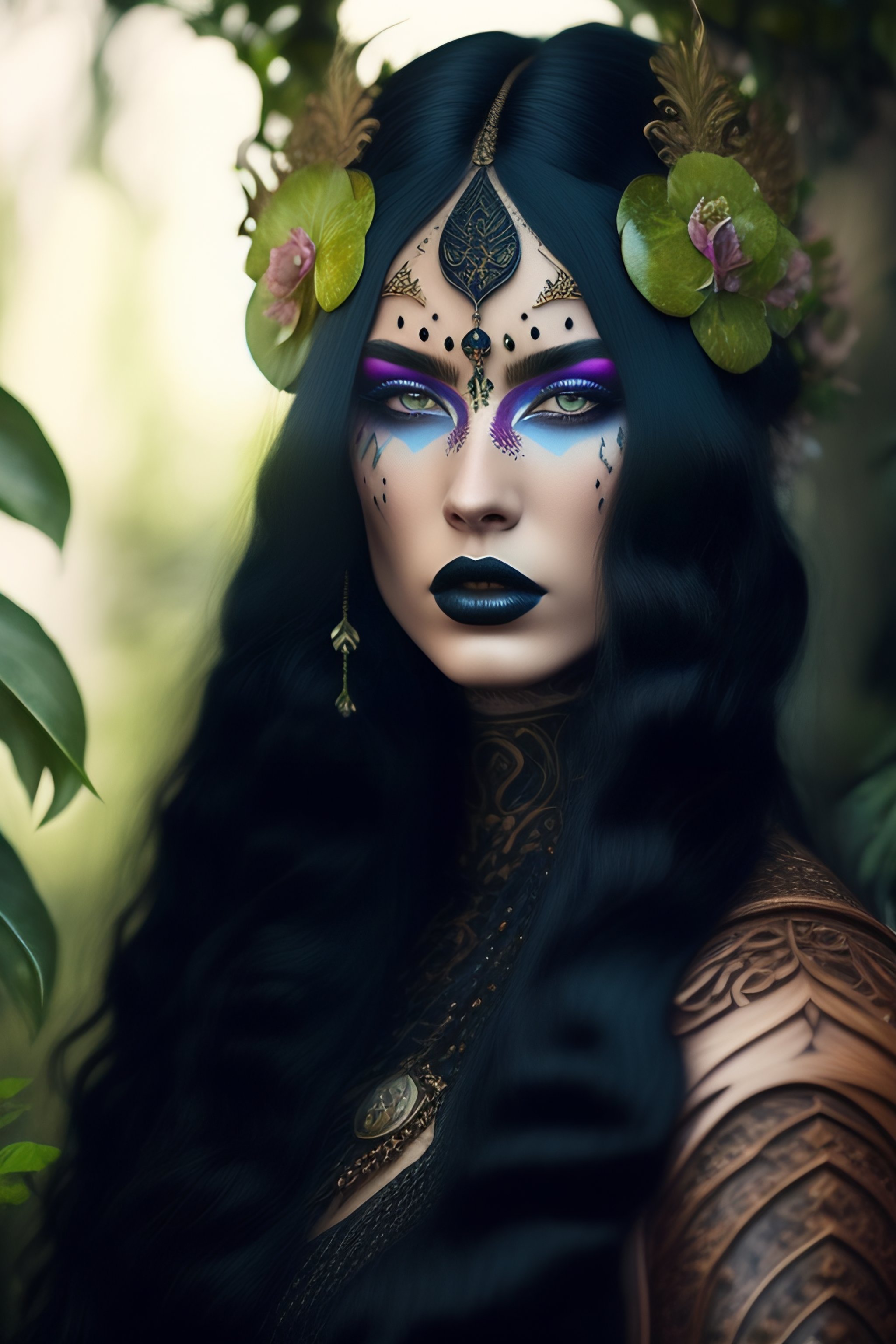 Greenhouse warrior, intricate, wood, long black hair, beautiful gothic makeup, delicate, surreal, beautiful, fantasy