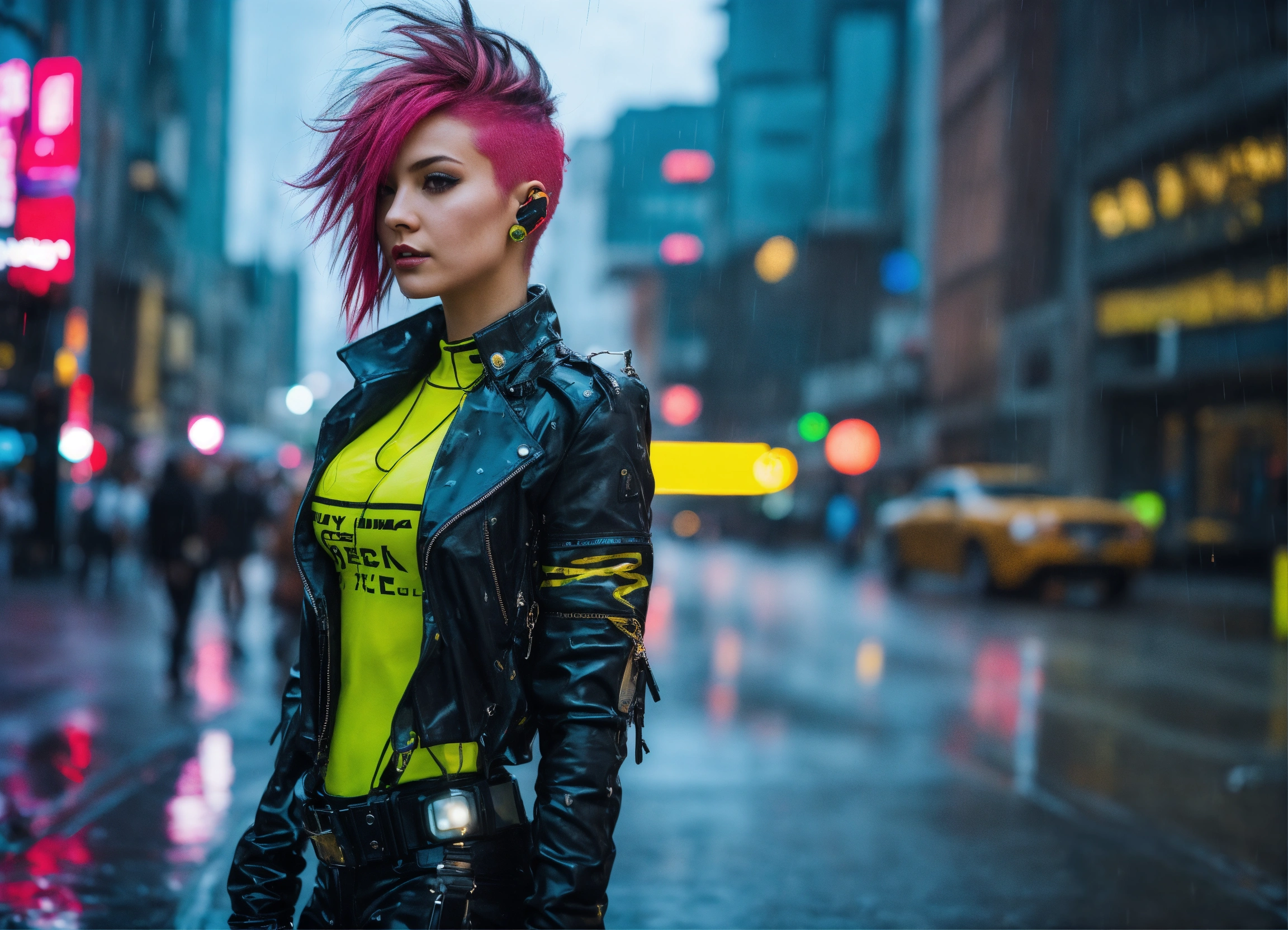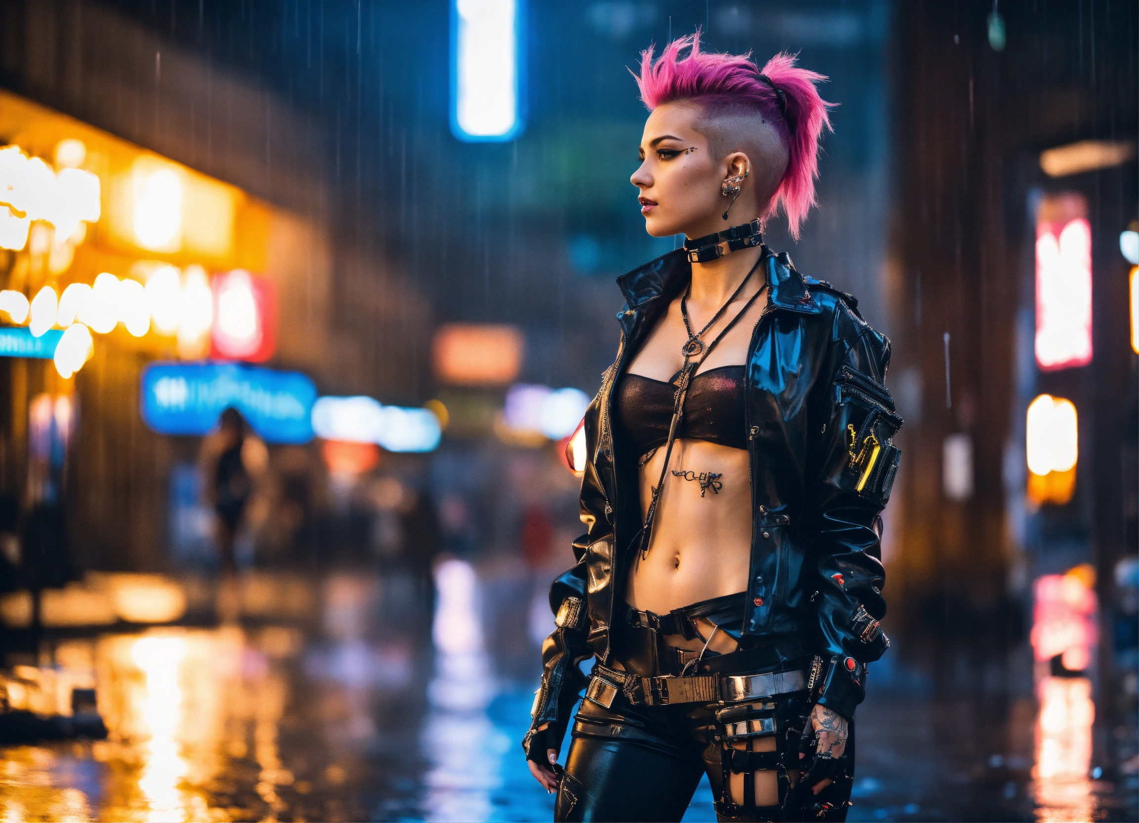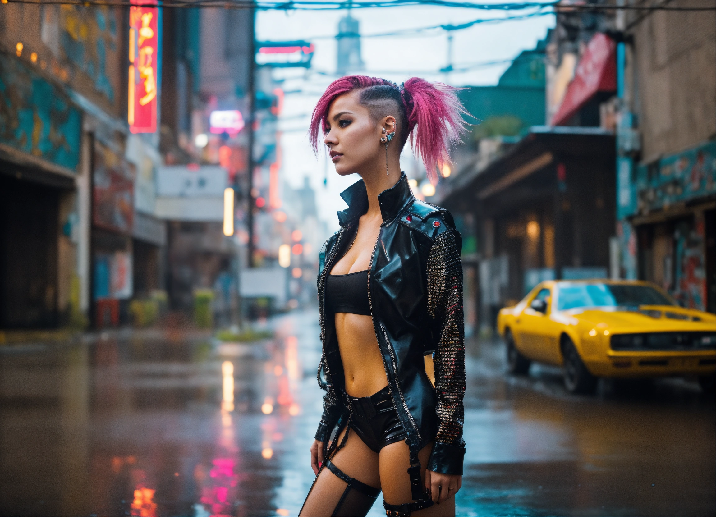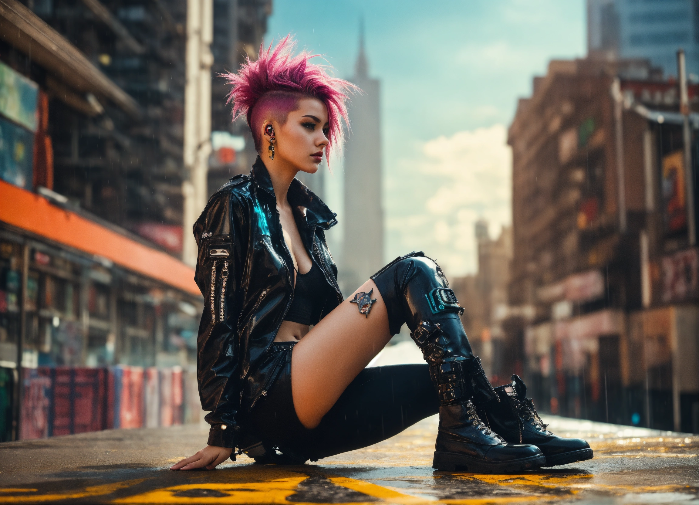 Photo, full body cyberpunk dream girl, punk hair, futuristic, sunny weather, city, open shirt, latex, rain
