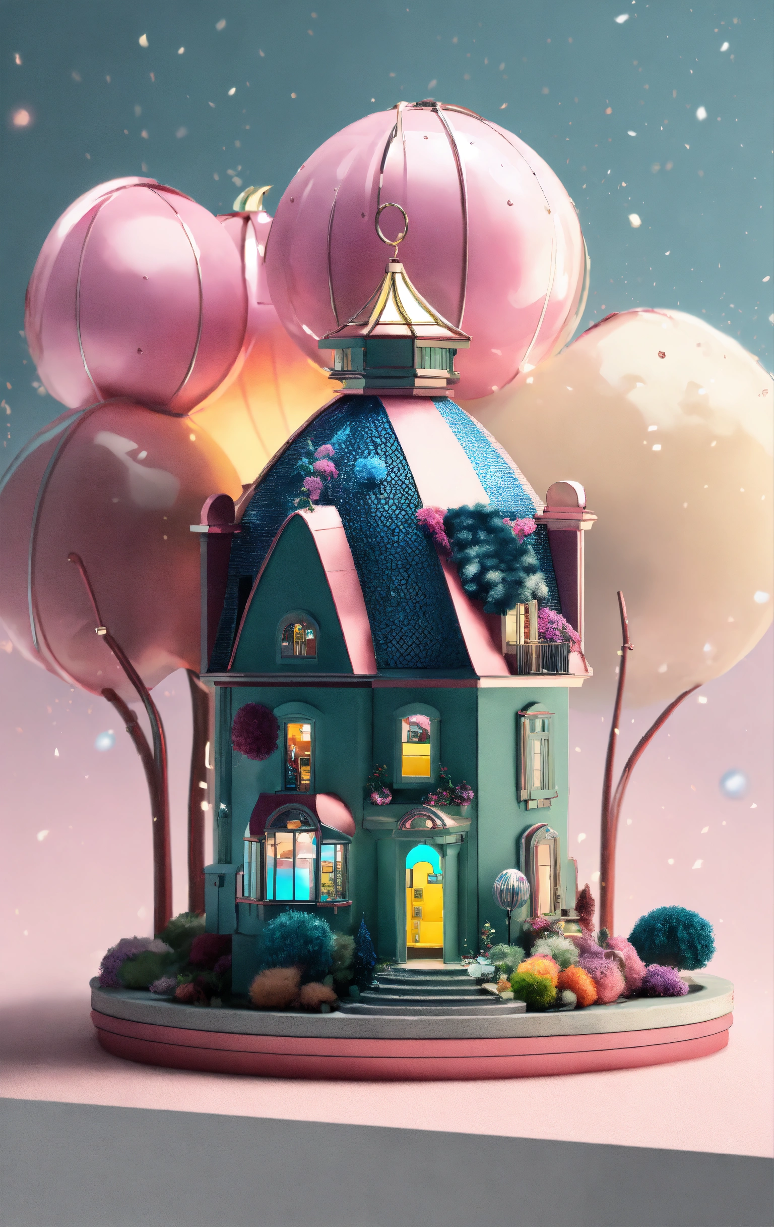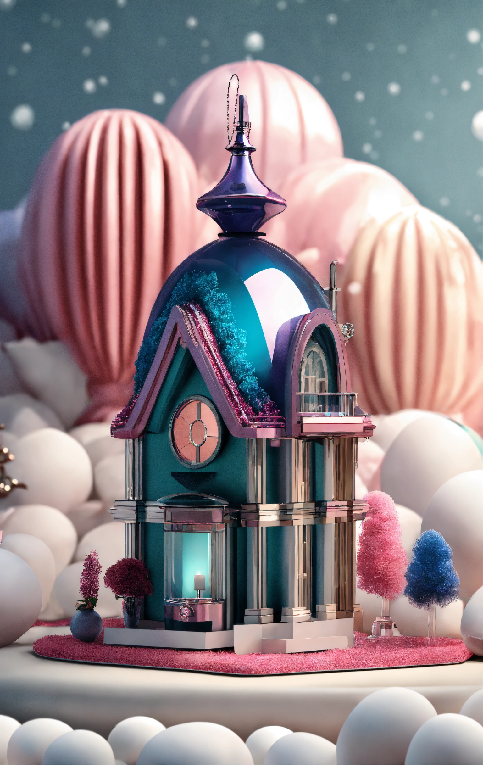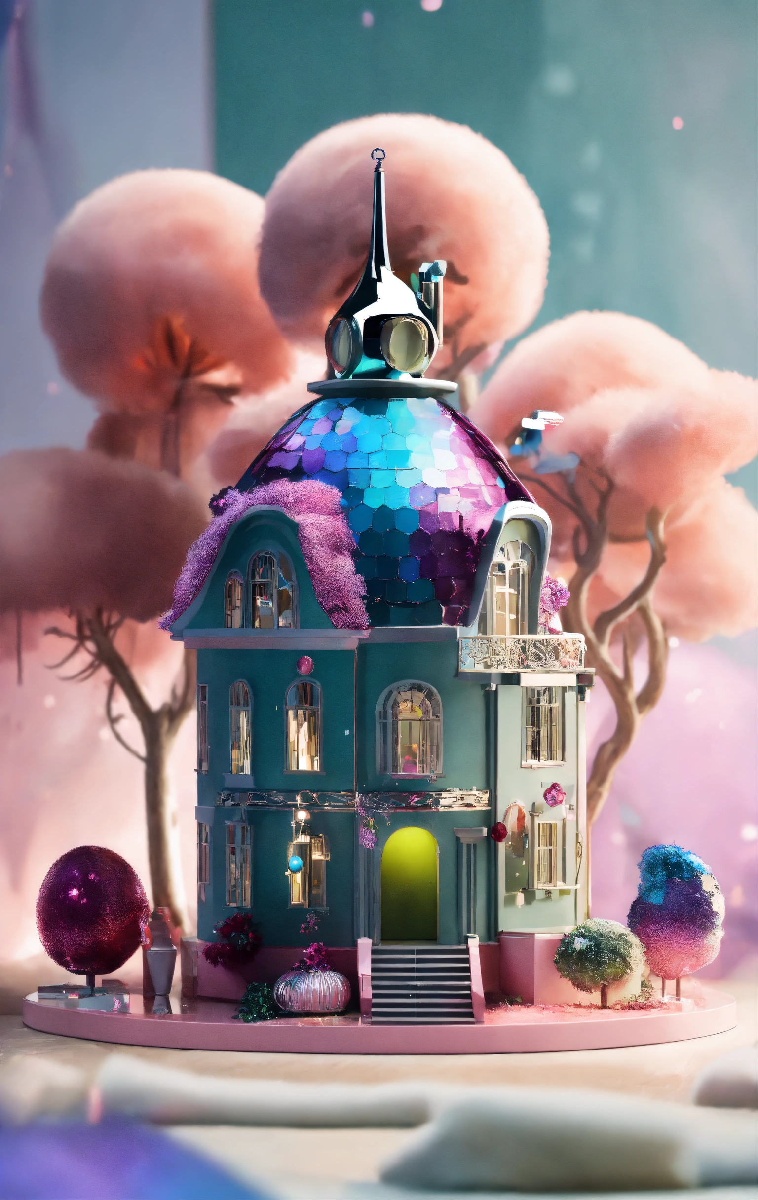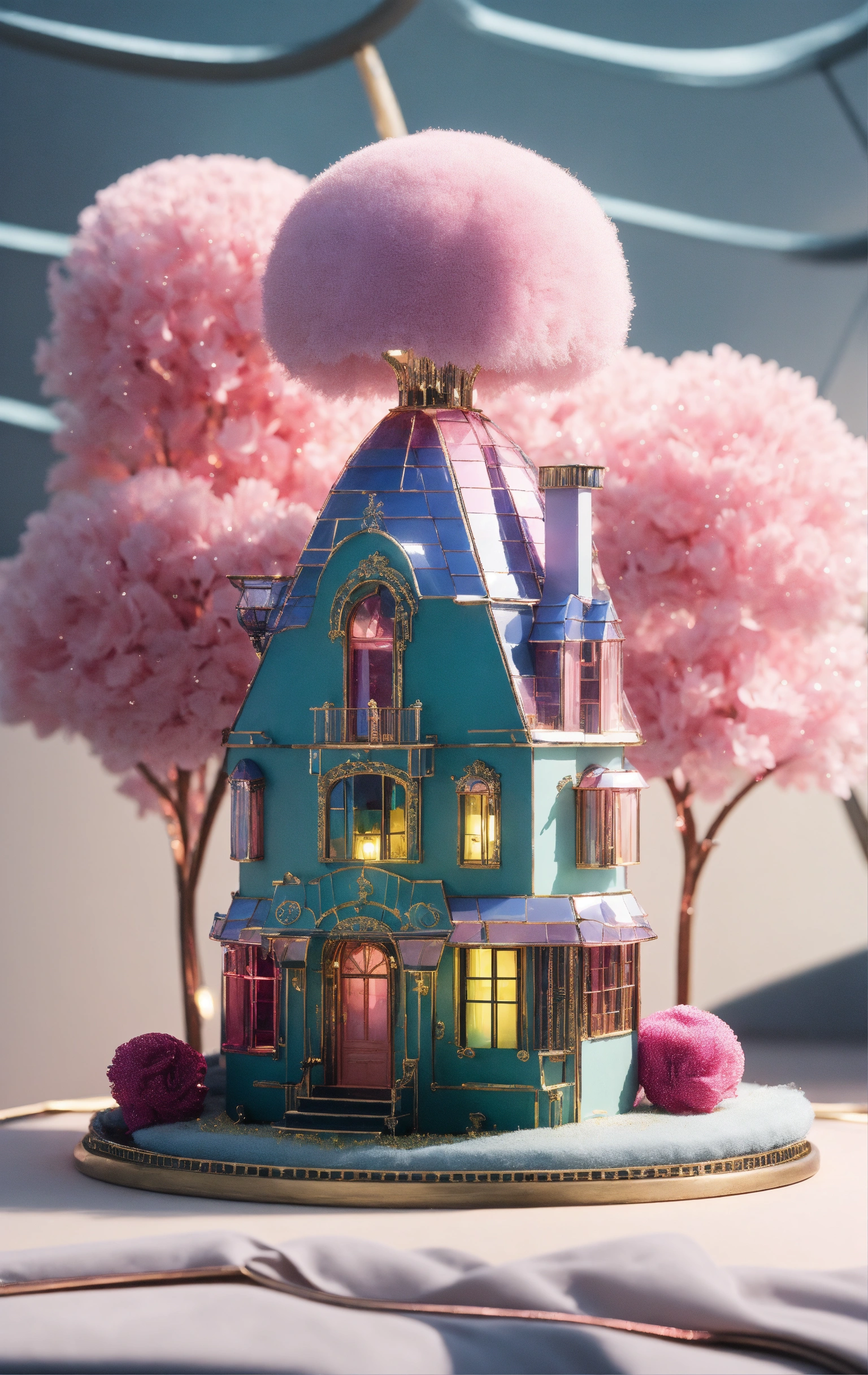 Maison conçue par katherine's collection inspiration. rendu moteur 8k, bel éclairage futuriste, maison sous dôme verre, laine cardée, strass colorés, fourrure, lampe rose