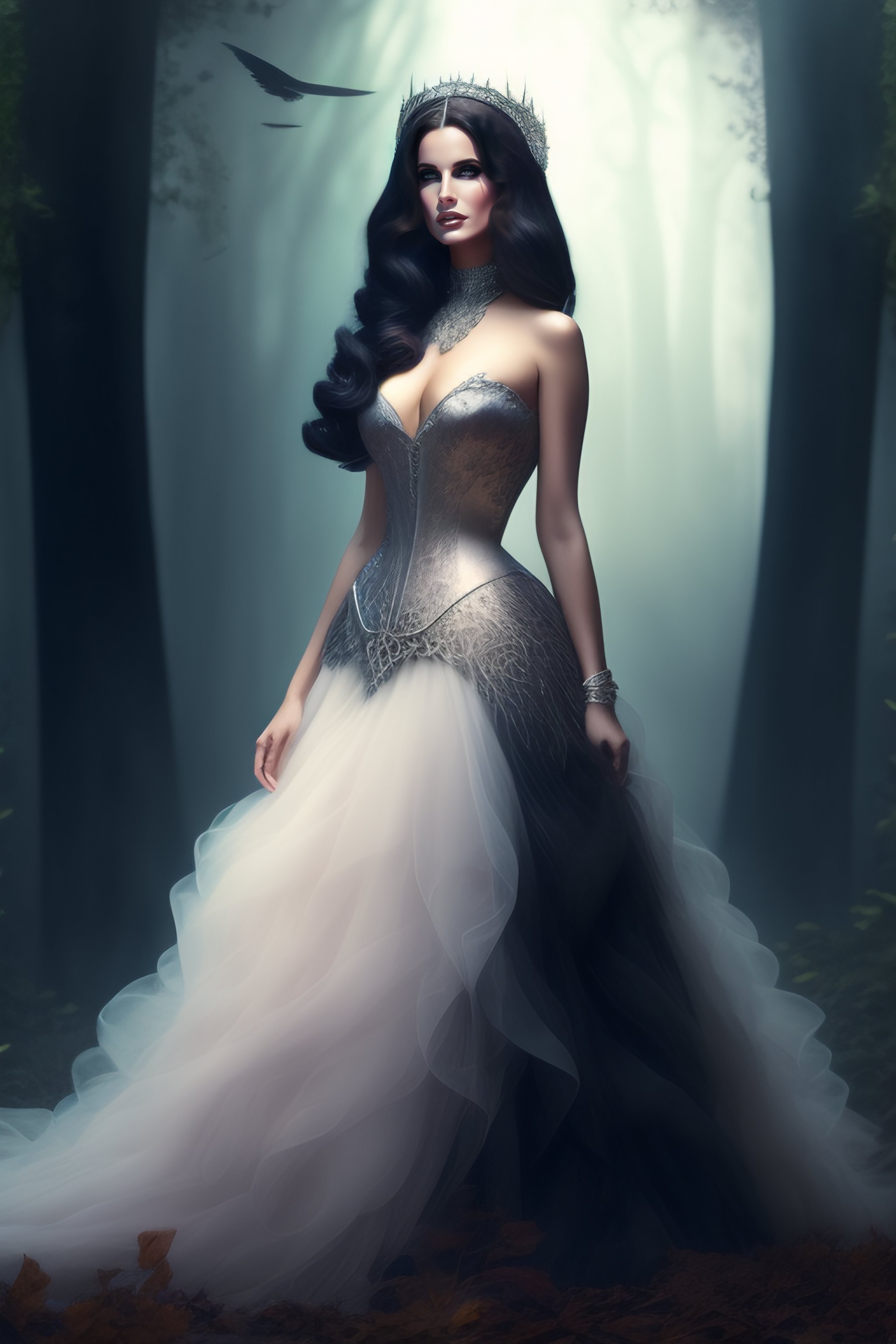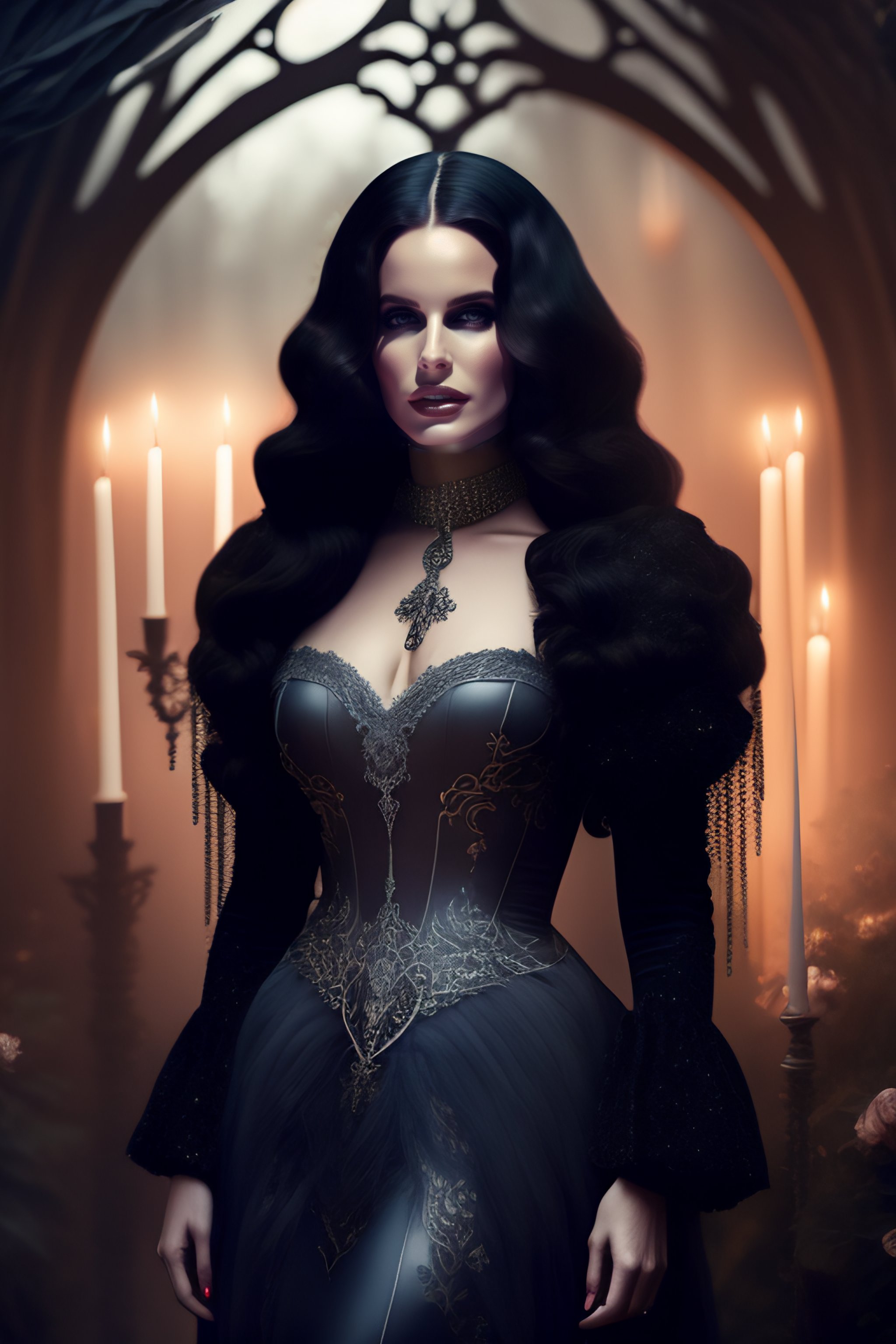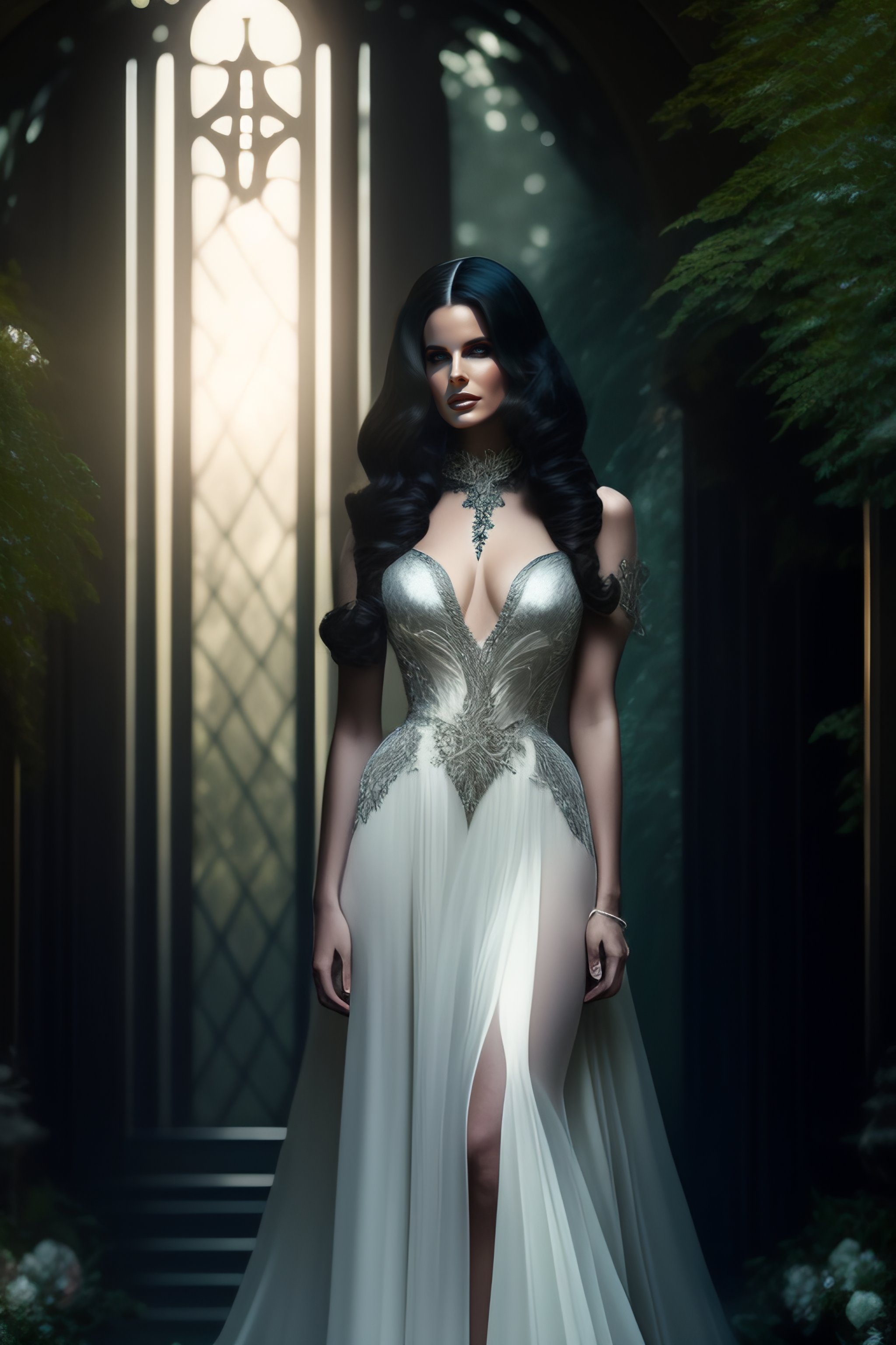 Full body portrait of lana del rey, a stunningly beautiful gothic lana del rey full length, gothic silver jewellery, flowing sexy gothic see-through dress with a big slit, elegant pose, gothic, atmospheric lighting, gothic forest, cemetery, mystic, magic, cinematic composition, detailed, art by daniela uhlig and brad rigney and adam hughes