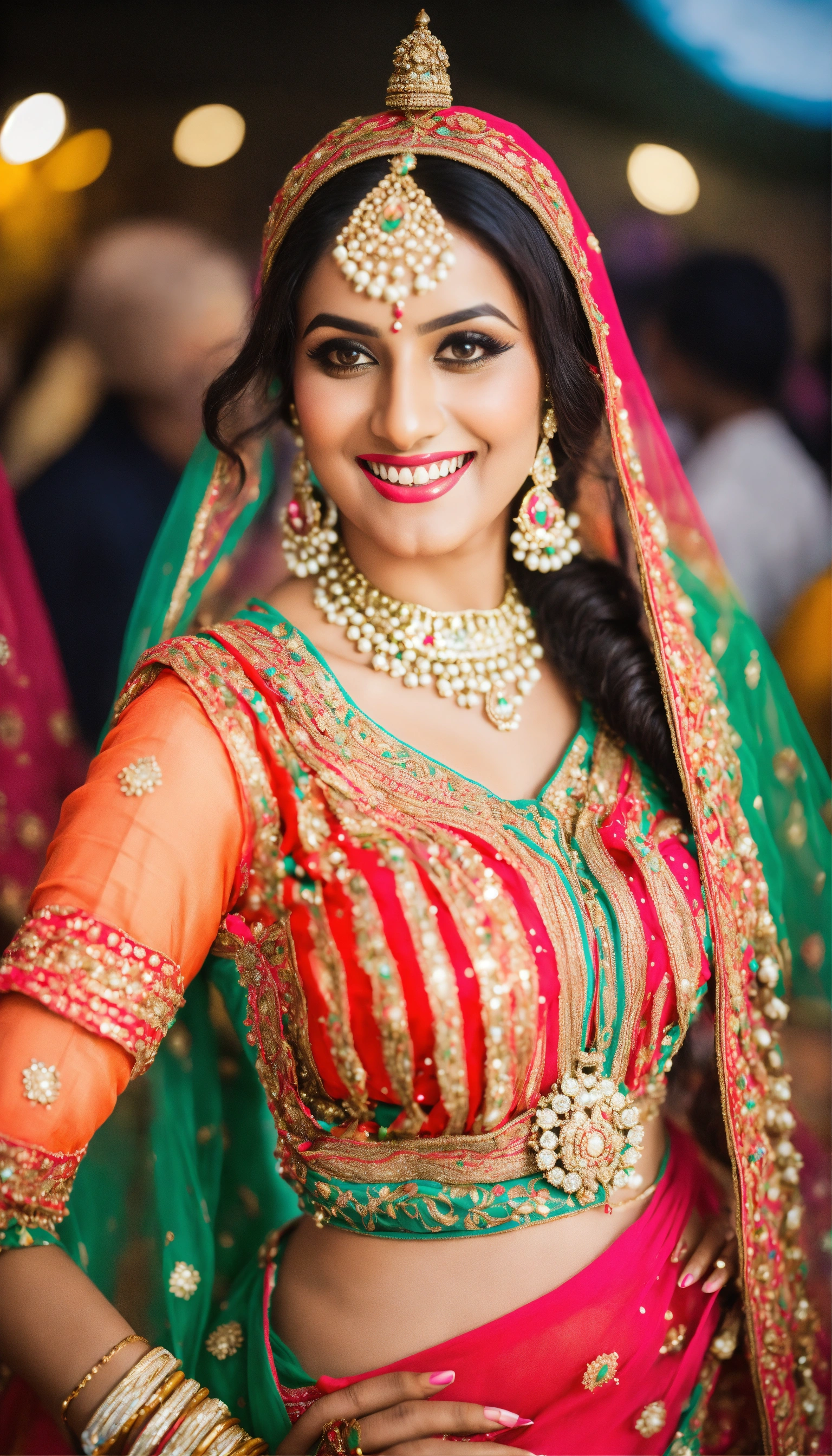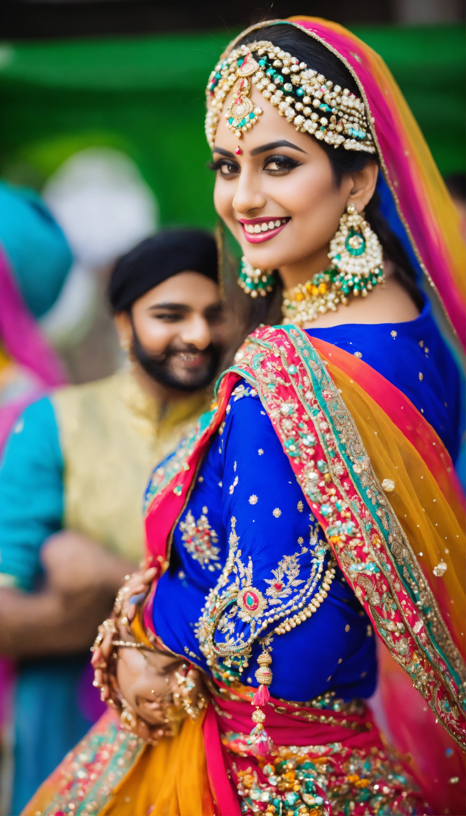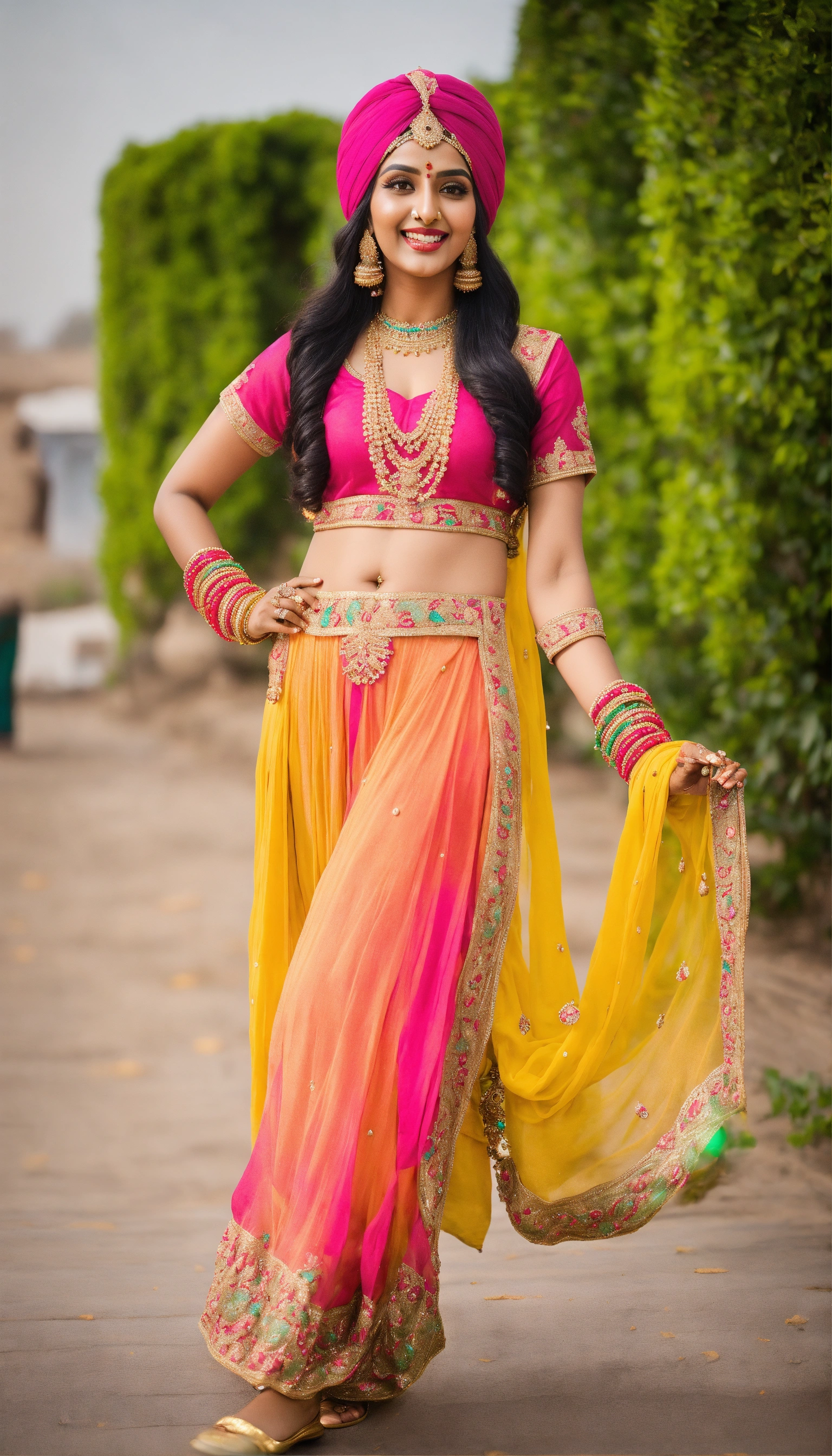 Stunning sikh woman, dancing bhangra, props in hand, turban on head, wearing multi color salwar suit, full body, bridal jewellery, long hairs, cute smile, shiny eyes, nice shape body