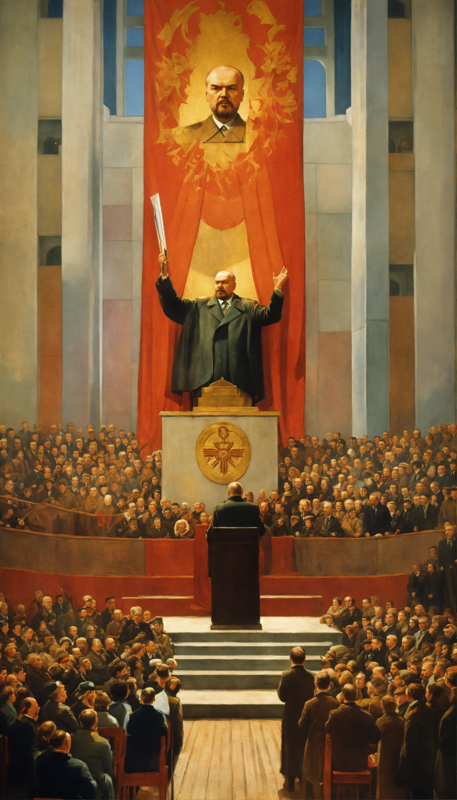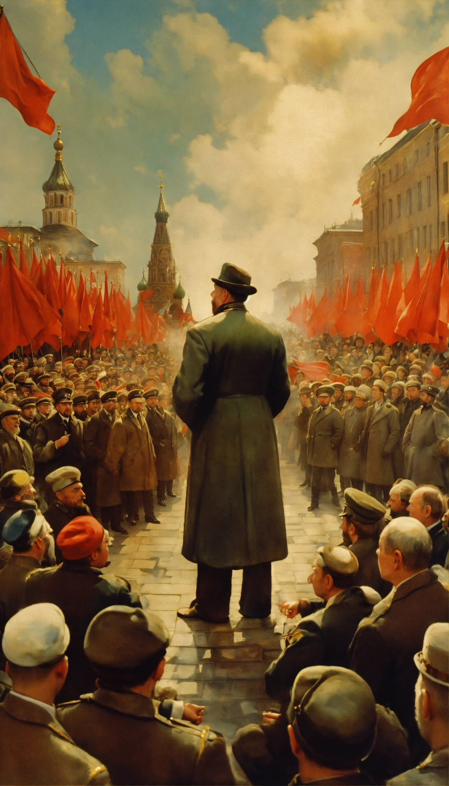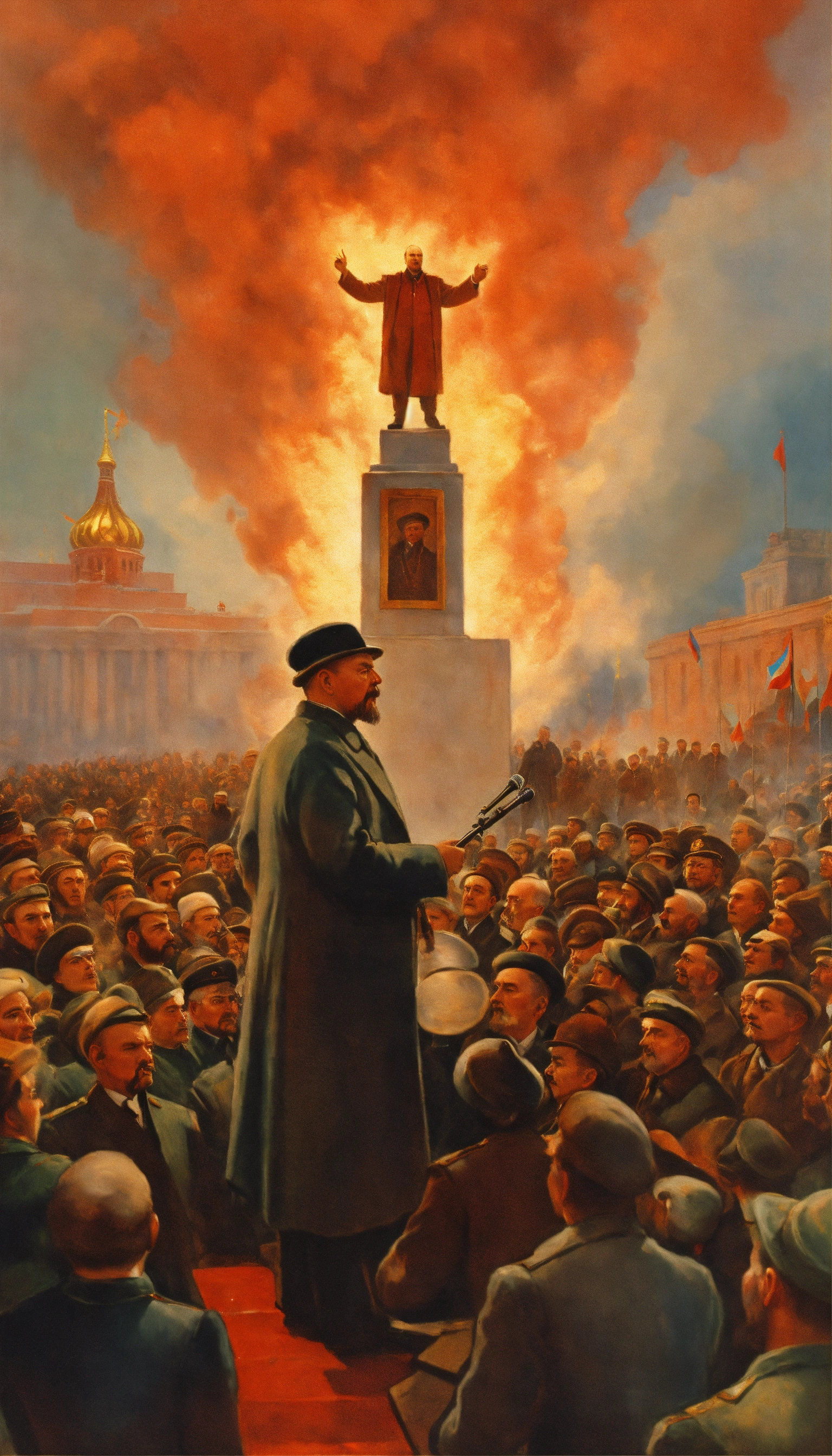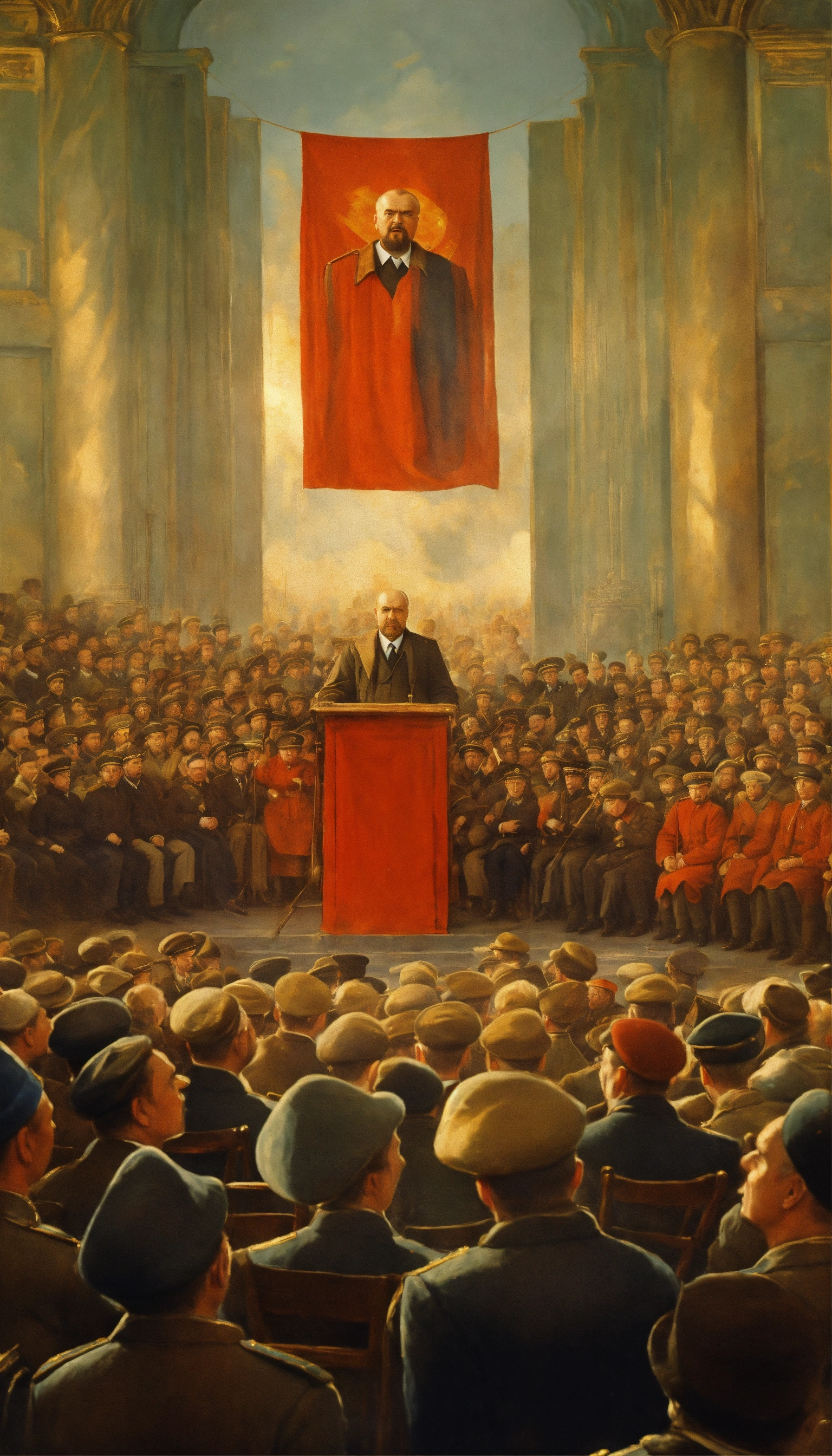 Vladimir lenin is making a speech in front of the russian people who are attended by his people