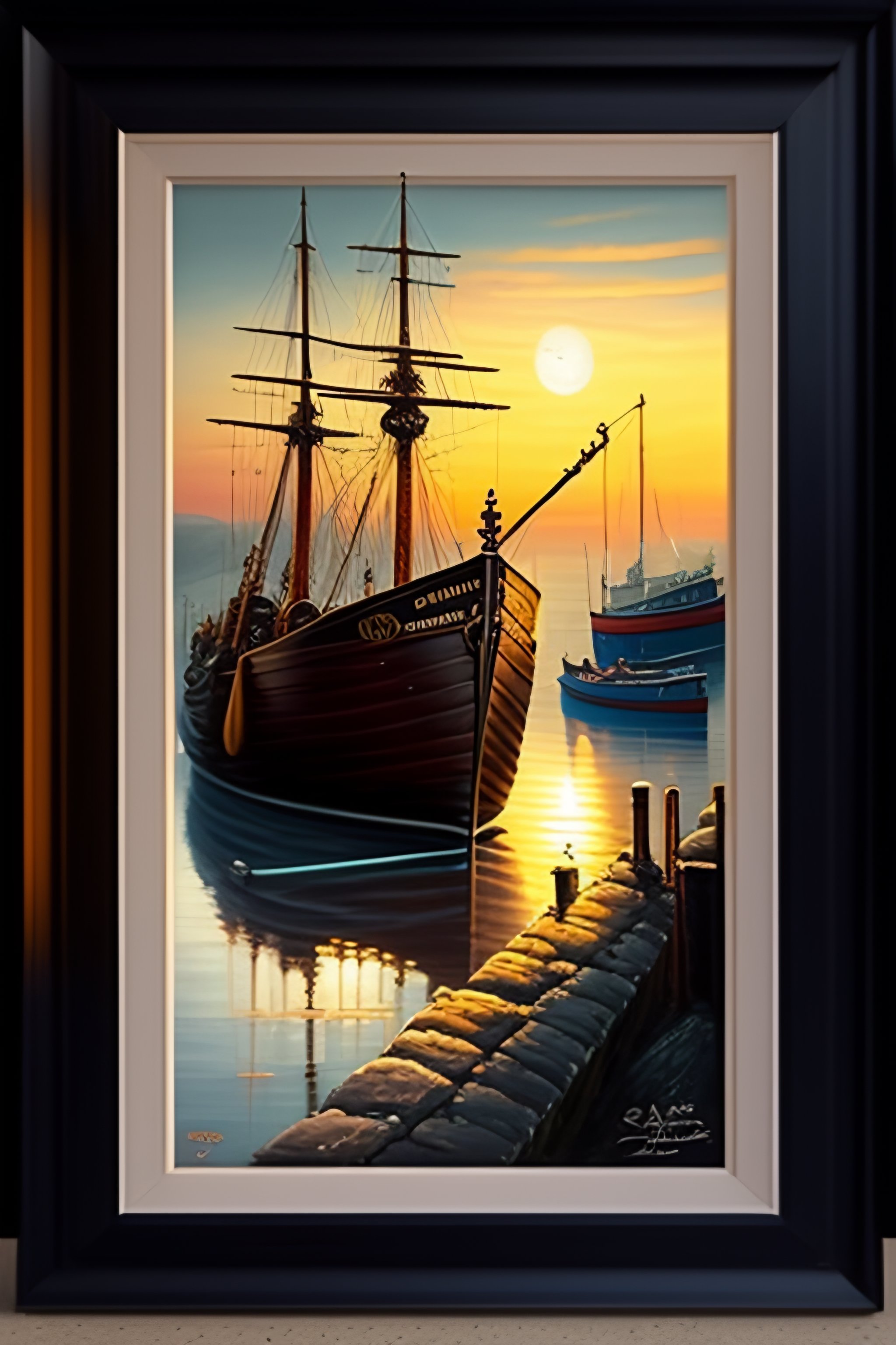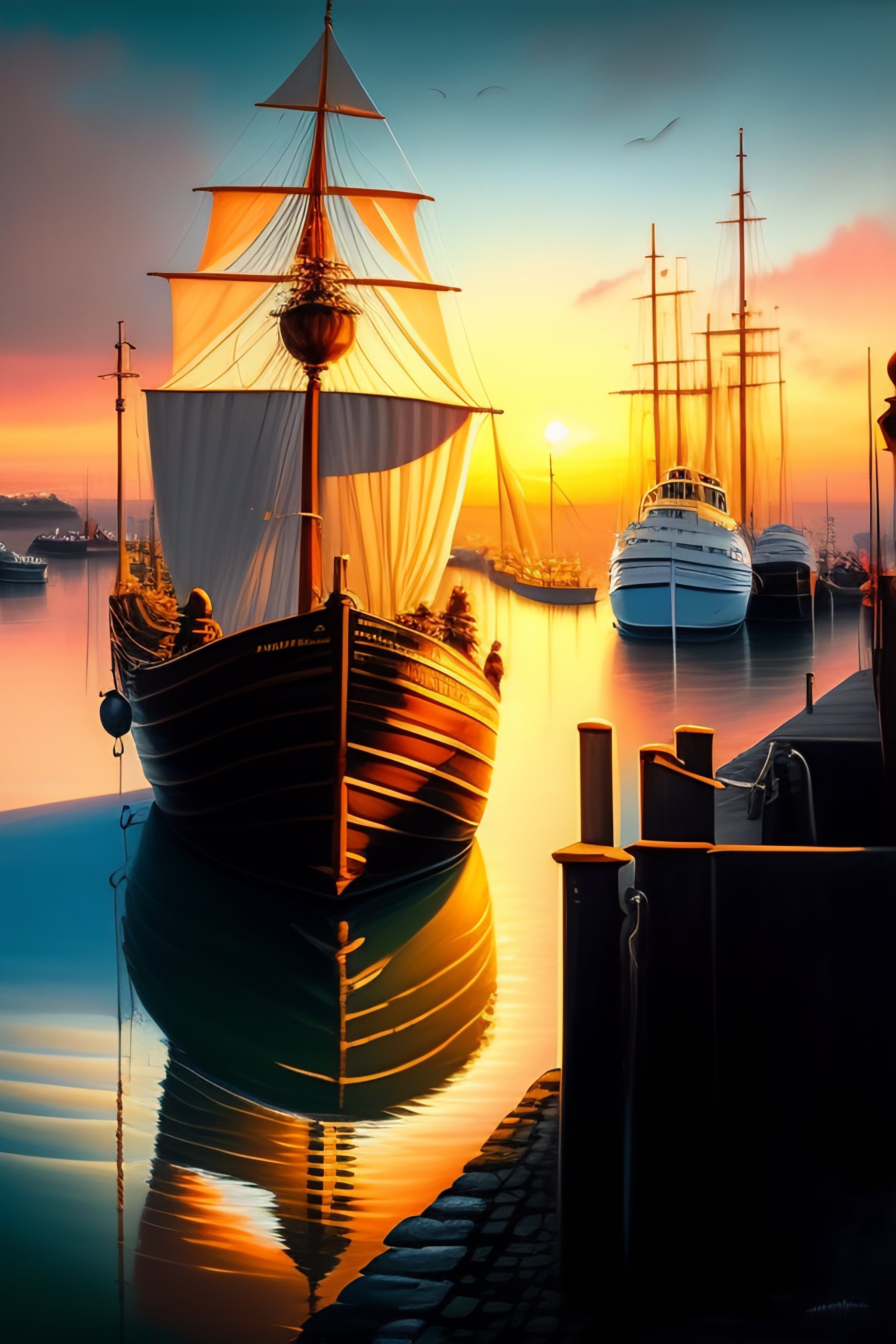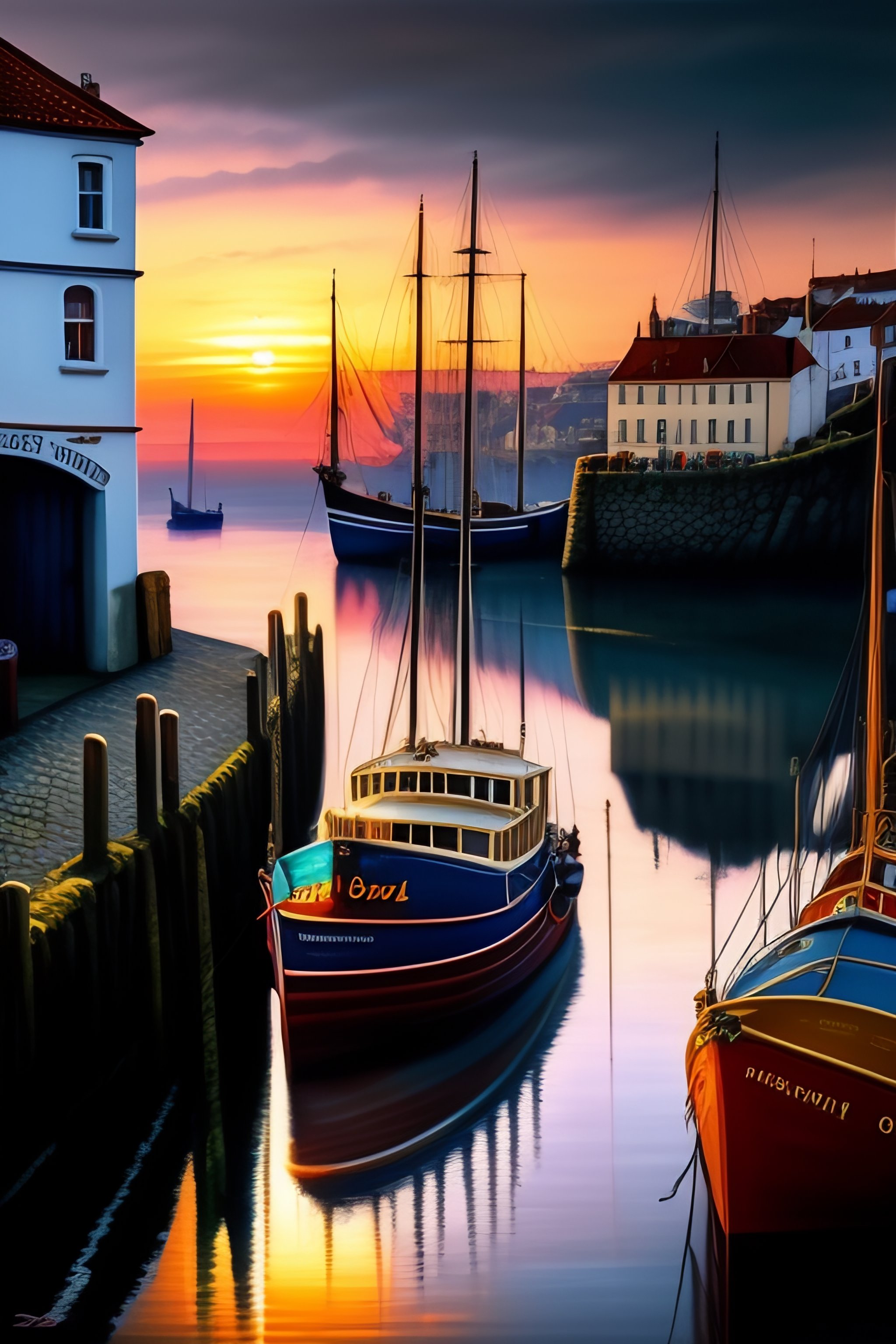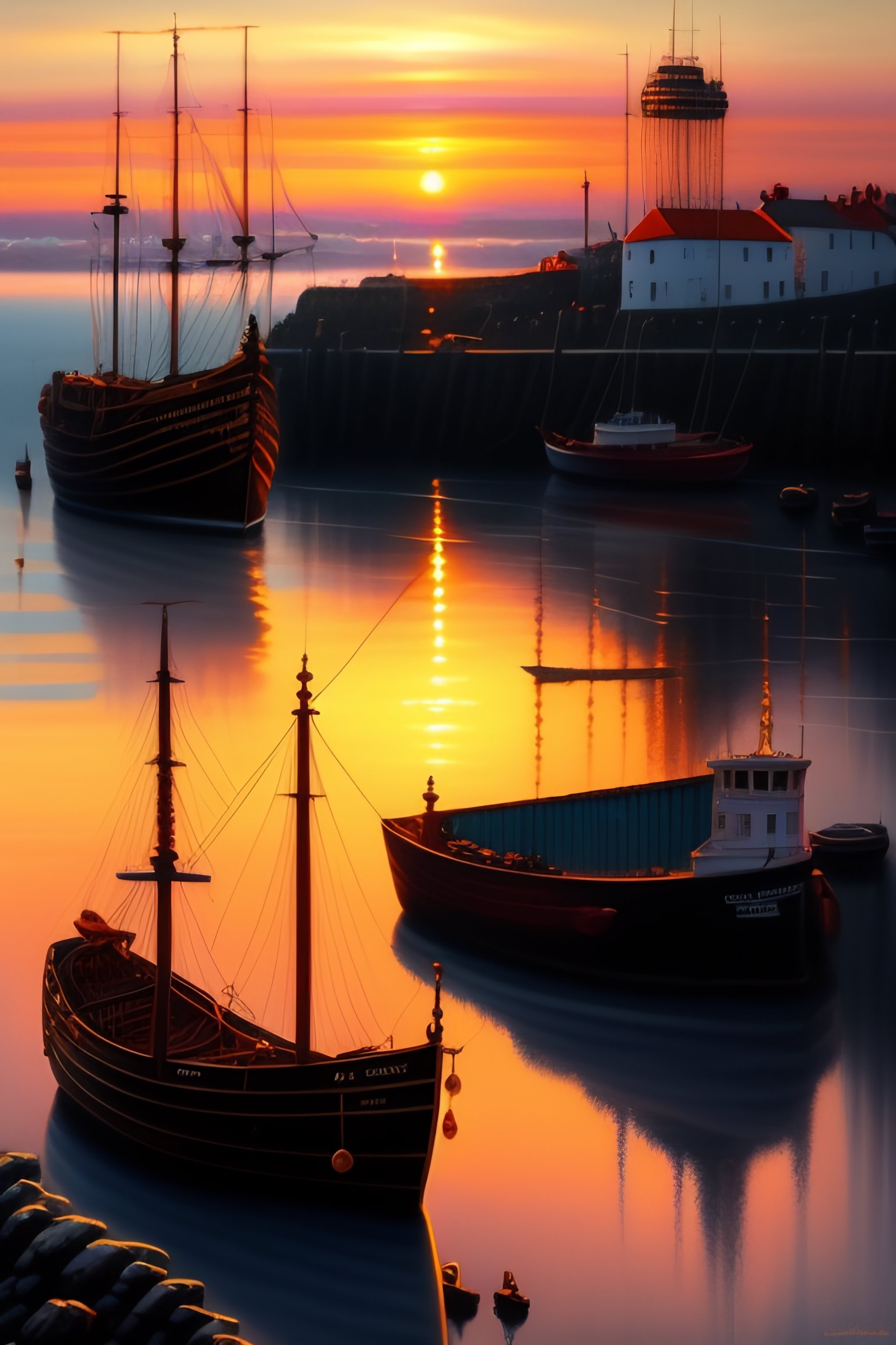 A steampunk painting of brixham harbour at sunrise in the style of banksy