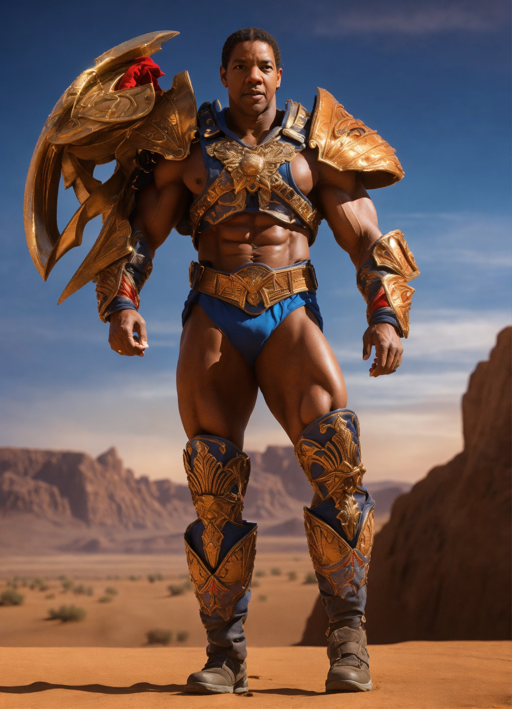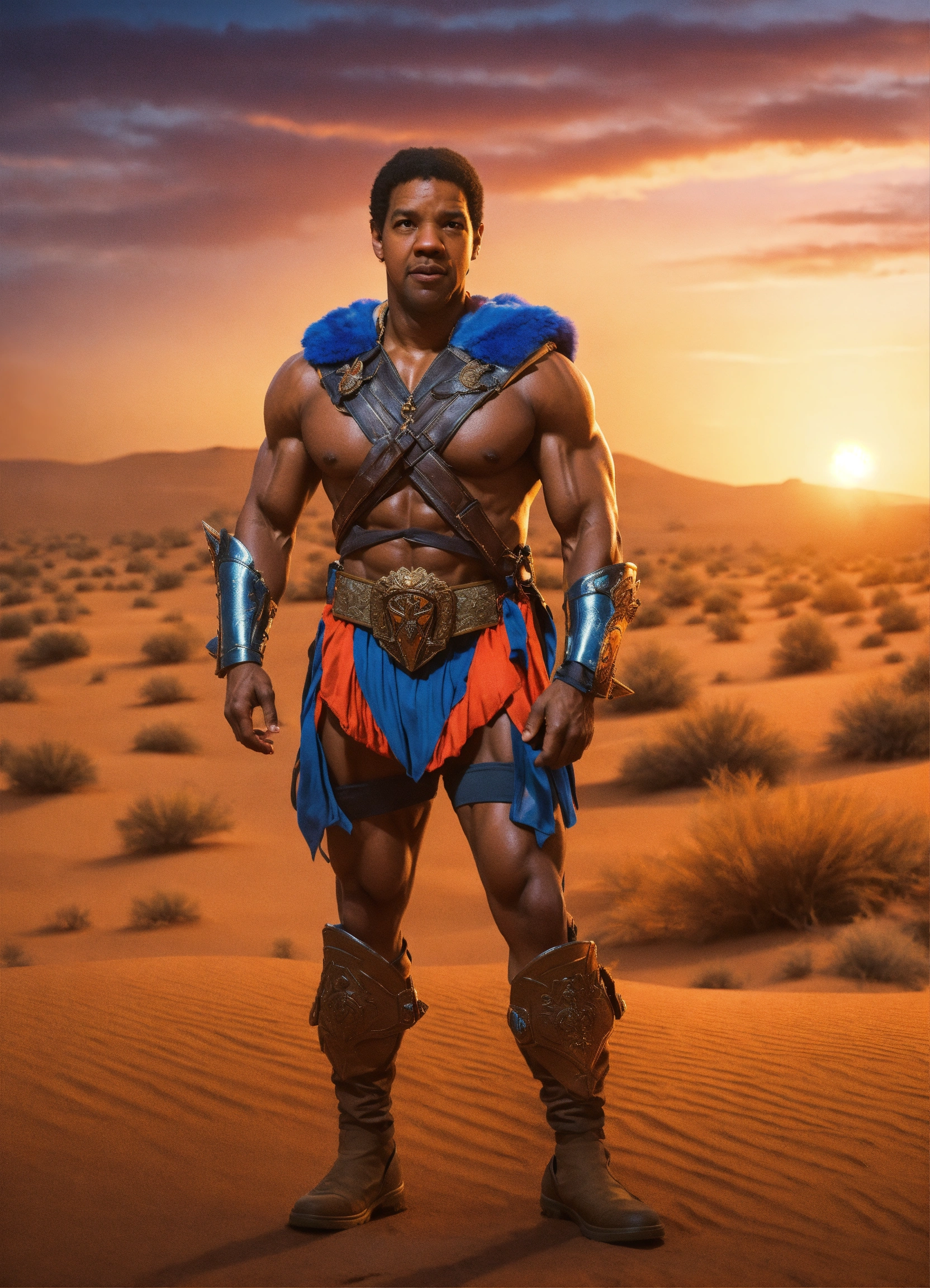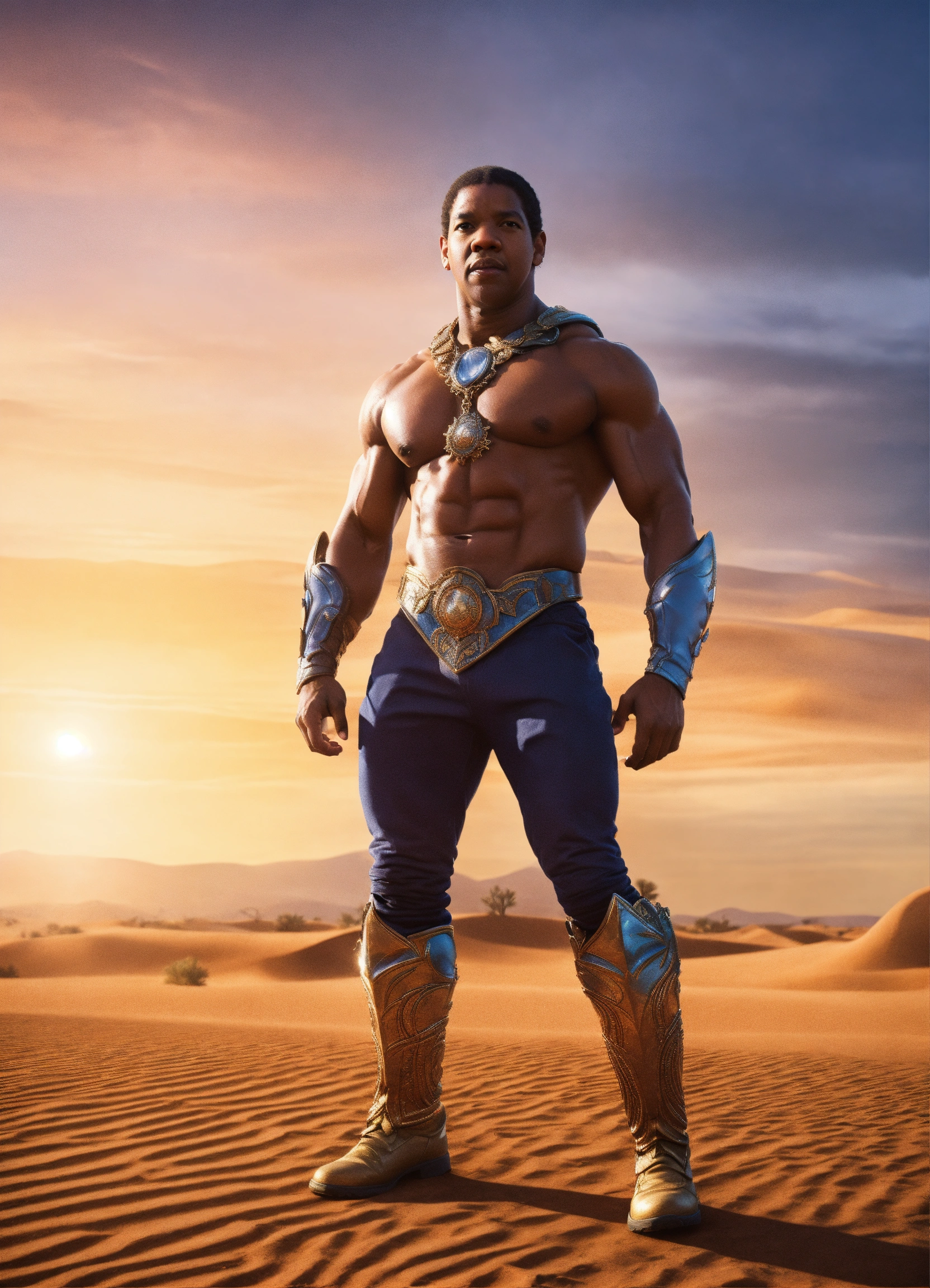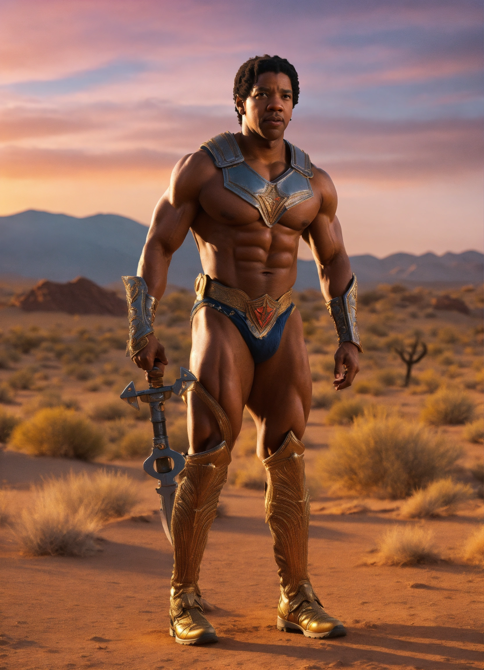 Young denzel washington with body building physique, playing clamp champ of masters of the universe in a movie, dressed like clamp champ of masters of the universe, full body, camera look, walking in a desert on sunset, 8k resolution, photorealistic, hard light photo, hyper detailed, intricately detailed, epic shot