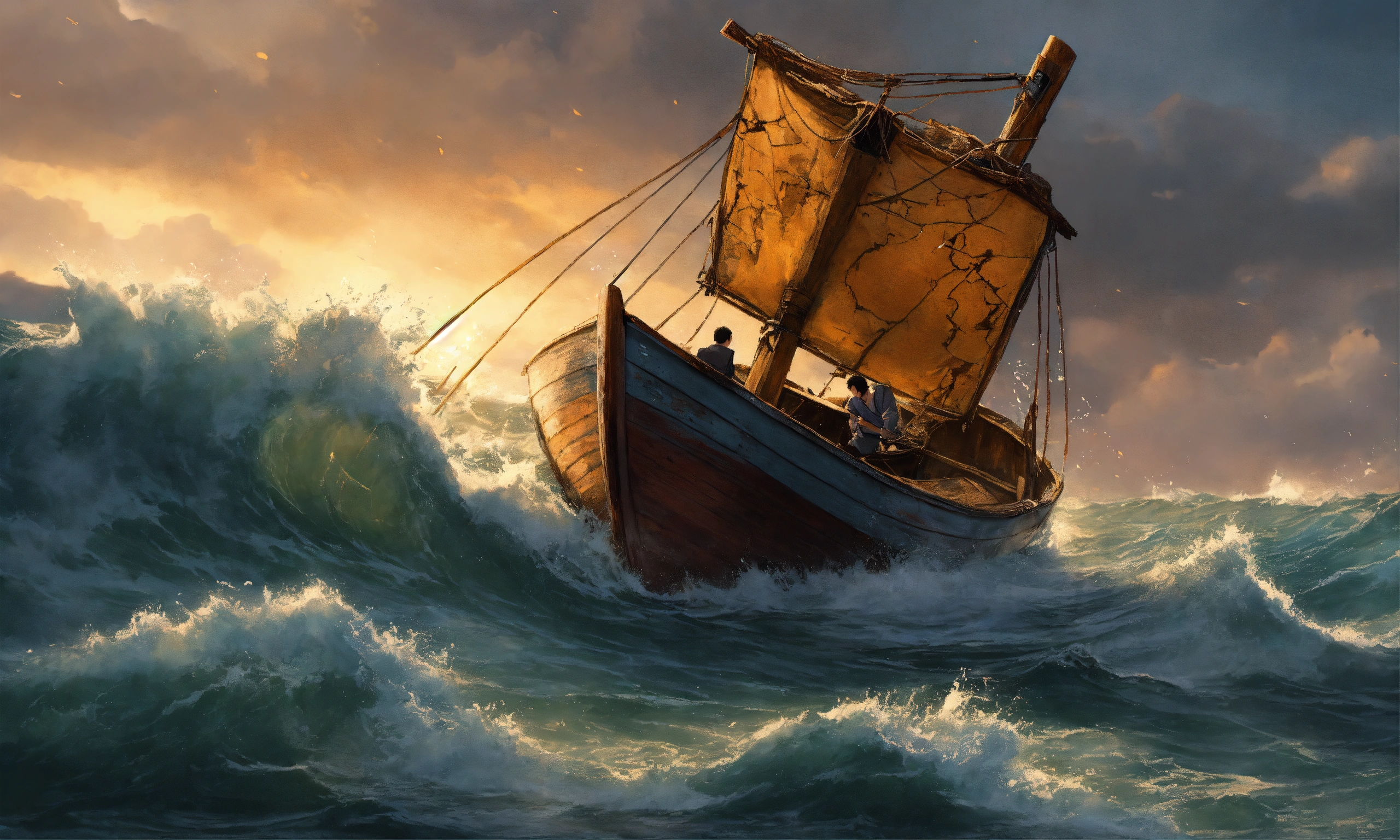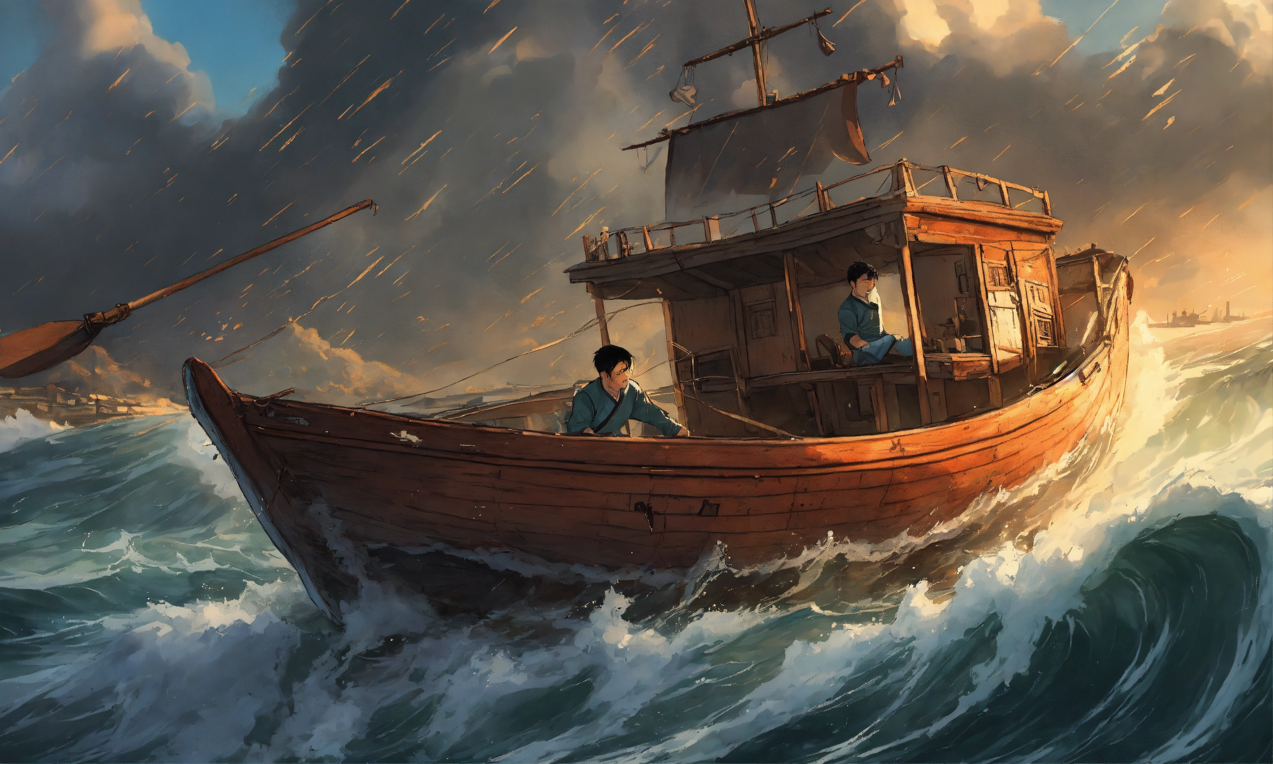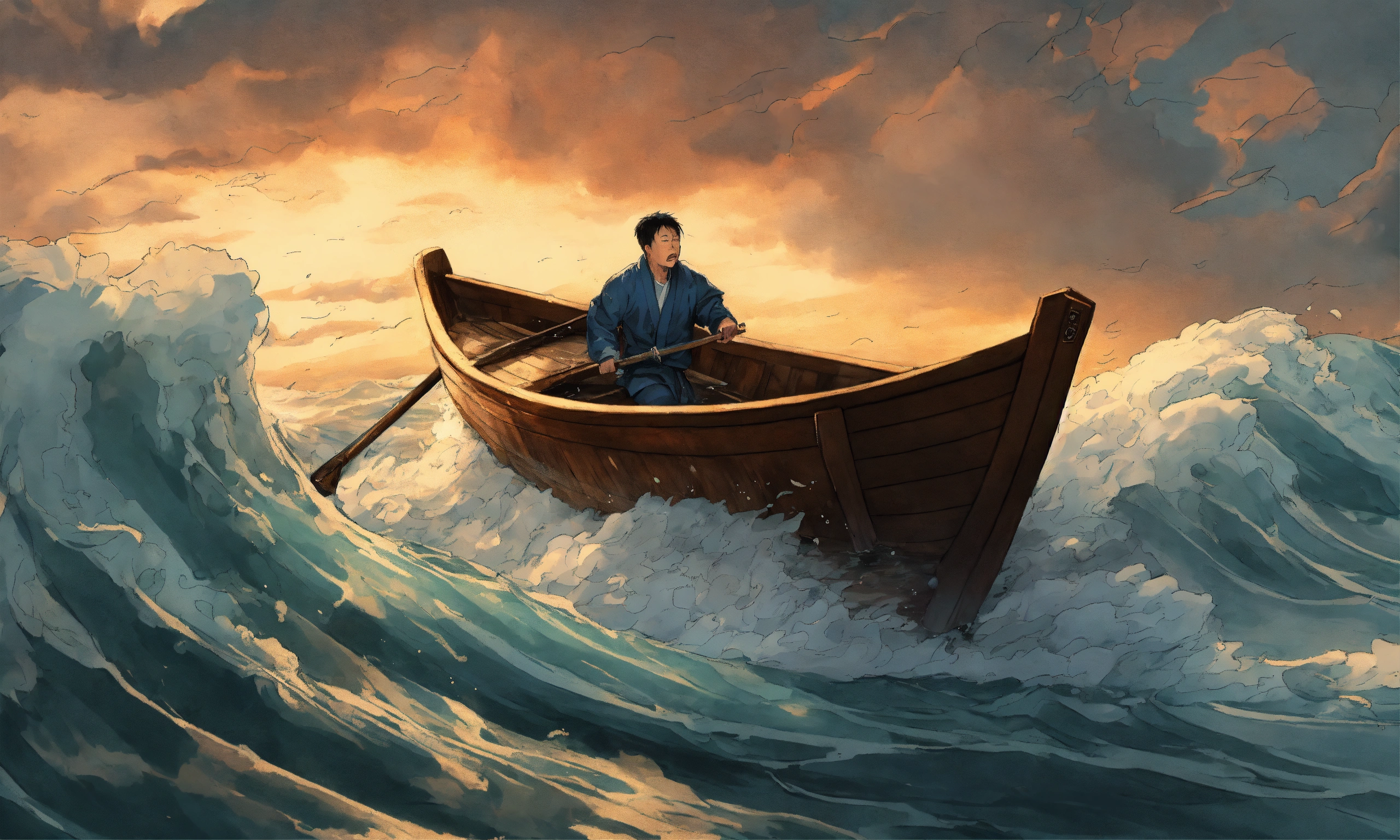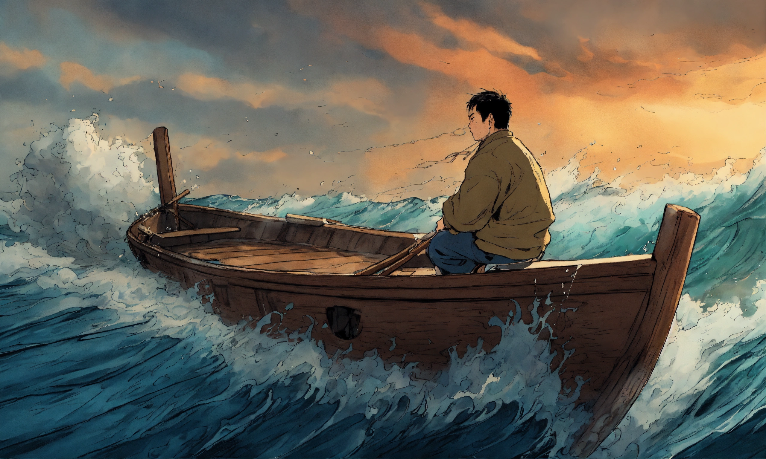 Draw me a picture in the form of a comic book of a broken boat, water gets into the boat because it is full of holes, an angry man in the image of jet li is rowing on the raging waves, the weather is cloudy, the character’s emotions should be clearly visible, realistically