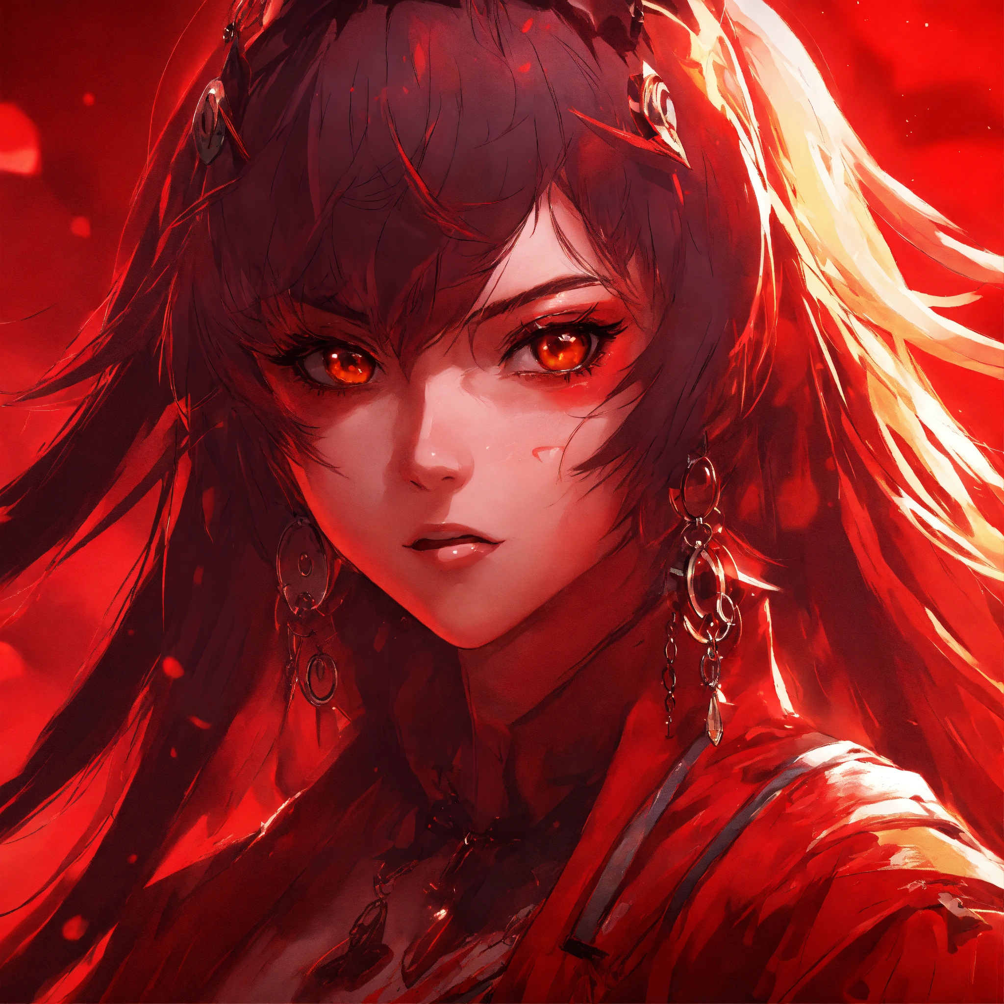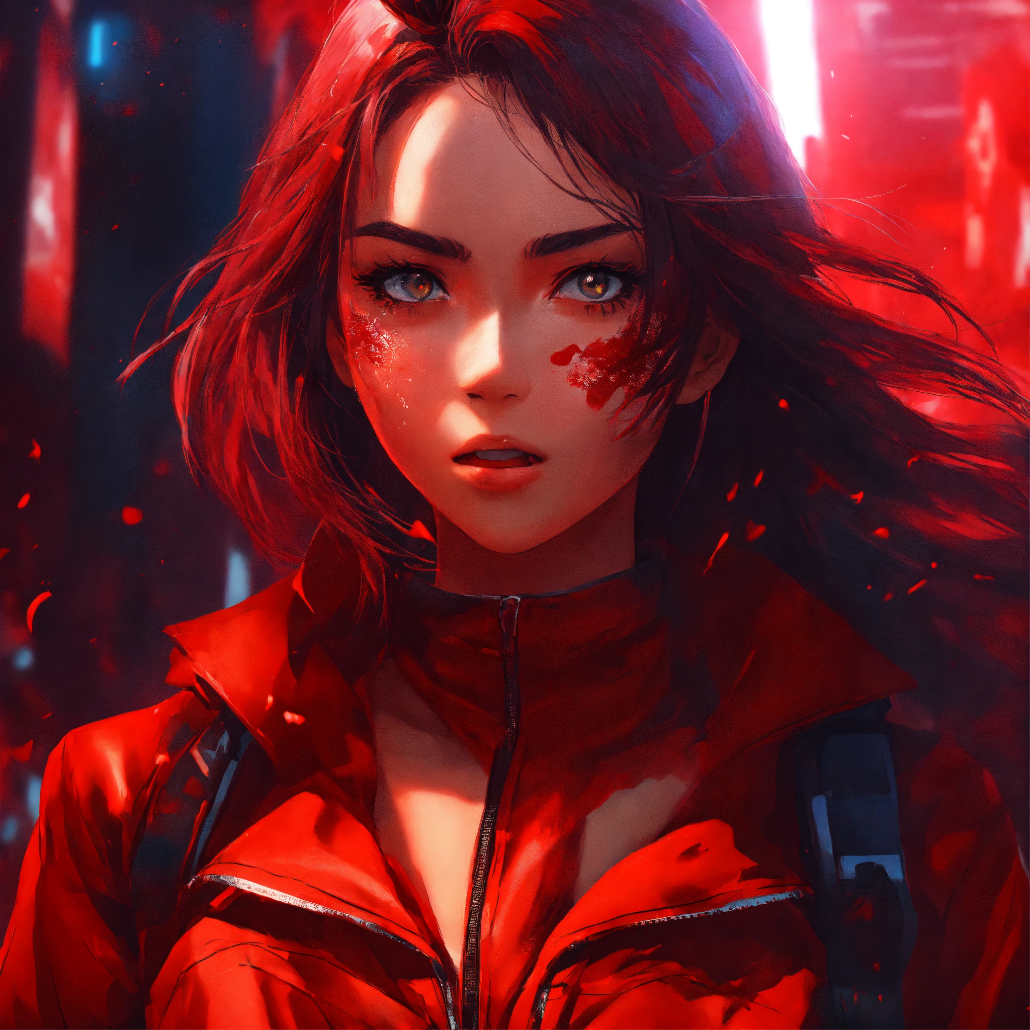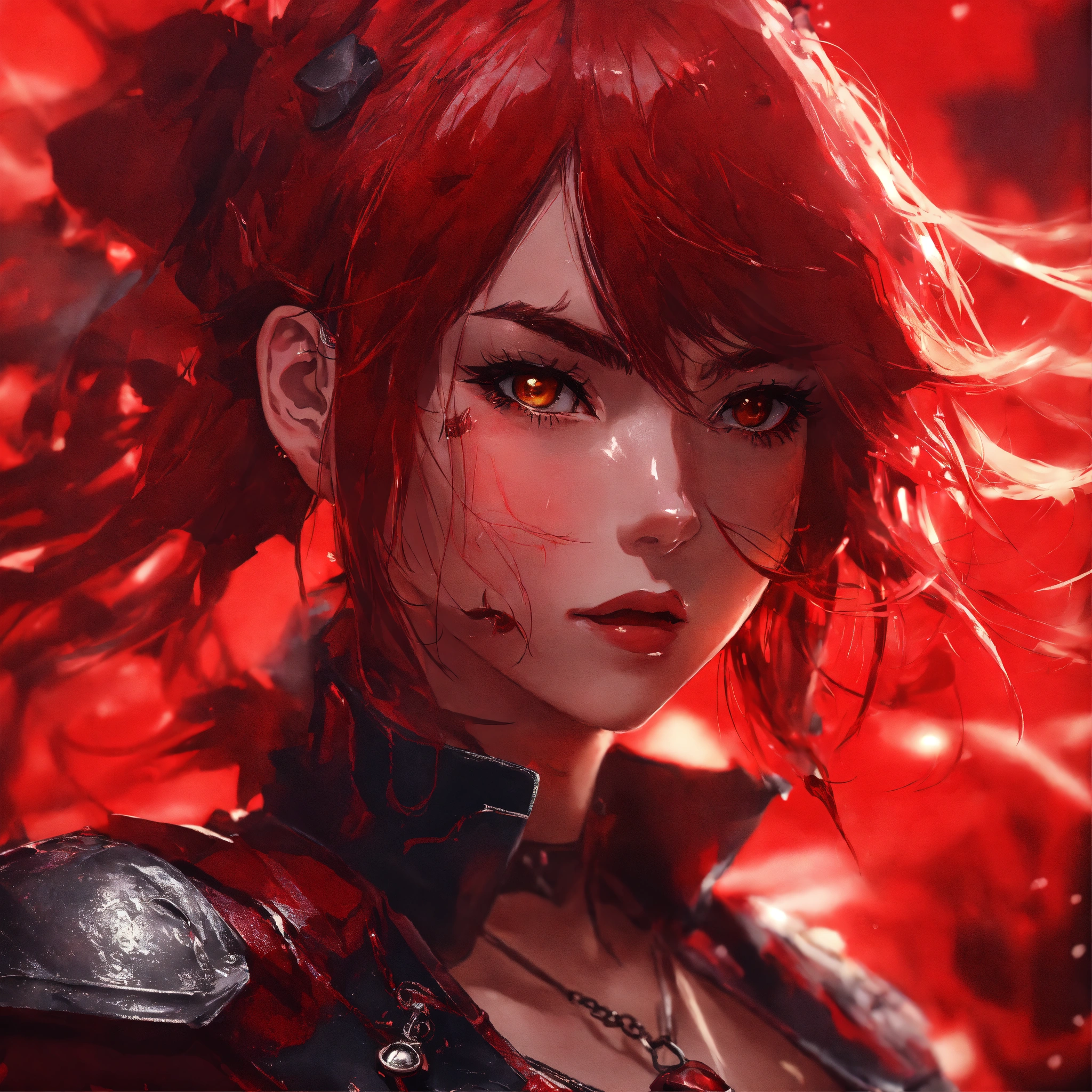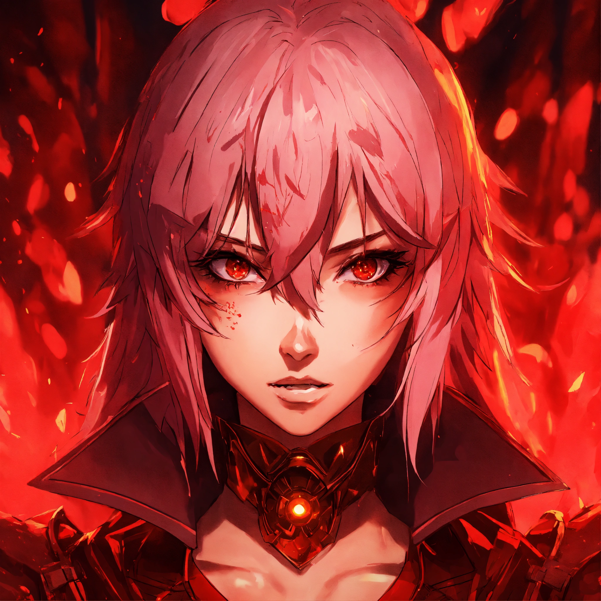 Generate a crazy anime villain girl, red background, war scenary, crazy face, suspense light, higly detailed, 4k