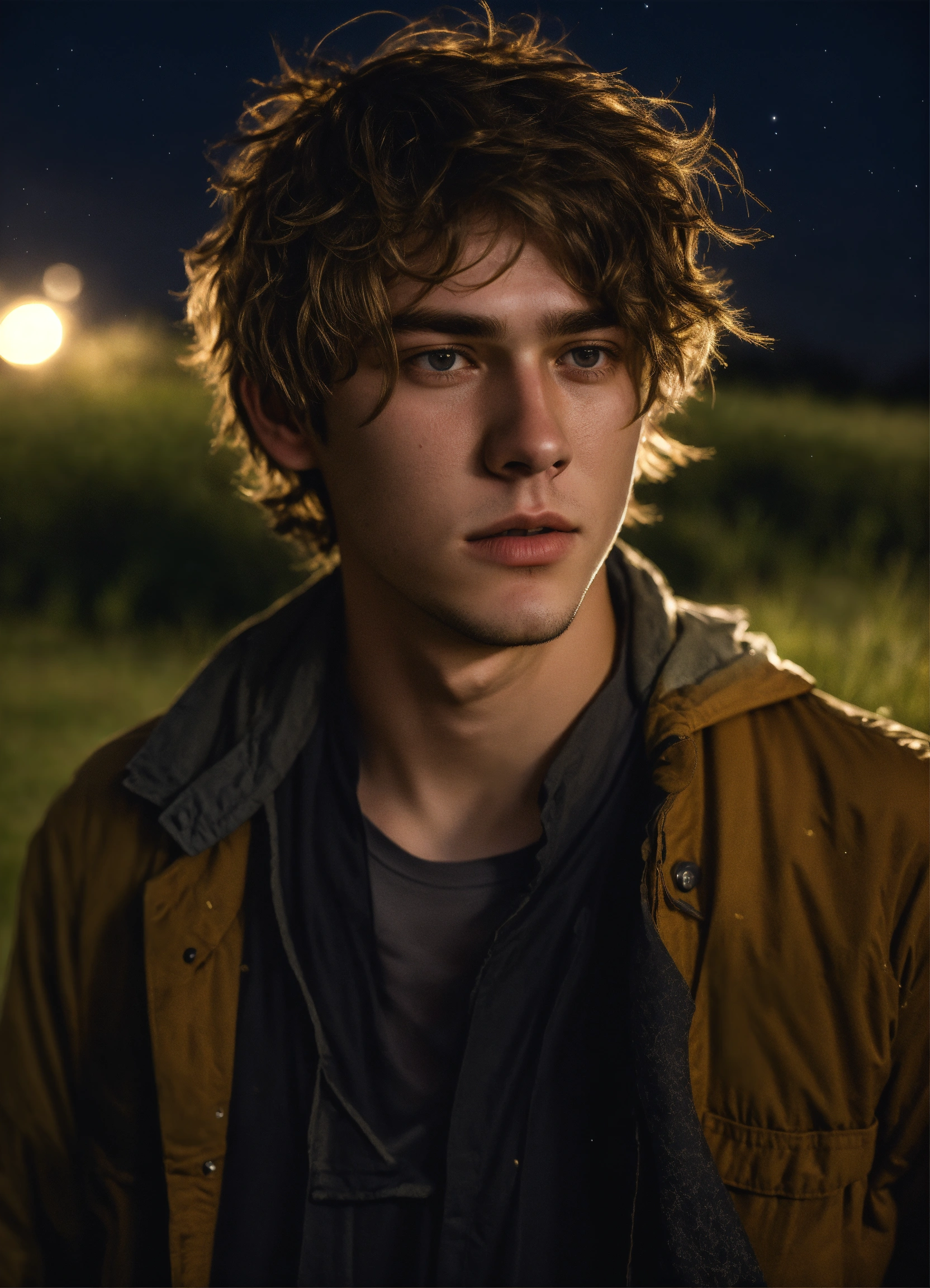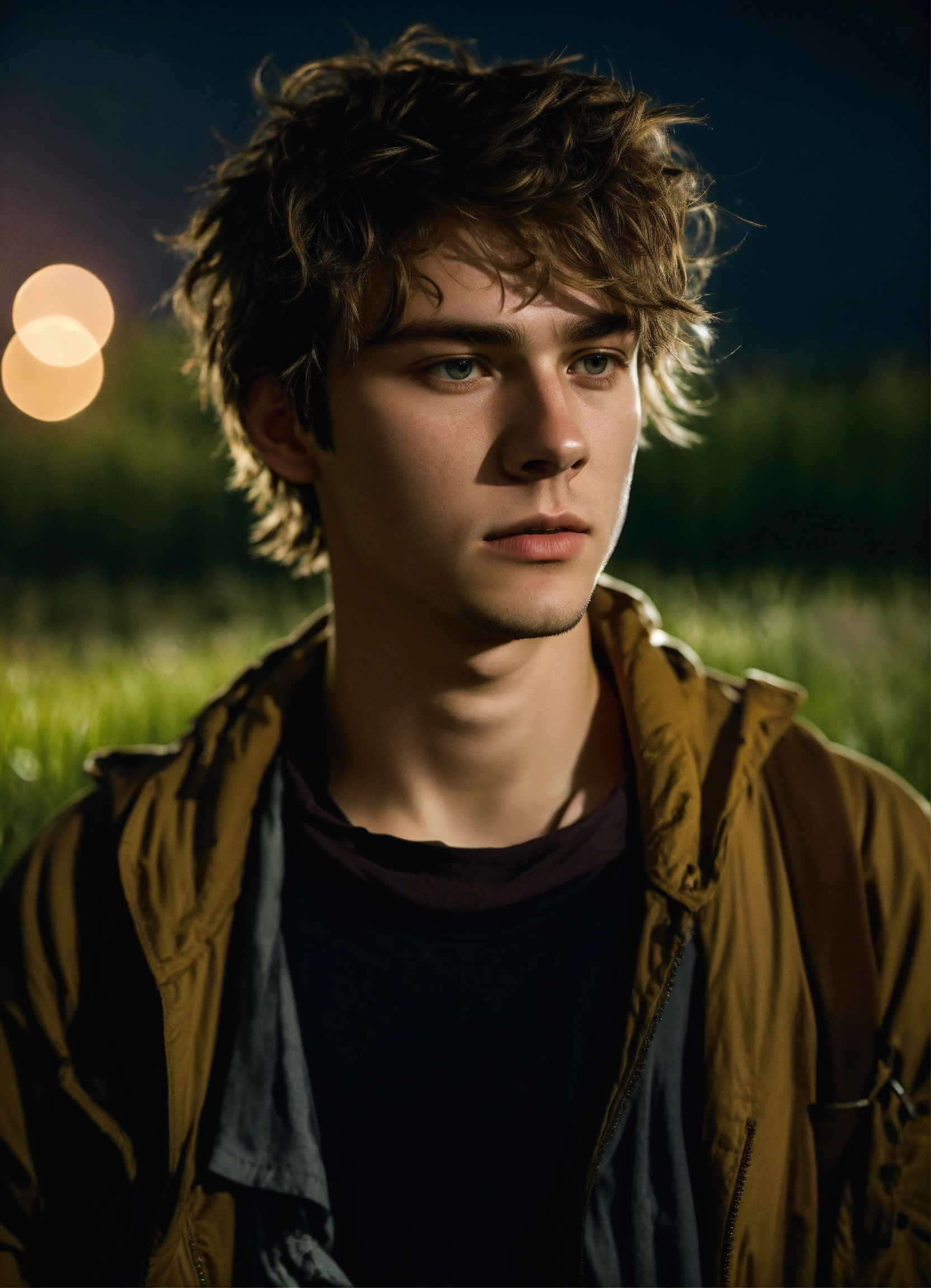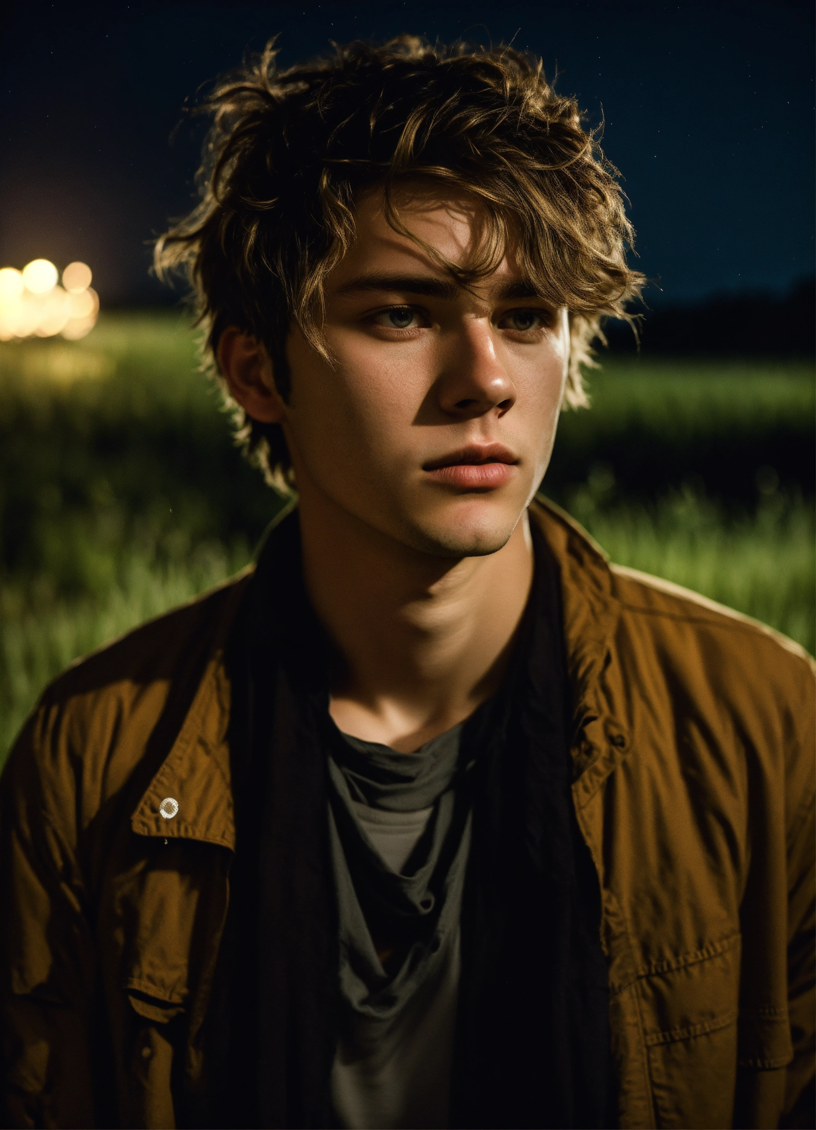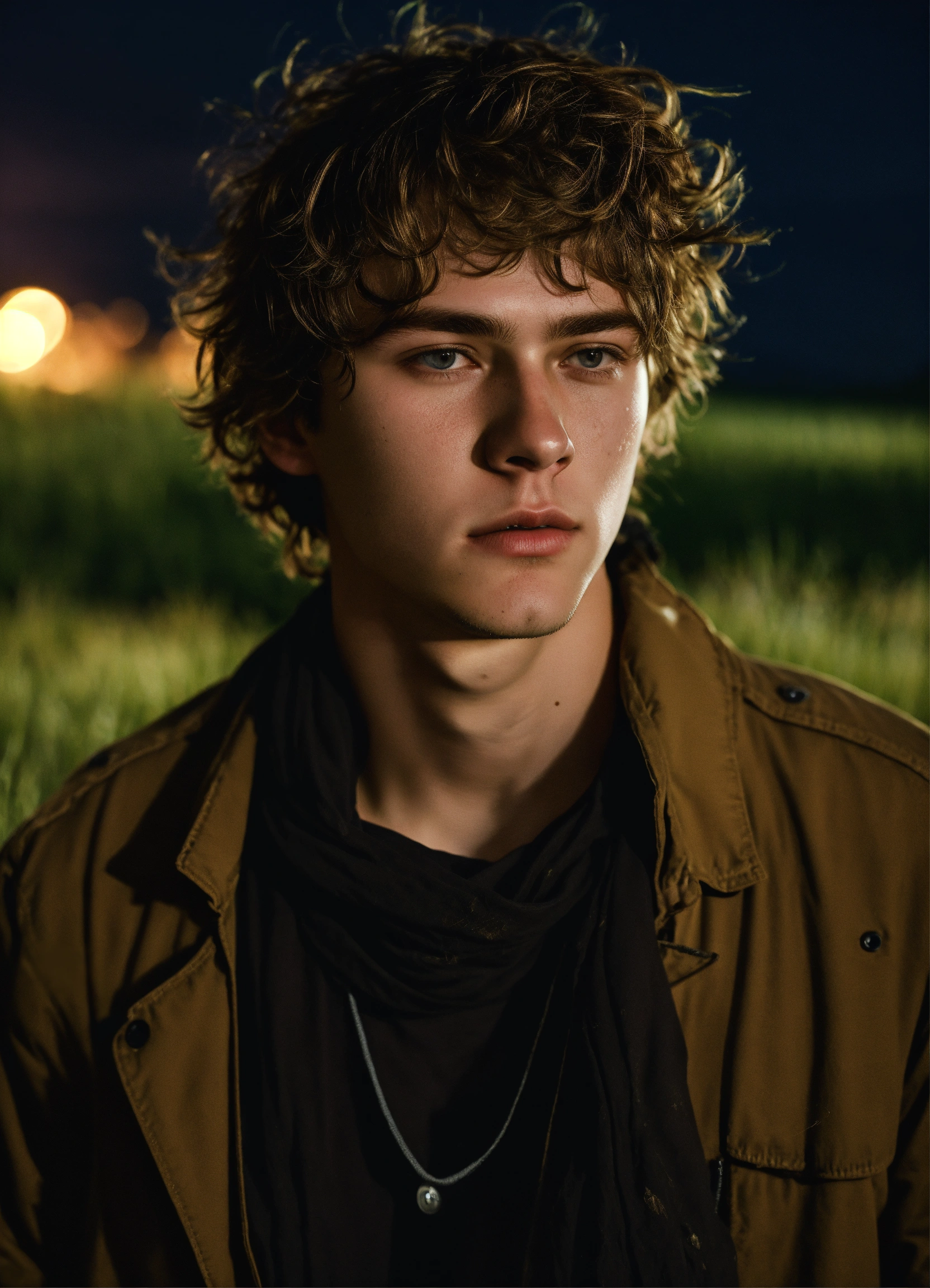 A highly realistic night dark photograph of a white 21 years old boy, with dirty face, thin lips, dark blonde hair, slanted brown eyes, messy hair, white skin, sad expression, strong body, wearing black t-shirt with a scarf and a jacket, in a meadow at night, romantic aura, in the background, hyperrealistic, hyperdetailed, 4k