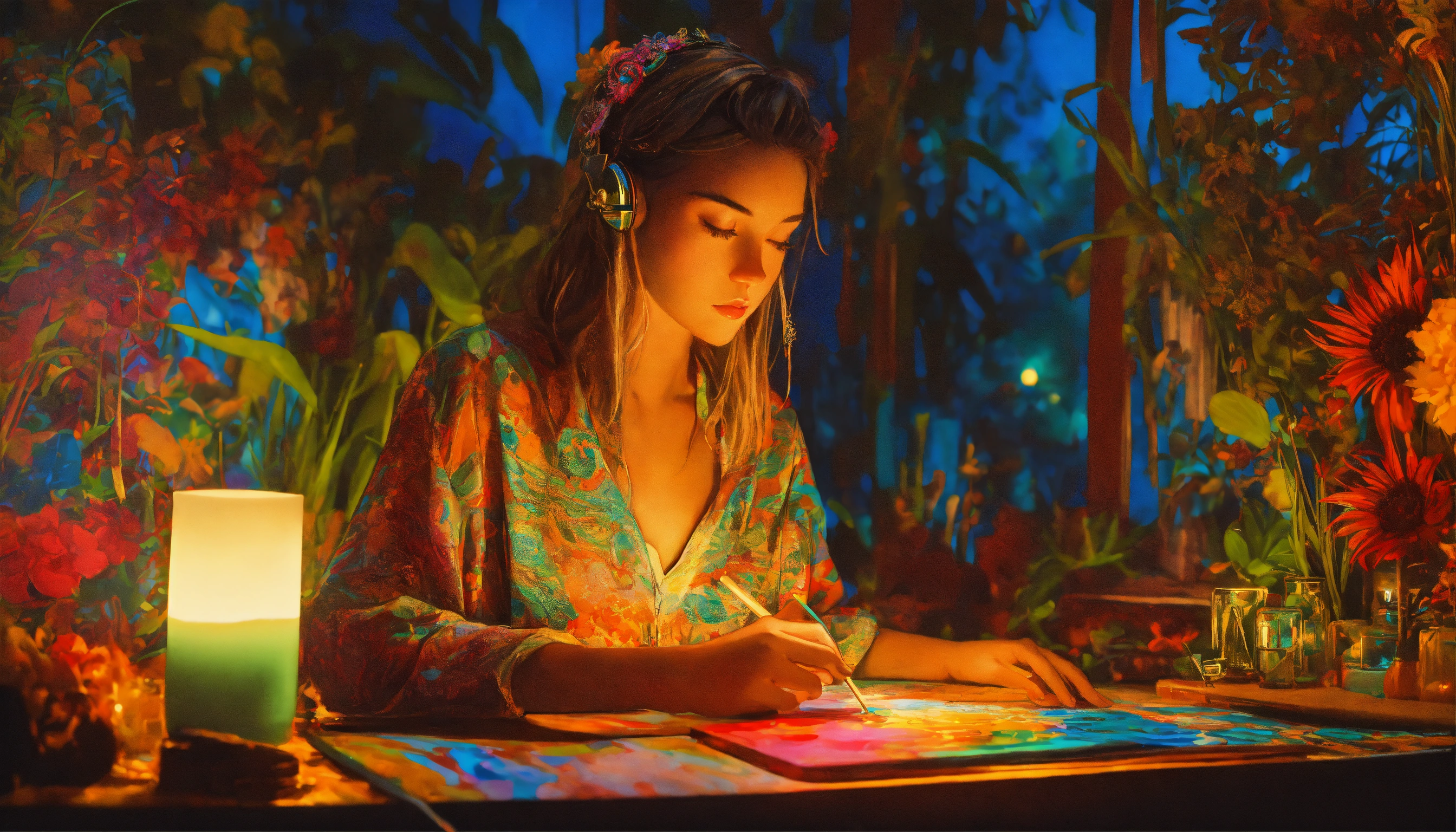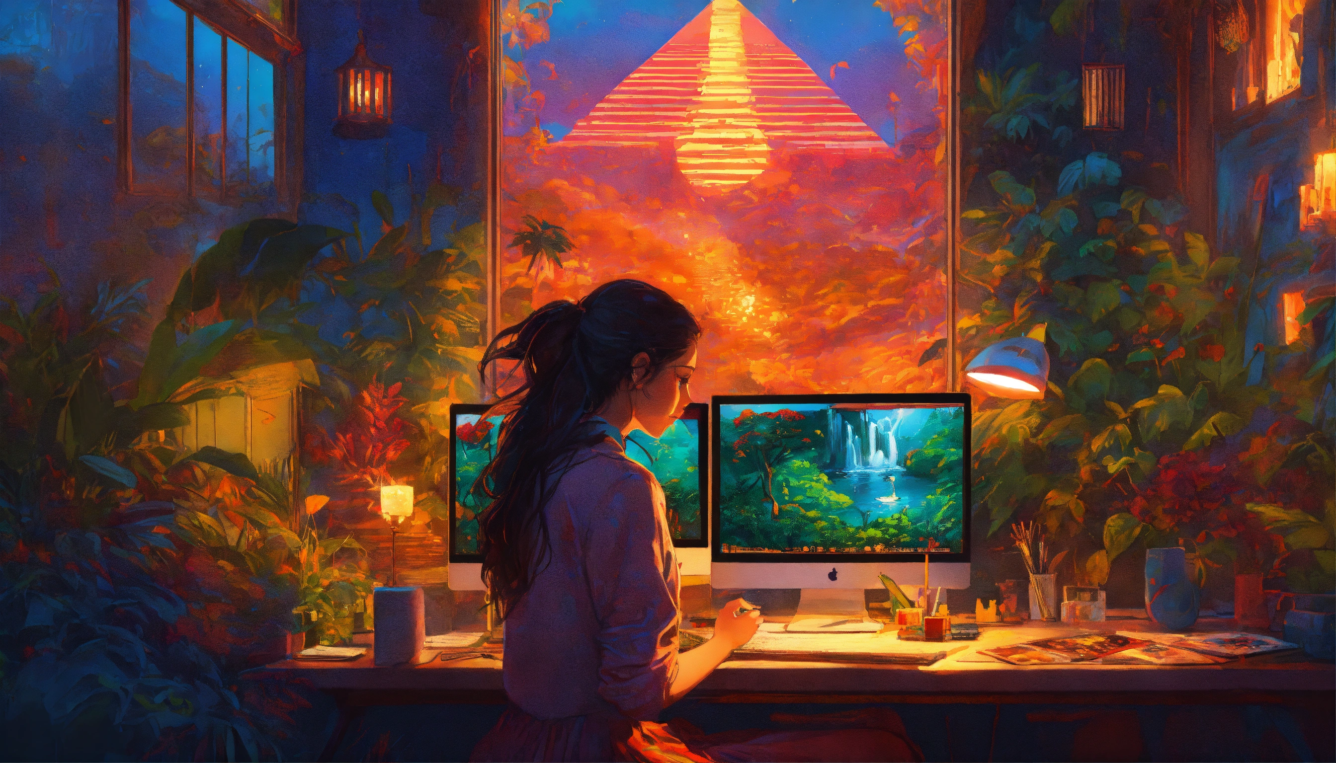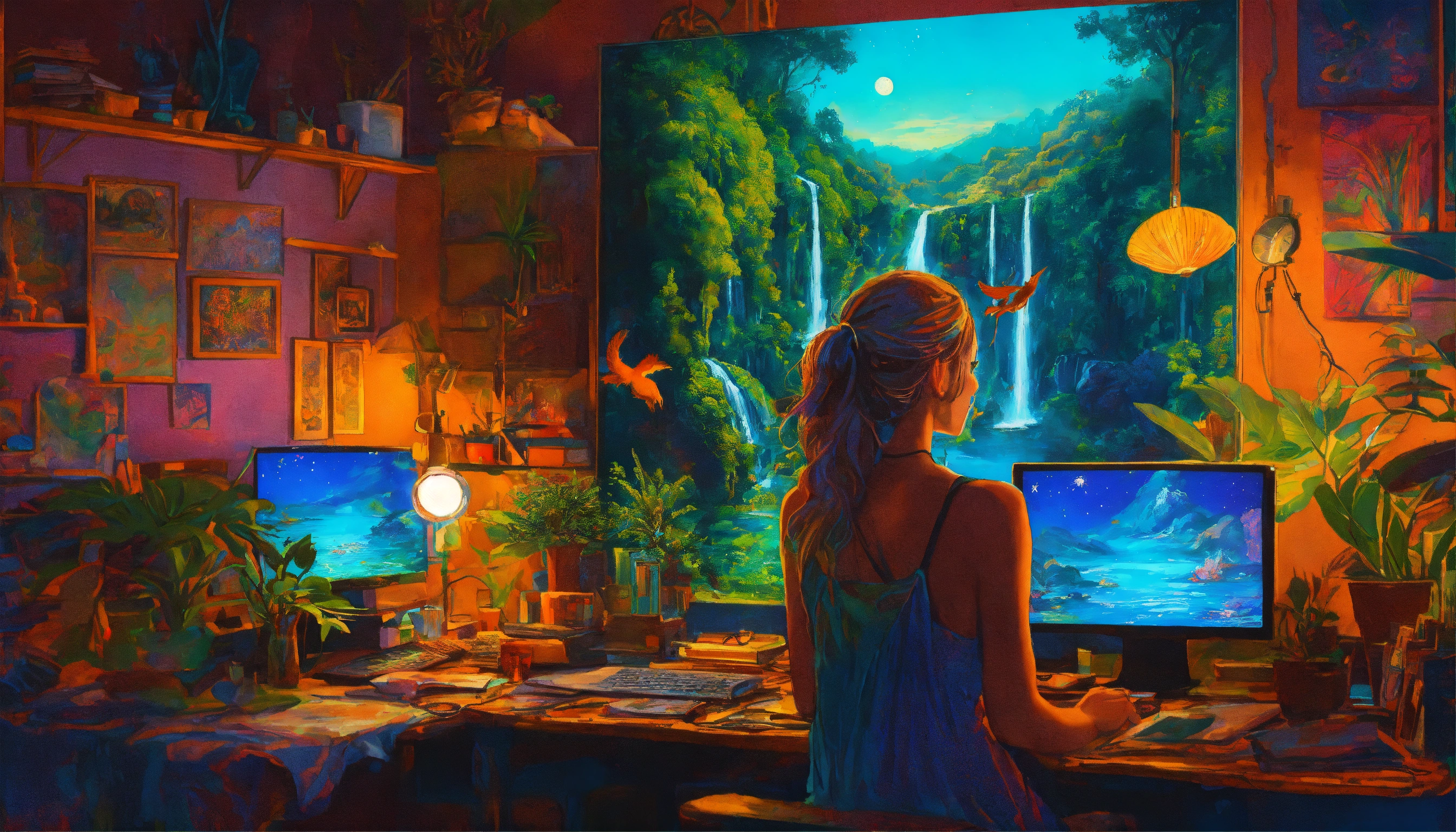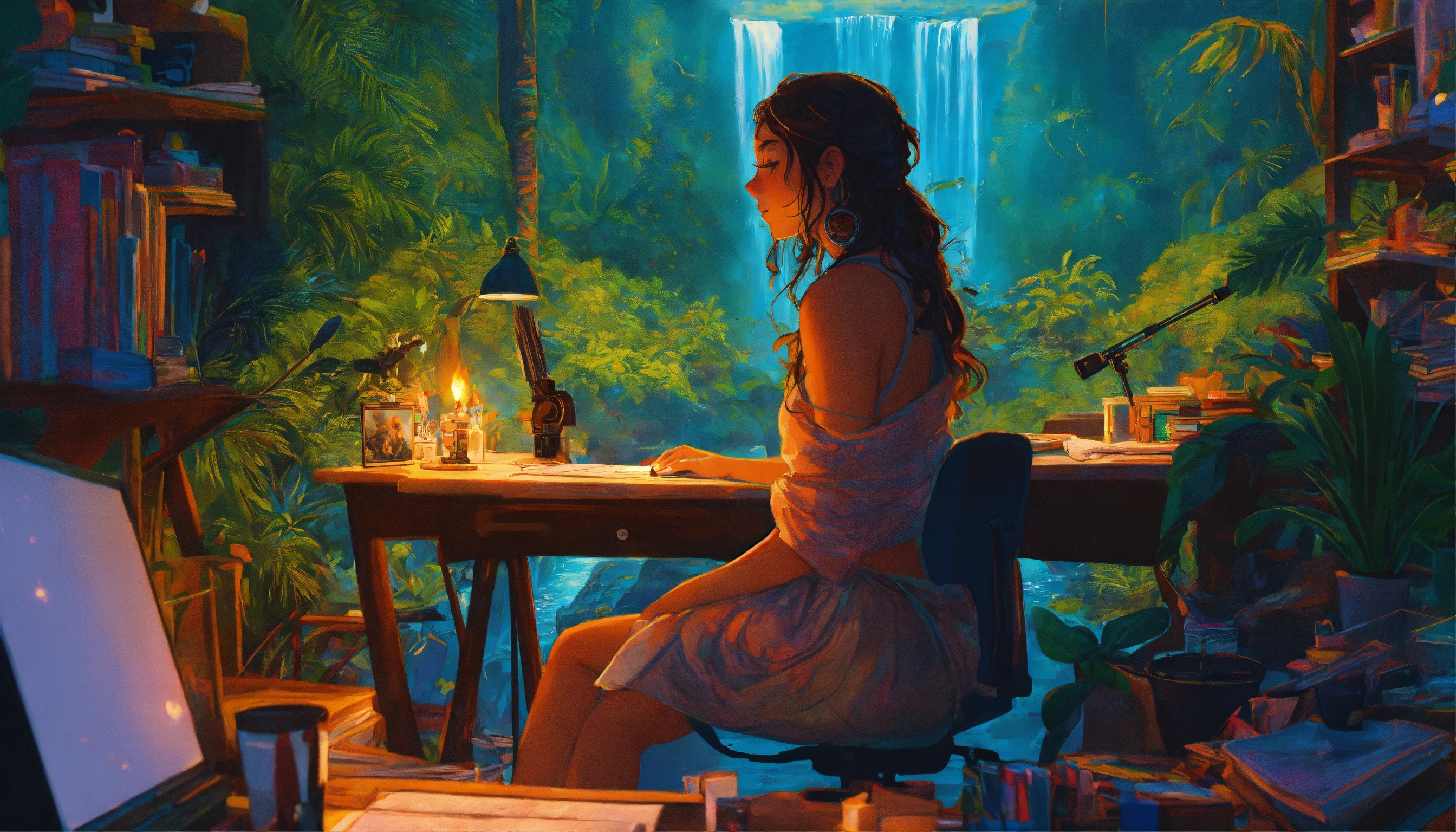 Young woman at her desk at midnight in front of her computer, candle lit, dreaming of a lush aztec jungle landscape with a waterfall and wild animals, art by victor moscoso and bridget riley girl make it magical by carne griffiths fluid art, conrad roset ilya kuvshinov, mark fielding, tim burton, zwy studio high lights in eyes, salt, ultra detailed, cinematic