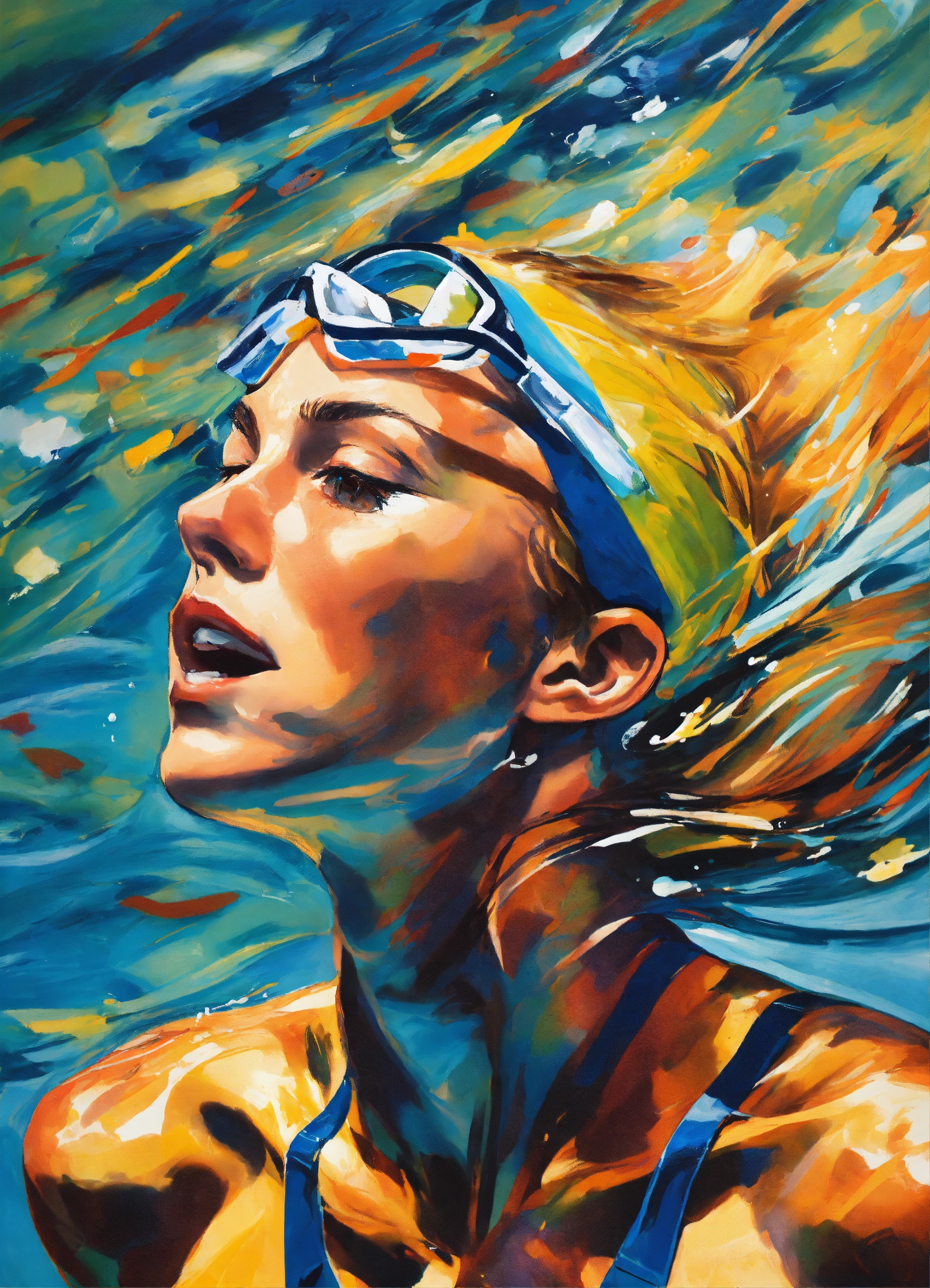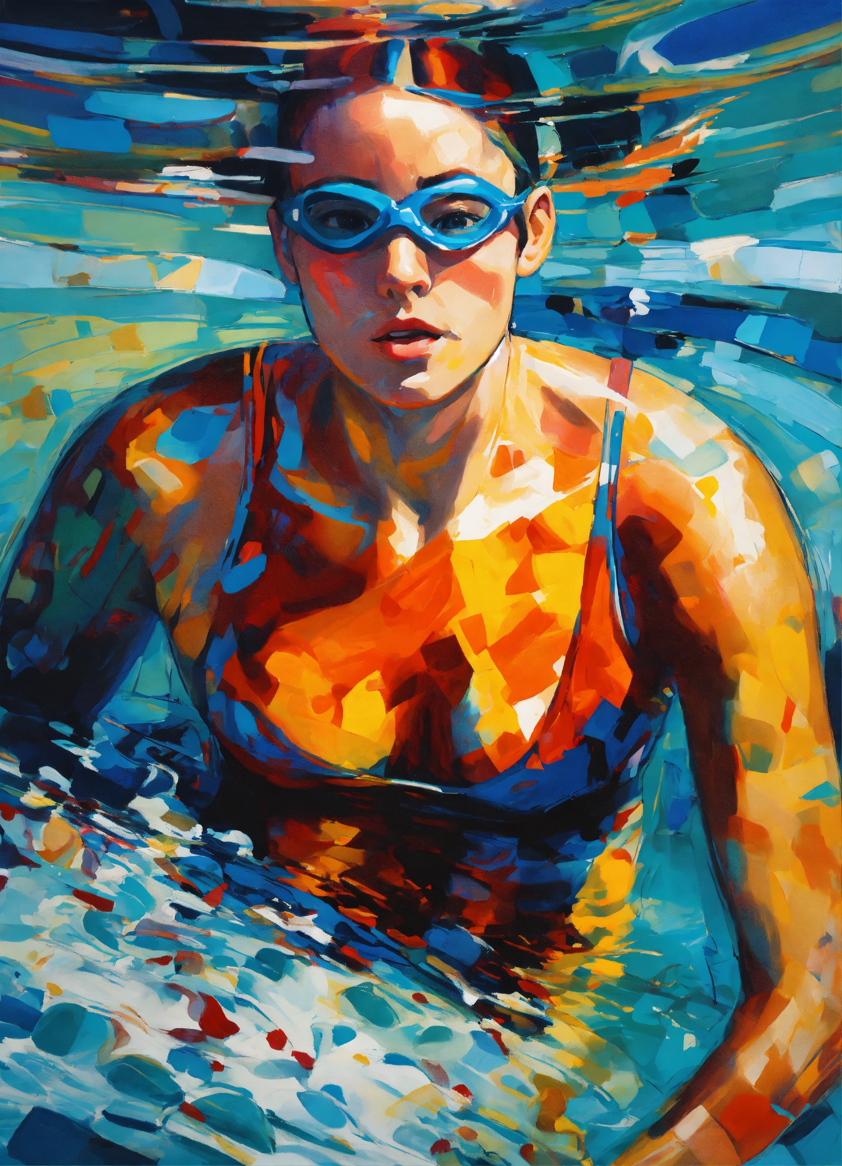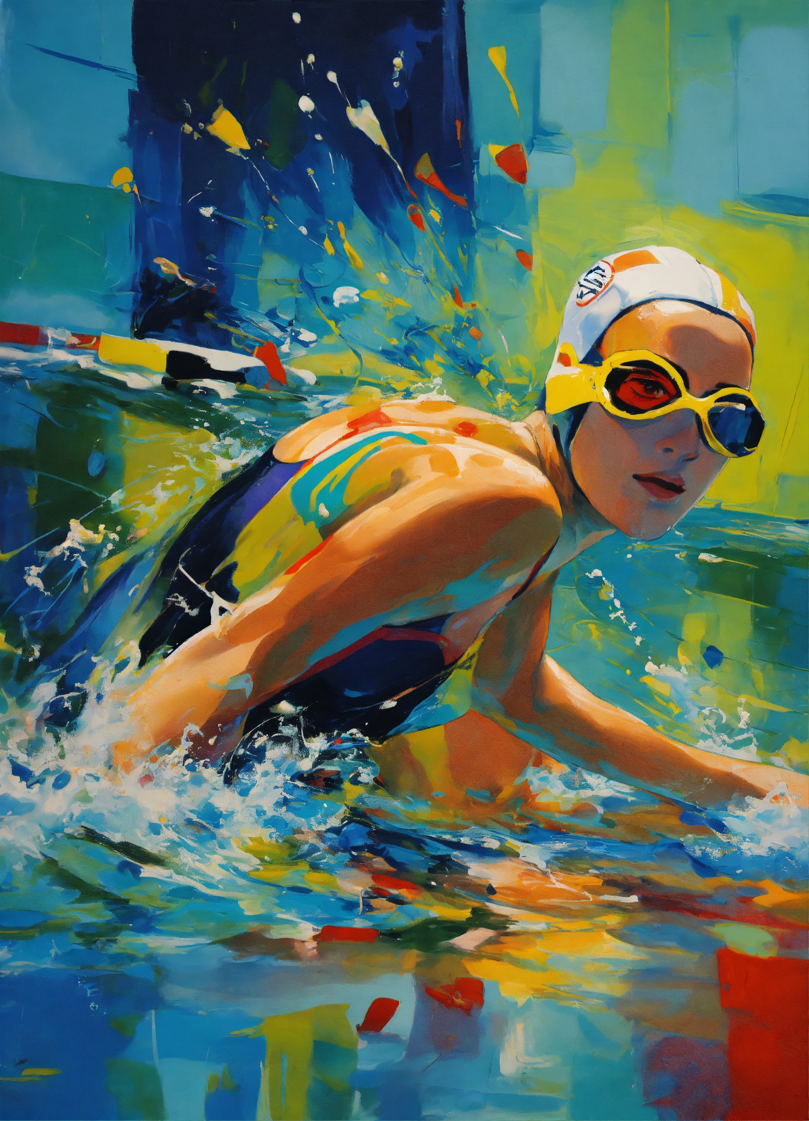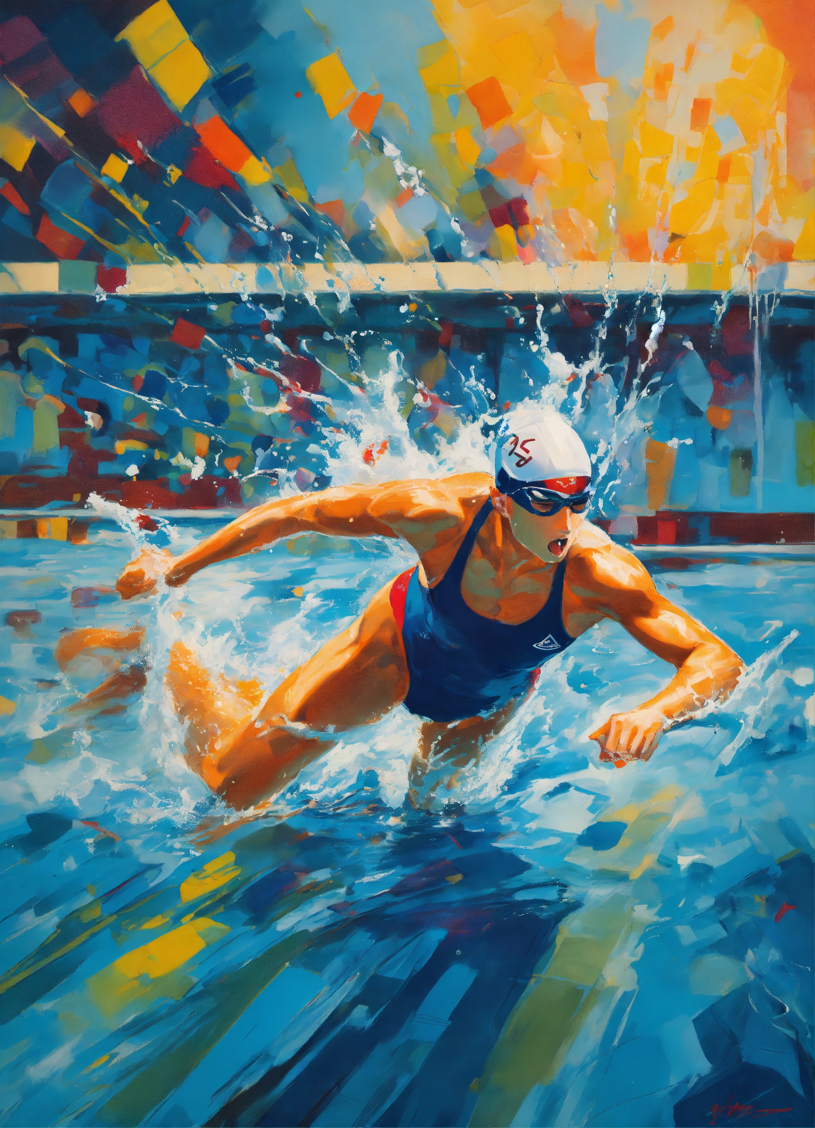 In a neo-expressionist style, a professional swimmer takes to the pool, infusing the surroundings with vibrant energy. bold, vivid brushstrokes and rich, expressive colors depict the dynamic swim lanes and the swimmer's passion for the sport. as they dive and stroke through the water, the swimming pool becomes a whirlwind of animated strokes, mirroring the swimmer's precision and the exhilaration of their performance. the swimmer's presence in the water infuses the scene with a sense of dedication, excellence, and the thrill of competitive swimming. in the background, the pool's lights cast an intense and emotional glow over the water, creating a warm and profound atmosphere. this neo-expressionist portrayal captures the relentless spirit of professional swimming, celebrating the beauty and power of each stroke as the swimmer surges through the water with unparalleled grace and determination.
