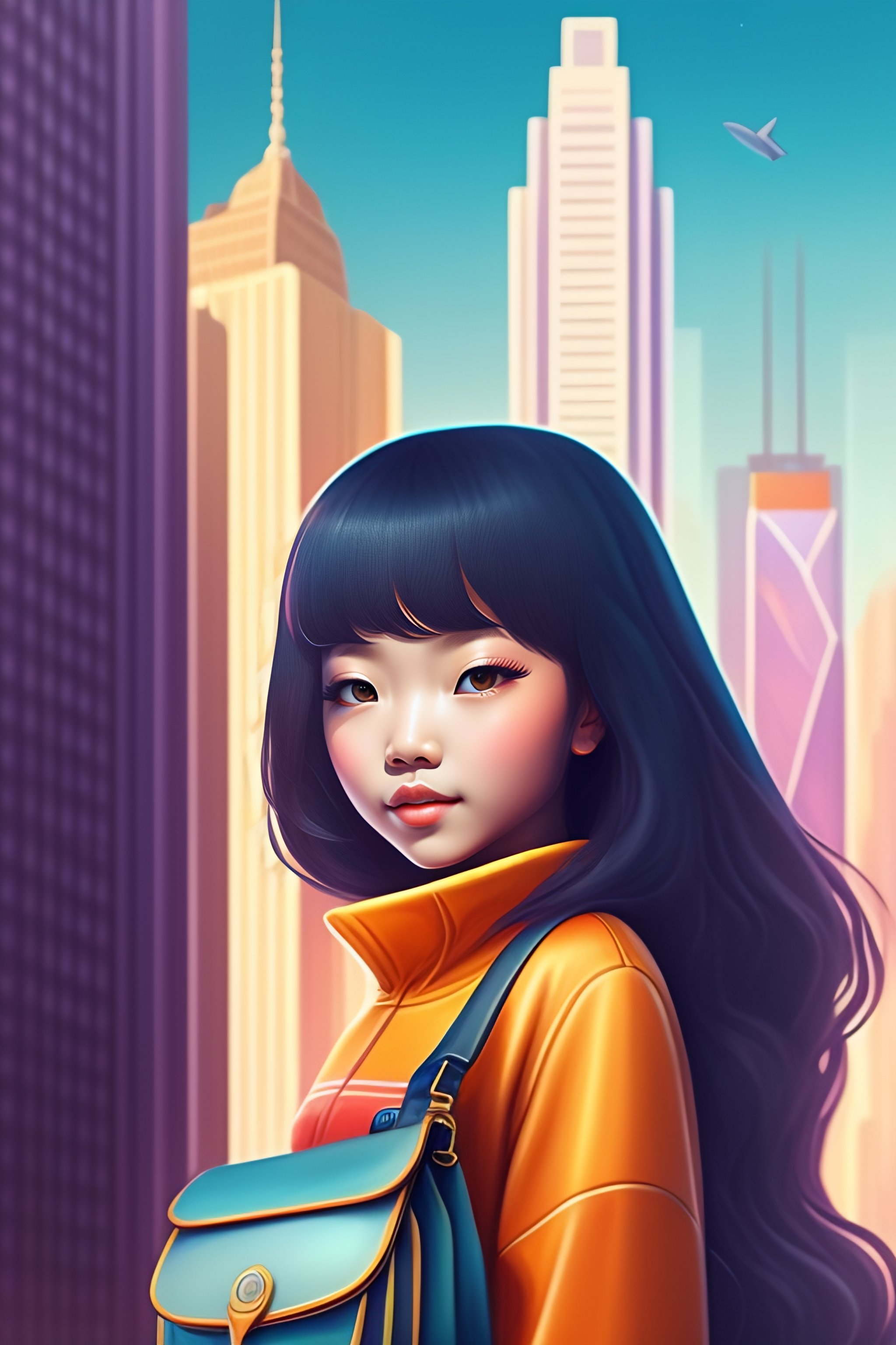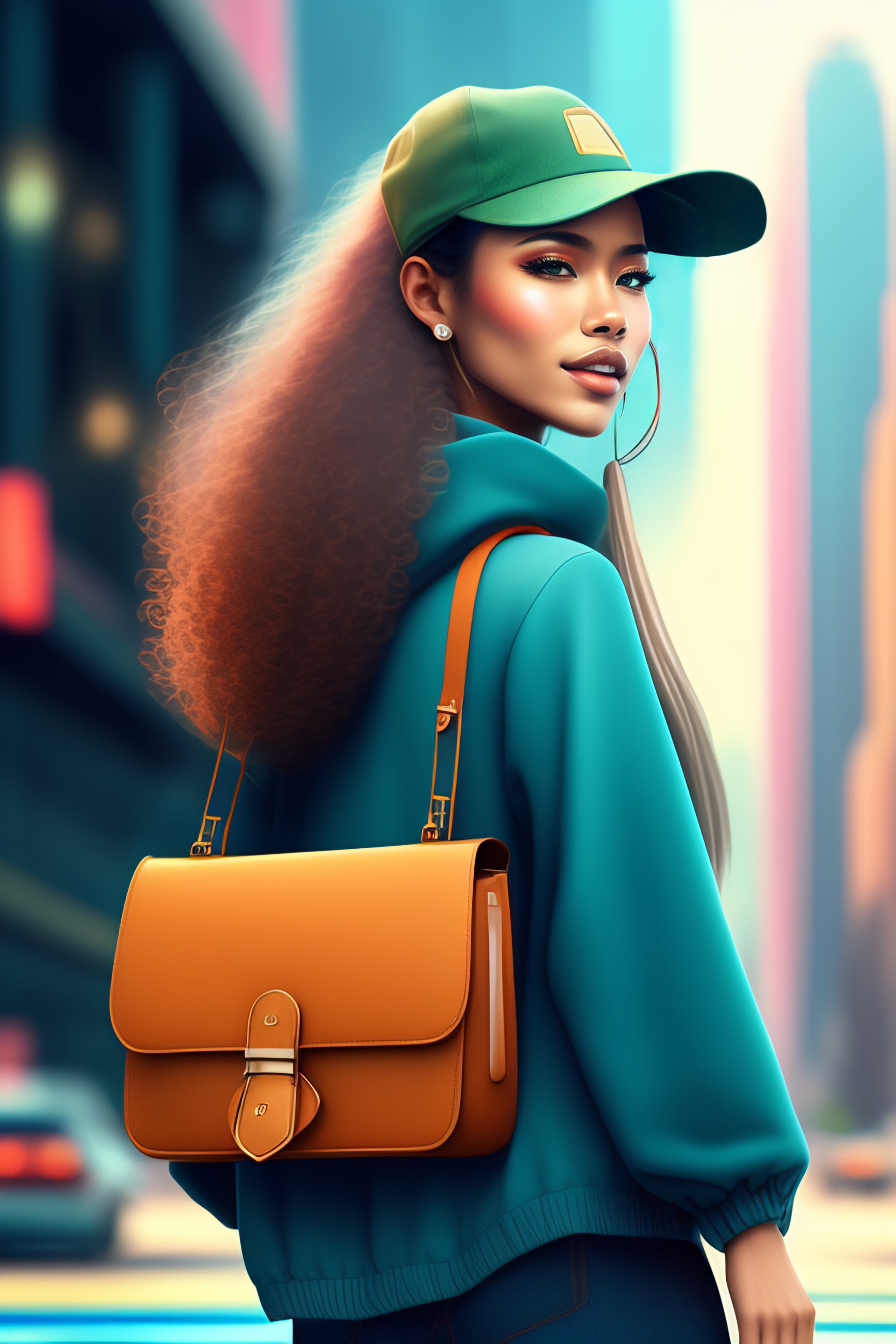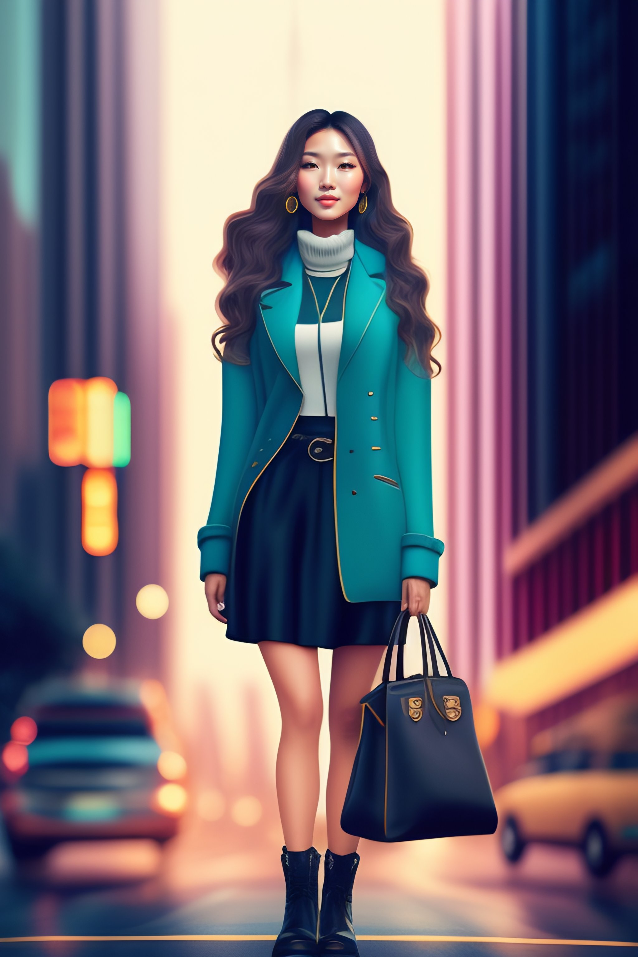 Create an illustration of a humanoid dolphin girl living in a modern city, she is wearing a stylish outfit and carrying a bag, the background should feature tall skyscrapers and busy streets, feel free to include any additional details or accessories you think would enhance the image