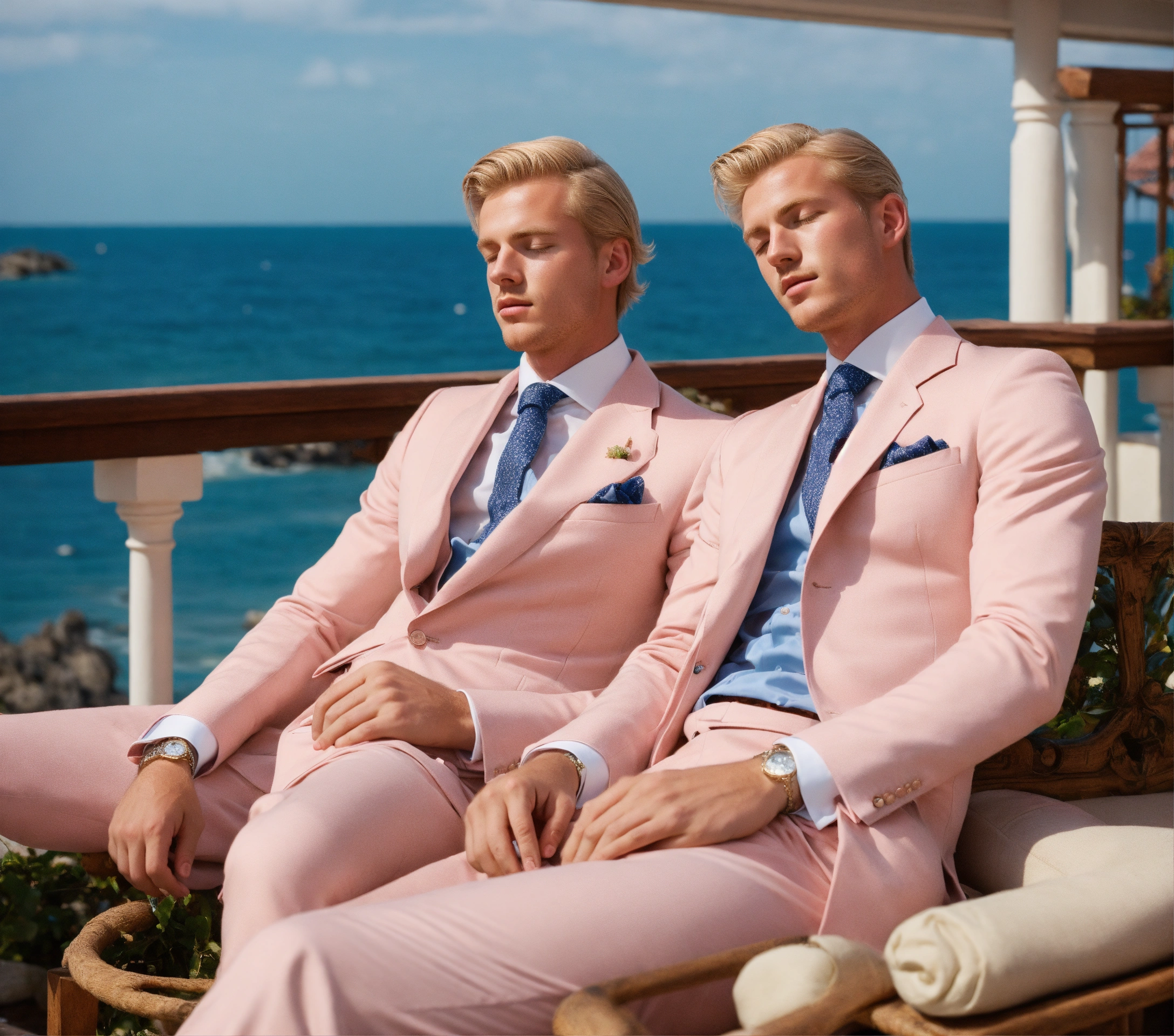 Two young blonde swedish gentlemen in pale pink suit, club tie, blue eyes, pompadour haircut, taking a nap in a villa on the seashore