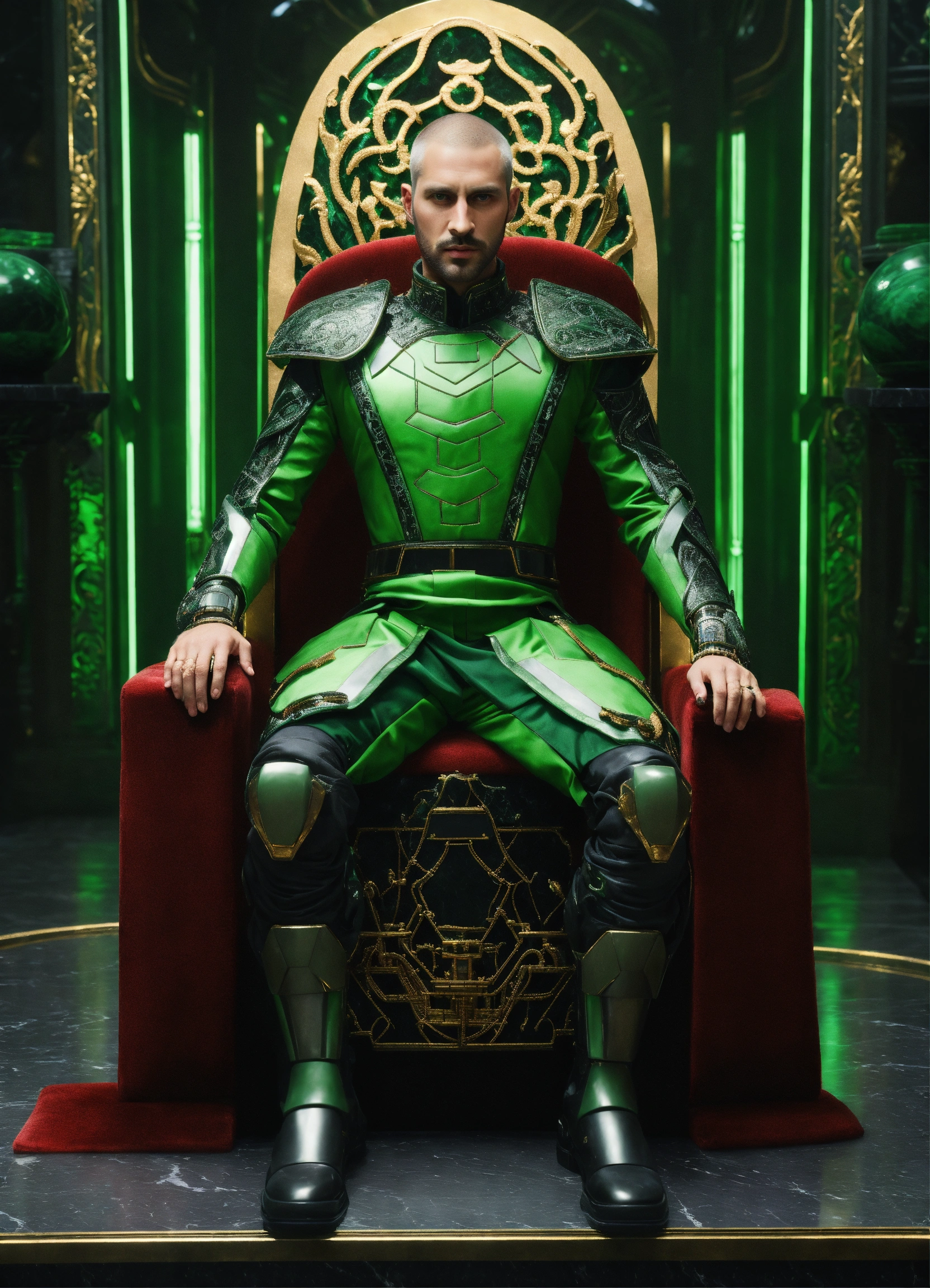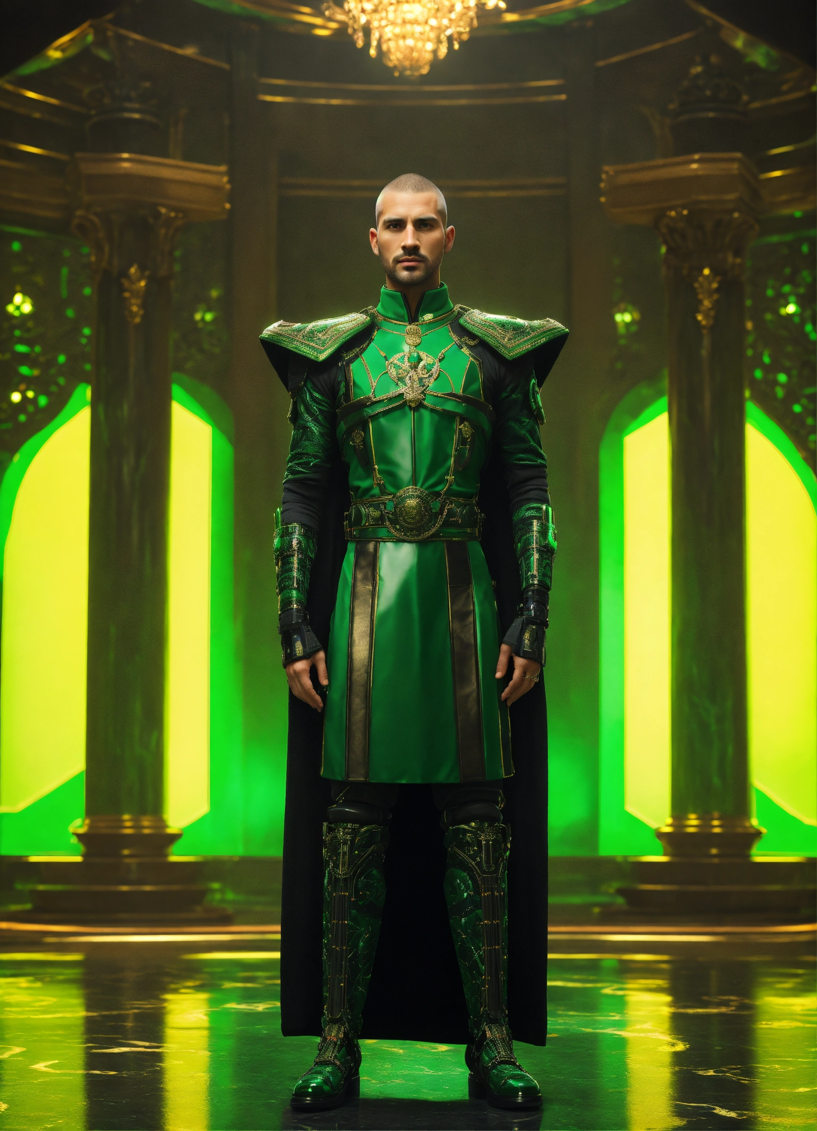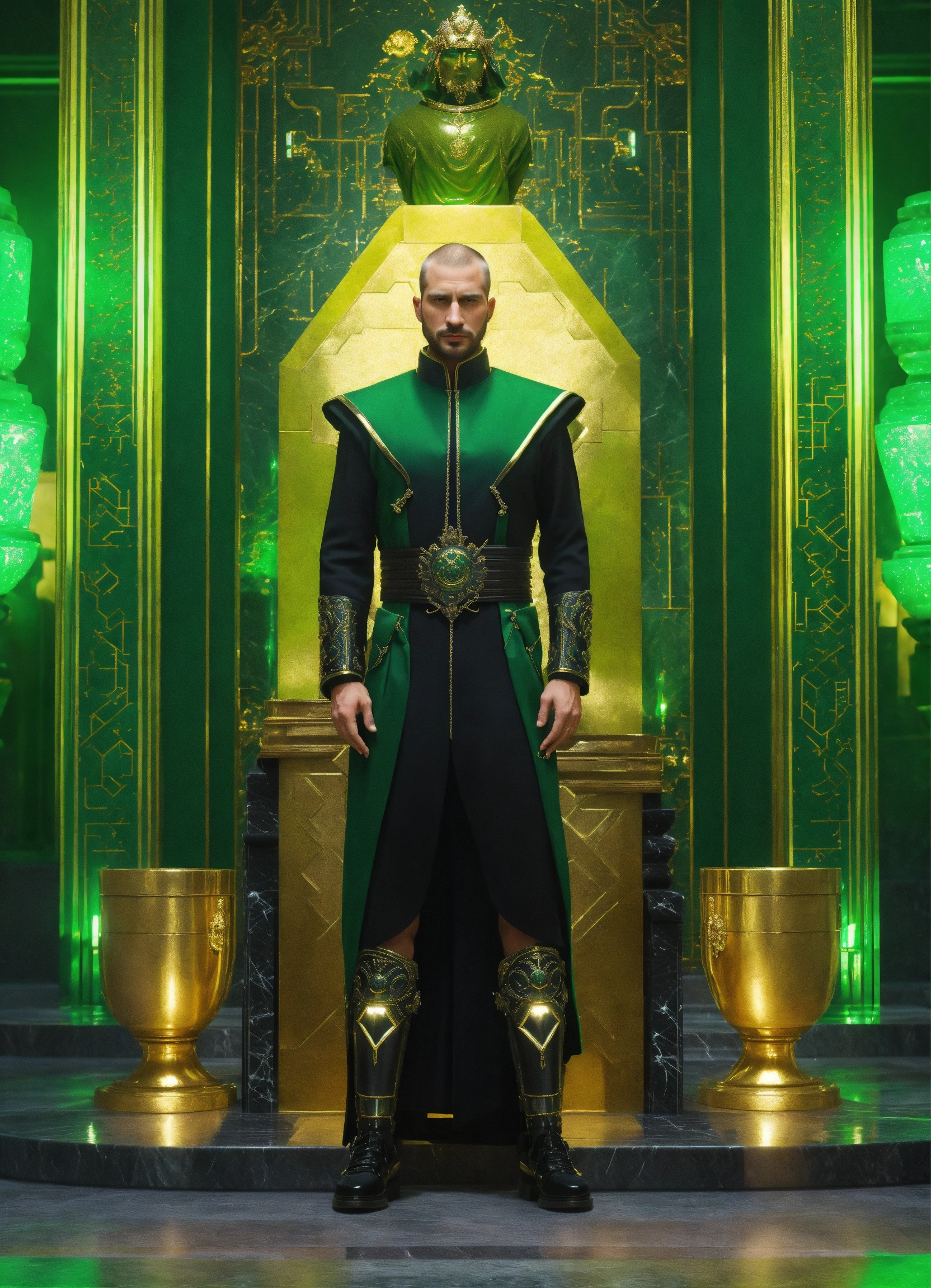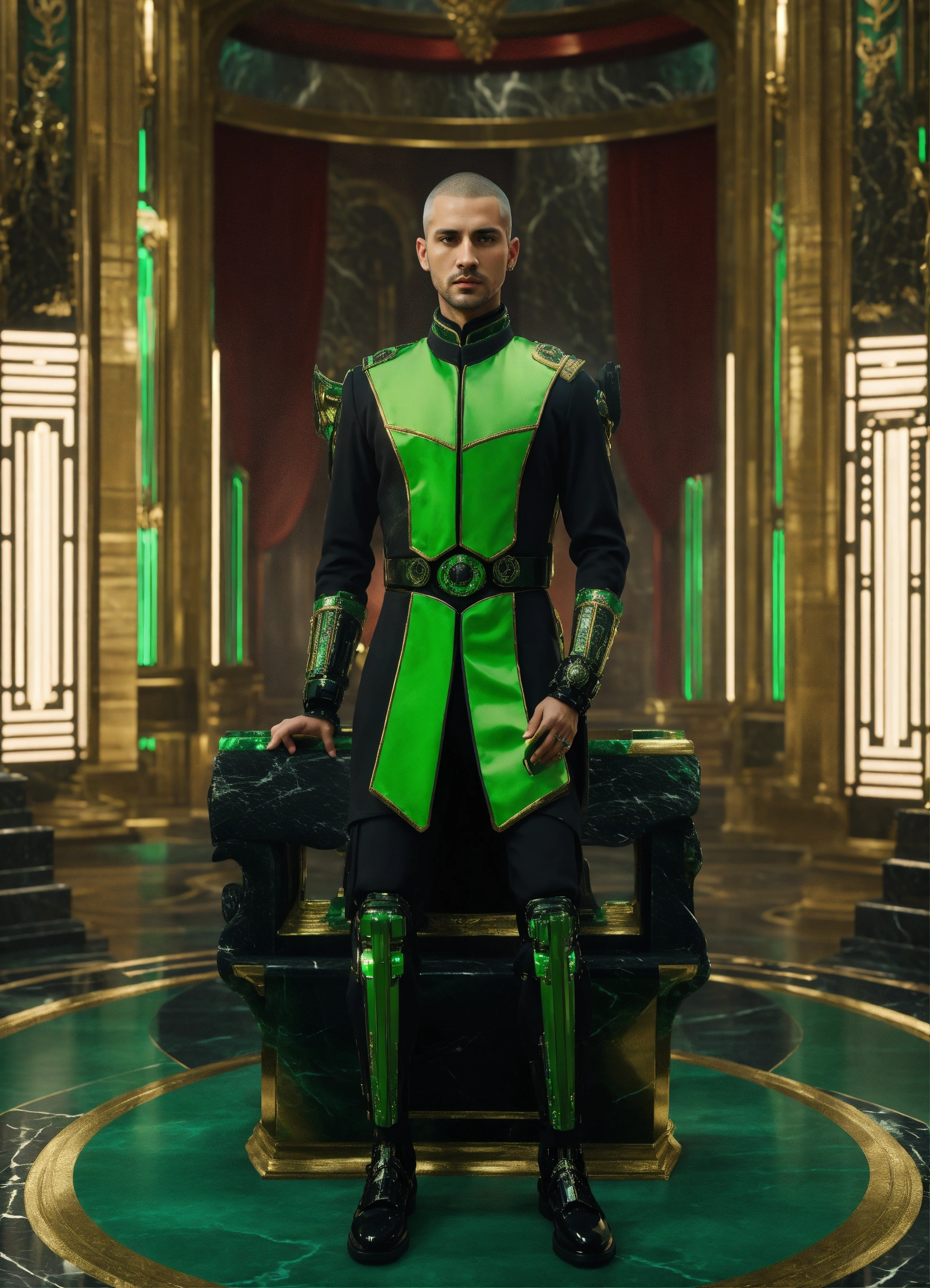 Full body image of a royal man wearing a black and green cybernetic uniform, sci fi, fair skinned, futuristic aristocrat standing in a black marble and jade throne room, turkish face, 34 years old, stoic, buzz cut, royalty, male, handsome, green eyes, unreal engine, 8k