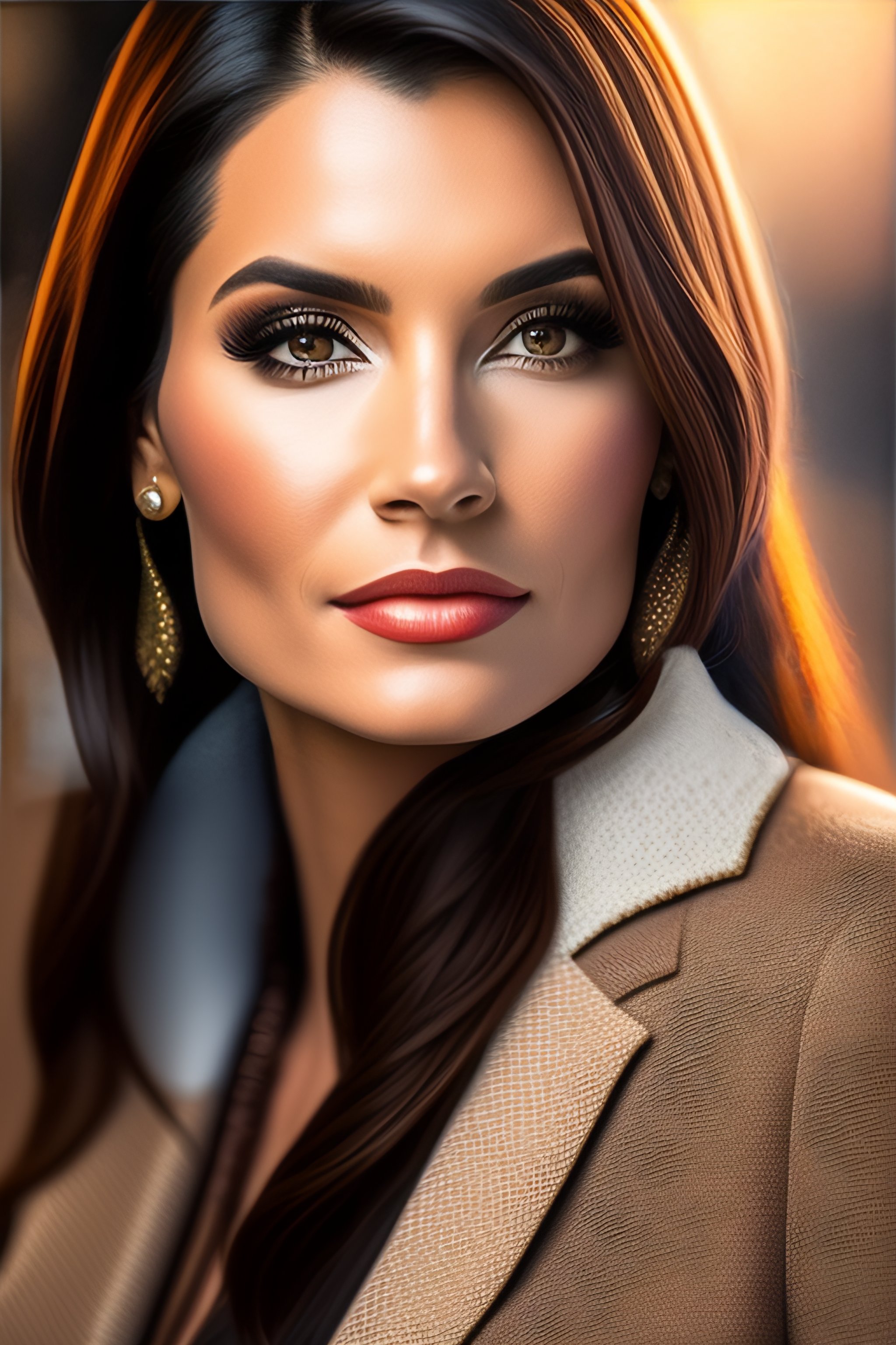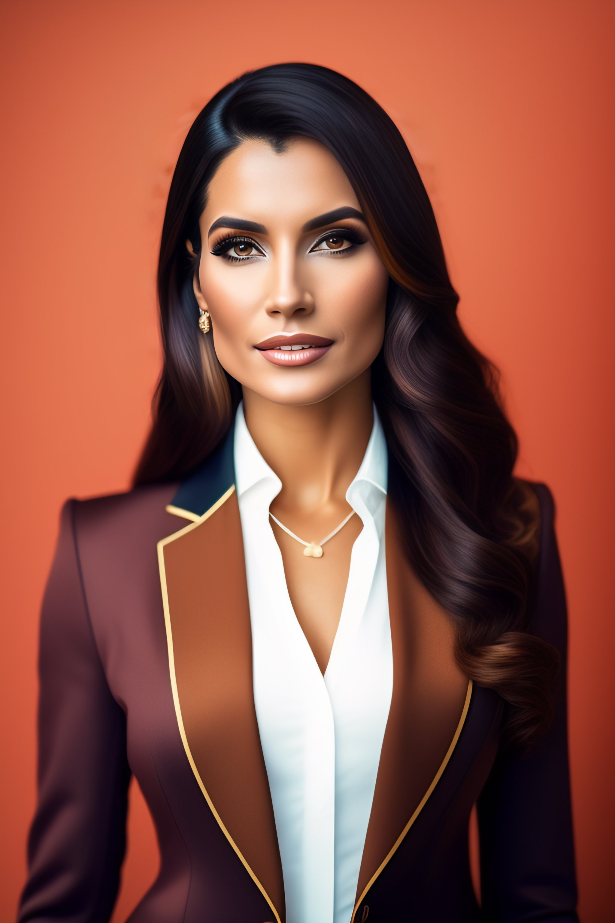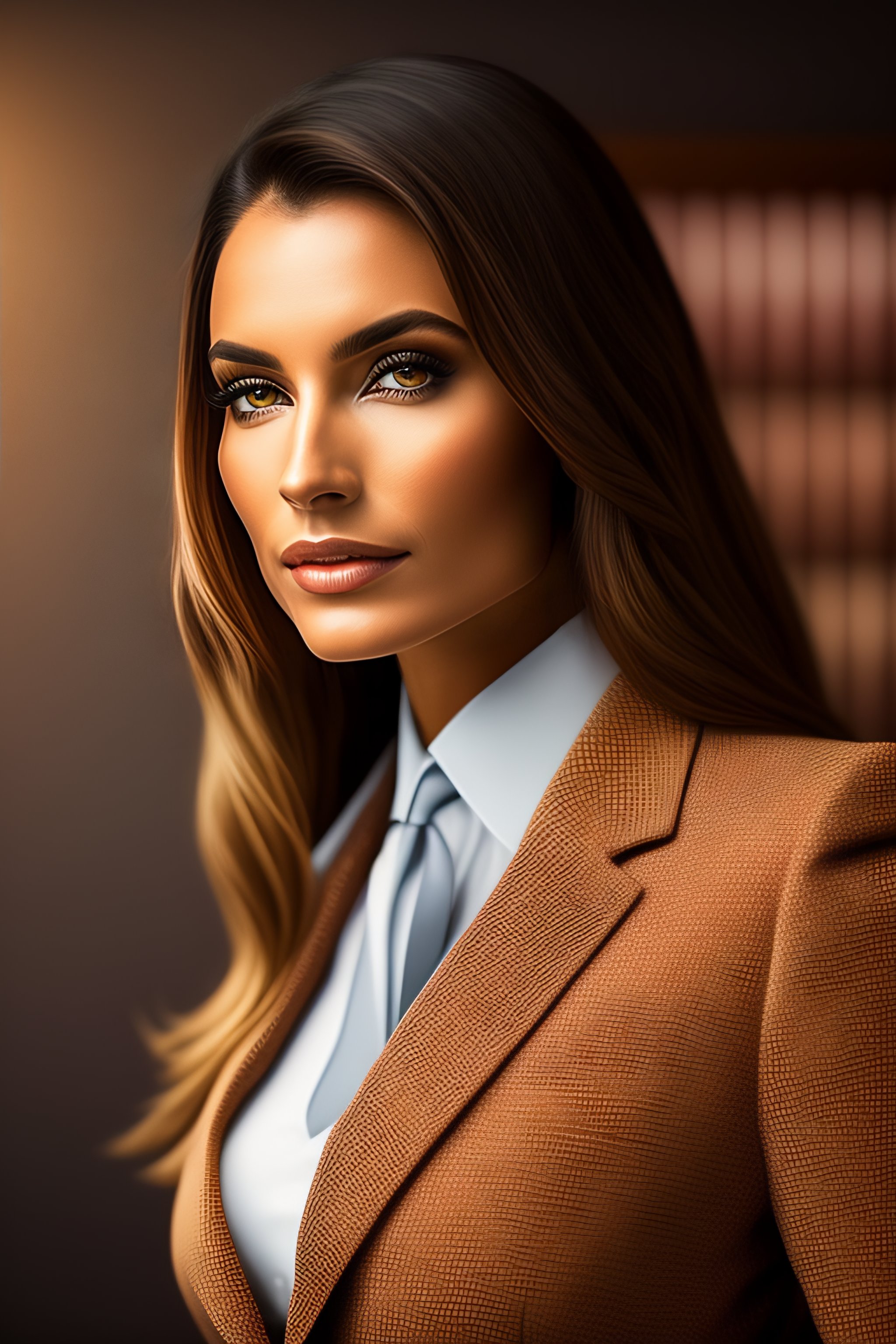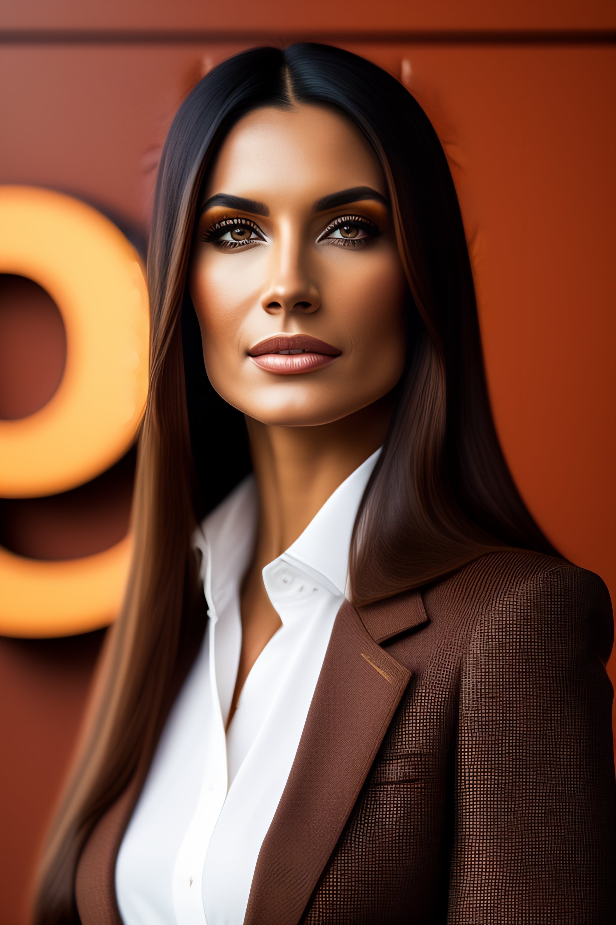 Business woman with straight brown long hair, google logo in the background, intricate fashion clothing, highly detailed, sharp focus