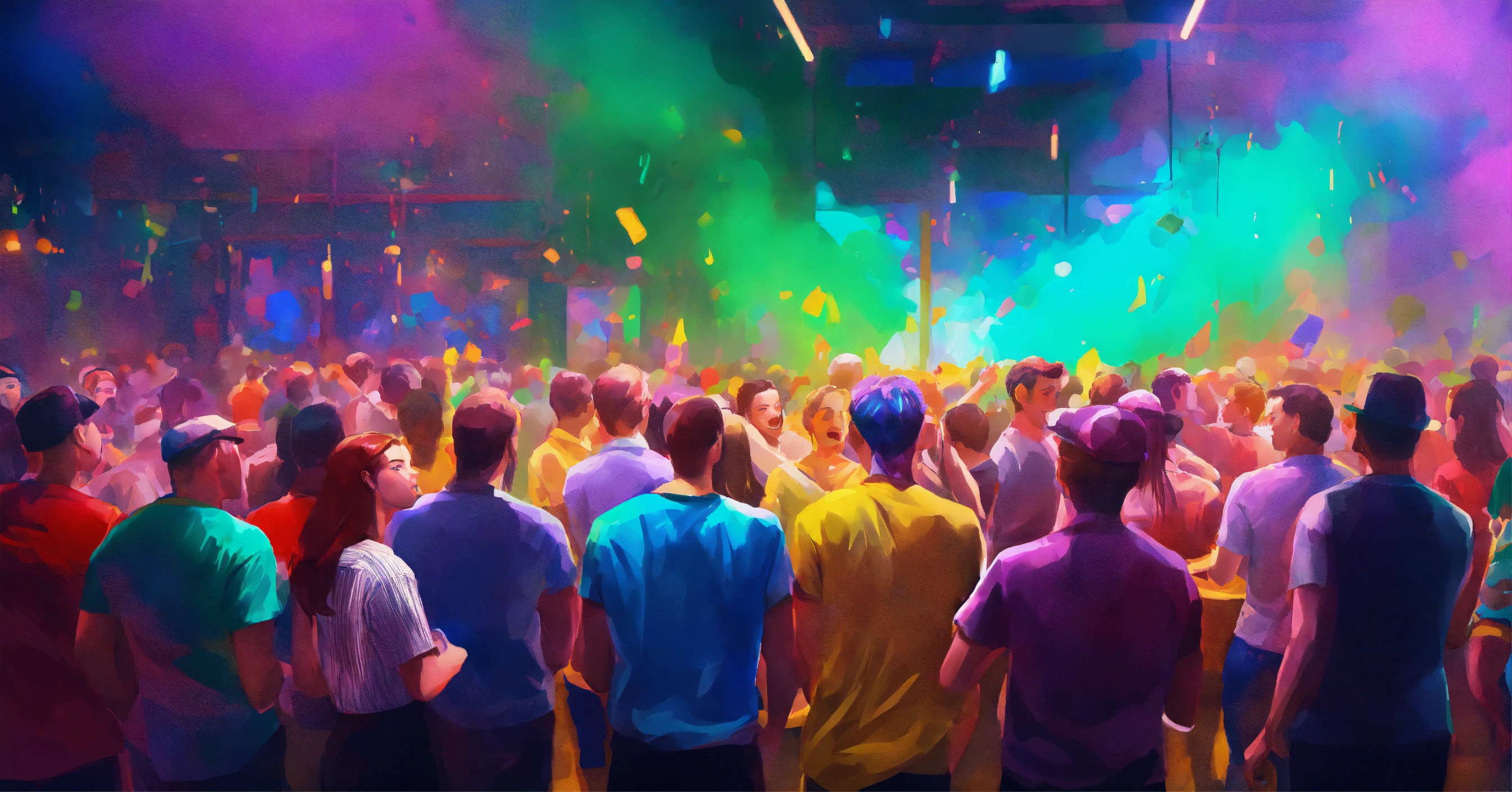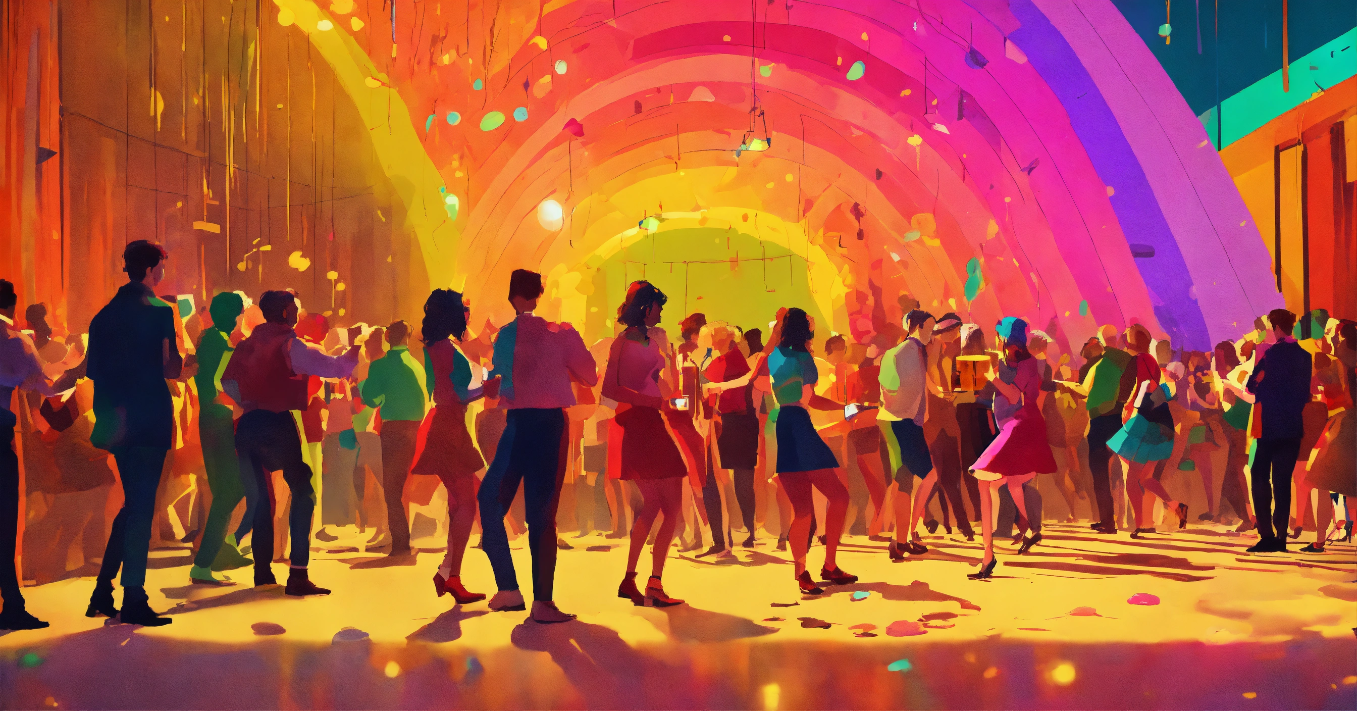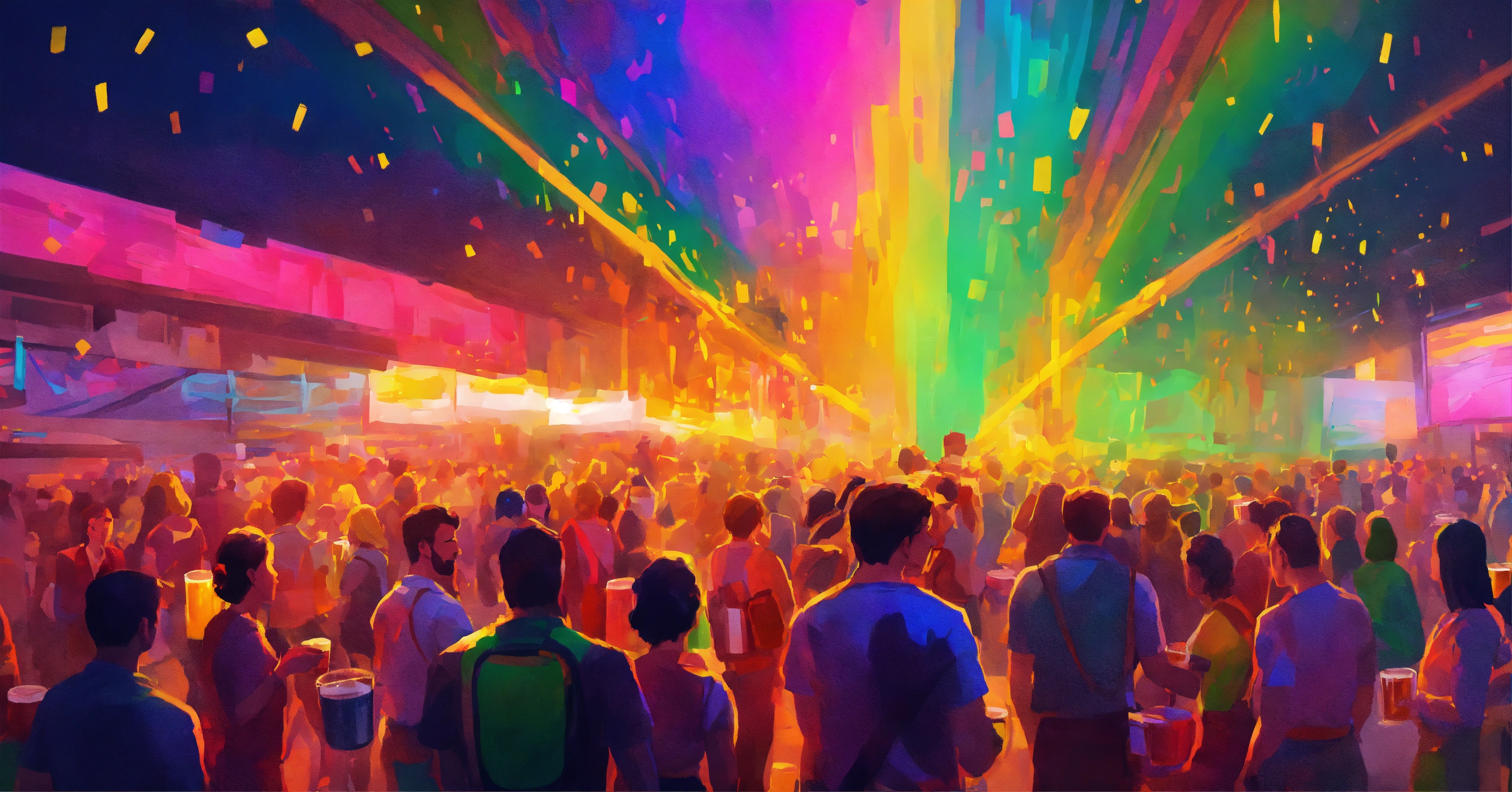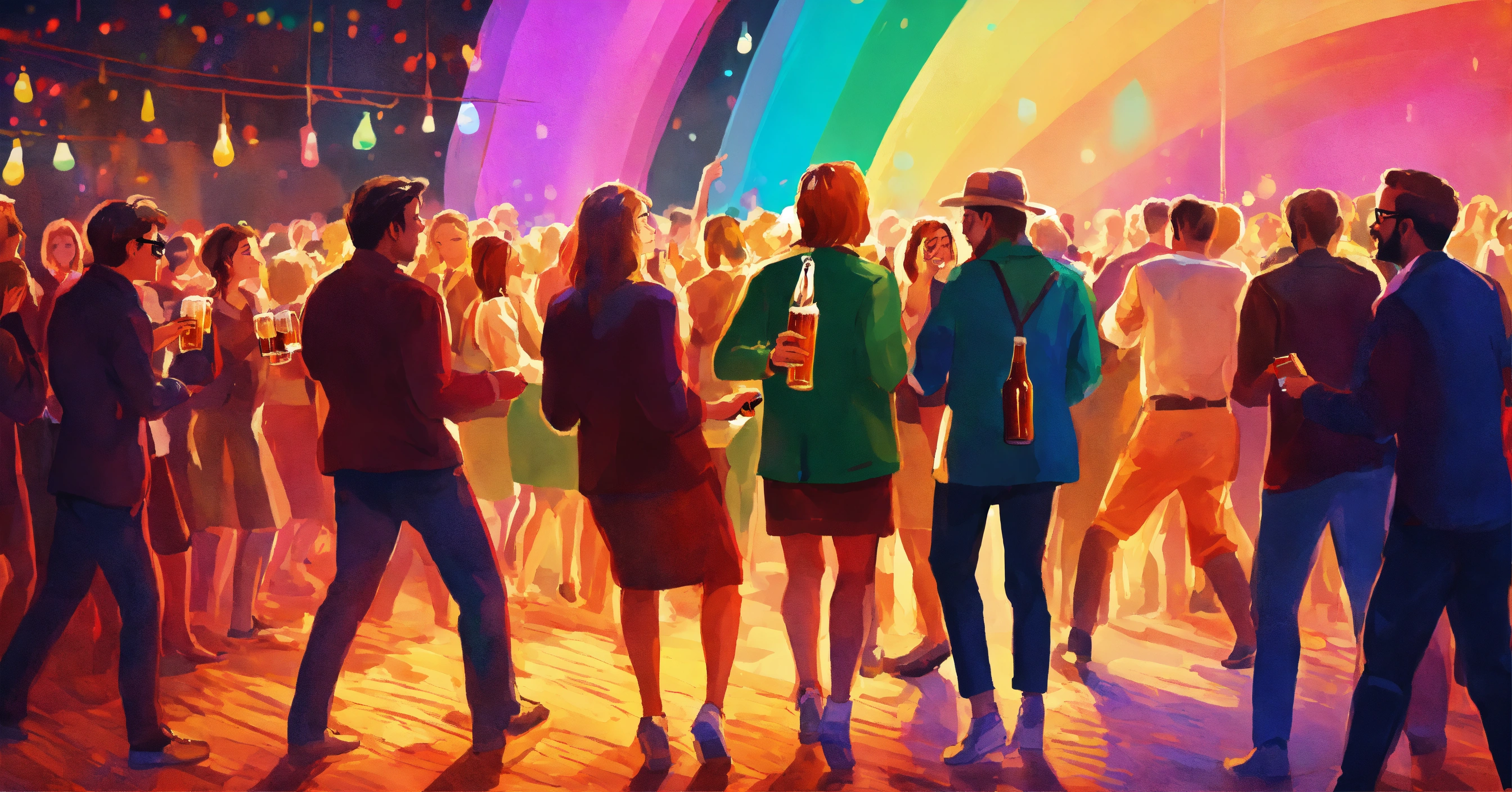 A beer festival with a lot of modern young people dancing and celebrating and toasting with beer scop in hand, rainbow color, abstract art, in the style of david lynch, by wes anderson, conceptual art, artstation
